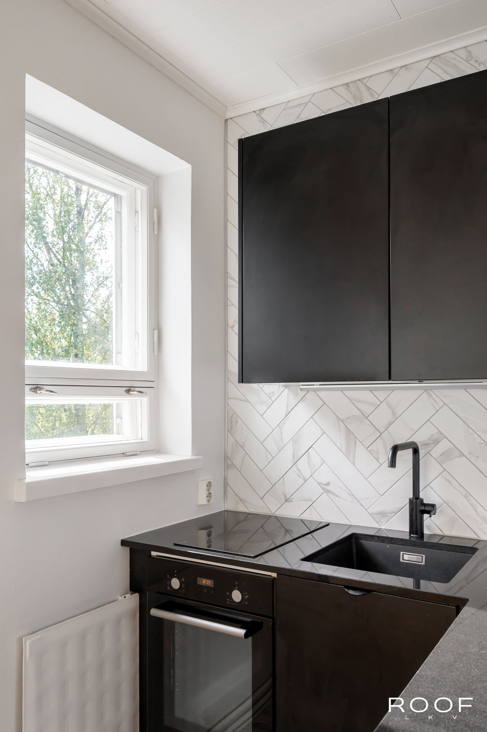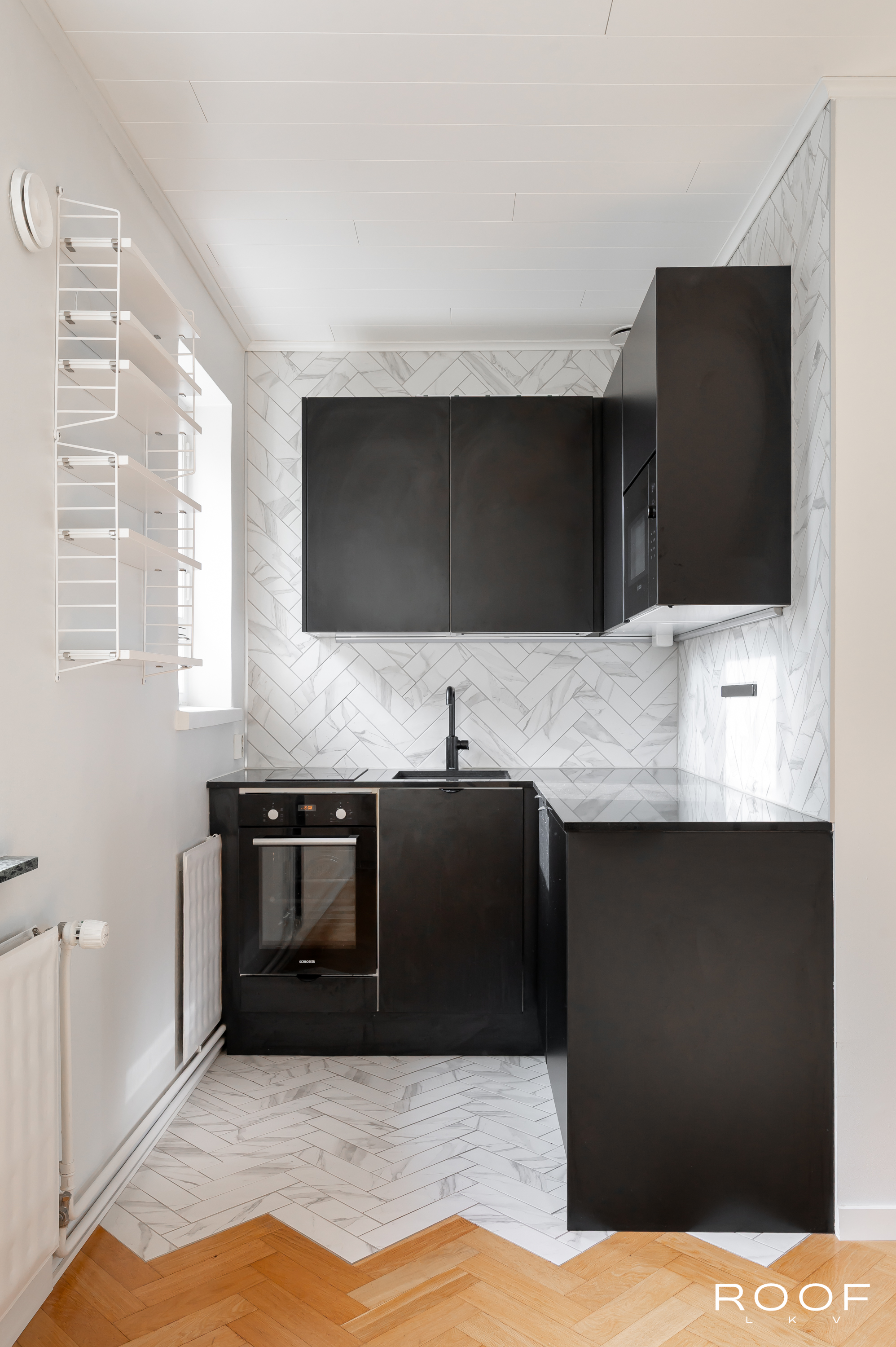 Keittiö on toteutettu mittatilaustyönä puusepän valmistamilla kalusteilla. Mustat kaapistot yhdistyvät näyttävään Nero Assoluto -graniittitasoon, ja kaikki kodinkoneet (Bosch, Electrolux, Schlosser) on integroitu sulavasti kokonaisuuteen. Tilaa täydentää tyylikäs String Furniture -hylly, joka kuuluu kauppaan.
