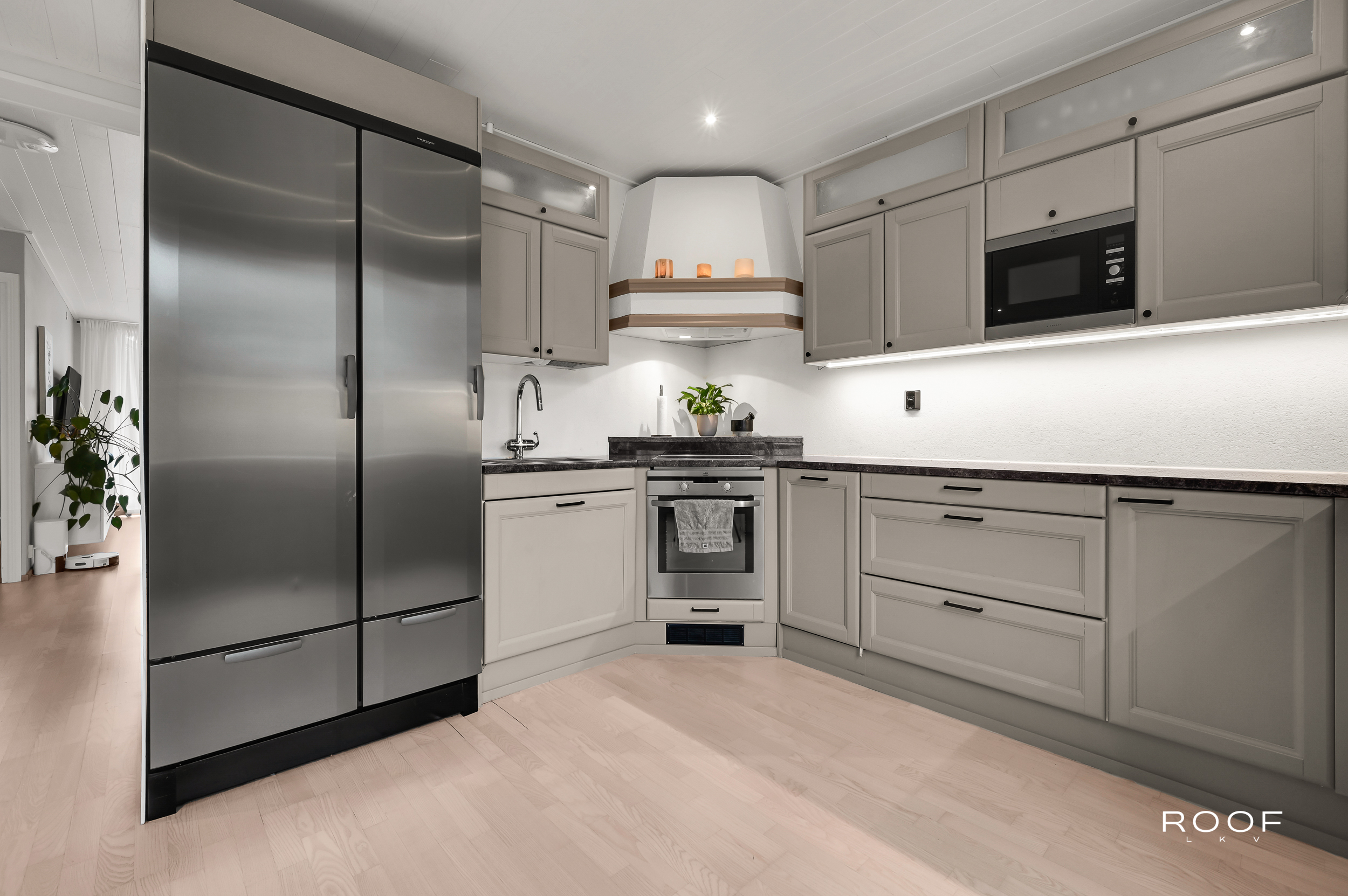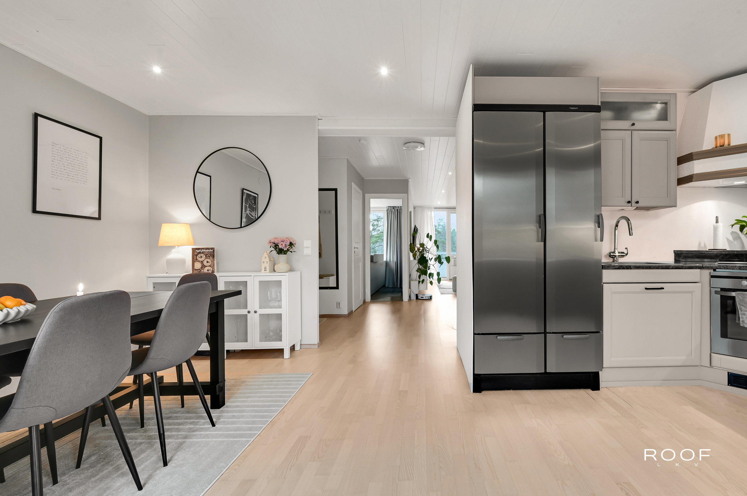 Köket, hemmets hjärta, här finns plats för både stora middagar och spontana kaffebjudningar. De stora ytorna gör det enkelt att samla både familj och vänner, och du kan laga mat samtidigt som du umgås med dina gäster.