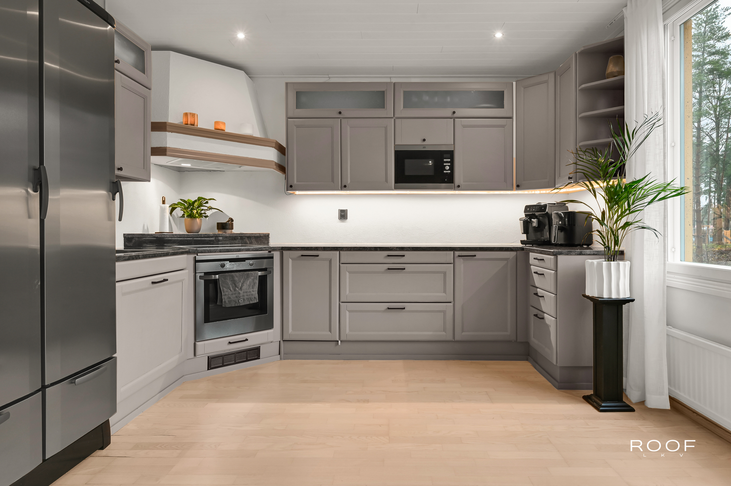 Keittiö, kodin sydän, täällä on tilaa sekä suurille illallisille että spontaaneille kahvihetkille. Suuret tilat tekevät perheen ja ystävien kokoamisesta vaivatonta, ja voit laittaa ruokaa samalla kun seurustelet vieraidesi kanssa.