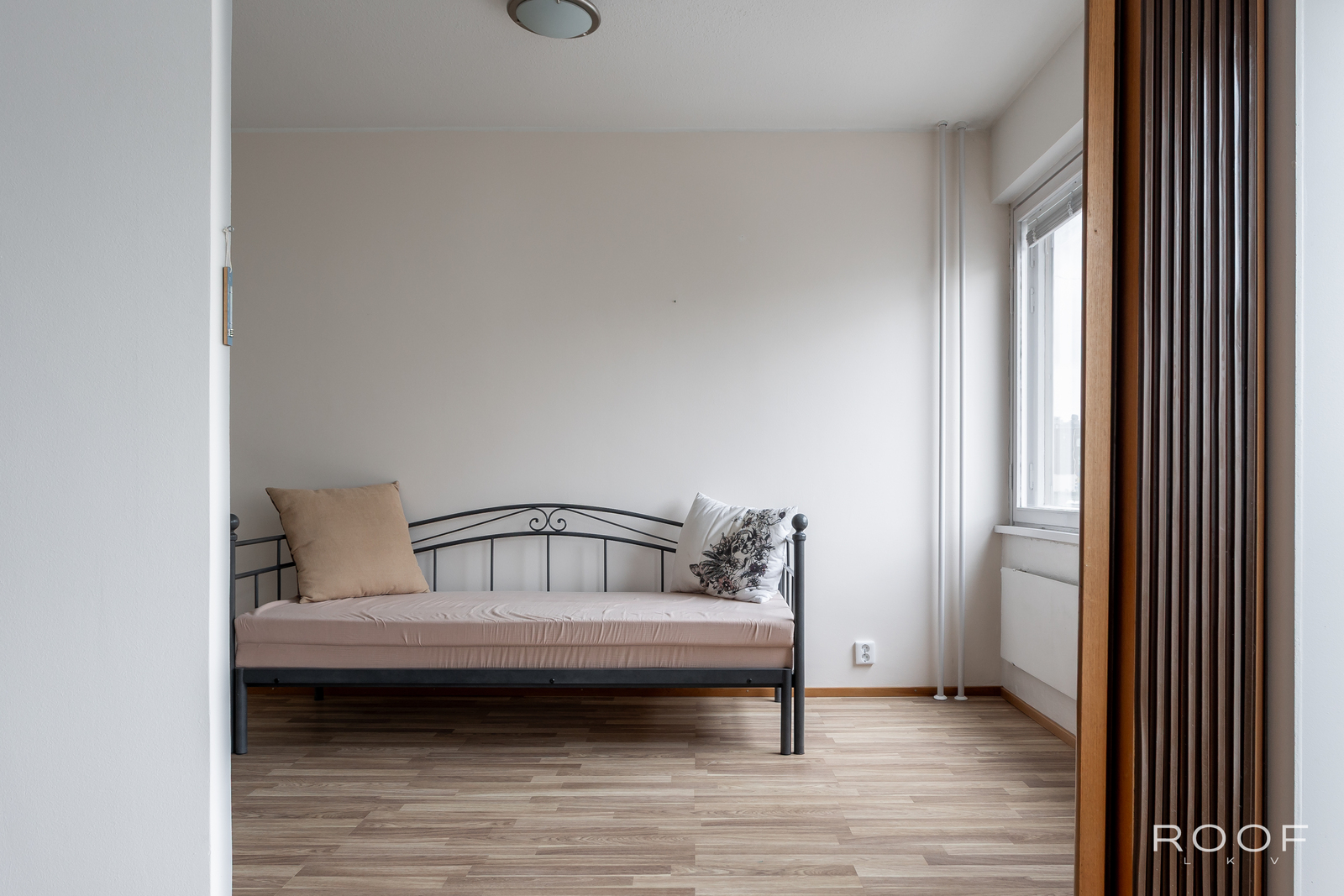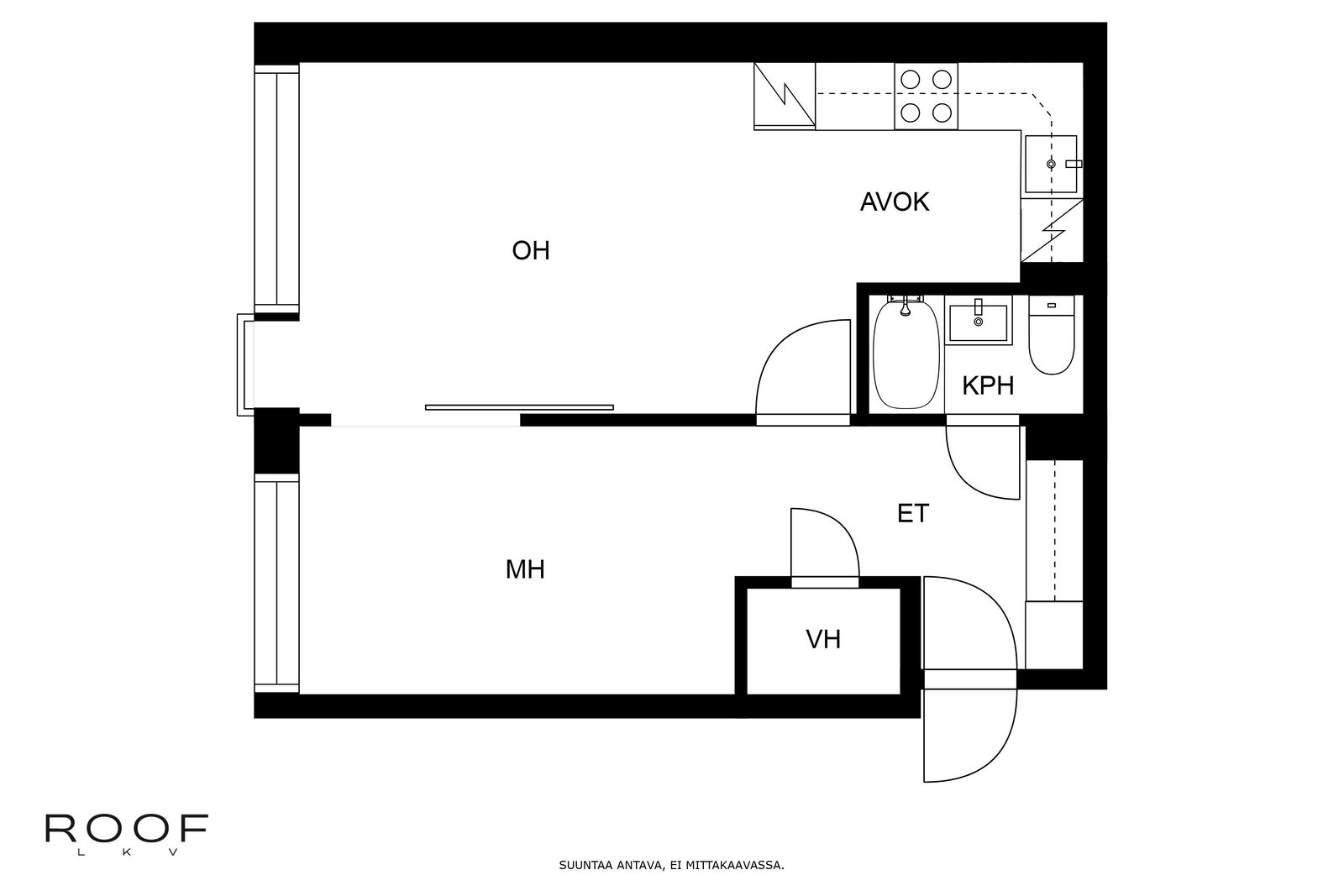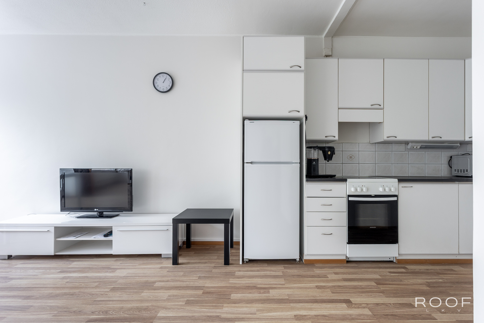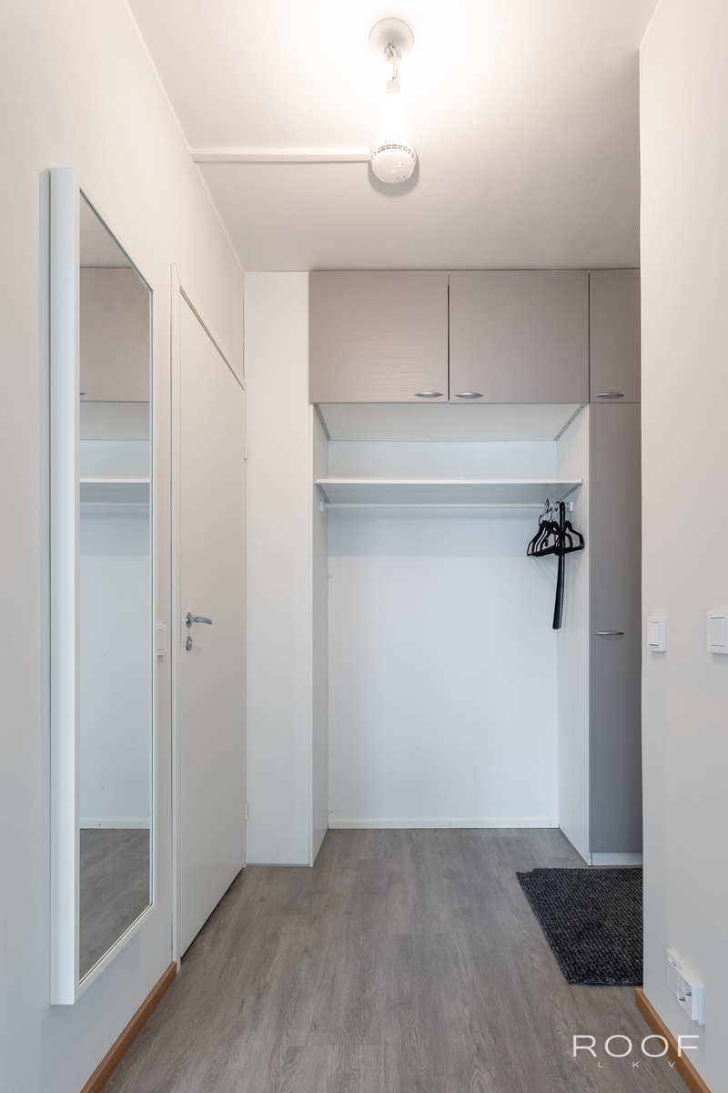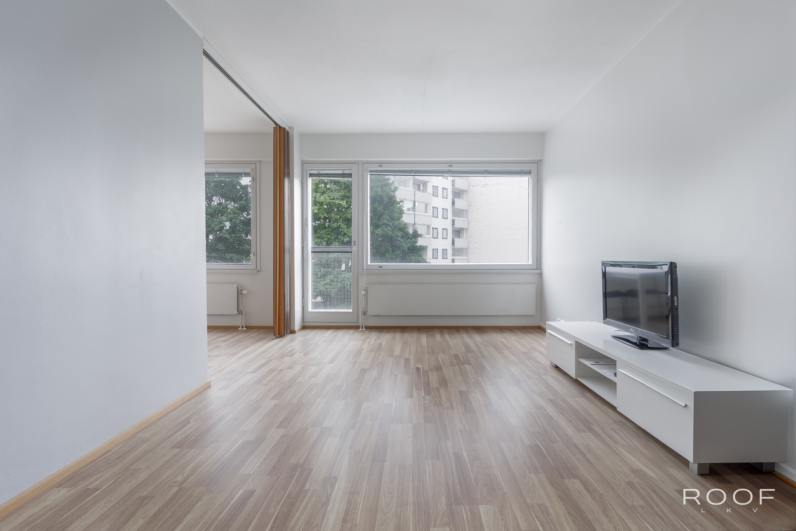 Tämän asunnon pohja on toimiva eikä hukkaneliötä ole lainkaan!. Eteisessä on hyvin säilytystilaa kaapistojen ja vaatehuoneen myötä. Hyväkuntoinen avokeittiö on tilava ja se on yhtä tilaa olohuoneen kanssa. Olohuoneessa on ranskalainen parveke. Makuuhuone on myös hyvän kokoinen ja sinne saa hyvin mahtumaan myös työtilan. Ikkunat ovat etelään päin, joten valoa tulee kivasti asuntoon.
