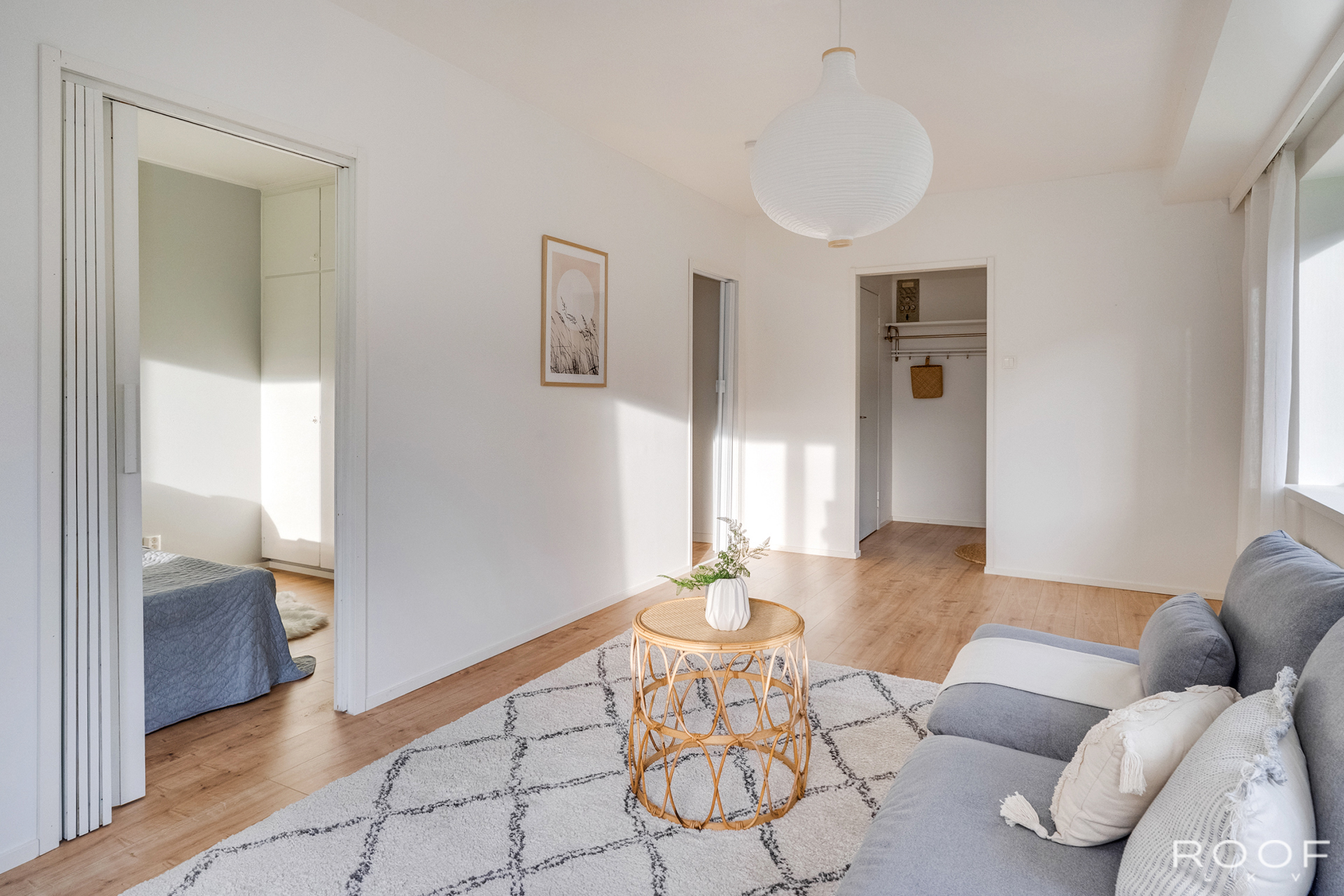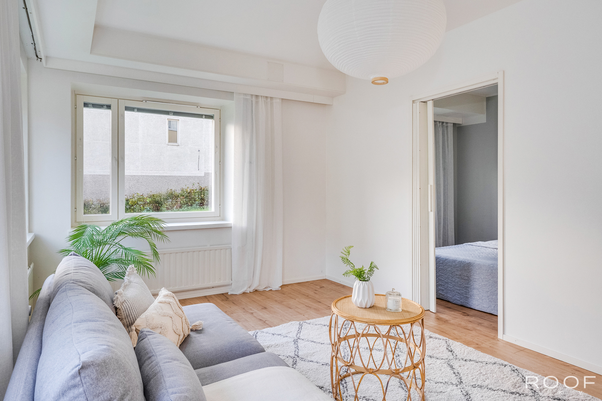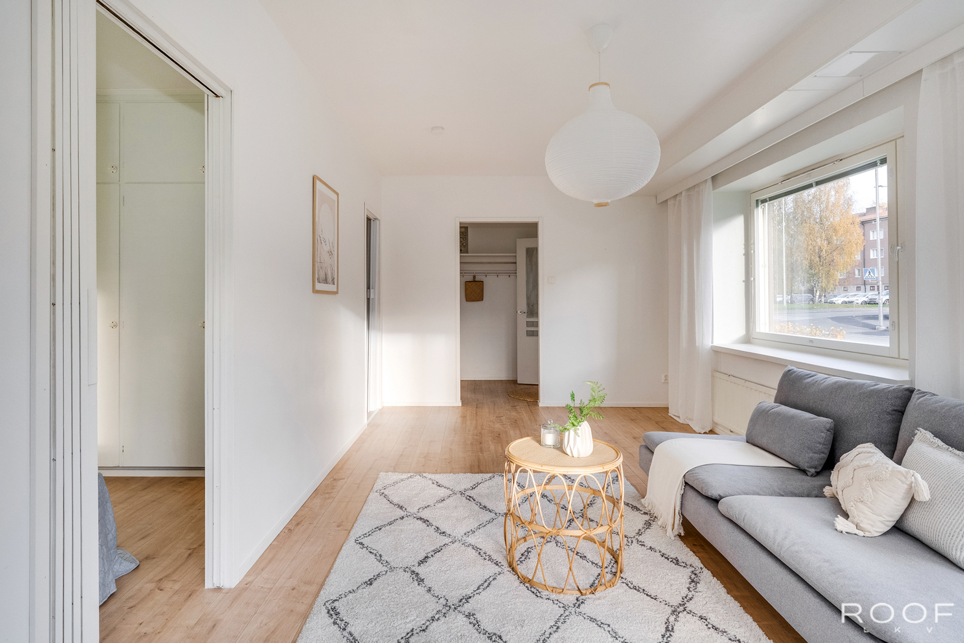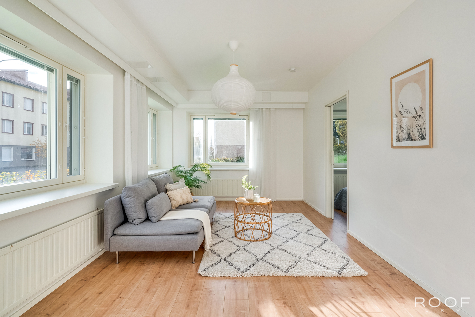 Tässä päätyasunnossa on tilavat huoneet ja iso avara olohuone on kodin sydän ja siinä on tilaa isommallekin sohvaryhmälle.