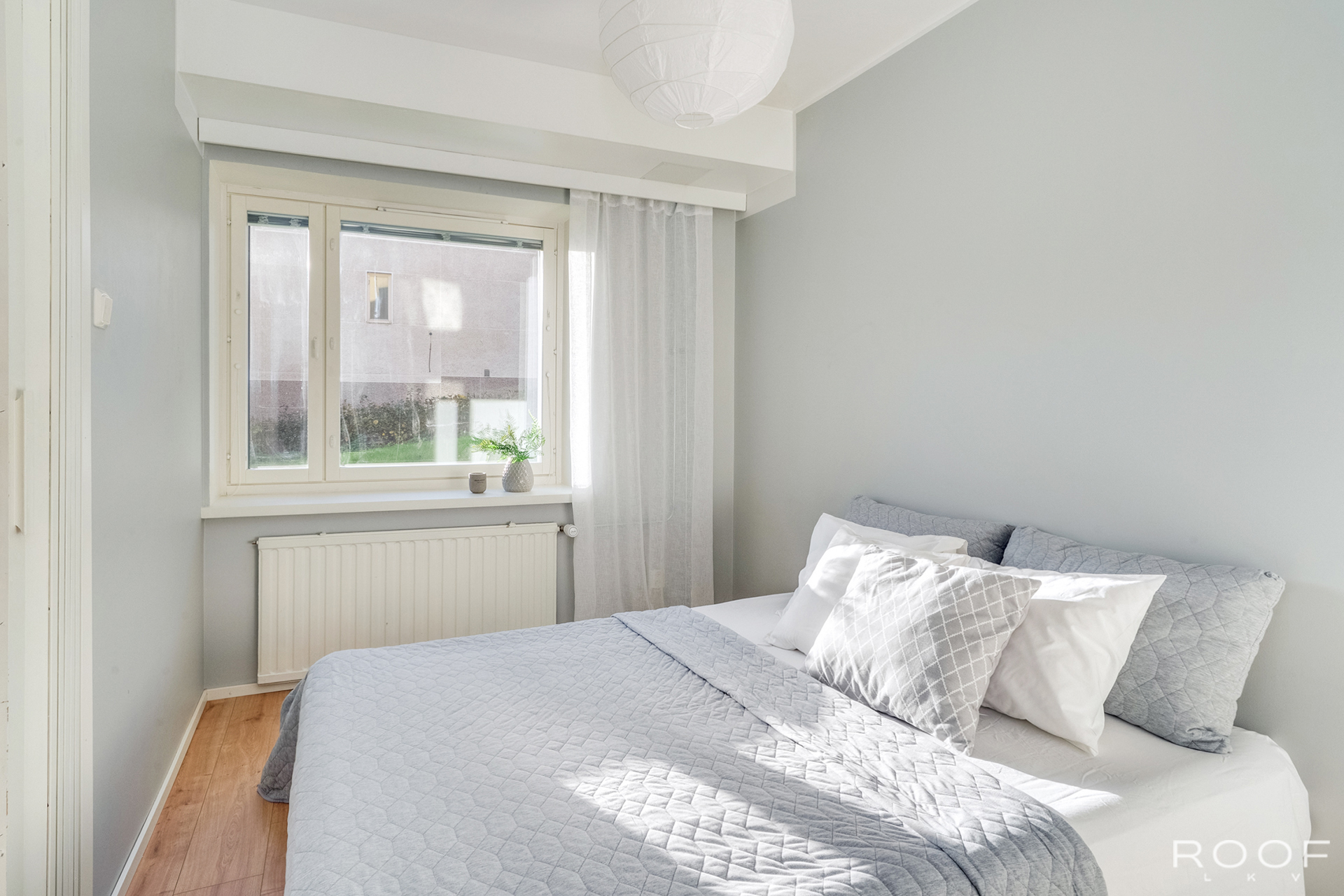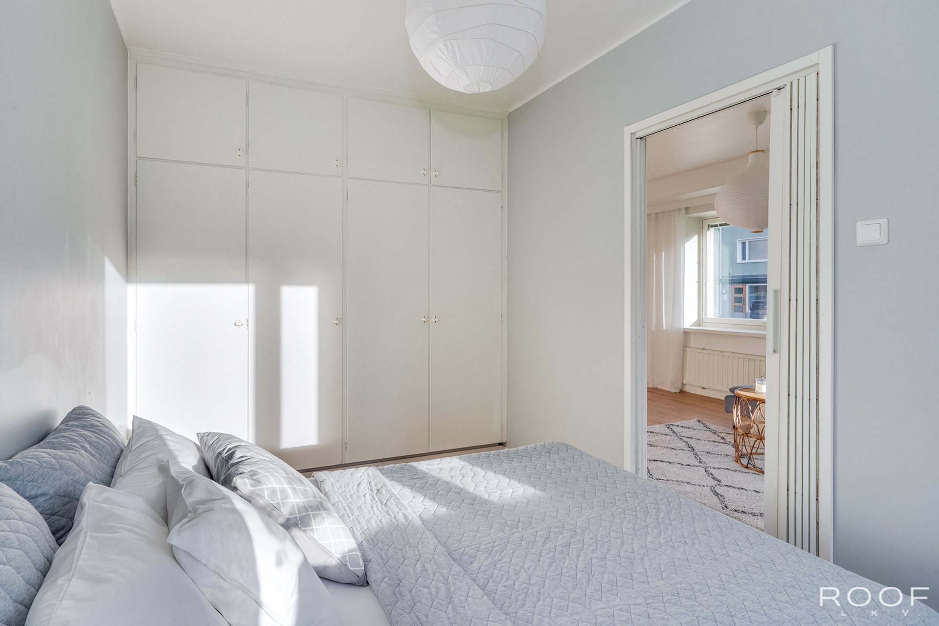 Makuuhuoneeseen mahtuu isompikin sänky ja säilytystilaa on runsaasti kaapistoissa.