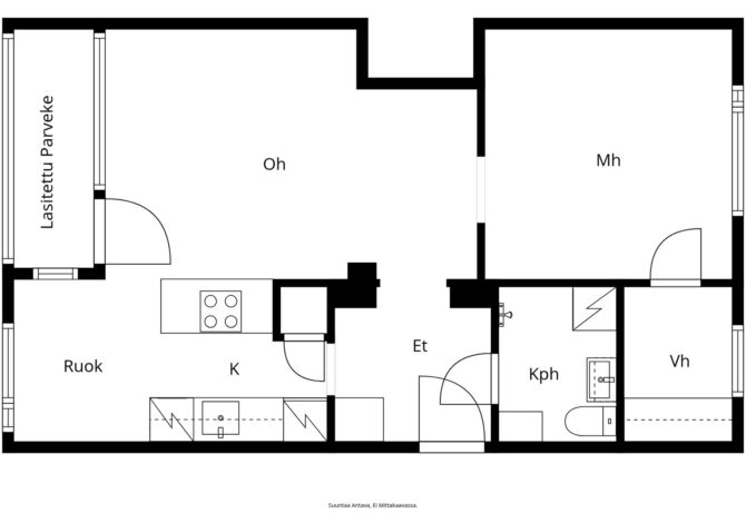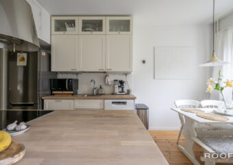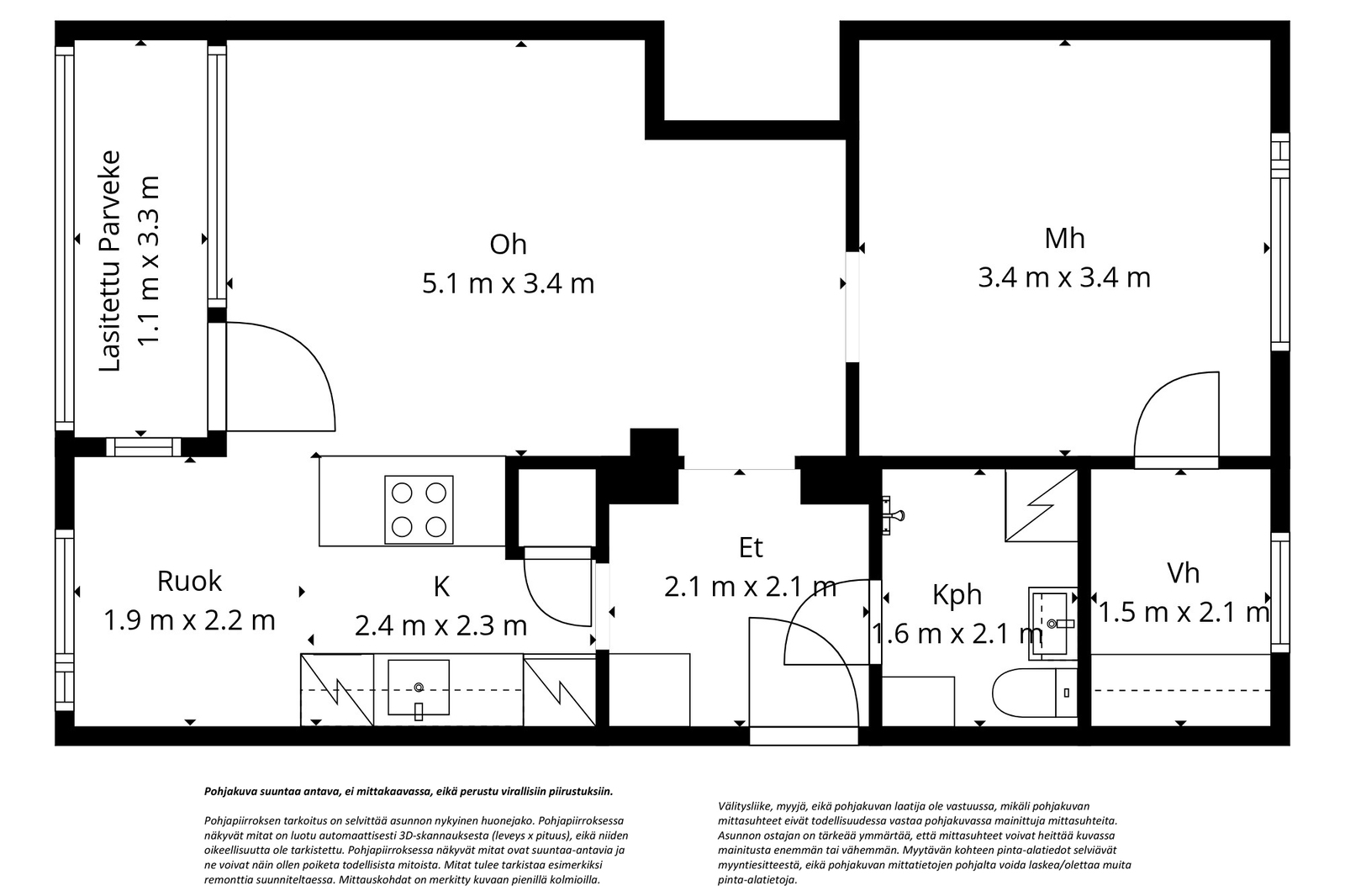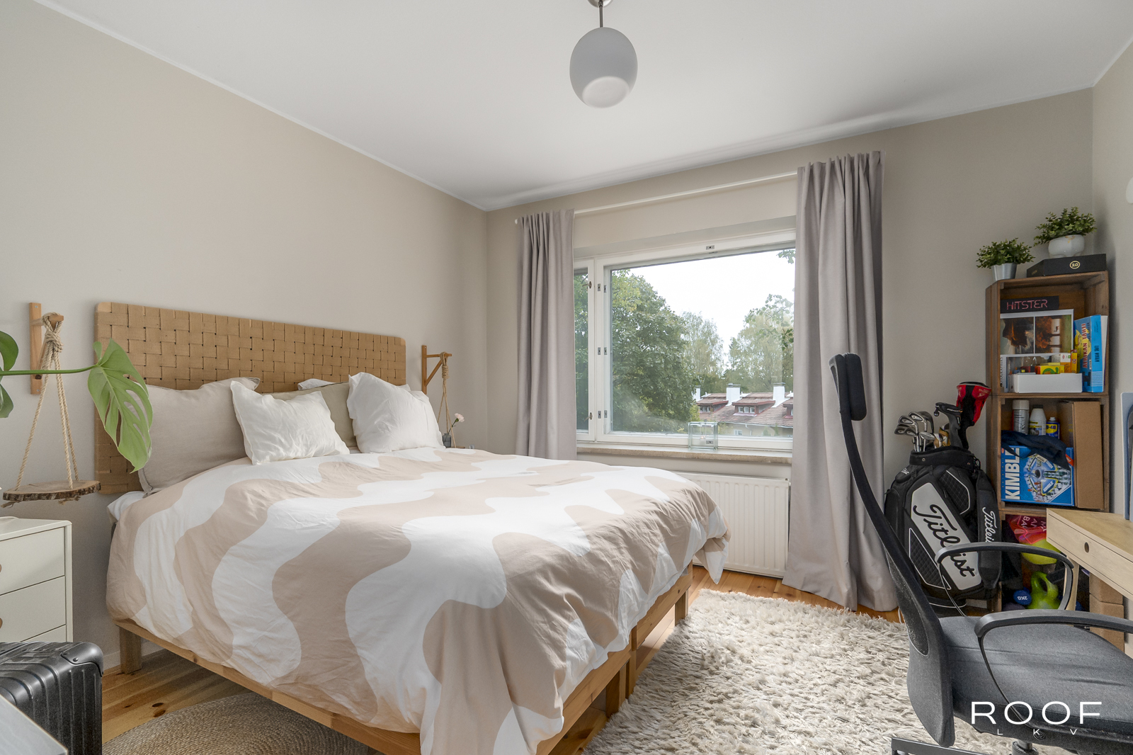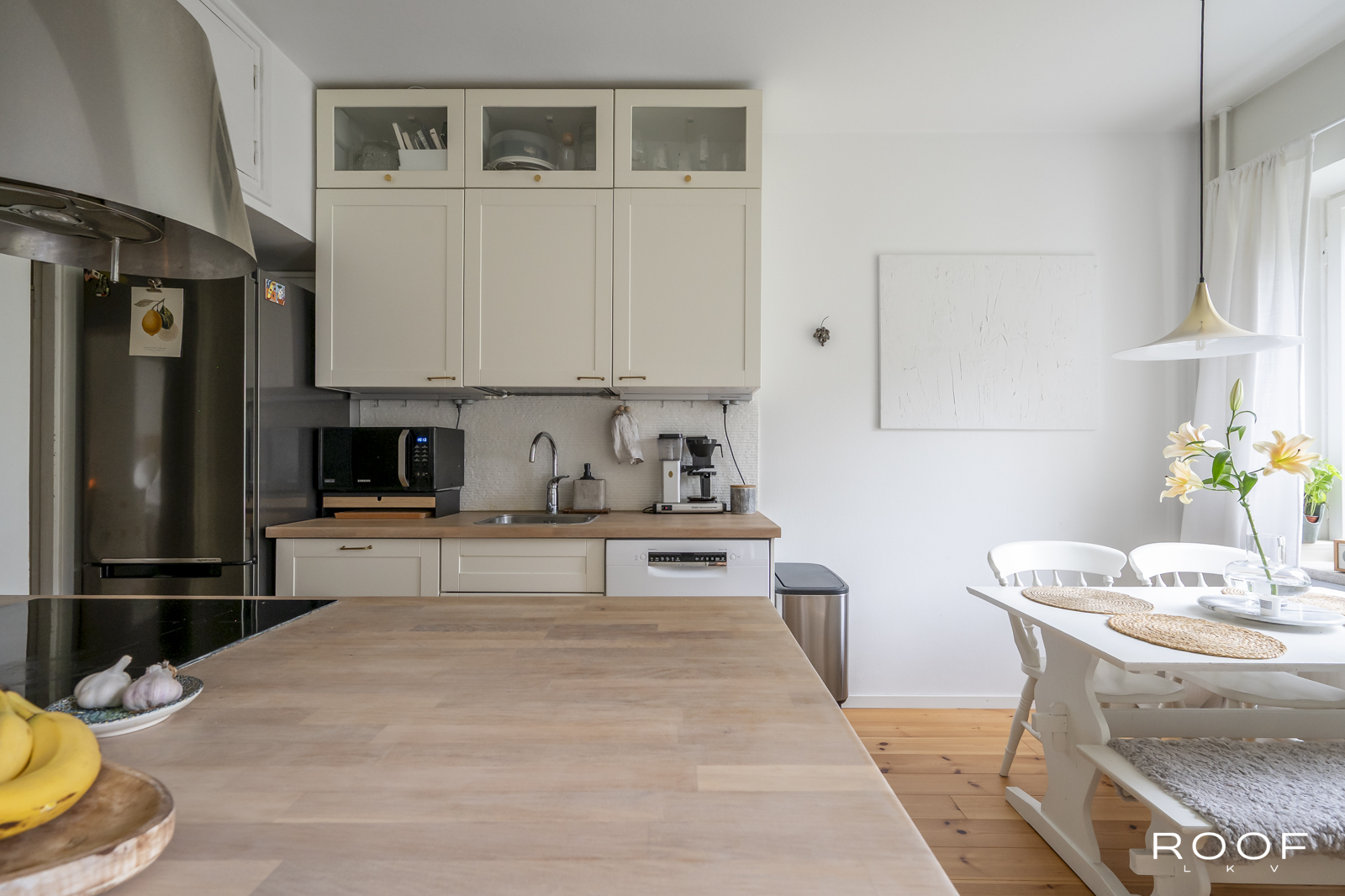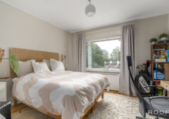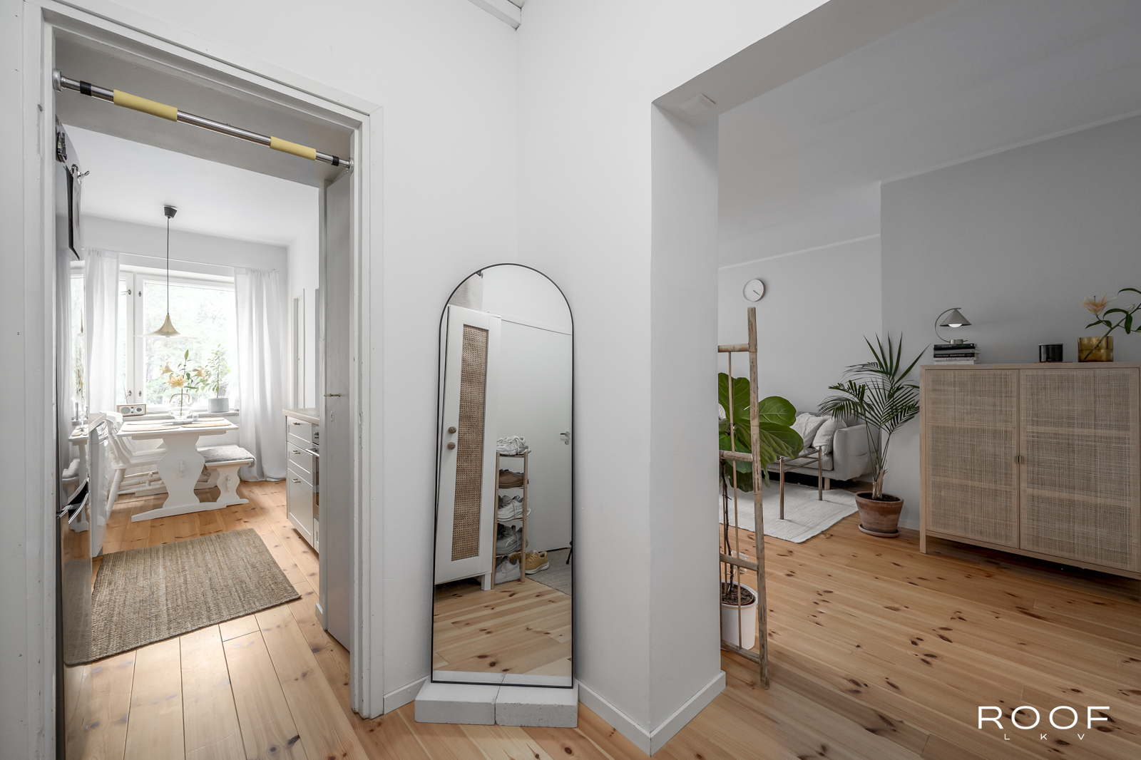 Olohuone ja keittiö muodostavat toimivan kokonaisuuden, jossa on tilaa myös ruokailuryhmälle. Keittiö on remontoitu vuonna 2013. Suuren makuuhuoneen yhteydessä on ikkunallinen vaatehuone, joka toimii mainiosti myös pienenä lisähuoneena. Tilavaan makuuhuoneeseen saat mahtumaan työpisteen ja kodin tunnelmaa korostaa kaunis mäntylautalattia, joka on asennettu vuonna 2021.