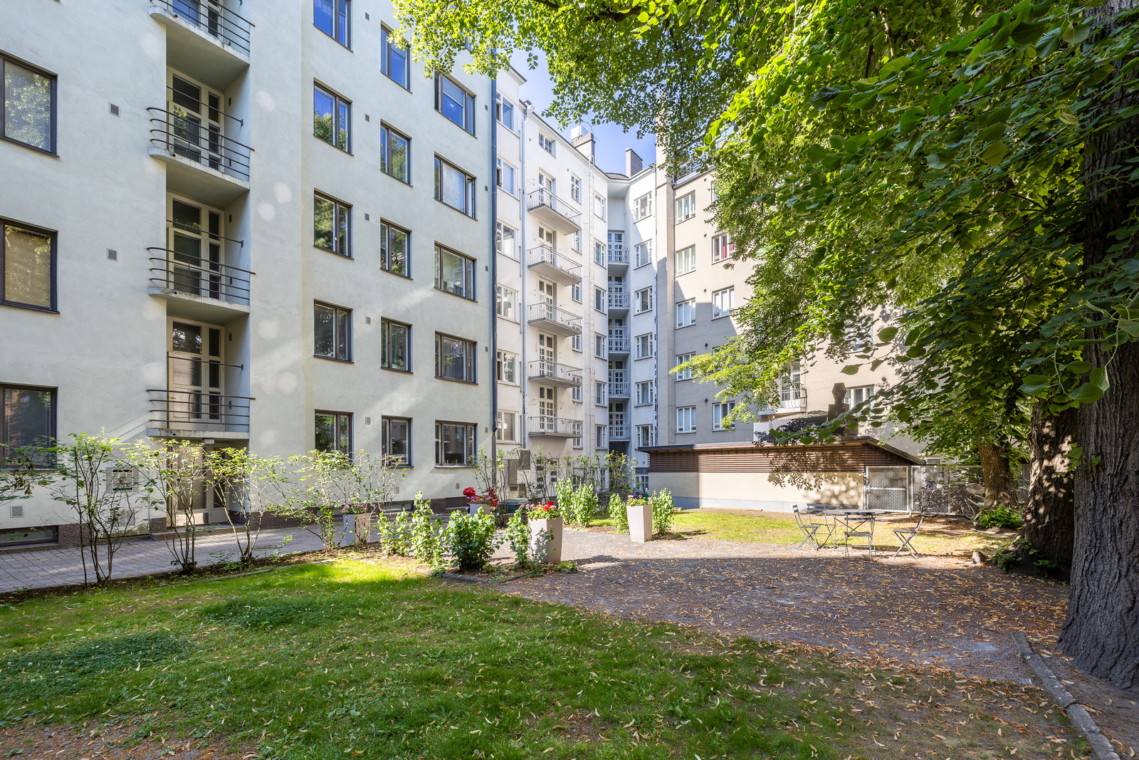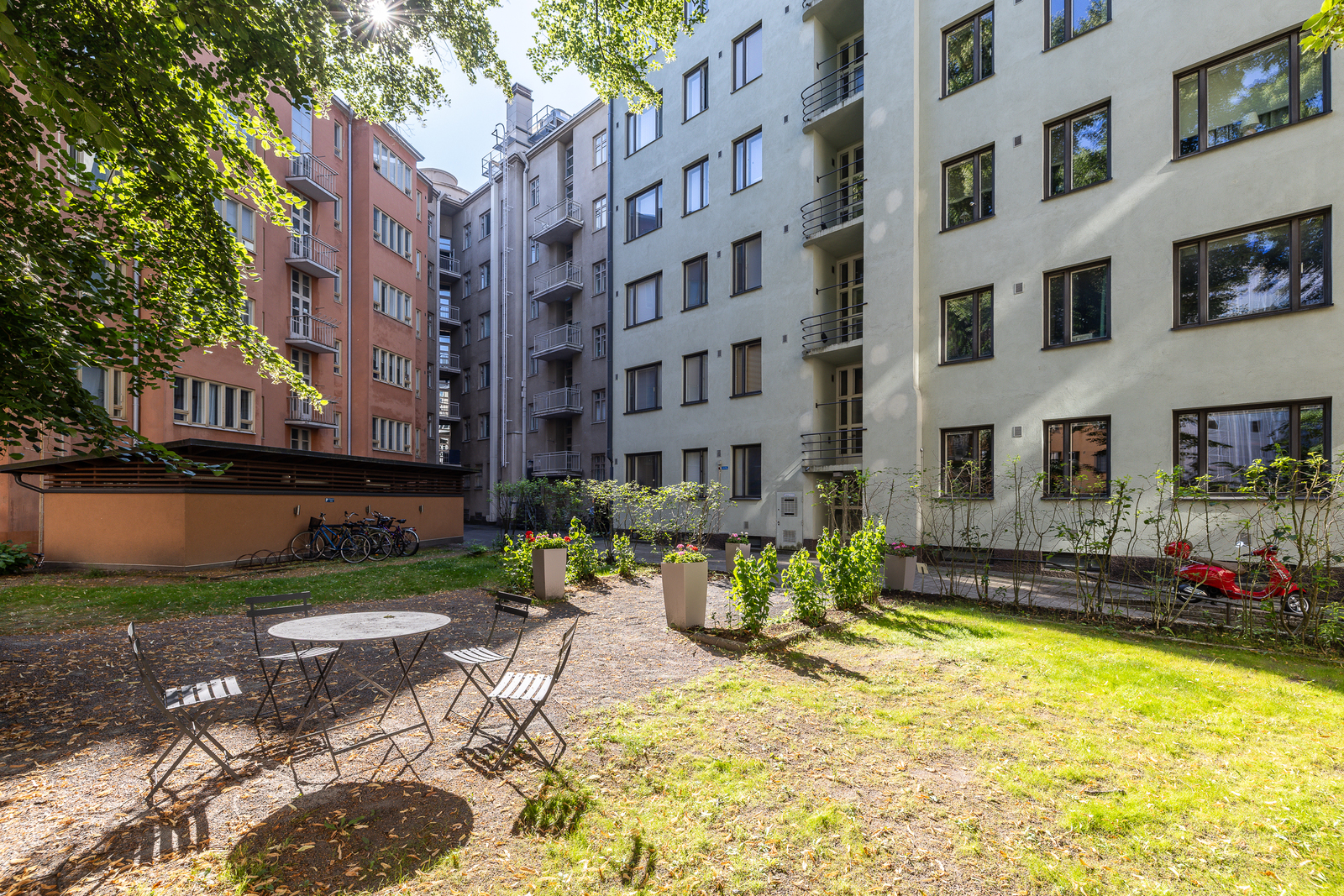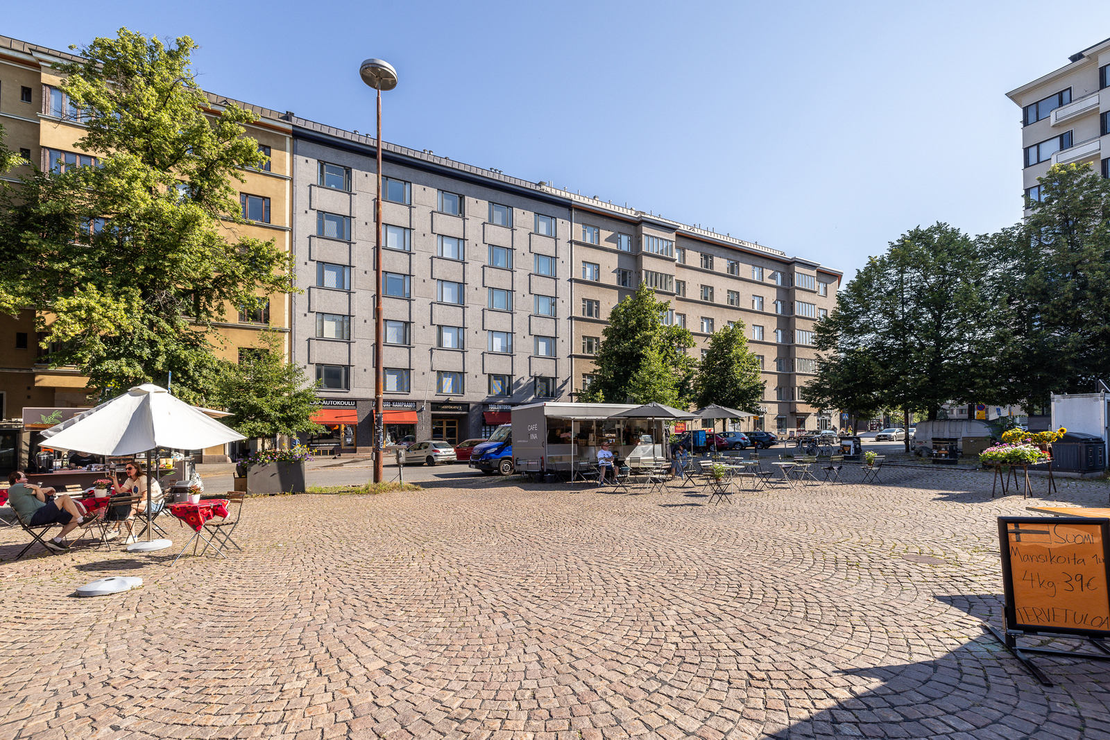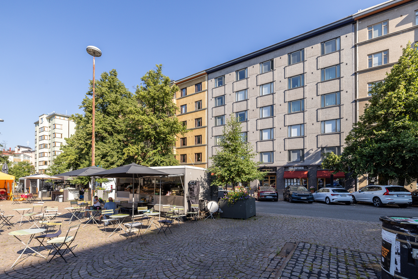 Ensimmäisen kerroksen tilava kaksio tarjoaa viihtyisät puitteet kaupunkiasumiseen aivan Töölöntorin kupeessa. Asunto sijoittuu rauhalliselle sisäpihan puolelle, joten torin äänet eivät kantaudu sisälle.