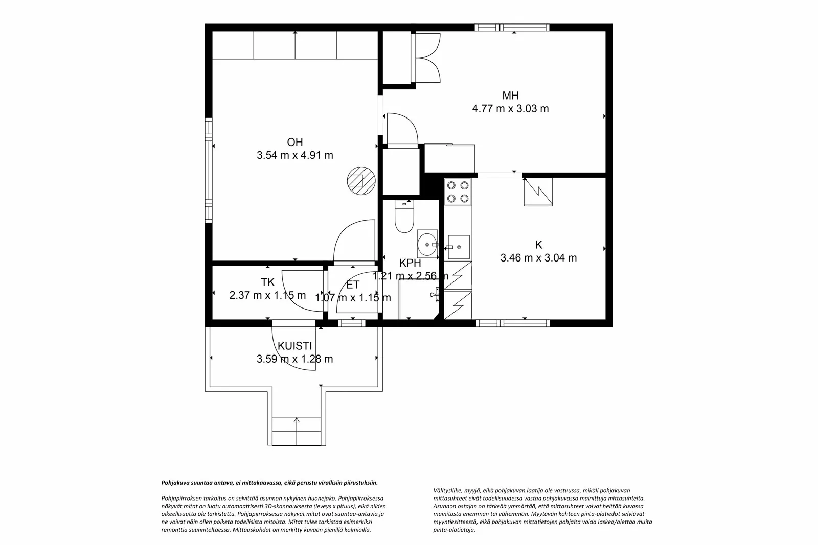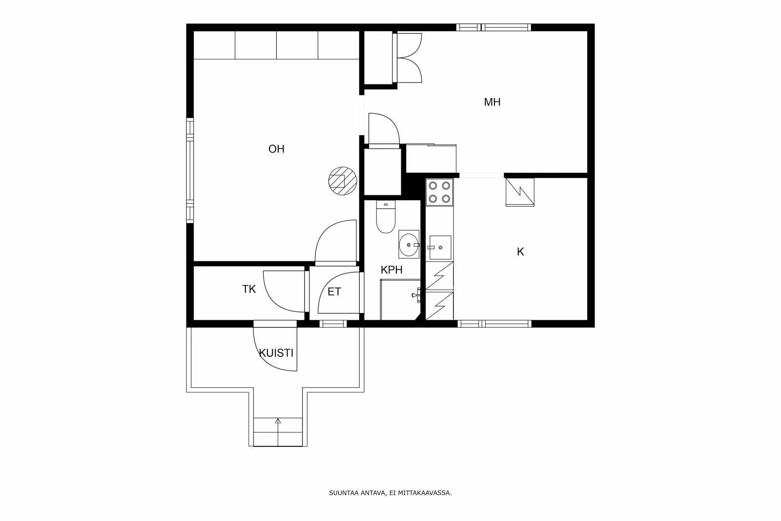 Talossa on kodikas pohjaratkaisu, joka sopii mainiosti yksin tai kaksin asuvalle. Sisääntulo tapahtuu kuistin kautta, josta kuljetaan eteisen läpi tilavaan olohuoneeseen. Katseenvangitsijana toimii suloinen punainen pönttöuuni. Makuuhuoneessa on mukavasti tilaa ja 2017 remontoitu...