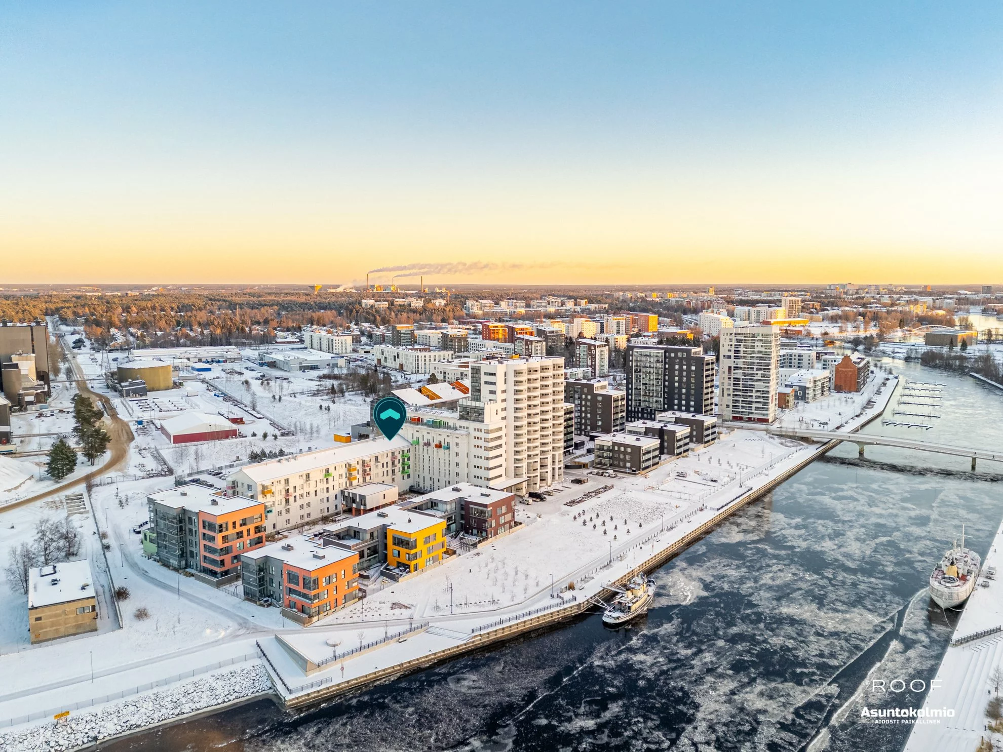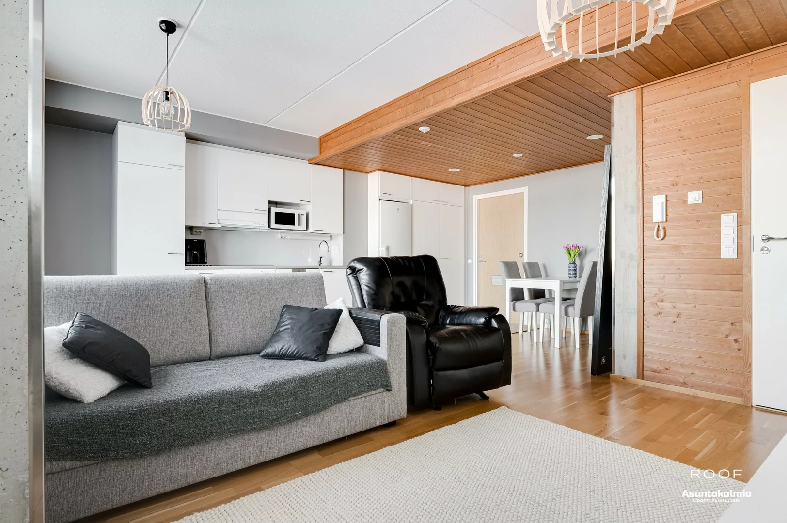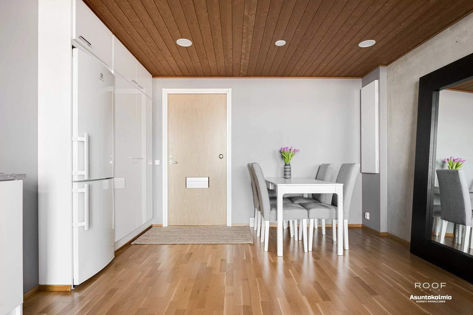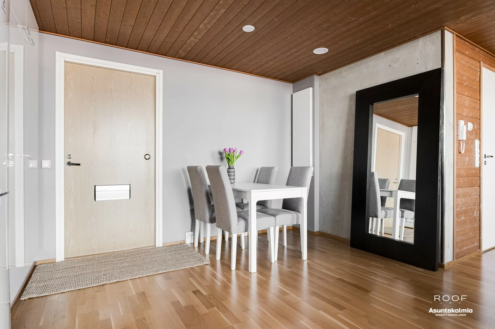 Jo porraskäytävässä huomaat, että nyt ei ole kyseessä se tavallisin yhtiö Toppilansalmesta. Käytävien hotellimaiset kokolattiamatot ovat rakennuksen henkeen sopivia. Huoneistossa jatkuu sama, tyylikkäästi toteutettu sisustus; puupaneelein somistetut väliseinät sekä rouhea betoni tuo aivan...