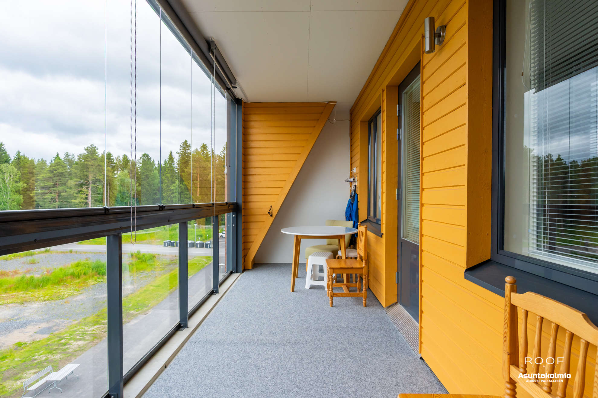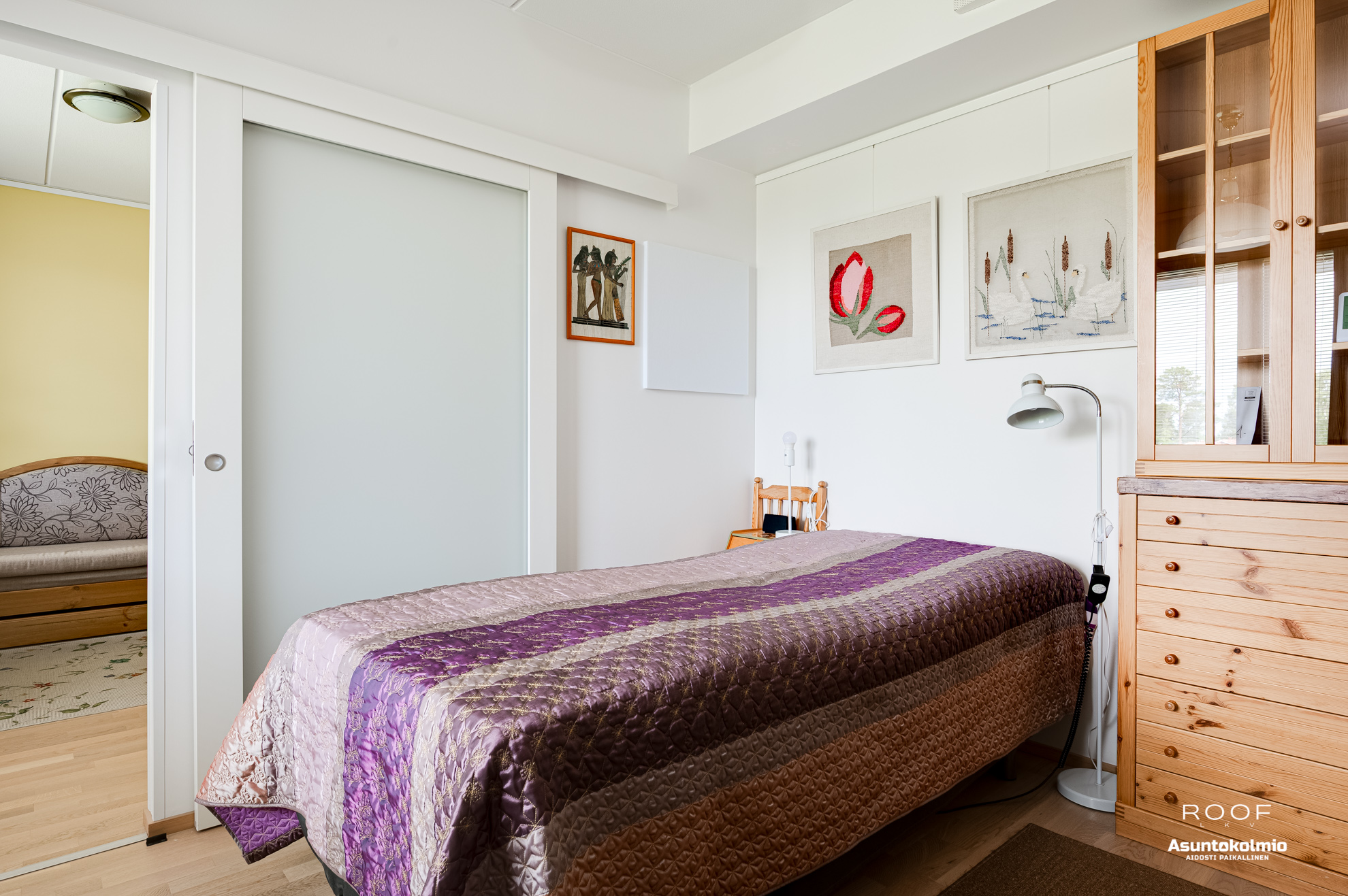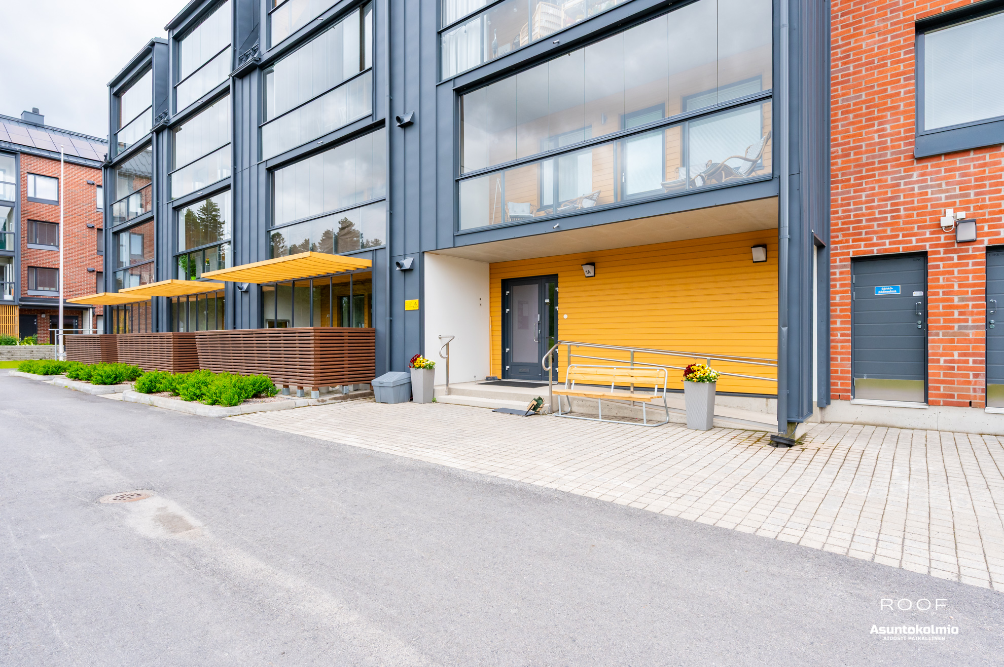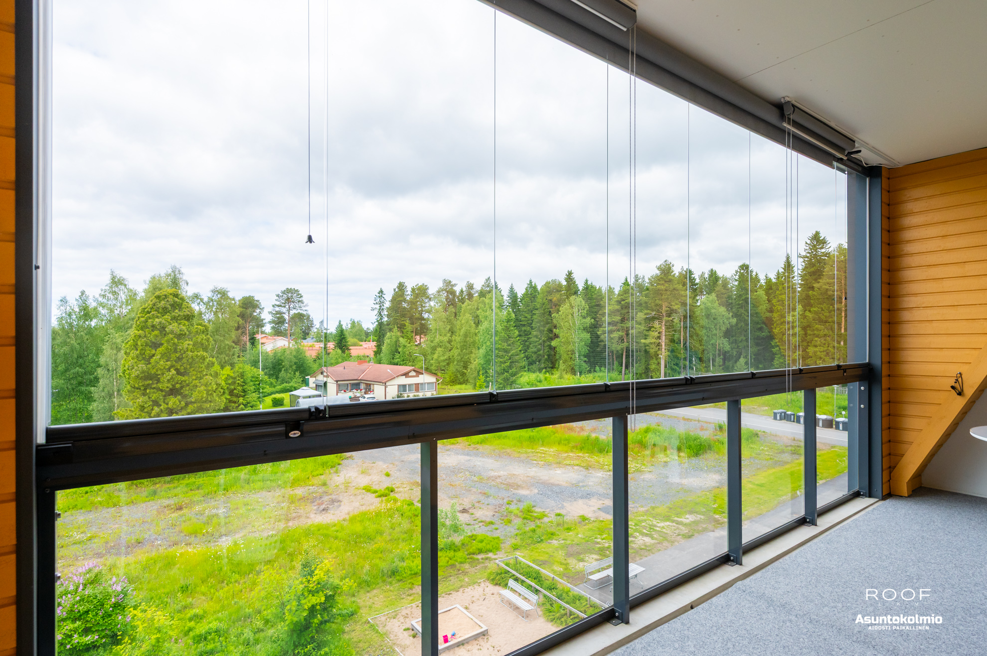 Tämä asunto sijaitsee taloyhtiön parhaimmalla paikalla, neljännessä kerroksessa. Sen lasitettu parveke on koko huoneiston levyinen ja näkymät ovat sisäpihan suuntaan. Asunto itsessään on avara ja aurinkoinen. Jo sisään tullessa avautuu koko asunnon kauneus ja eteisessäkään ei ole ahdasta käytävämäisyyttä. Eteisen yhteydessä on iso vaatehuone, joka on mahdollista muuttaa takaisin saunaksi. Nykyiset omistajat ovat halunneet mieluummin säilytystilaa, jota myös keittiössä ja makuuhuoneessa on erityisen hyvin. Tässä asunnossa on rakentamisaikana tehty myös muita parannuksia, kuten laadukkaampi keittiö ja kodinhoito- ja pesutilojen lisäkaapistot. Avaraan tupakeittiöön mahtuu tarvittaessa isompikin ruokapöytä ja sohvaryhmä.
