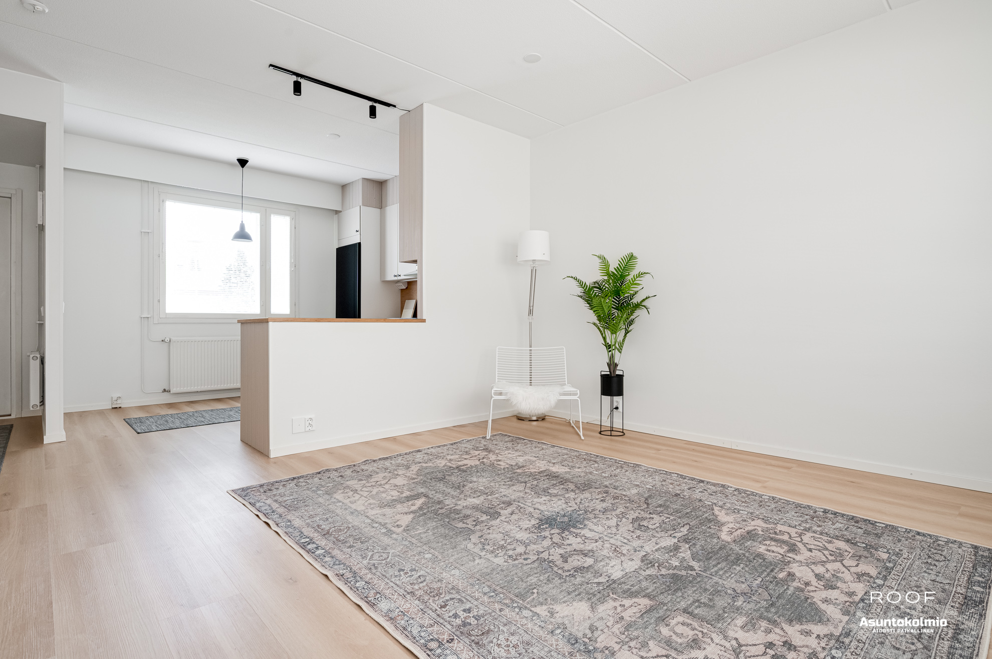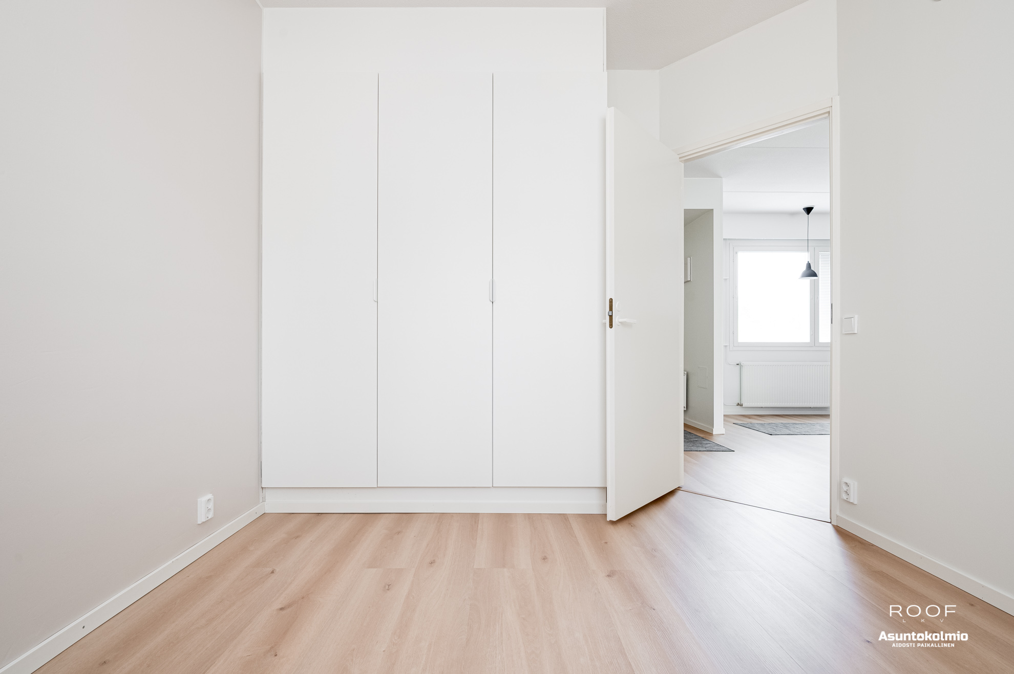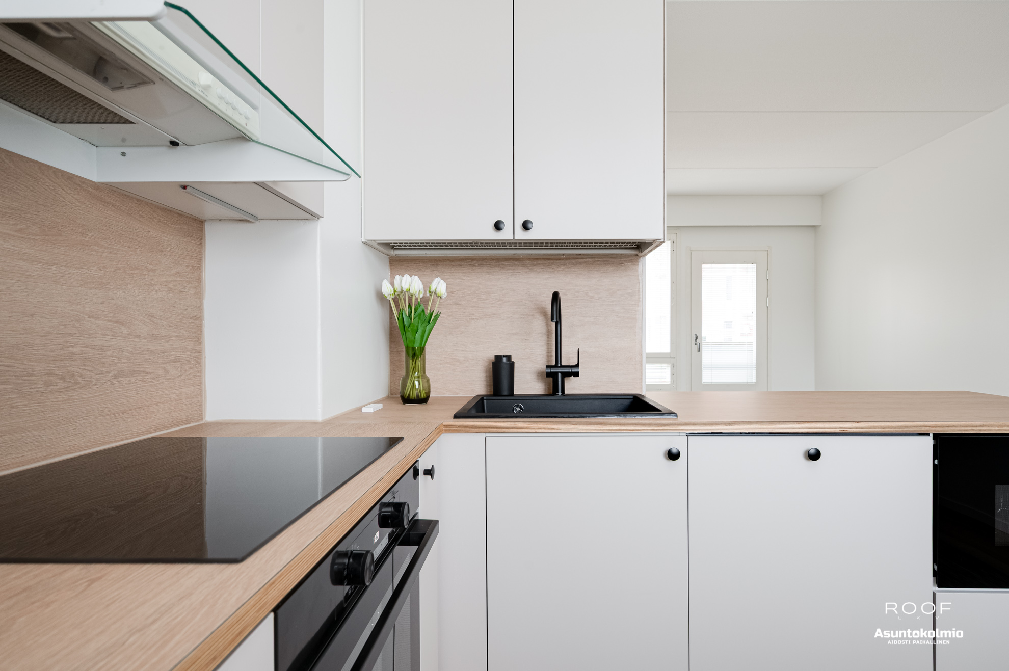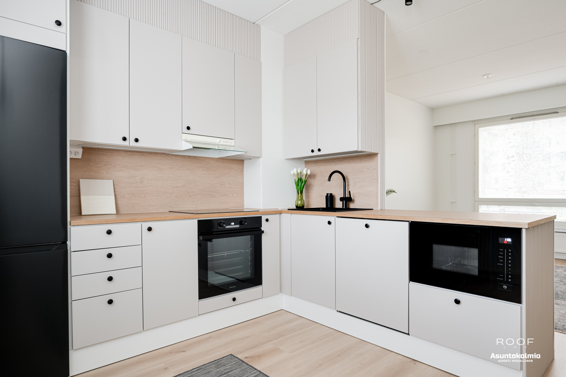 Tähän huoneistoon on helppo ihastua, sillä asunto on täysin muuttovalmis ja vapautuu nopeasti seuraavalle. Laadukkain materiaalein toteutettu keittiöremontti on todella onnistunut; Hannun kalusteverstaan komeat kaapistojen ovet sekä integroidut kalusteet, kuten mikro, tuovat keittiöön ripauksen luksusta. Tärkeimpänä remonttina on juuri valmistunut pesuhuoneen saneeraus, jossa tila on saanut ensinnäkin nykyaikaisen ilmeen, unohtamatta teknistä toimivuutta. Pesutornille on luotu paikka ja tila on muutenkin maksimaalisesti hyödynnetty. Oma ikkunallinen sauna on myös siistikuntoinen. Lattia- ja seinäpintojen viimeistelyt ovat taidolla toteutetut, ja kuinka onkaan mukava seuraavan muuttaa asumaan, kun käytön jälkiä ei ole!