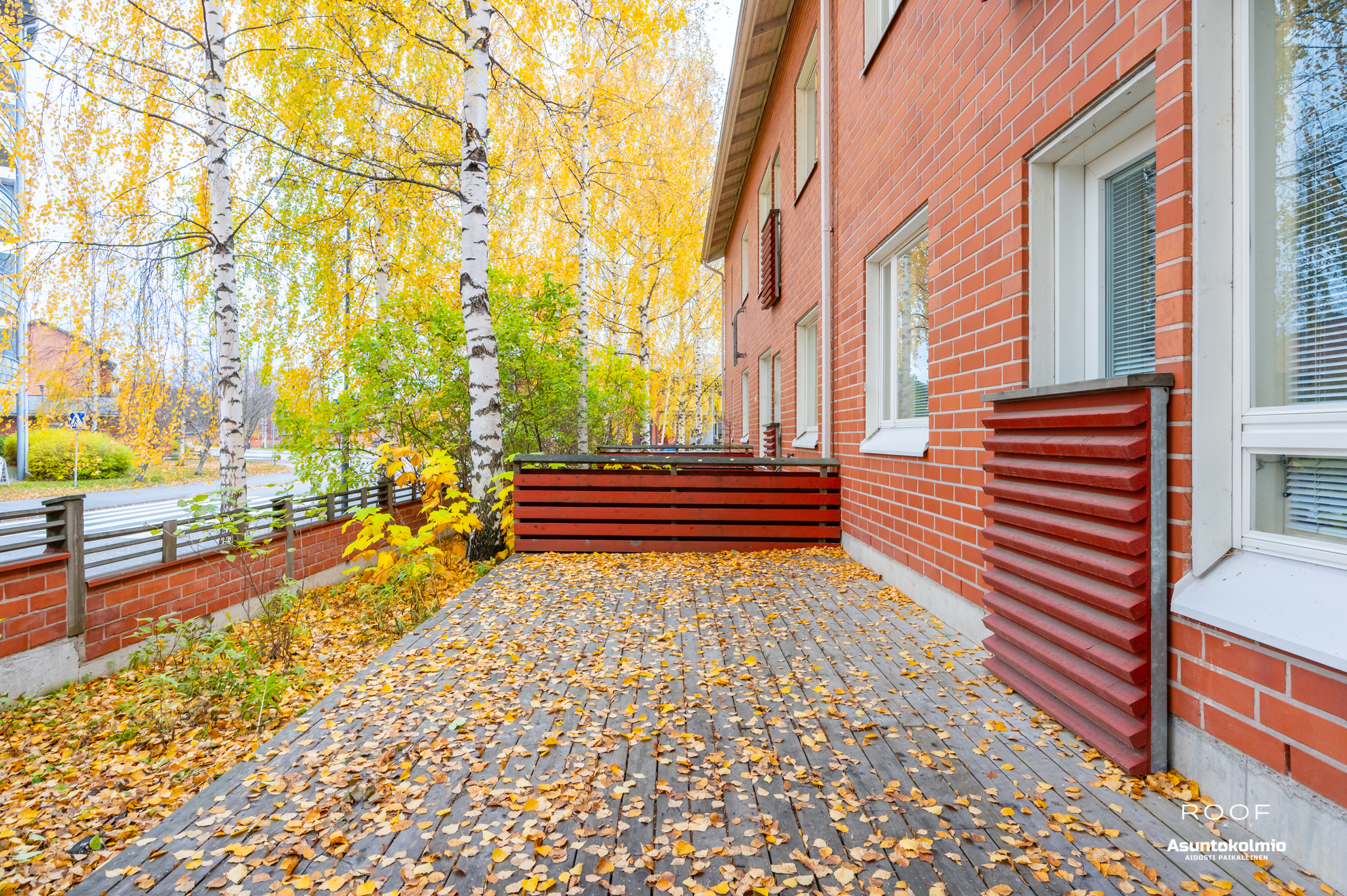 Helppohoitoiselta takapihalta löytyy iso terassi, joten tänne loihdit helposti oman keitaasi kesäksi. Takapiha on myös valmiiksi aidattu, joten se on turvallinen niin lemmikeille kuin perheen pienimmillekin.