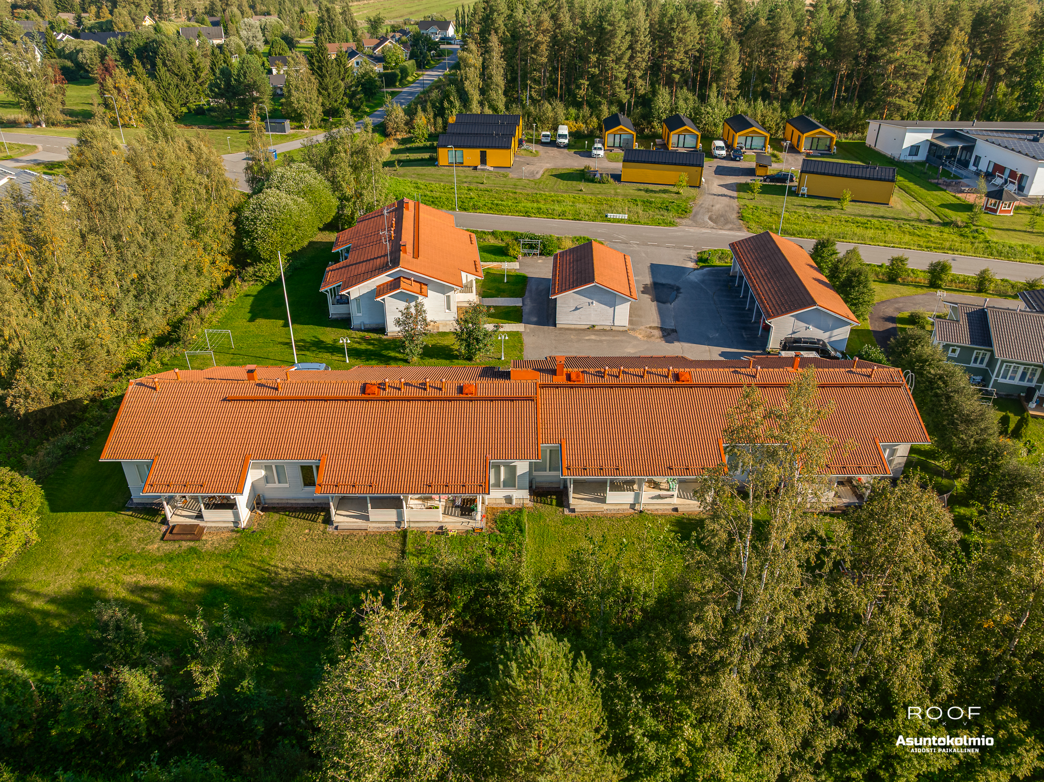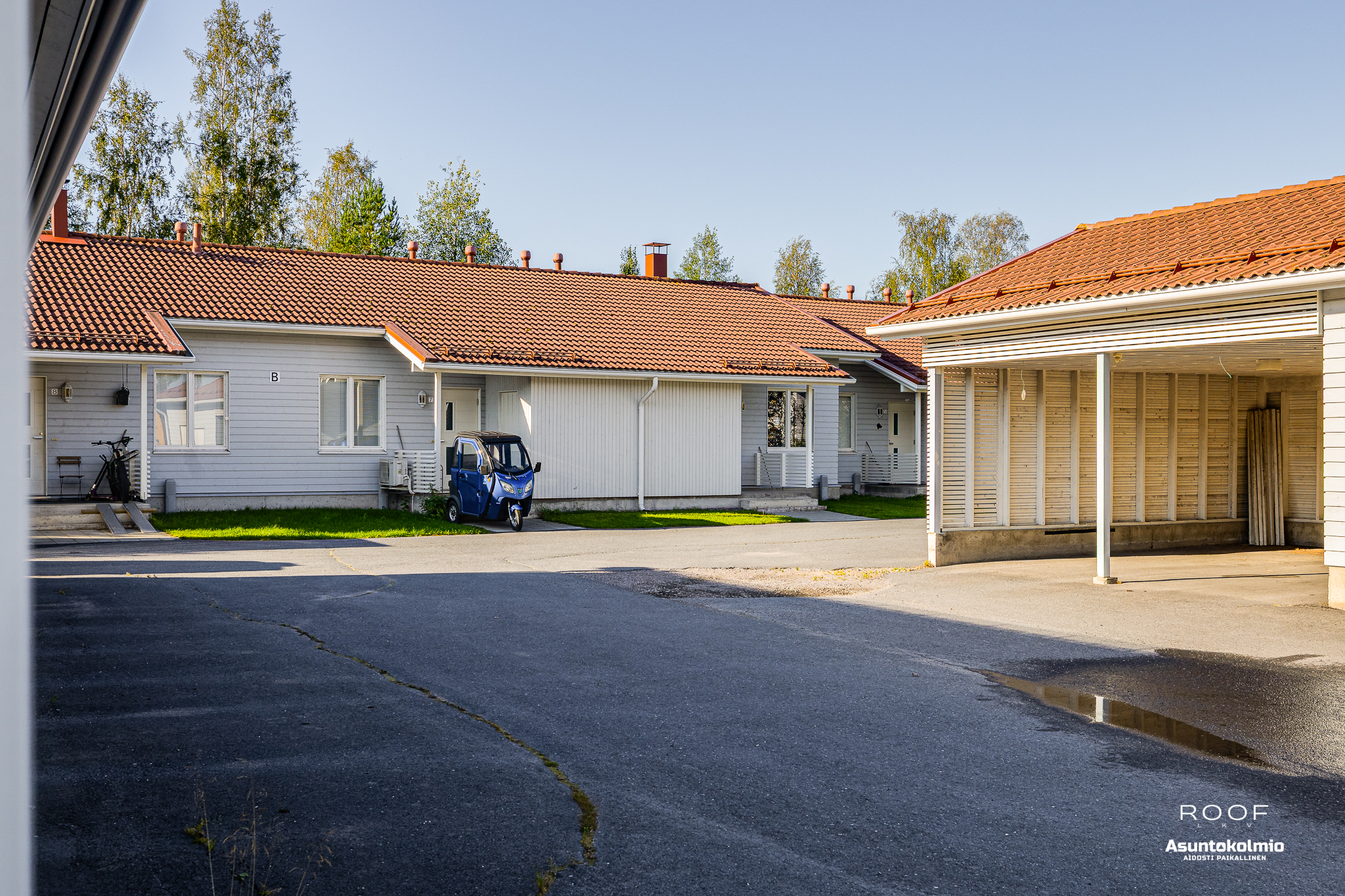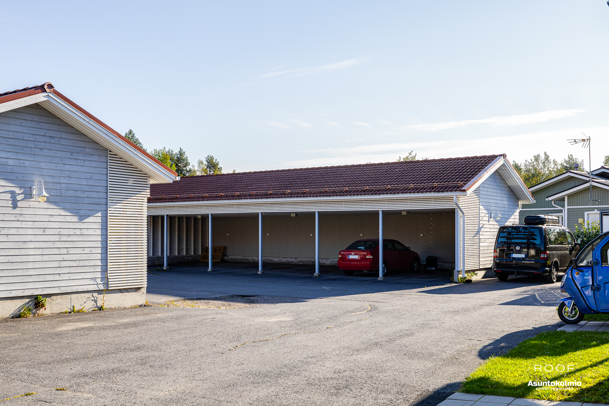 Huoneiston yhteydessä on myös varasto, mistä löytyy lisää säilytystilaa ja autolle on pistokkeellinen katospaikka huoneiston välittömässä läheisyydessä.