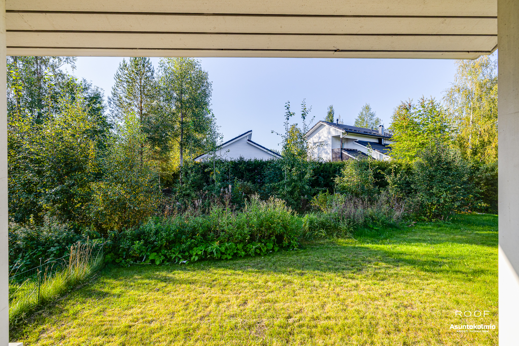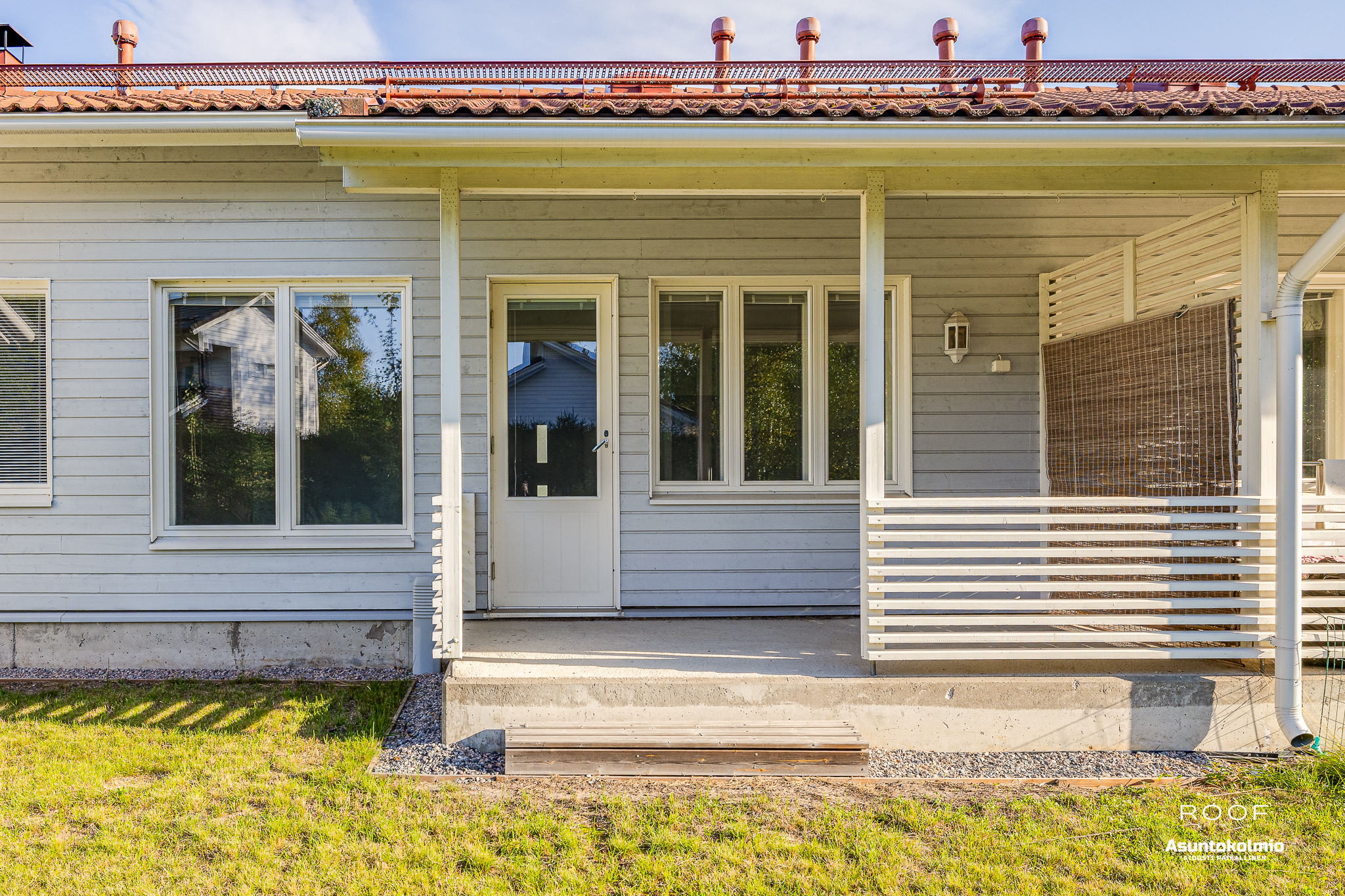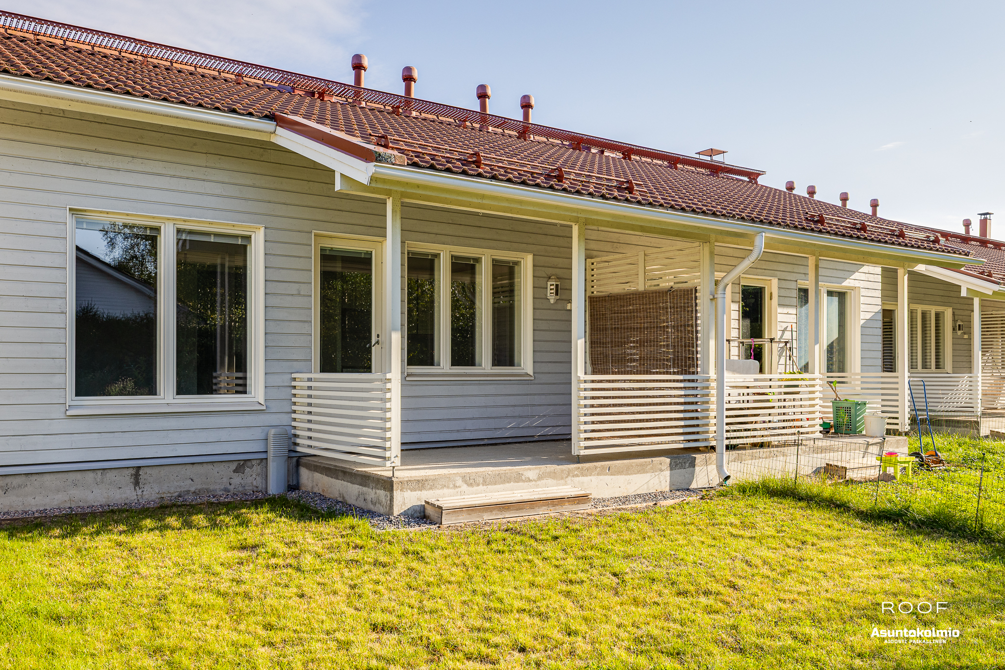 Kodin ilme on raikas ja valoisa sekä pohjaratkaisu on erittäin toimiva. Olohuoneessa ja keittiössä korotettu sisäkatto, joka tuo lisää avaruutta tähän tilaan. Näkymä ikkunoista on suojaisalle takapihalle. Olohuoneesta on kulku katetulle terassille ja omalle piha-alueelle. Olohuoneessa on myös takkavaraus. Pesuhuoneen yhteydessä on tilaa pyykkihuollolle. Tässä asunnossa on siis kaikki, mitä tarvitset toimivaan arkeen!