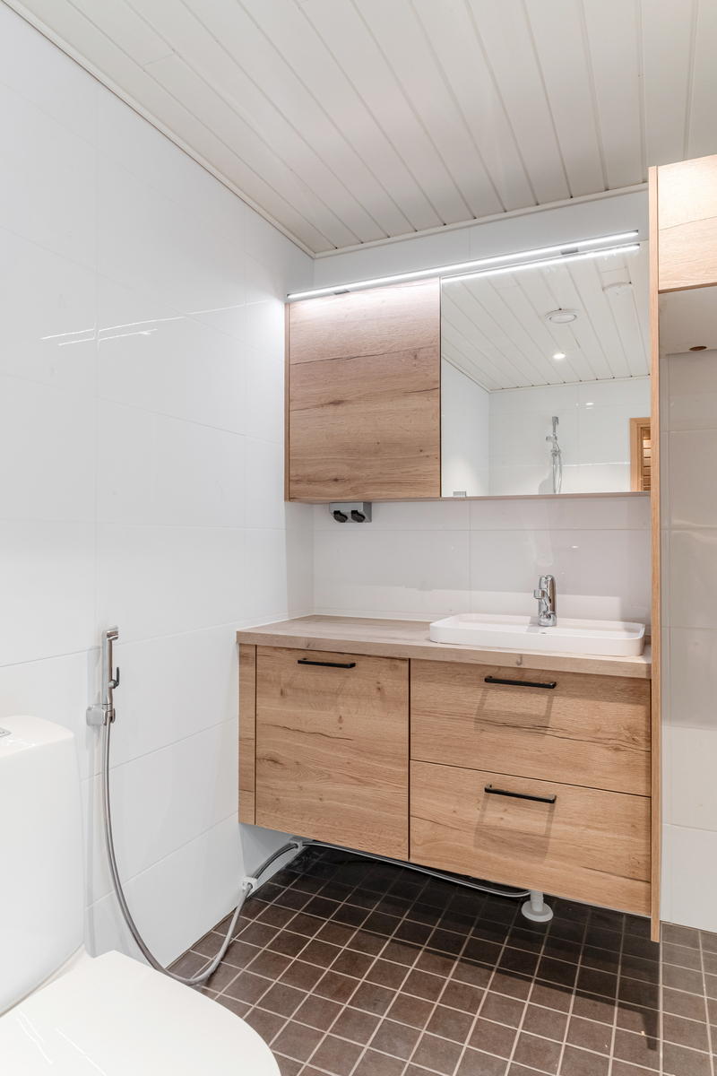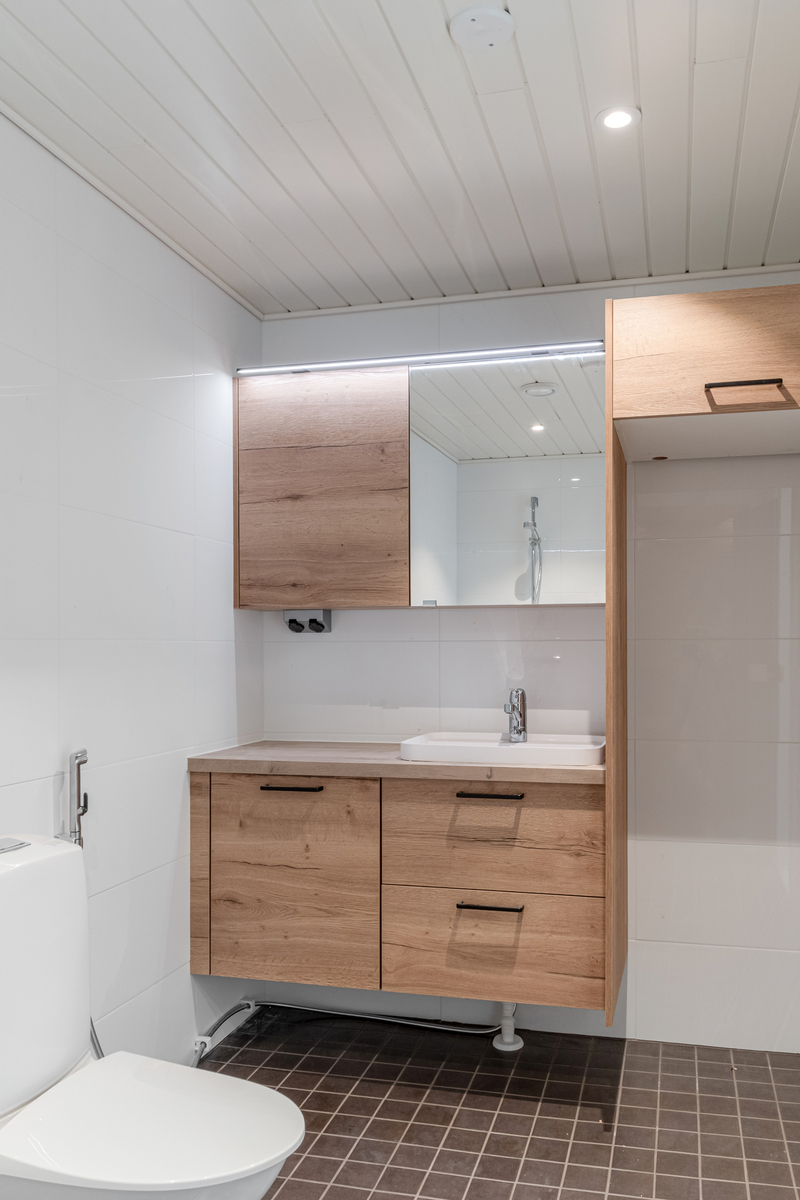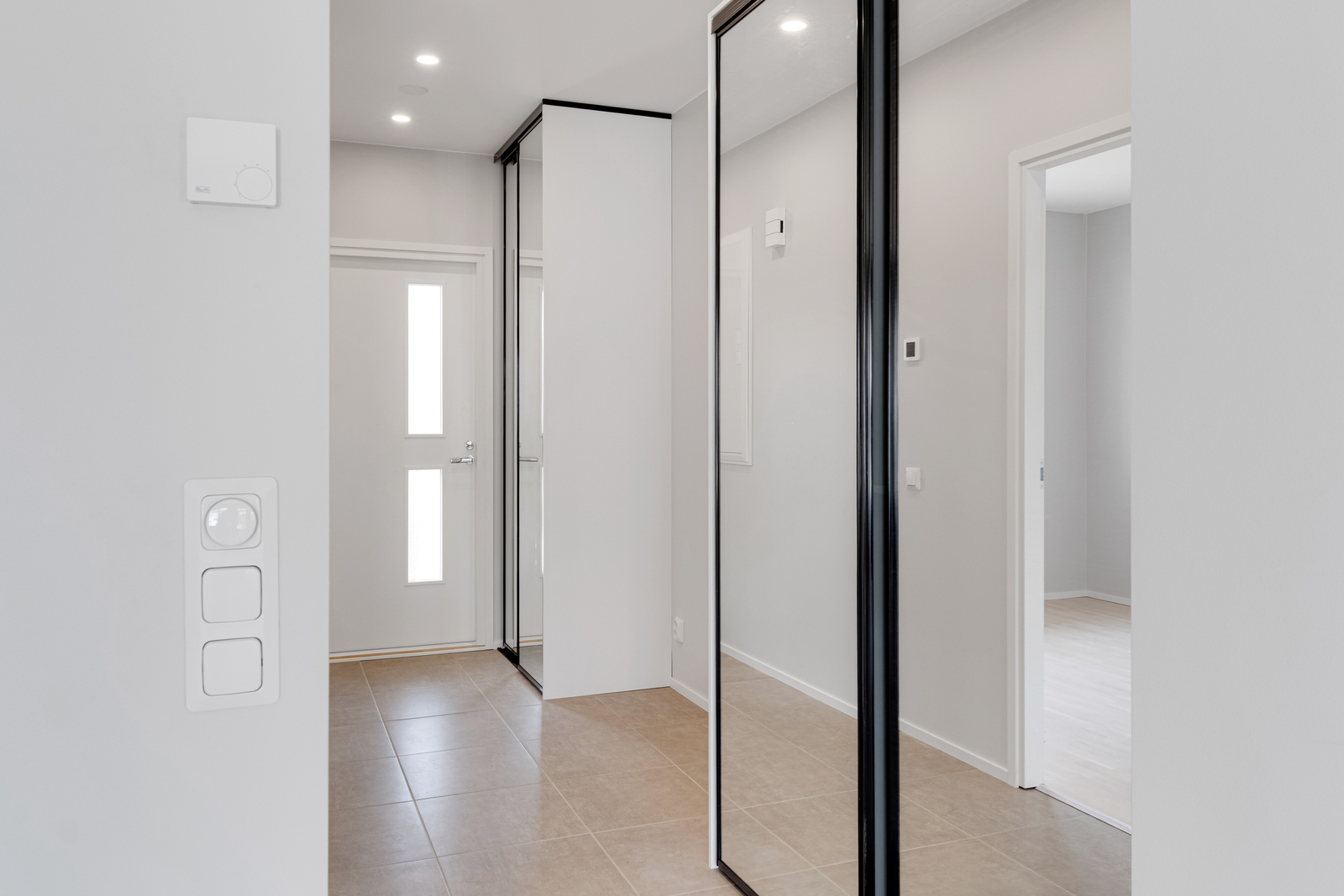 Tässä kodissa on toimiva ja huolellisesti suunniteltu pohjaratkaisu, jossa jokainen neliö on käytetty viisaasti. Vaaleat pintamateriaalit tuovat tilaan valoisuutta ja avaruutta, ja kattoon upotetut valot viimeistelevät modernin ilmeen.