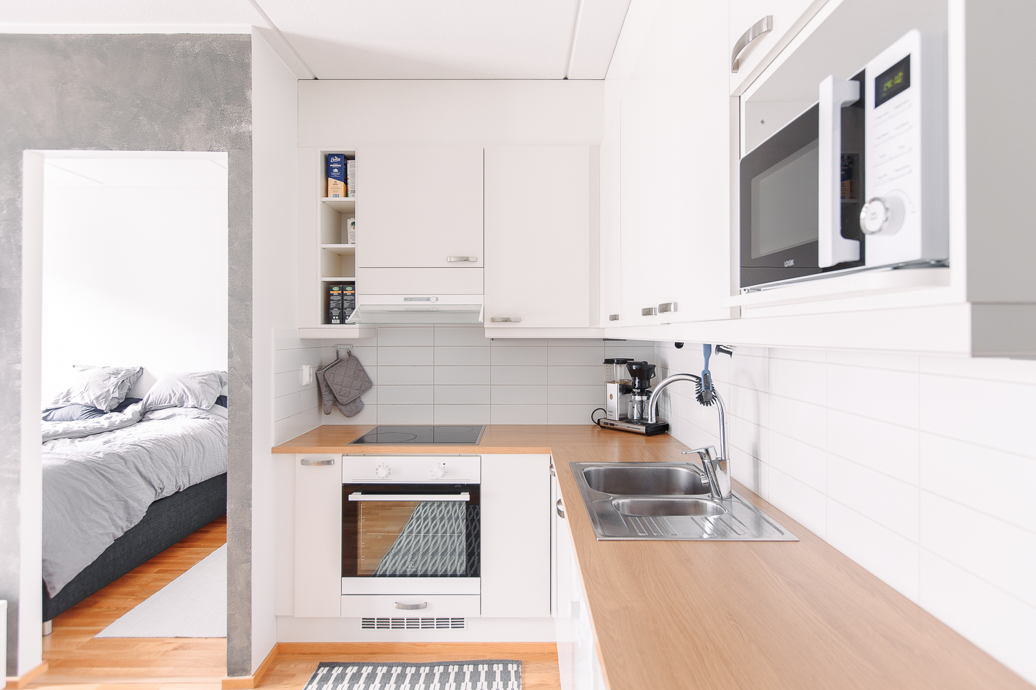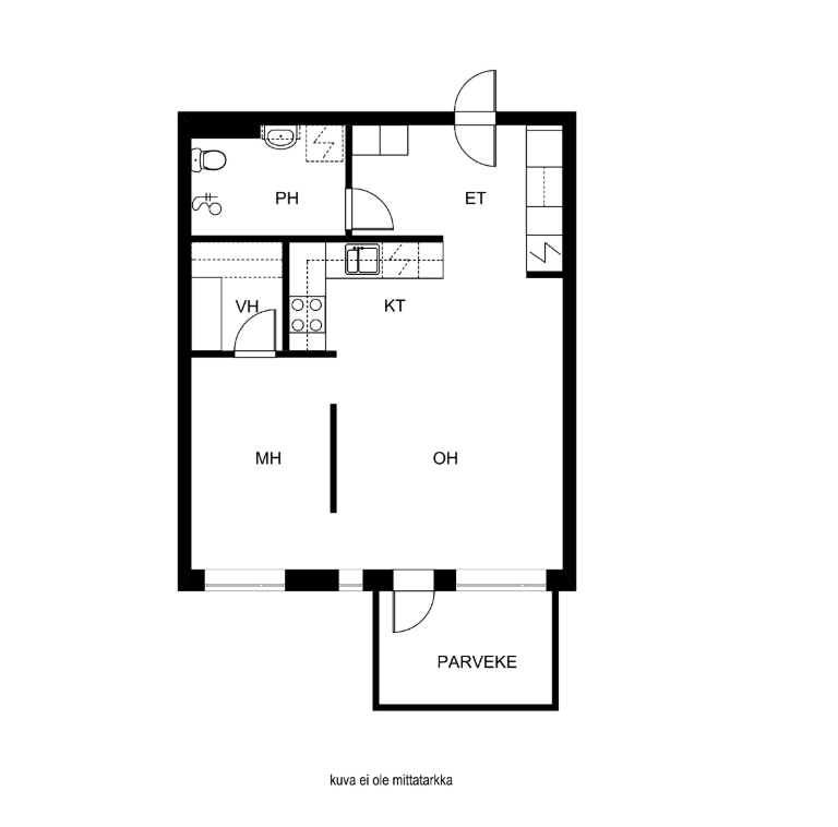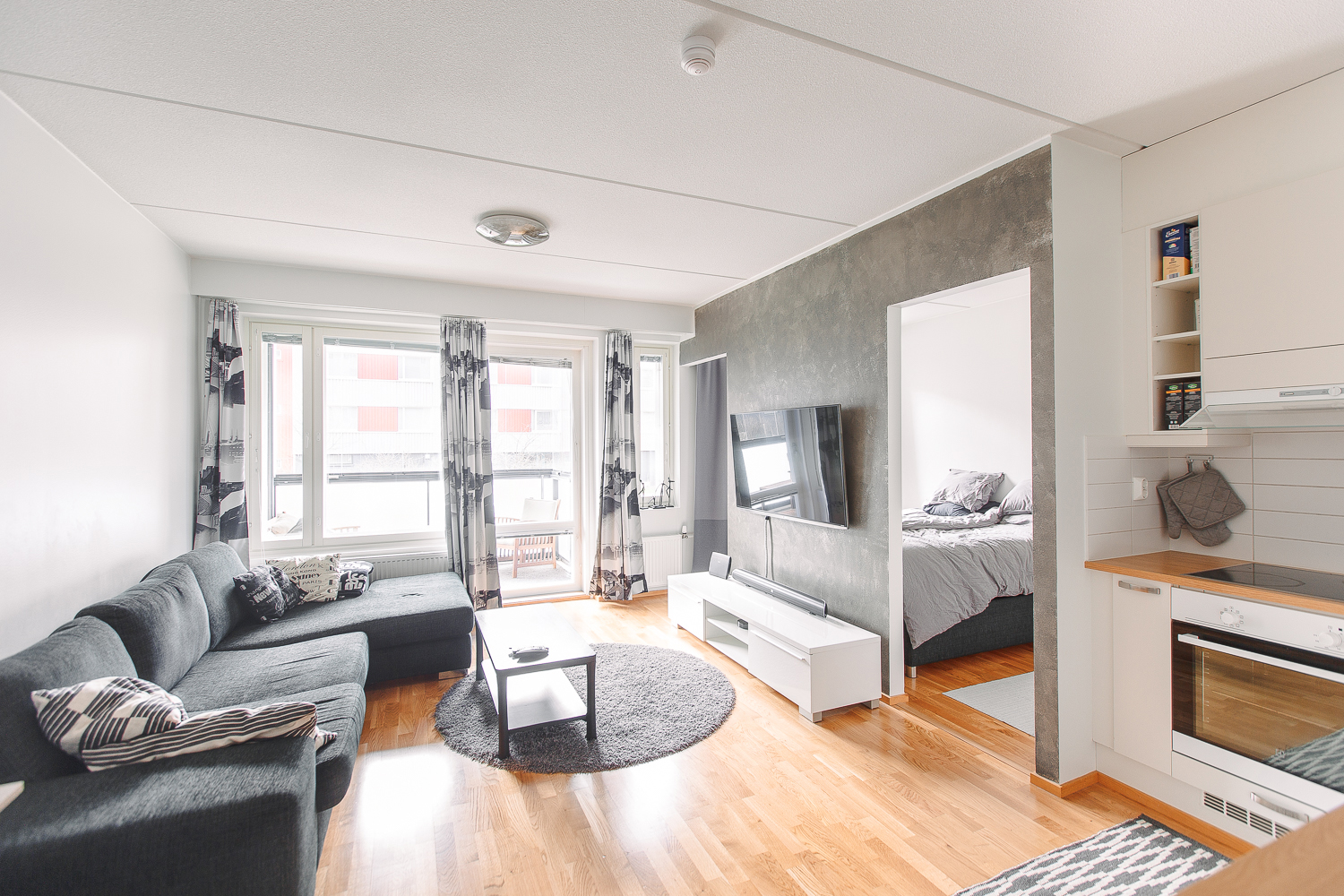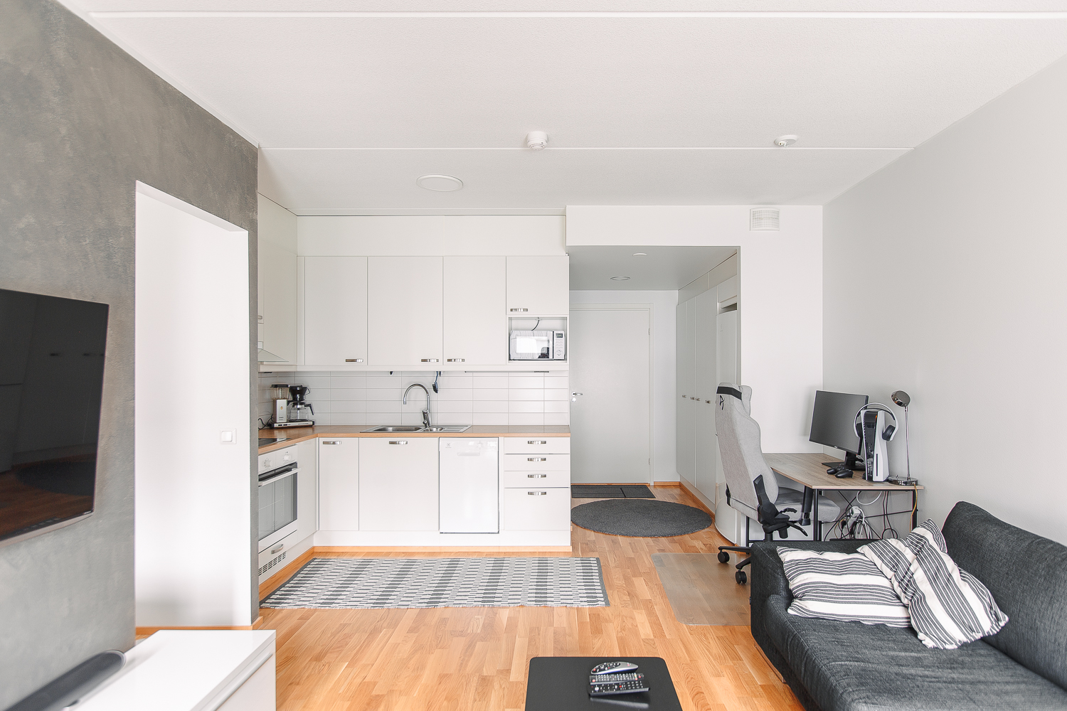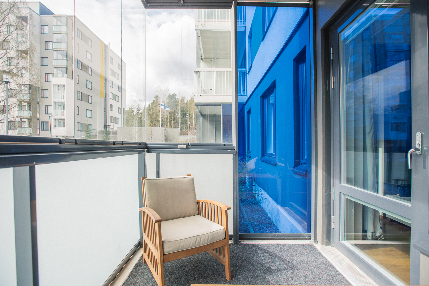 Asunnossa on kylpyhuone, avokeittiö, olohuone, lasitettu parveke ja makuuhuone. Makuuhuoneen yhteydessä on vaatehuone, joka tuo lisää säilytystilaa huoneistoon. Autopaikka myydään erikseen omalla osakesarjalla hintaan 3 900 €.