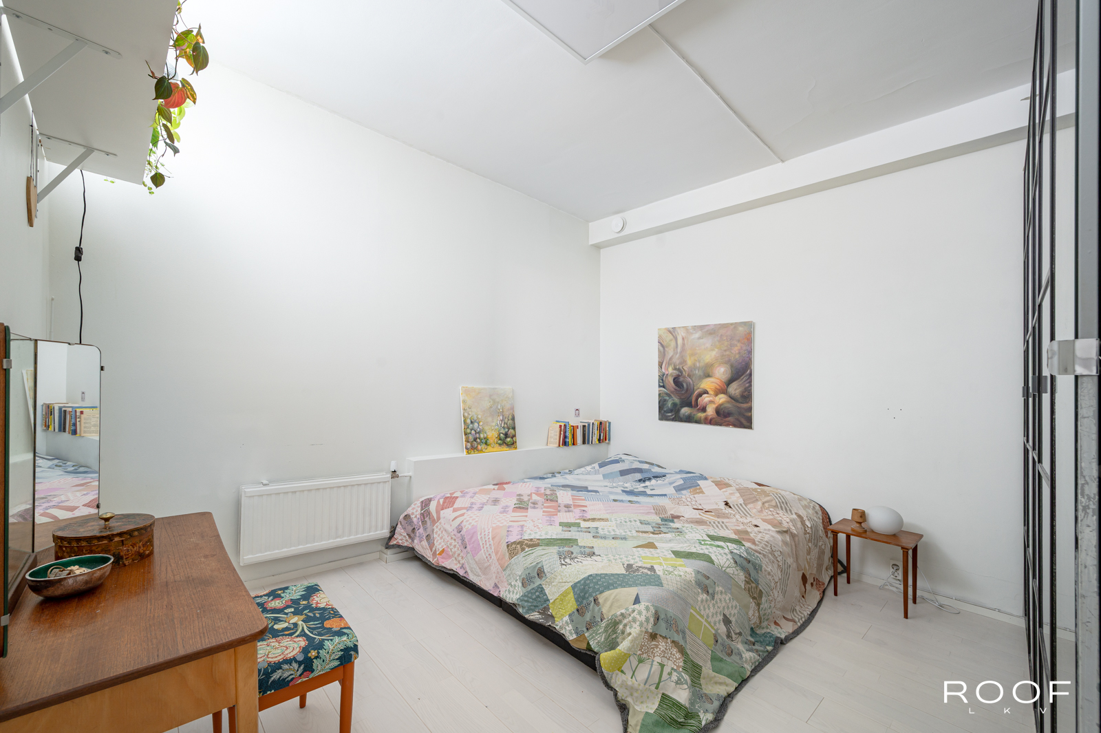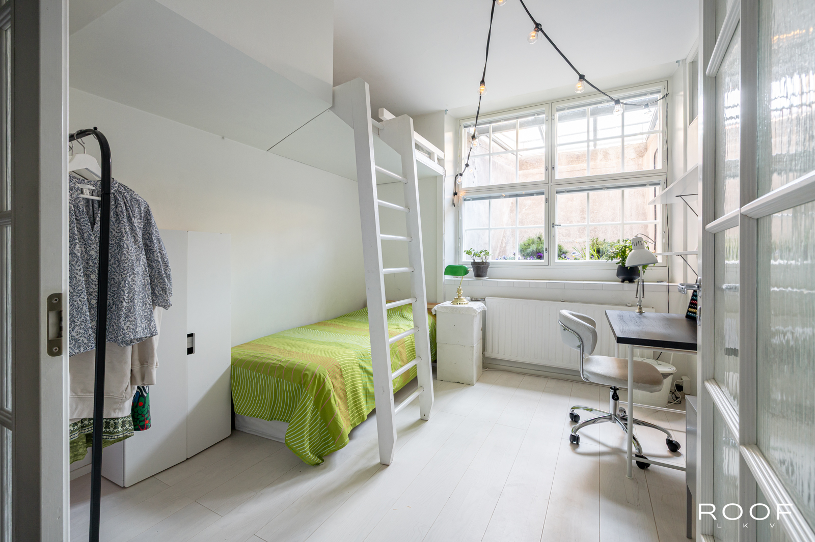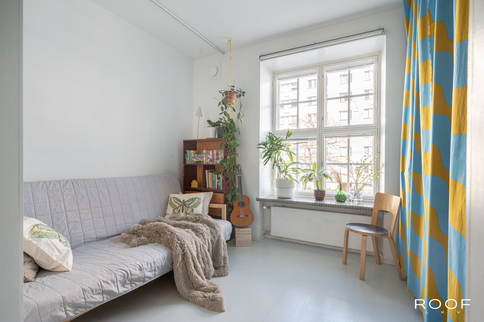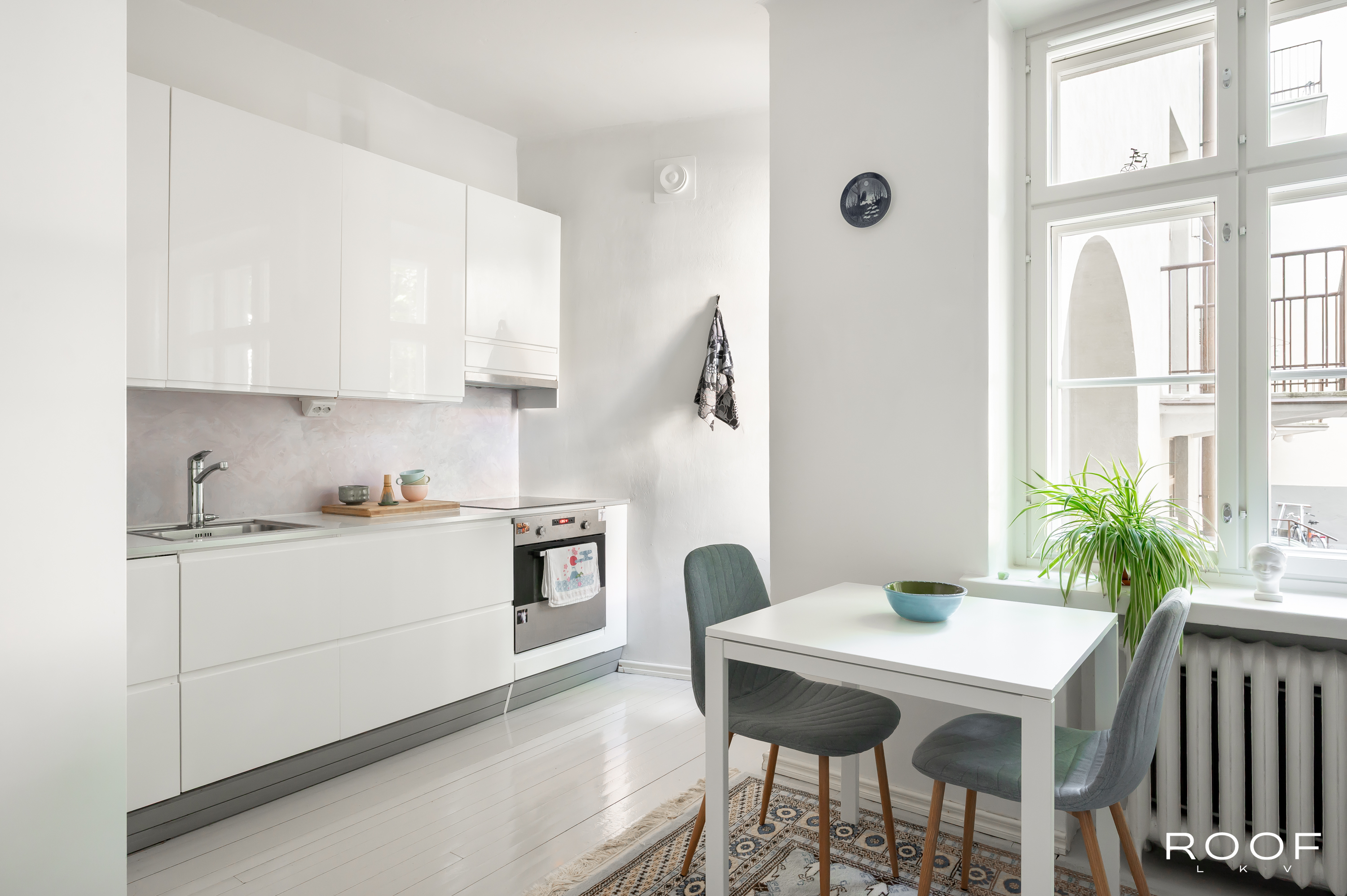 Tässä kodissa on kaksi sisäänkäyntiä – toinen alakerrassa ja toinen yläkerrassa. Yläkerrassa on tilava keittiö, jonka ikkunasta on näkymä taloyhtiön kauniille sisäpihalle, wc ja toinen iso huone, joka on jaettu kahteen osaan. Tällä hetkellä toinen puoli toimii olohuone/makuuhuoneena ja toinen puoli työskentelytilana. Ikkunanäkymä on Hämeenkadulle.