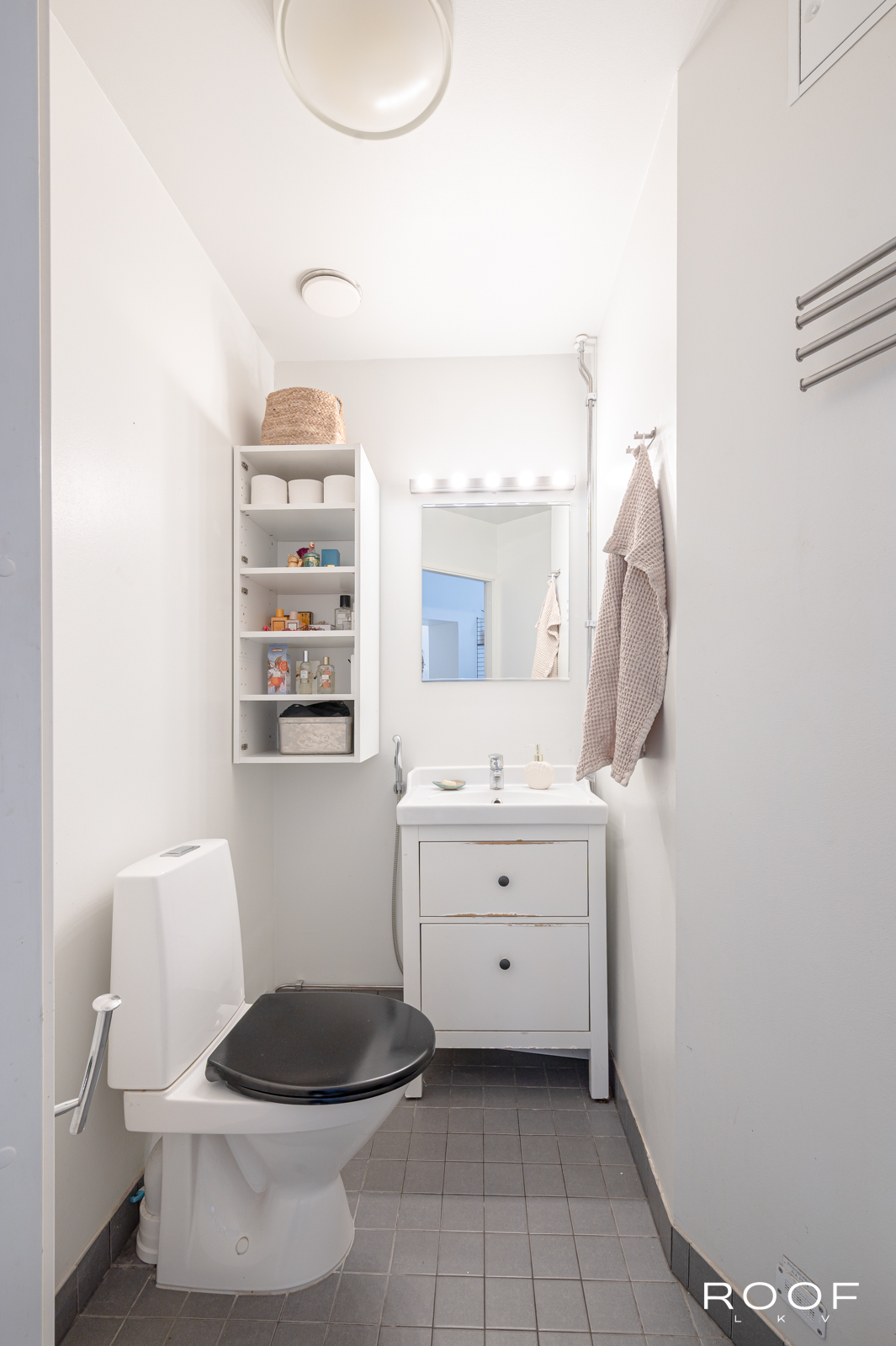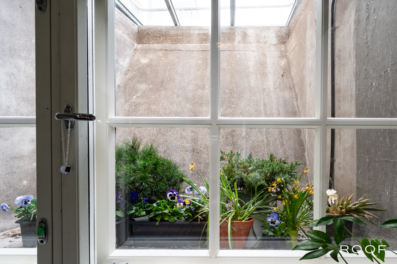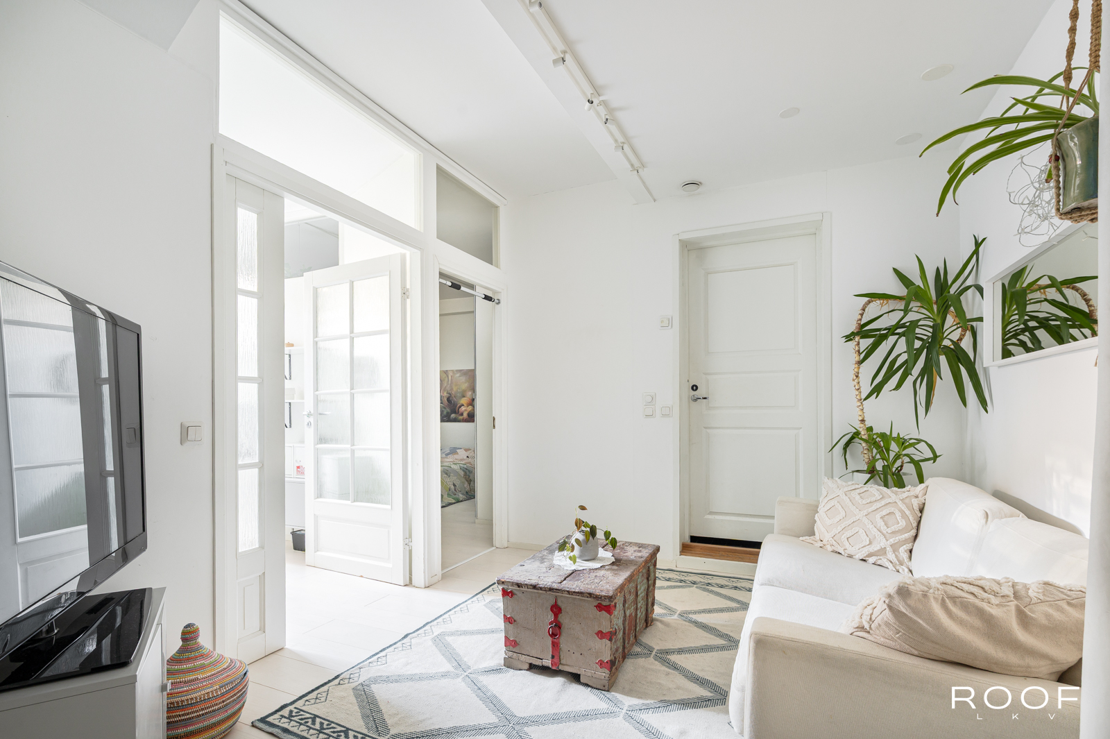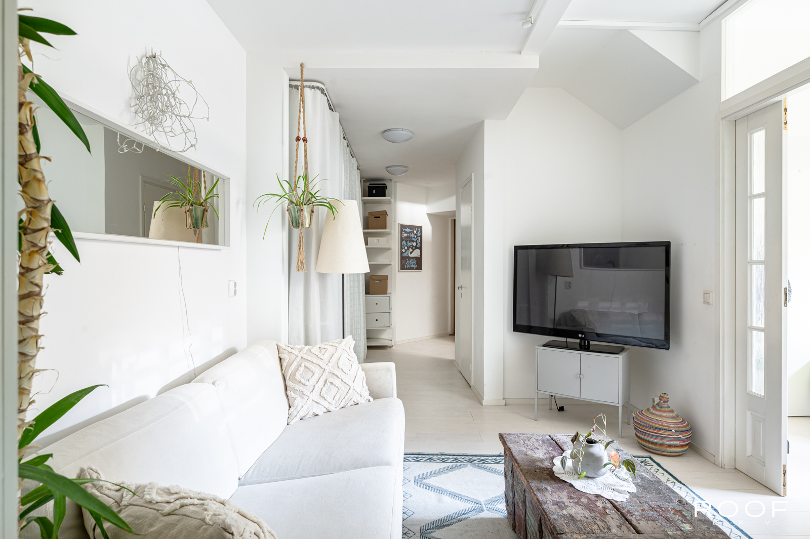 Tässä kodissa on kaksi sisäänkäyntiä – toinen alakerrassa ja toinen yläkerrassa. Yläkerrassa on tilava keittiö, jonka ikkunasta on näkymä taloyhtiön kauniille sisäpihalle, wc ja toinen iso huone, joka on jaettu kahteen osaan. Tällä hetkellä toinen puoli toimii olohuone/makuuhuoneena ja toinen puoli työskentelytilana. Ikkunanäkymä on Hämeenkadulle.