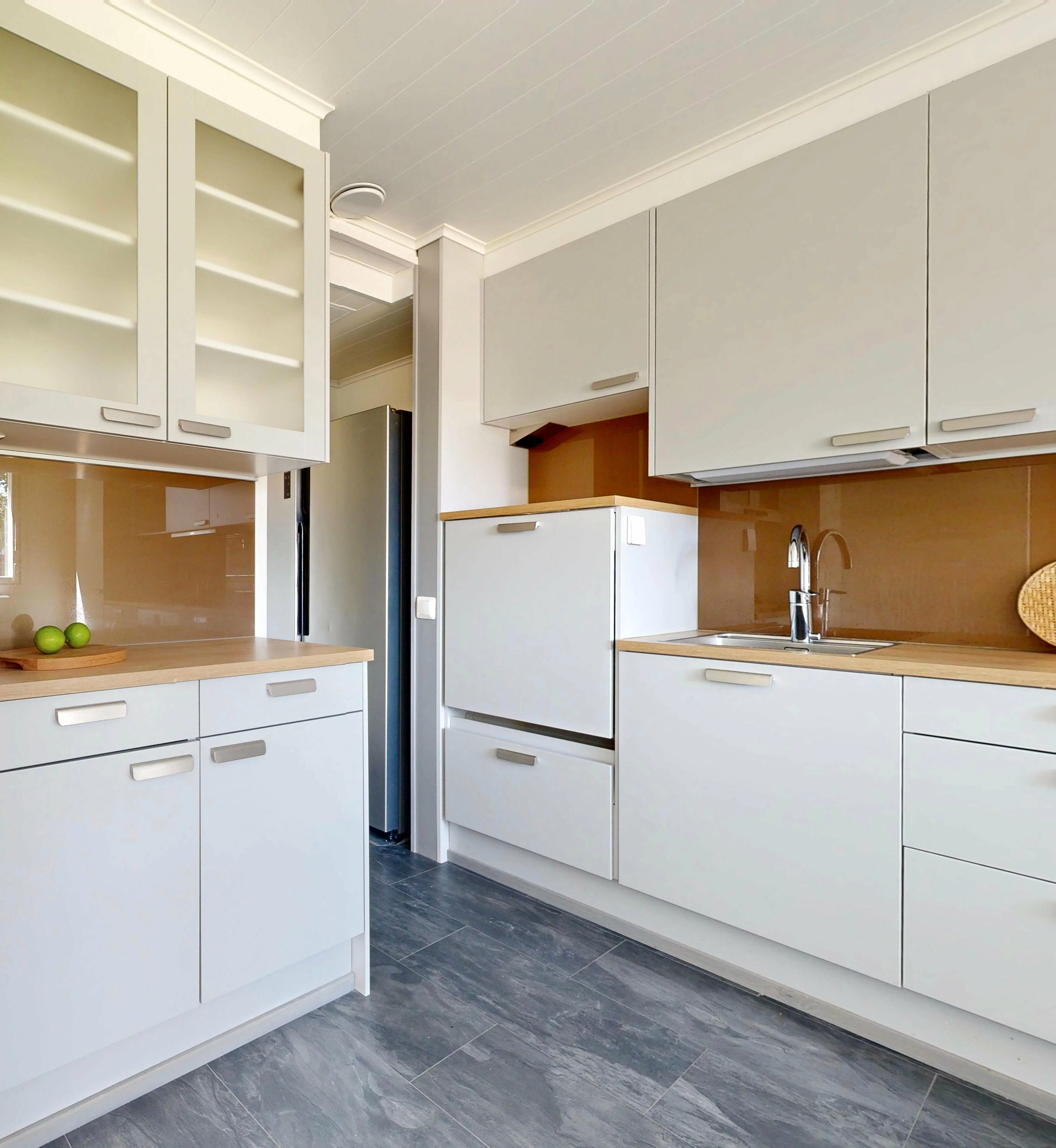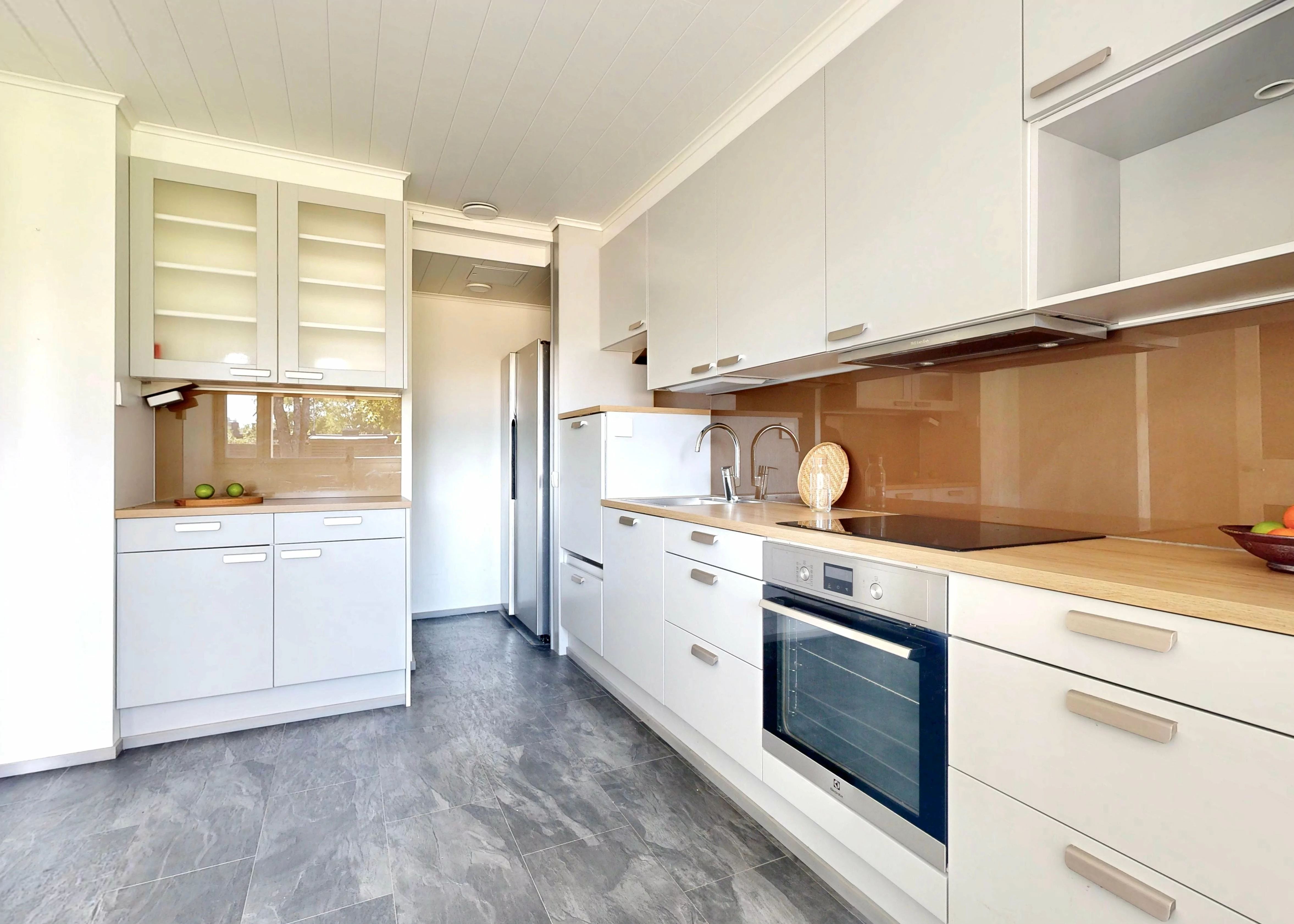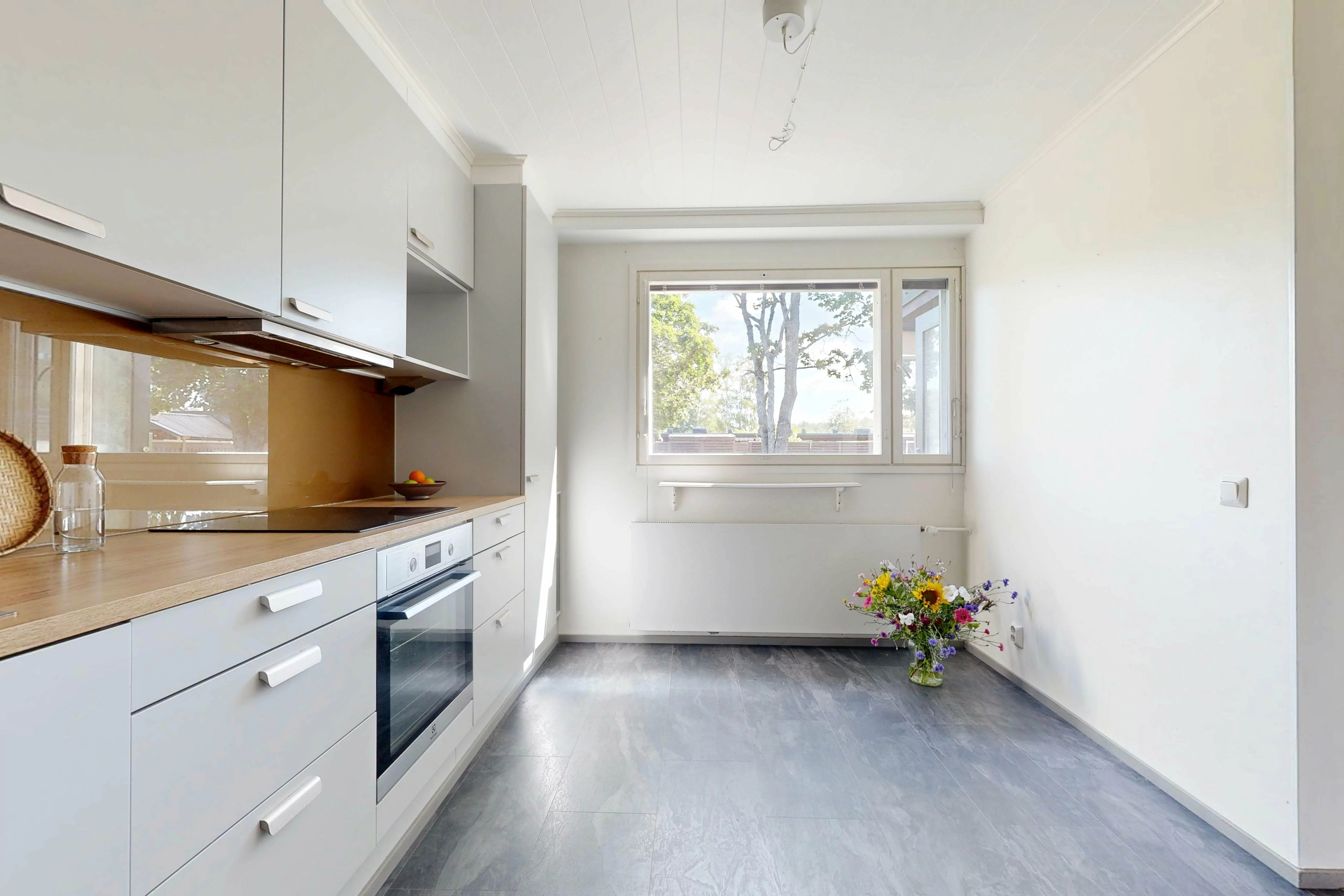 Tämä koti ihastuttaa tunnelmallaan. Olohuoneeseen astuttaessa tila saa huokaisemaan. Isot ikkunat tuovat valoa ja avaruutta. Olohuoneesta löytyy takka sekä käynti asunnon terassille. Keittiössä on valkoiset kaapistot, hyvin säilytys-ja laskutilaa sekä tilaa ruokailuryhmälle.