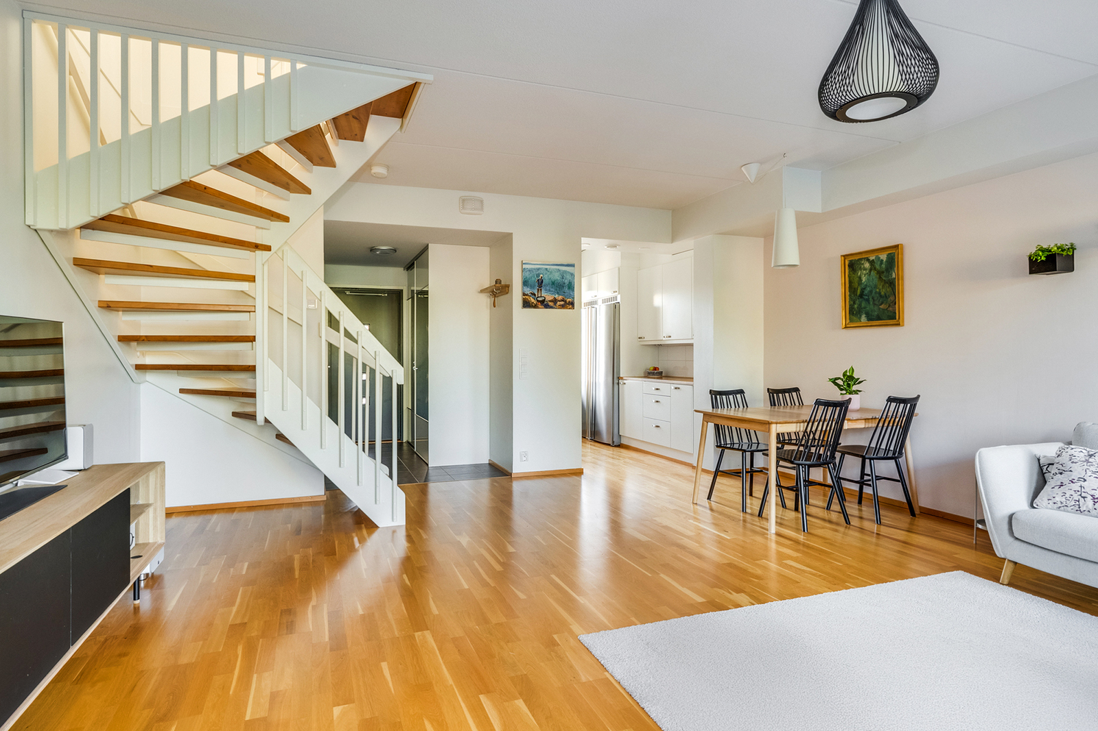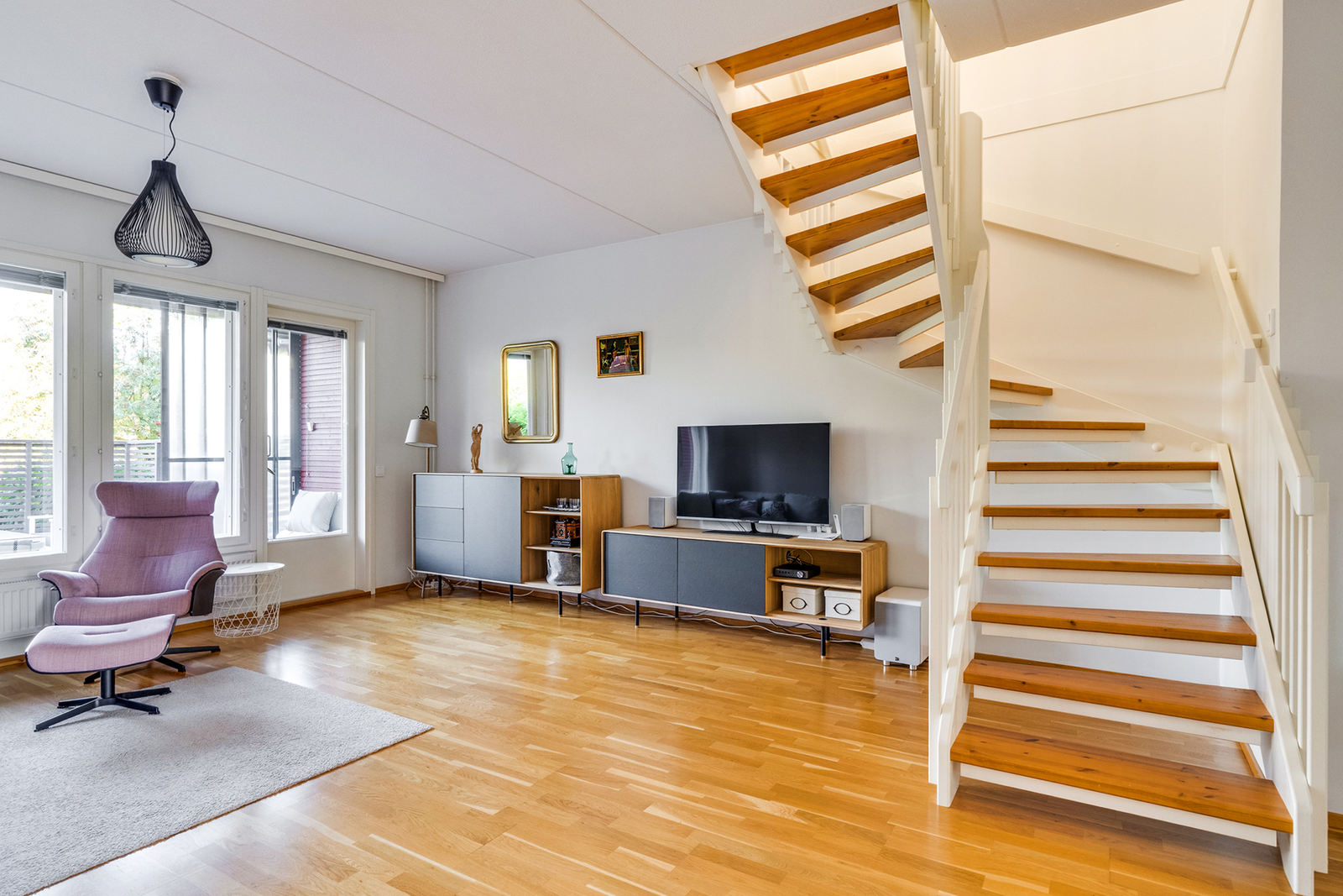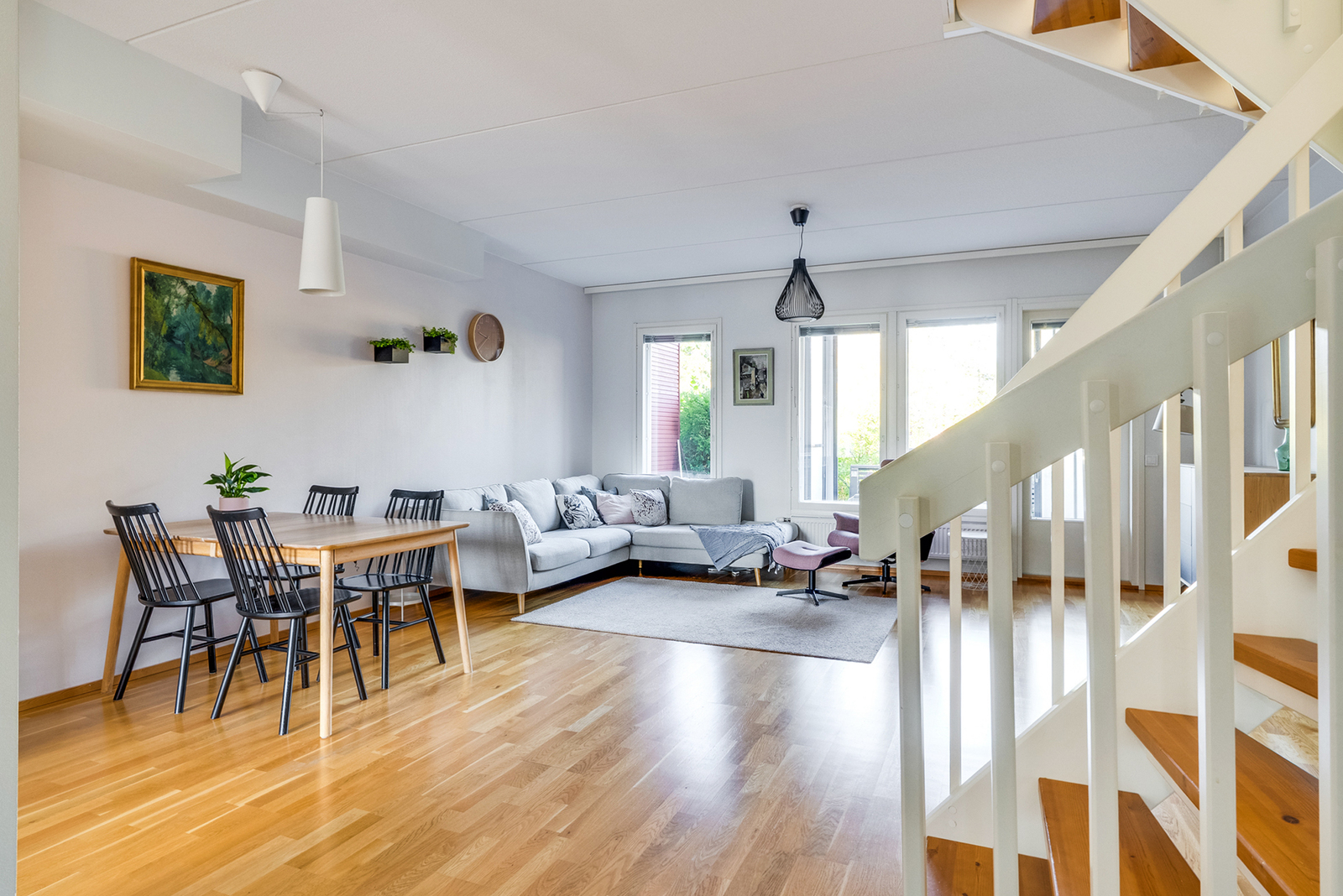 Nyt tarjolla Tampereen Muotialasta valoisa rivitalohuoneisto. Asunto tarjoaa tilojensa, varustuksiensa ja pohjaratkaisun osalta vastinetta tämän päivän toiveisiin. Keittiö vastaa materiaaleiltaan ja työtasotiloiltaan tämän päivän tarpeita. Keittiön yhteyteen mahtuu hienosti isompikin ruokapöytä. Valoisaan olohuoneeseen mahtuu kunnollinen sohvaryhmä ja olohuoneesta on kulku asunnon osittain lasitetulle terassille. Alakerrasta löytyy myös erillinen wc, joka helpottaa kiireistä arkea. Huoneiston yläkerrasta löytyy kaksi tilavaa makuuhuonetta sekä kylpyhuone- ja saunaosasto. Kylppärin yhteydessä on tilaa myös kodinhoidolle. Huoneiston kolmannen makuuhuoneen seinä on purettu ja näin tilaan on saatu avaruutta, joka palvelee nykyisiä omistajia työpisteenä. Työtilasta löytyy ilmalämpöpumppu ja siitä on käynti asunnon lasitetulle parvekkeelle. Vaatehuoneen lisäksi asunnolla on kaksi erillistä varastoa, joista toinen löytyy huoneiston välittömässä läheisyydessä etupihalla.