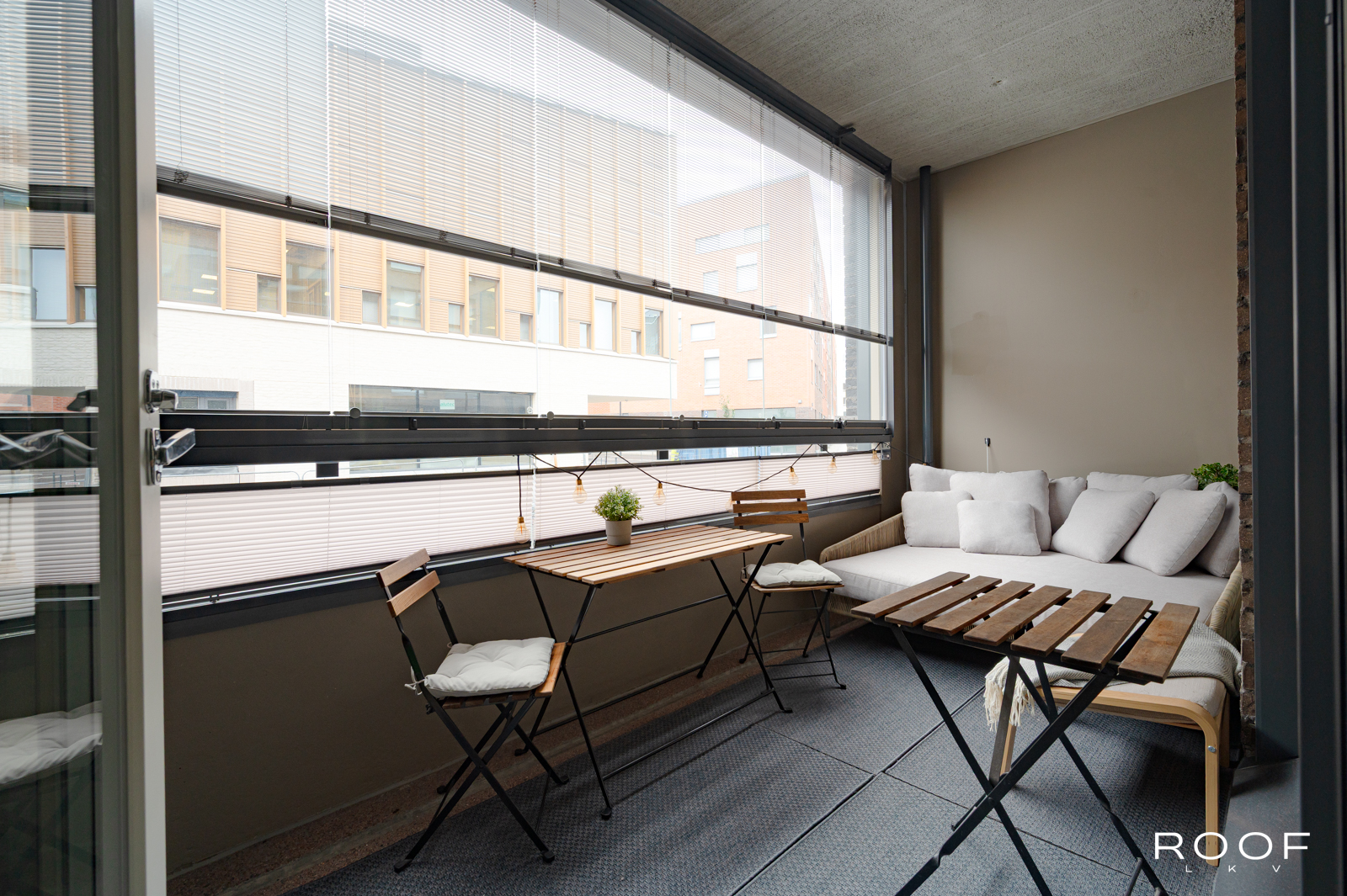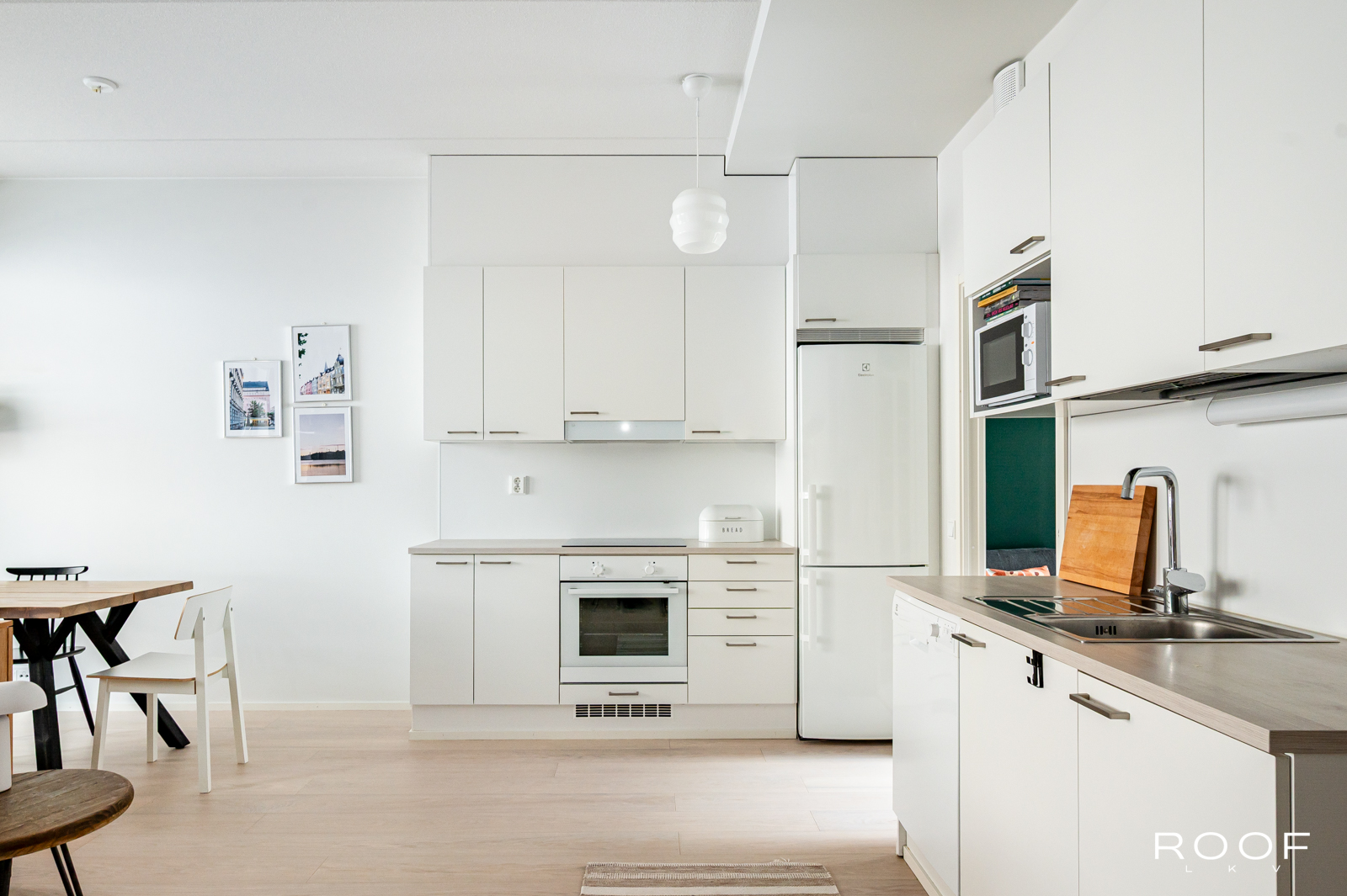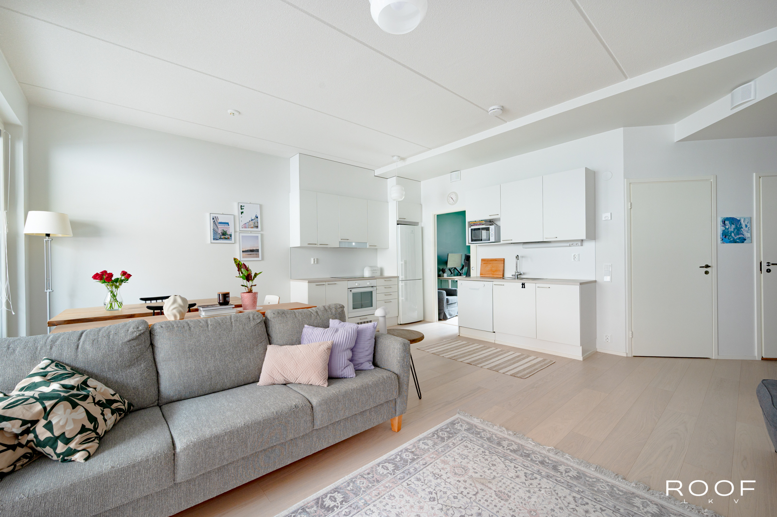 Huoneiston sydän on avara olohuone, joka yhdistyy tyylikkääseen avokeittiöön. Keittiö on varusteltu laadukkailla kodinkoneilla, ja kaksi makuuhuonetta tuovat joustavuutta arkeen. Huonekorkeus korostaa tilantuntua ja valoisuutta, ja lasitettu parveke toimii erinomaisena lisähuoneena ympäri vuoden.