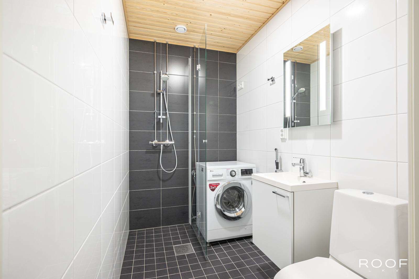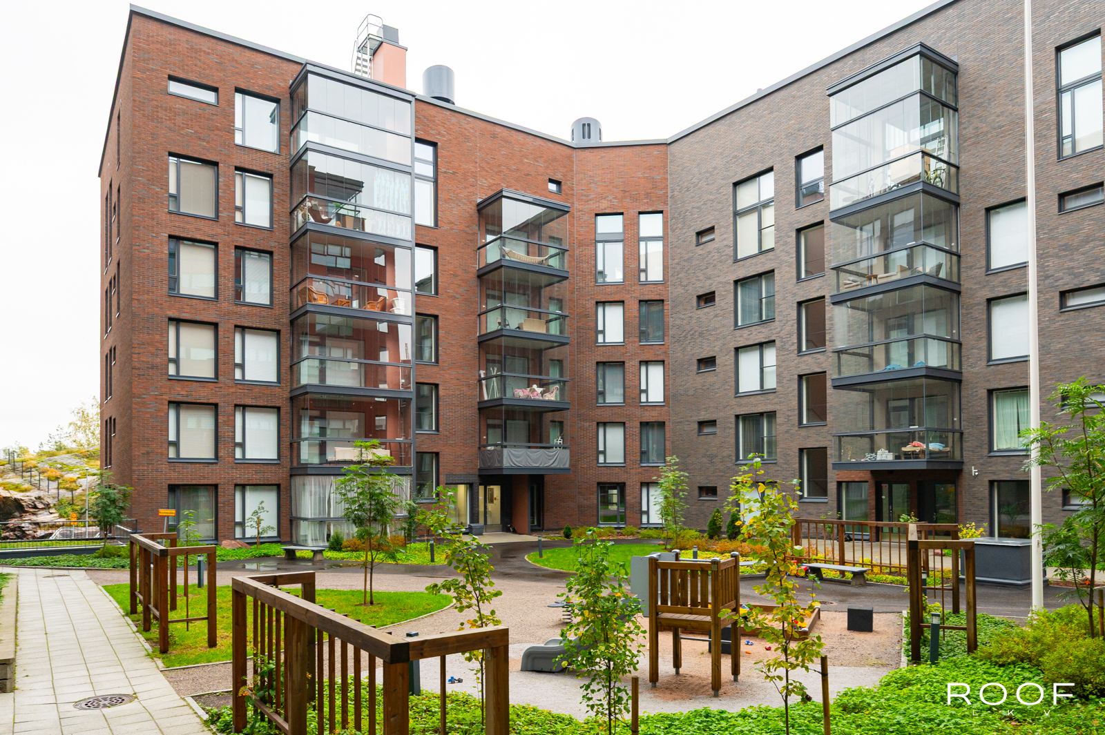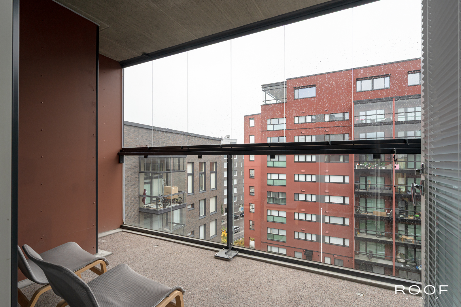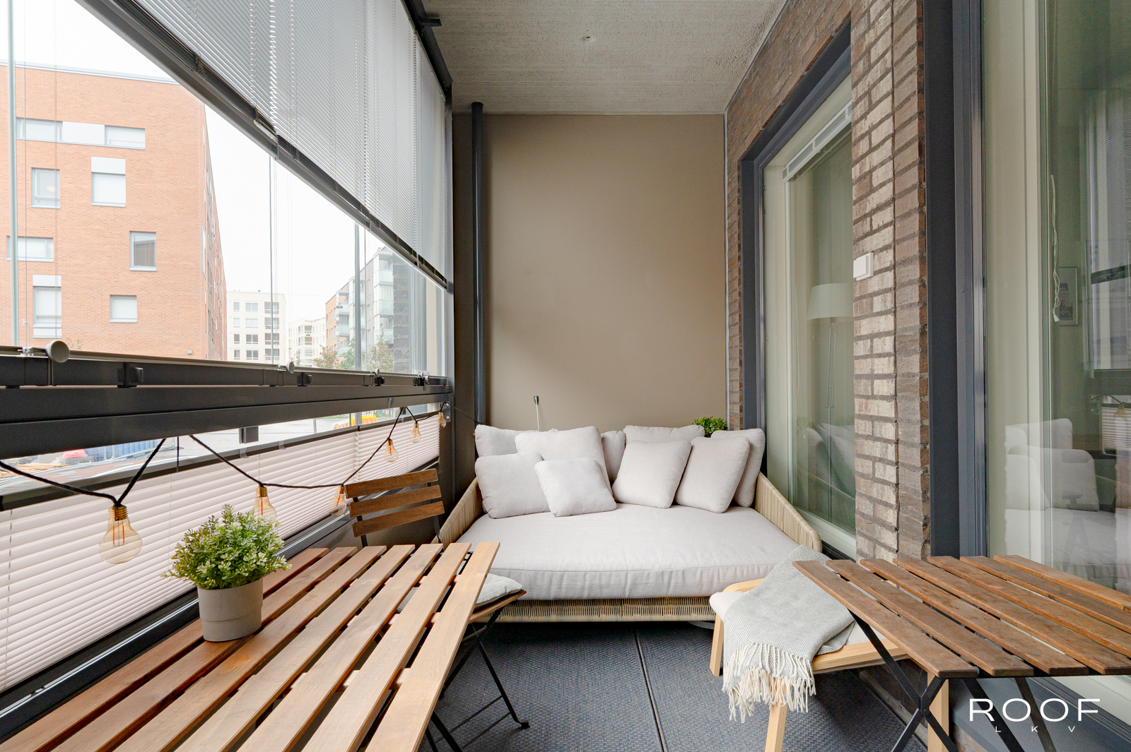 Huoneiston sydän on avara olohuone, joka yhdistyy tyylikkääseen avokeittiöön. Keittiö on varusteltu laadukkailla kodinkoneilla, ja kaksi makuuhuonetta tuovat joustavuutta arkeen. Huonekorkeus korostaa tilantuntua ja valoisuutta, ja lasitettu parveke toimii erinomaisena lisähuoneena ympäri vuoden.
