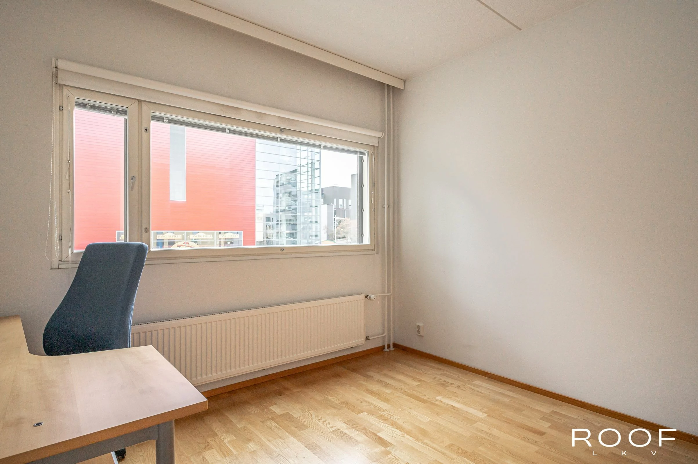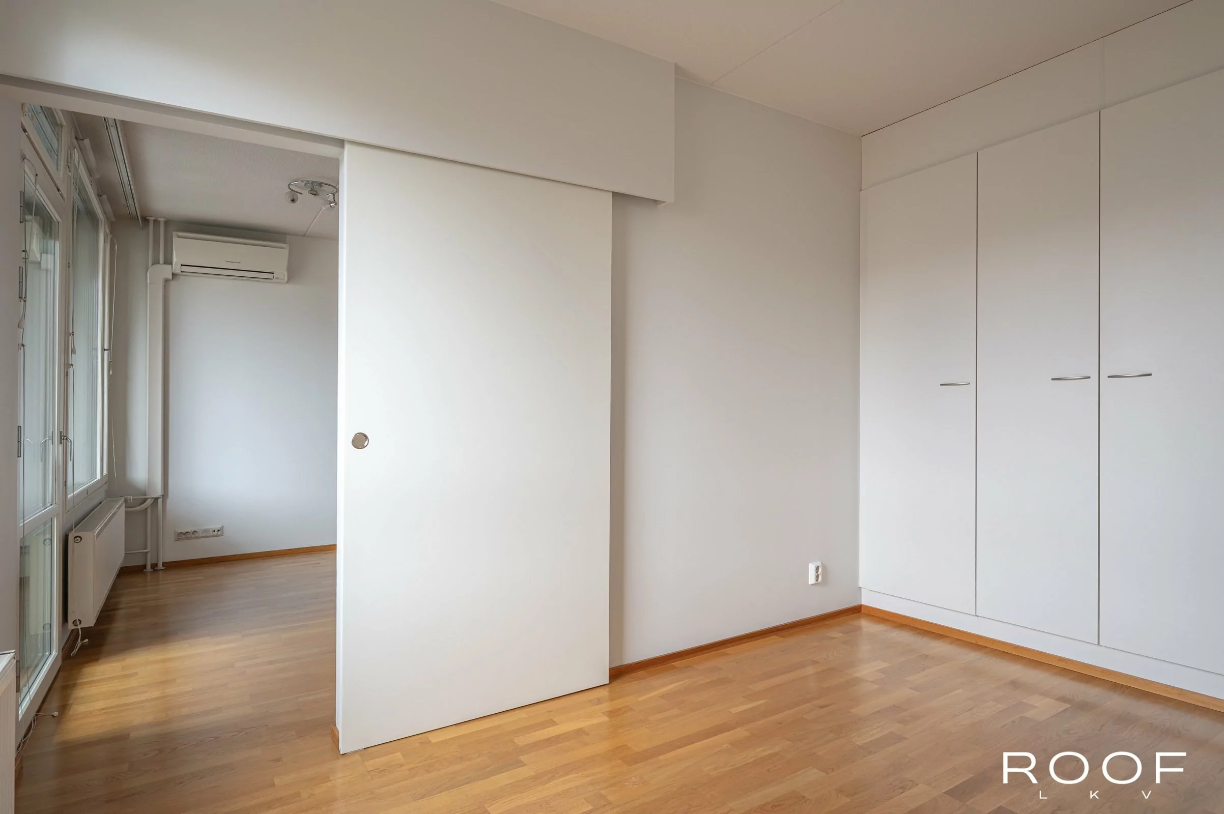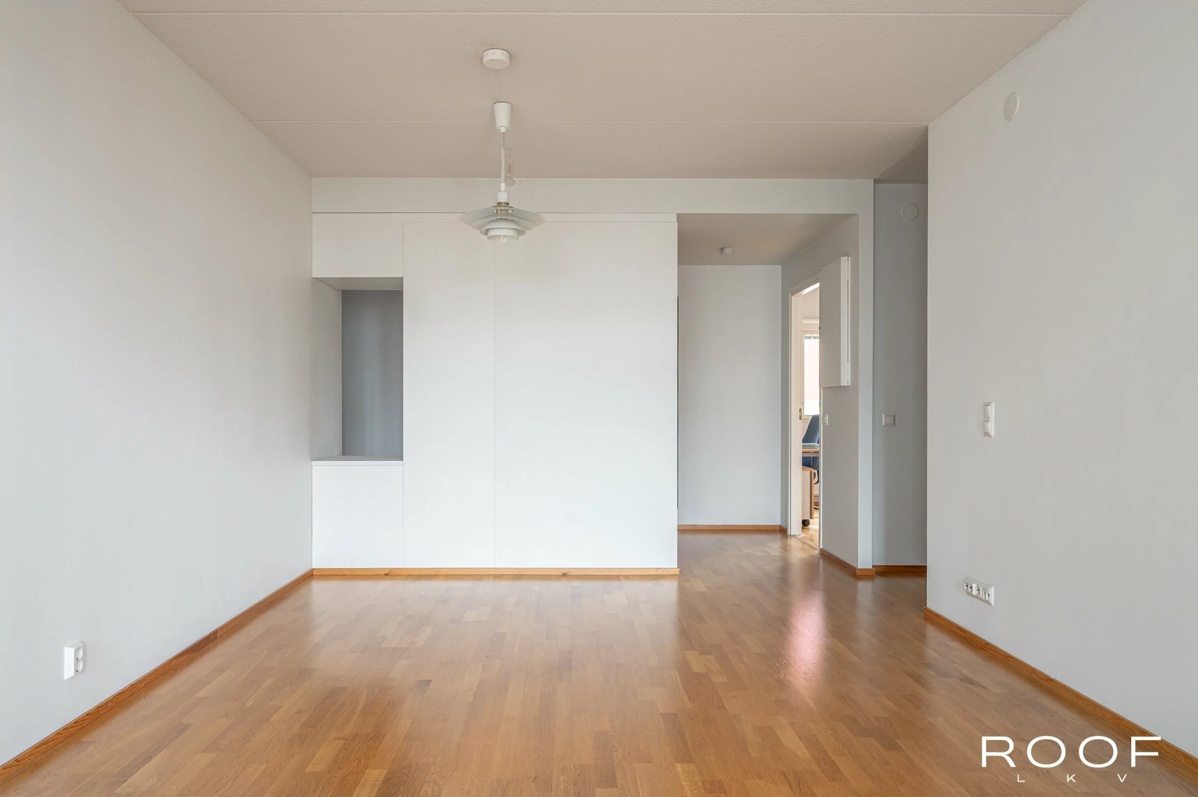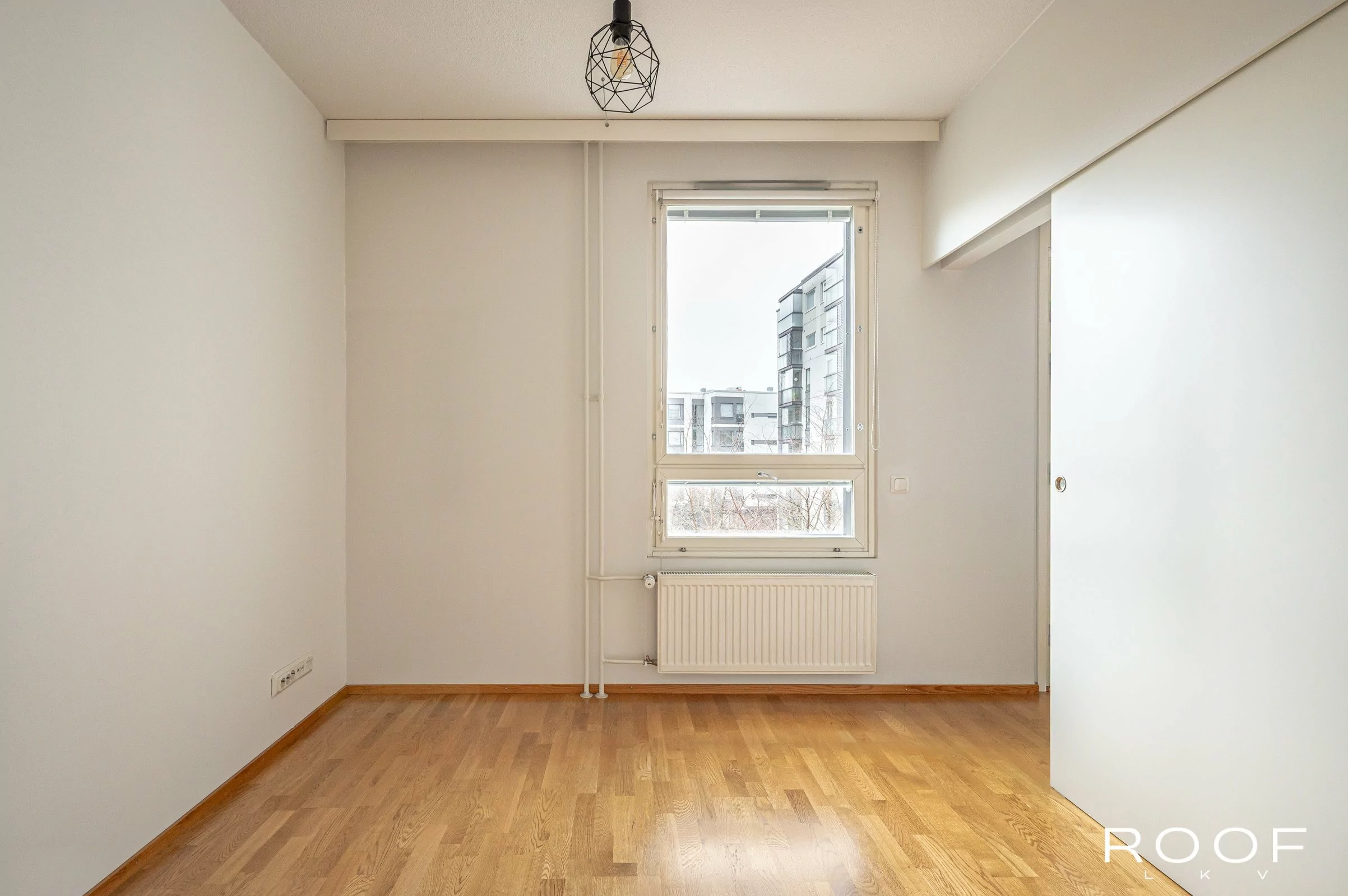 Asunnon sydän on suuri, monikäyttöinen olohuone, joka yhdistyy saumattomasti ruokailutilaan ja siihen avautuvaan keittiöön. Tilassa on reilusti valoa ja selkeät linjat, jotka jättävät sisustajalle vapaat kädet. Olohuoneesta on käynti lasitetulle länsiparvekkeelle, josta avautuvat vehreät näkymät Soittokunnanpuistoon.