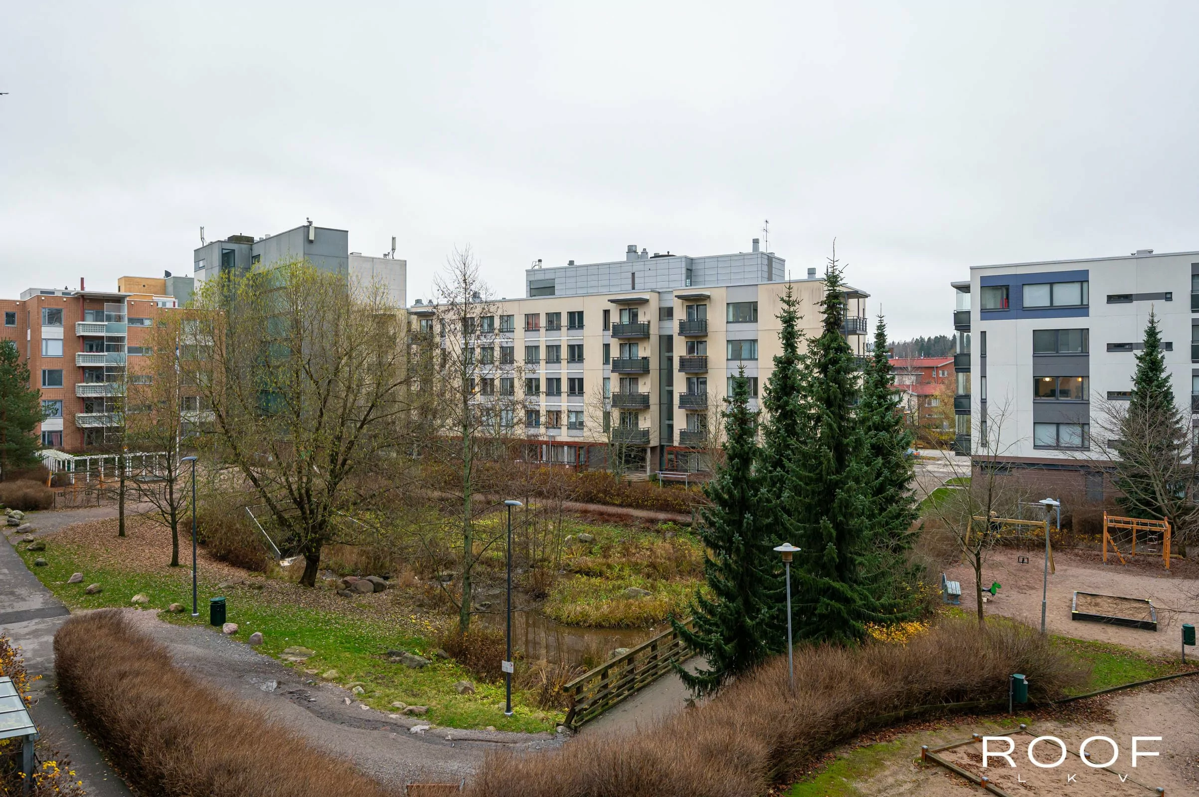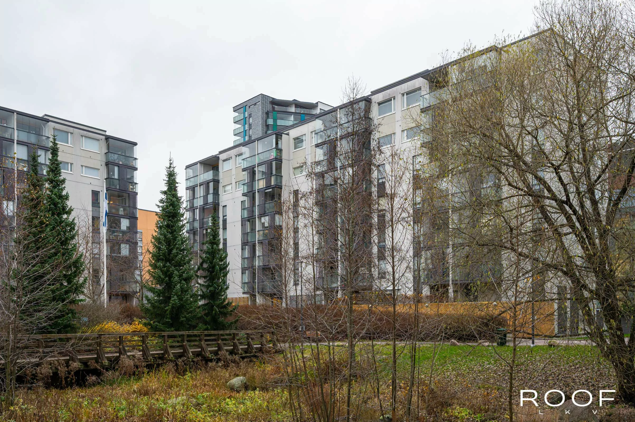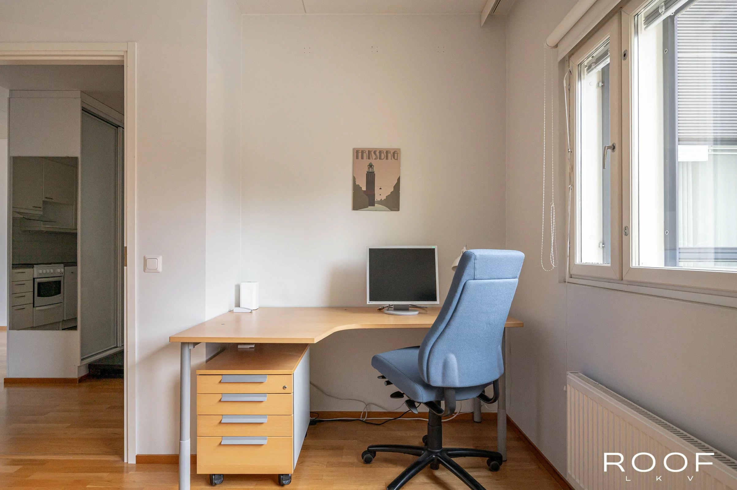 Asunnon sydän on suuri, monikäyttöinen olohuone, joka yhdistyy saumattomasti ruokailutilaan ja siihen avautuvaan keittiöön. Tilassa on reilusti valoa ja selkeät linjat, jotka jättävät sisustajalle vapaat kädet. Olohuoneesta on käynti lasitetulle länsiparvekkeelle, josta avautuvat vehreät näkymät Soittokunnanpuistoon.
