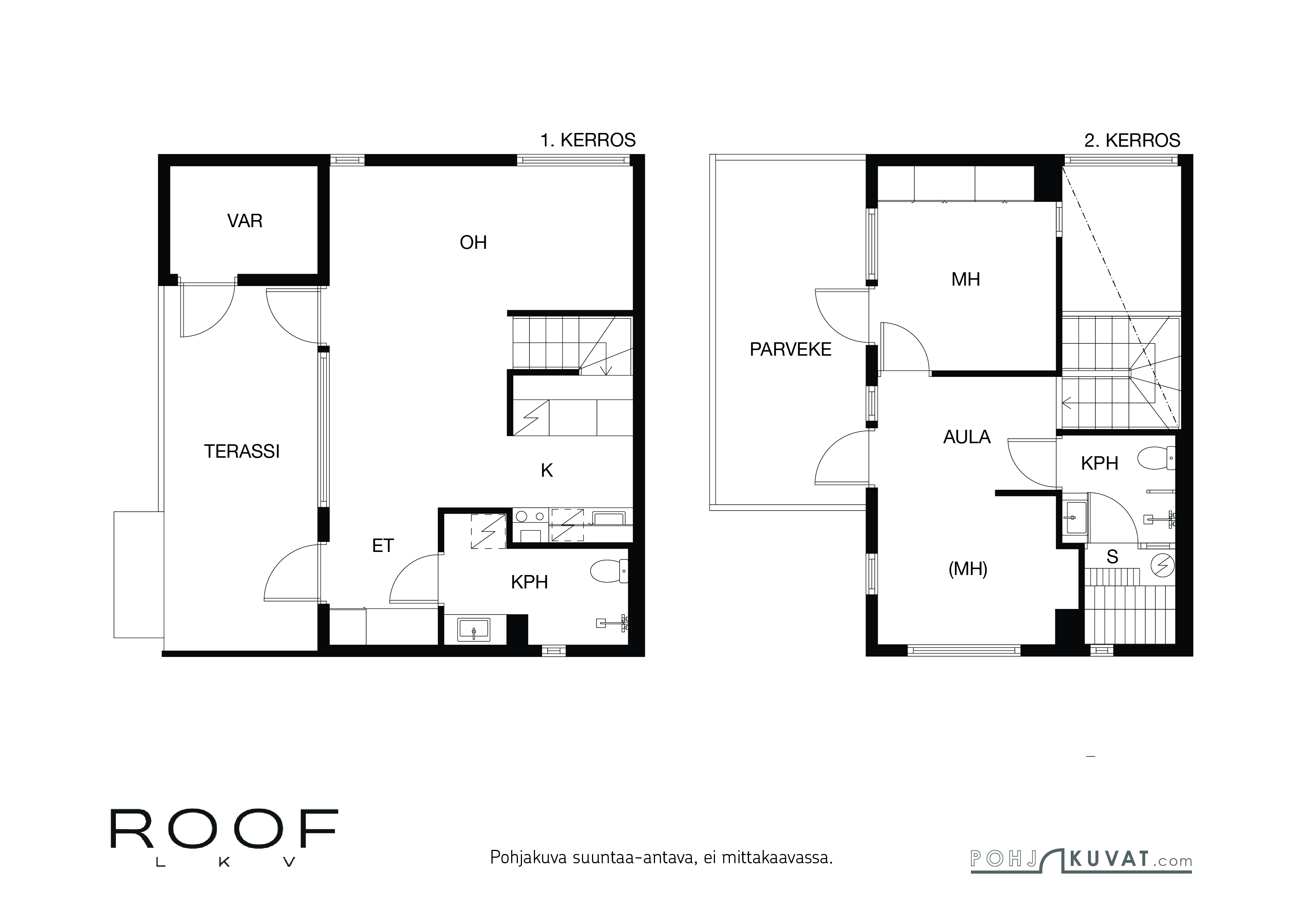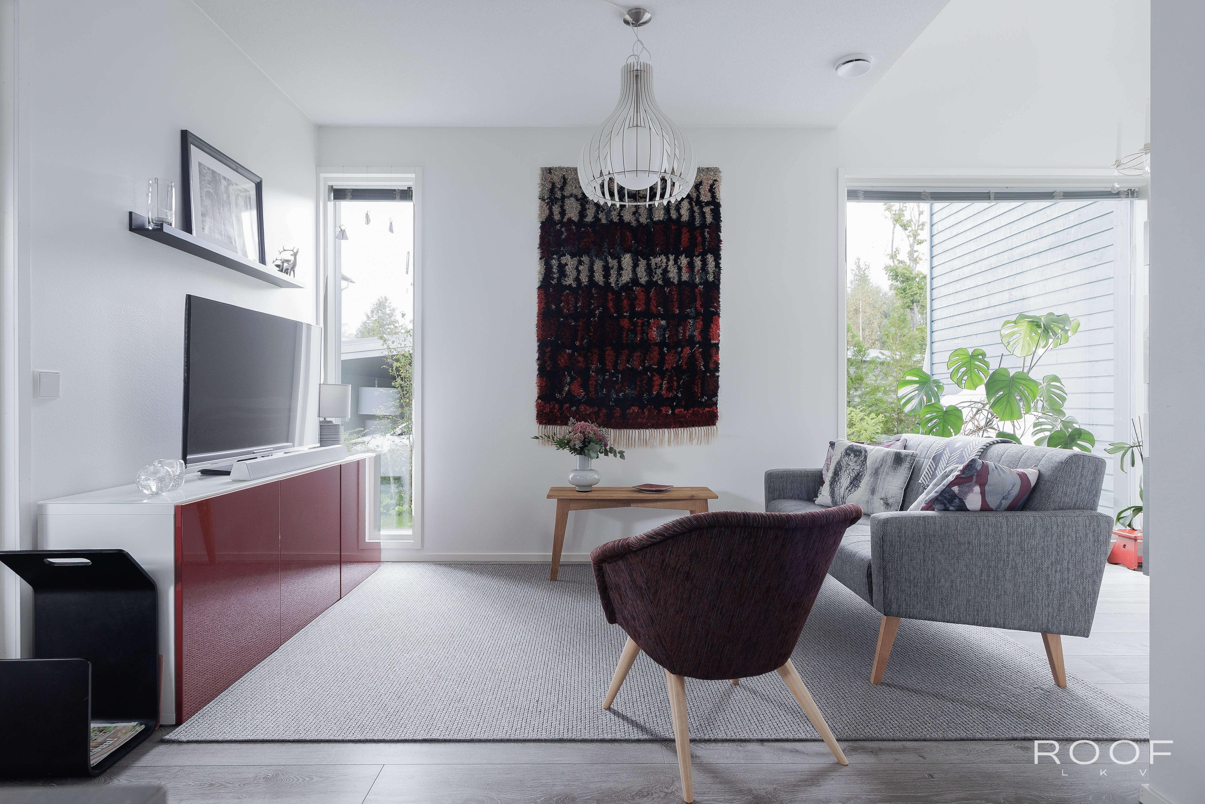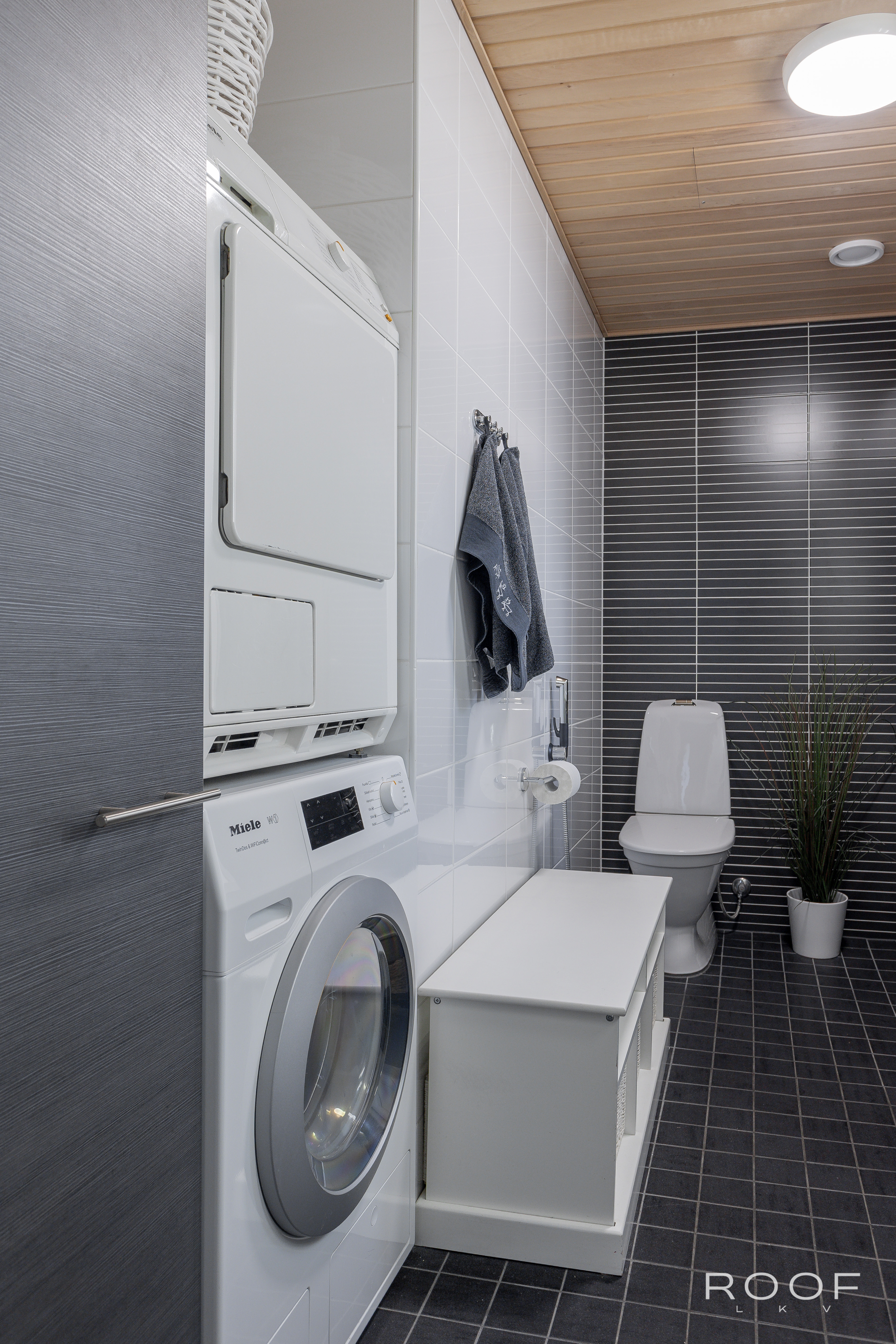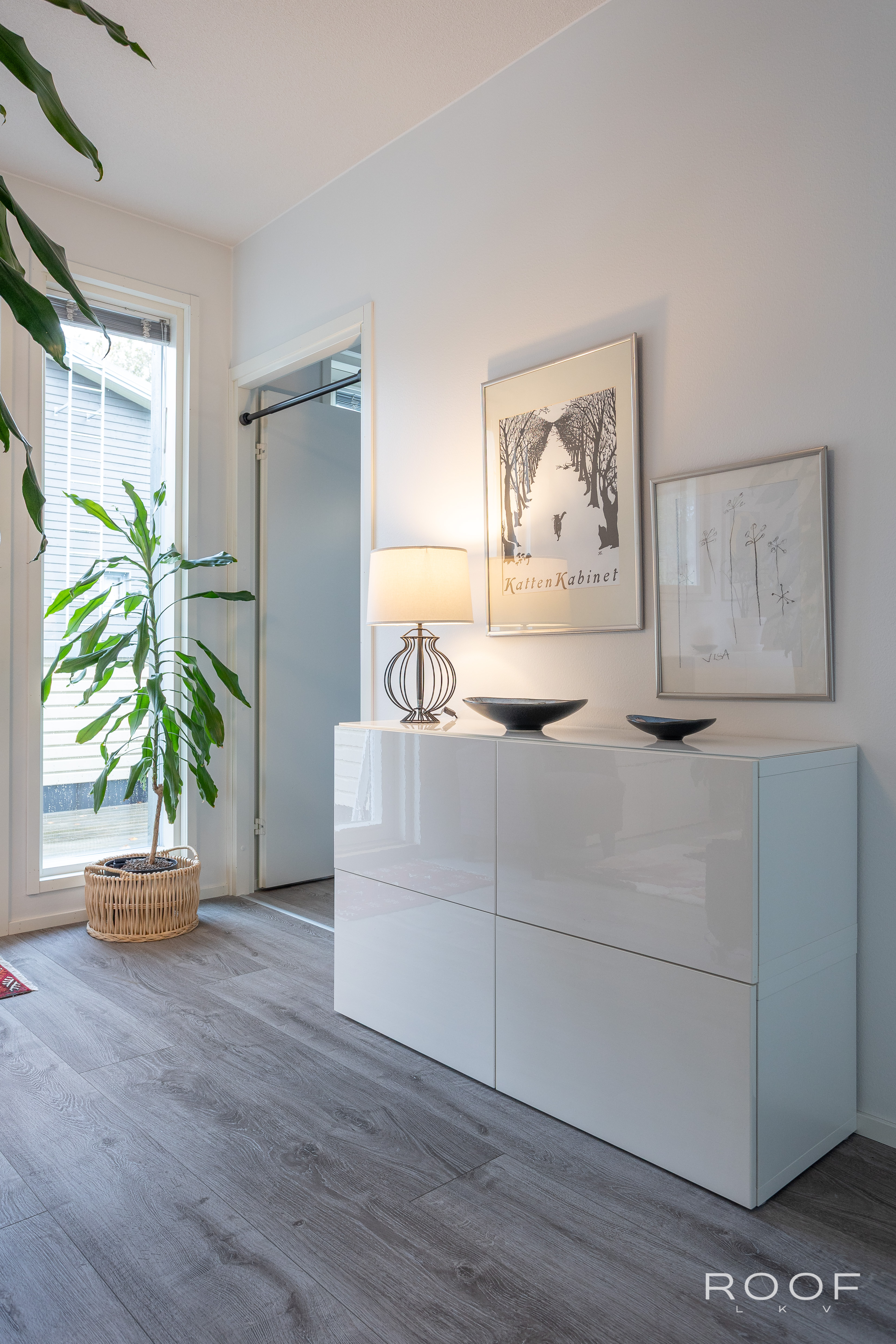 Alakerrassa sijaitsevat valoisa olohuone, keittiö ja erillinen wc. Olohuoneesta avautuu käynti suurelle lasitetulle terassille, joka toimii lisähuoneena lähes ympäri vuoden.