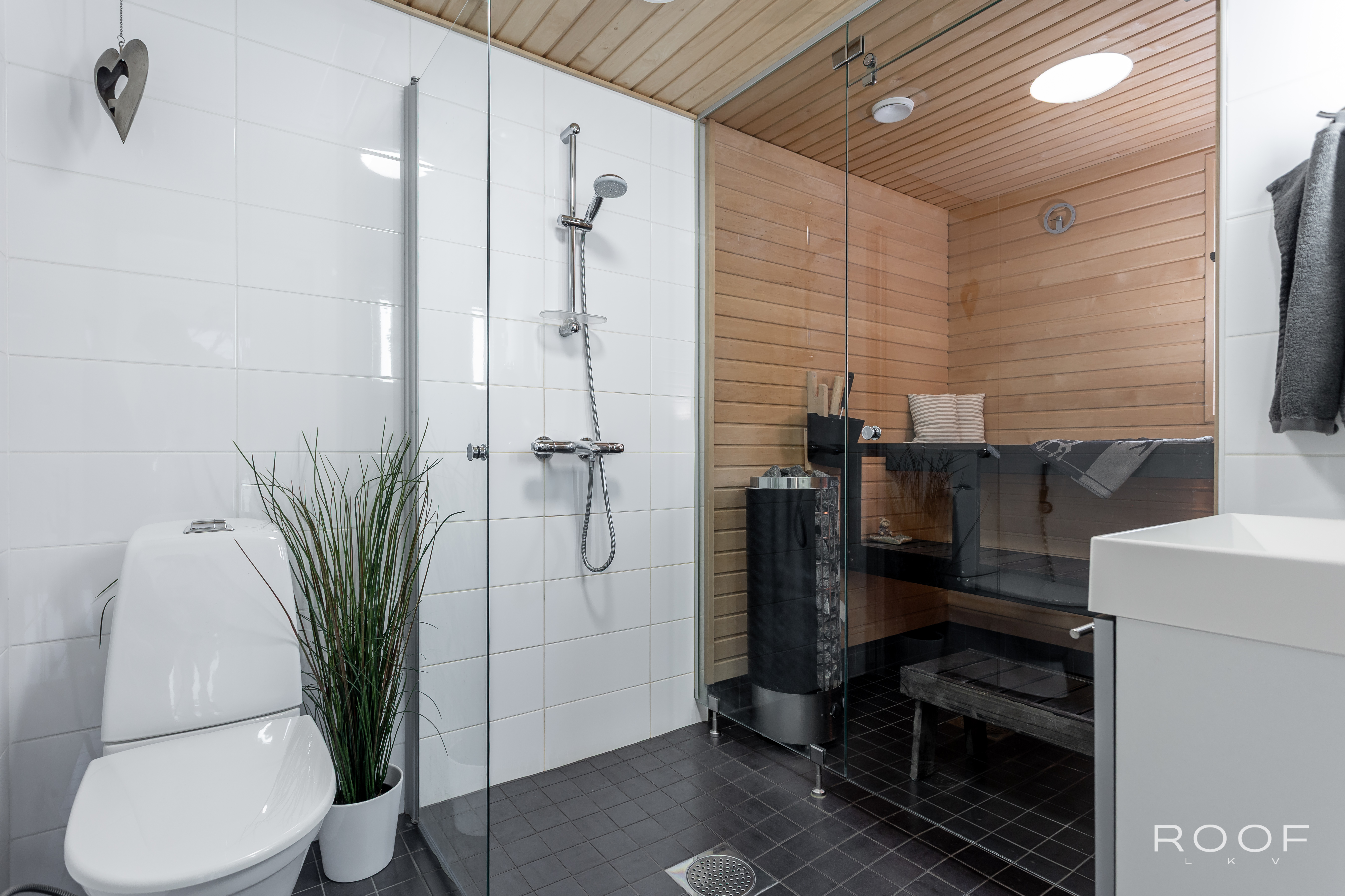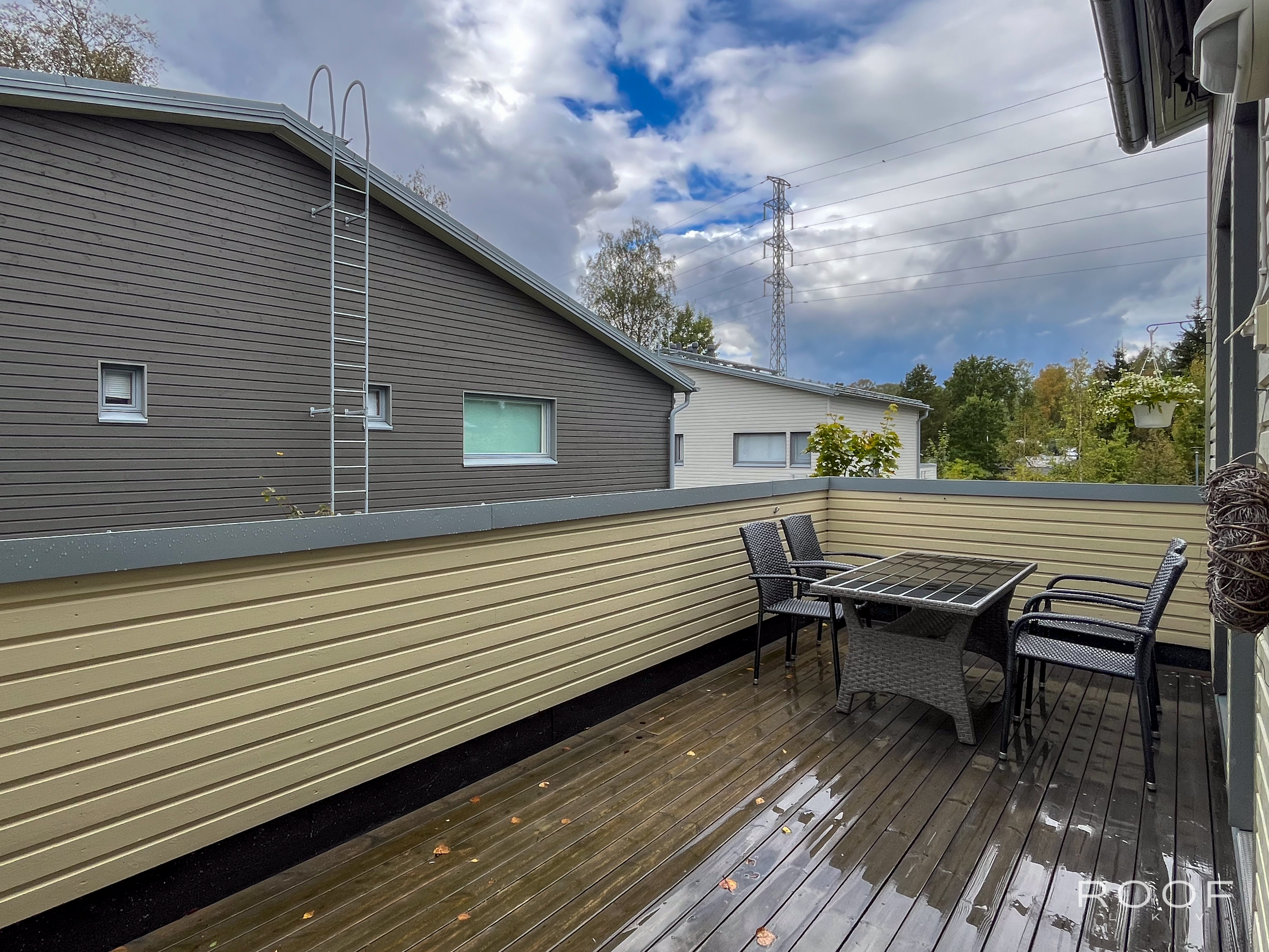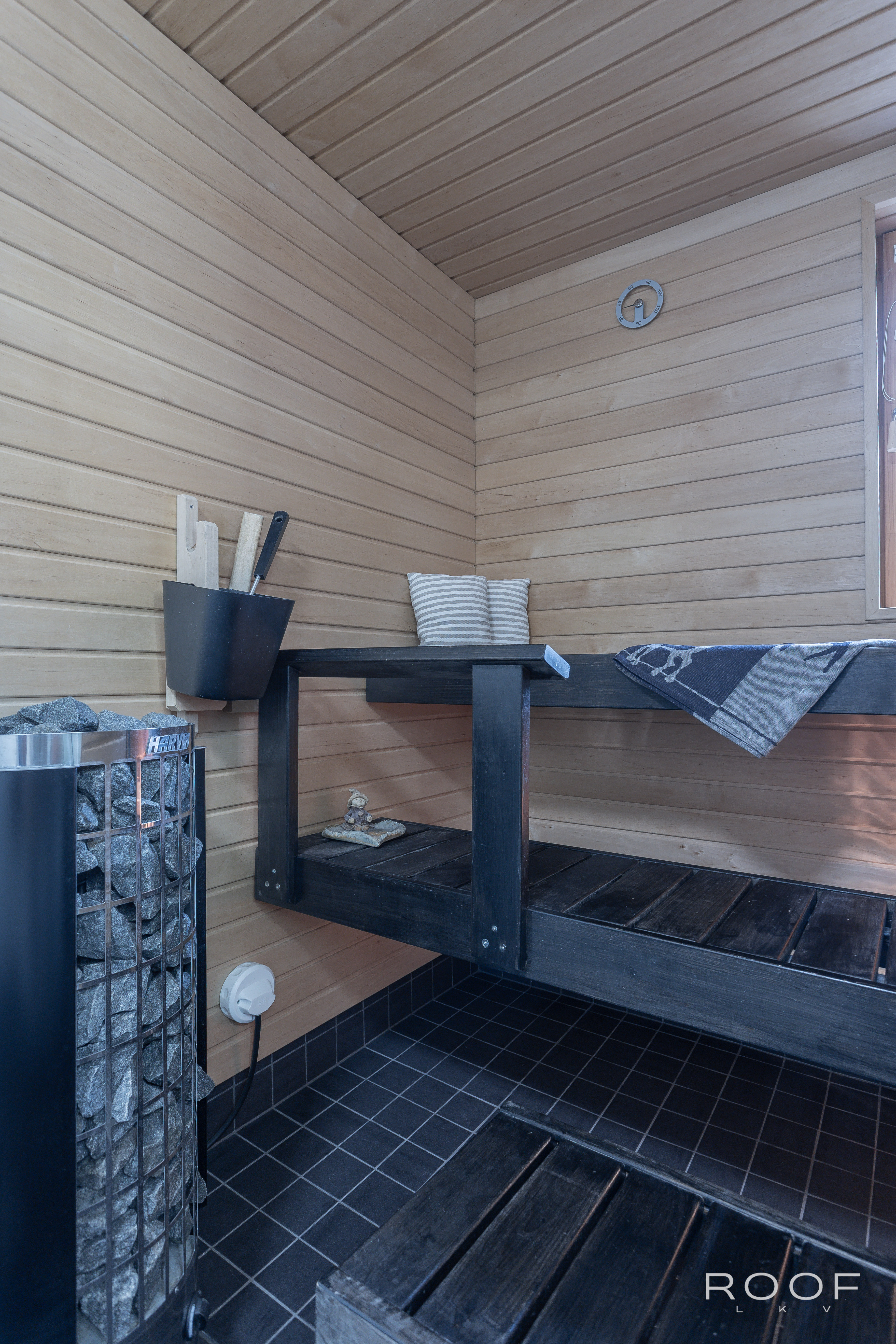 Yläkerrasta löytyvät molemmat makuuhuoneet, kylpyhuone sekä tilava parveke/terassi. Parvekkeella ja terassilla voit vilvoitella löylyjen jälkeen tai nauttia auringosta rauhassa.