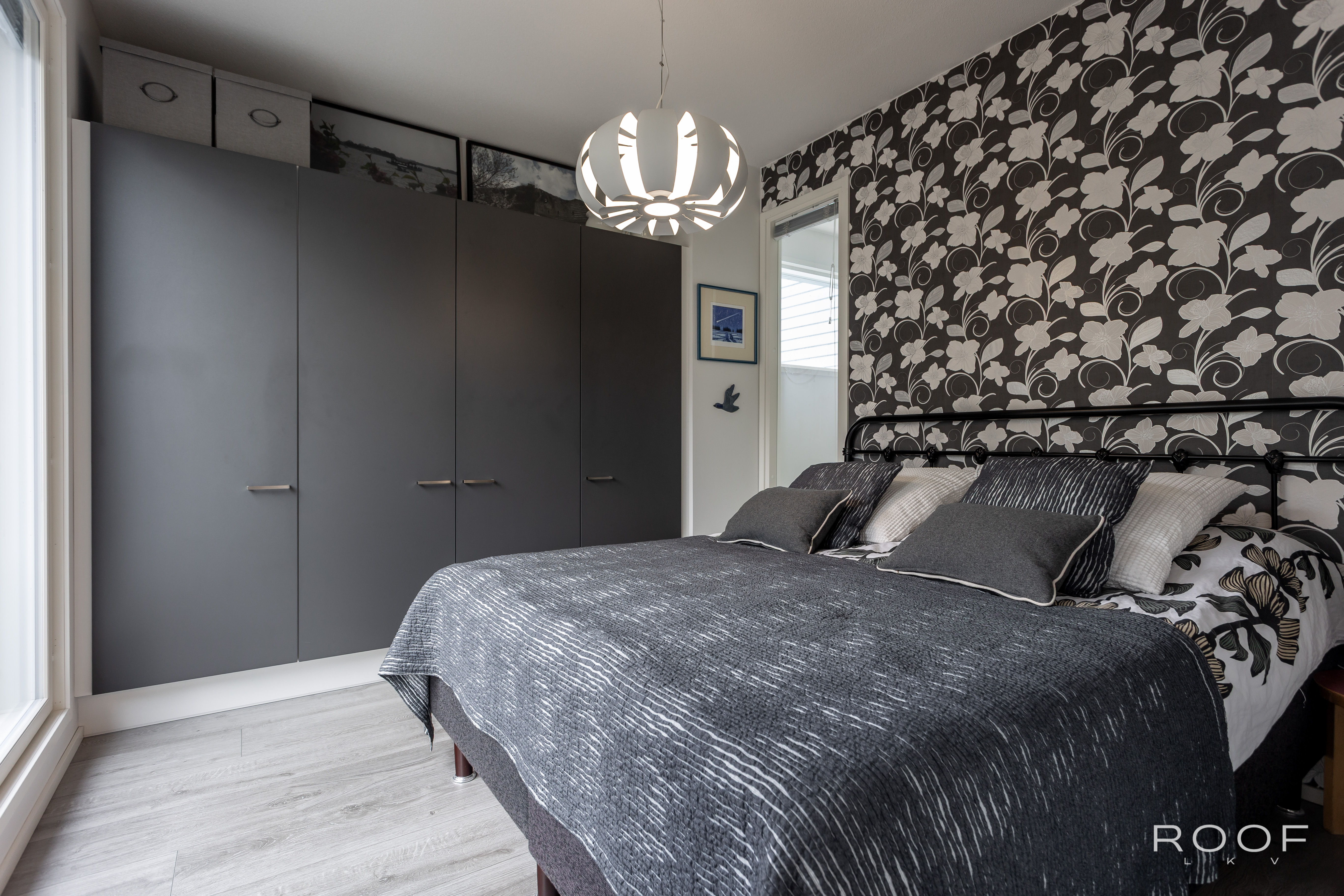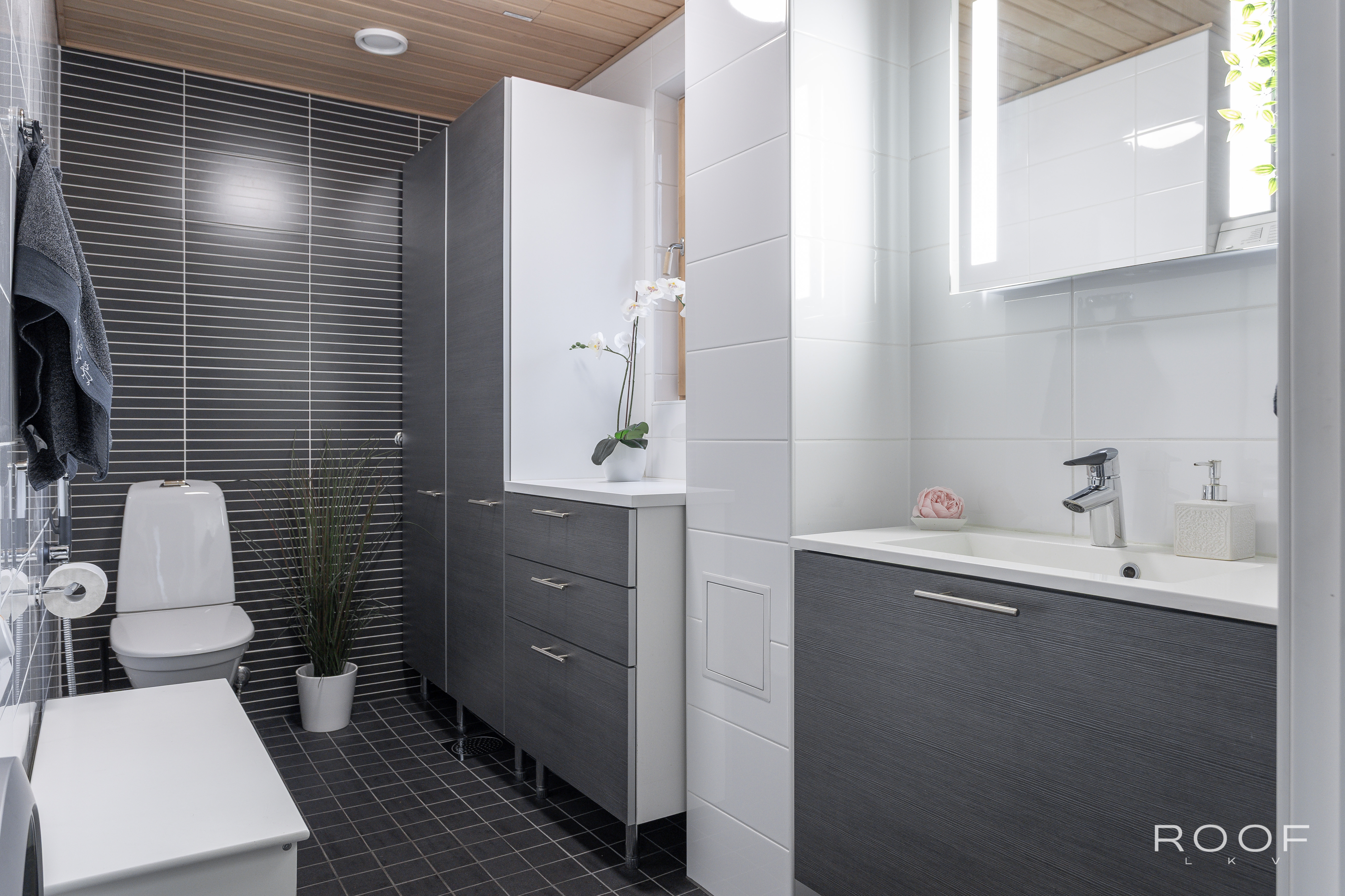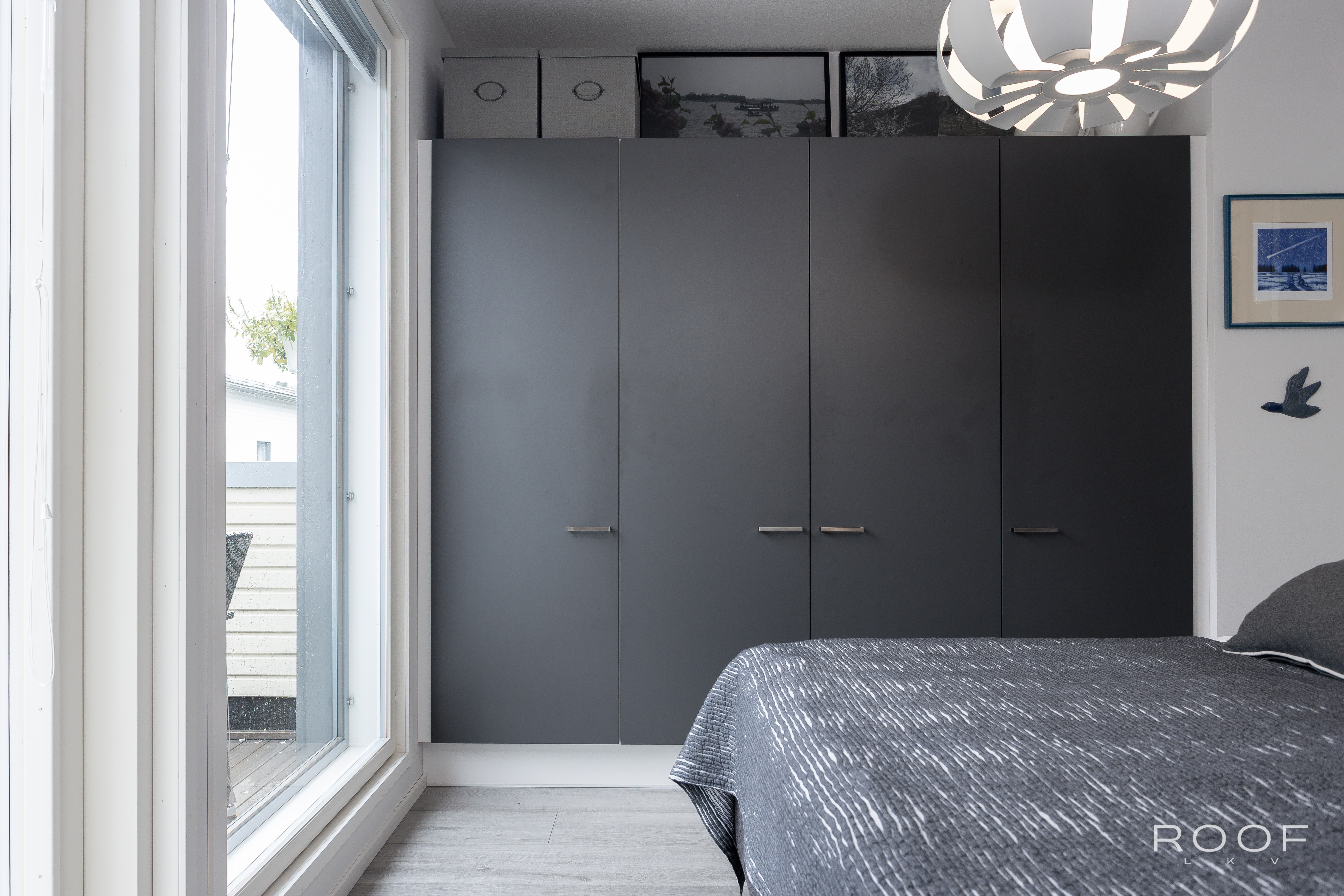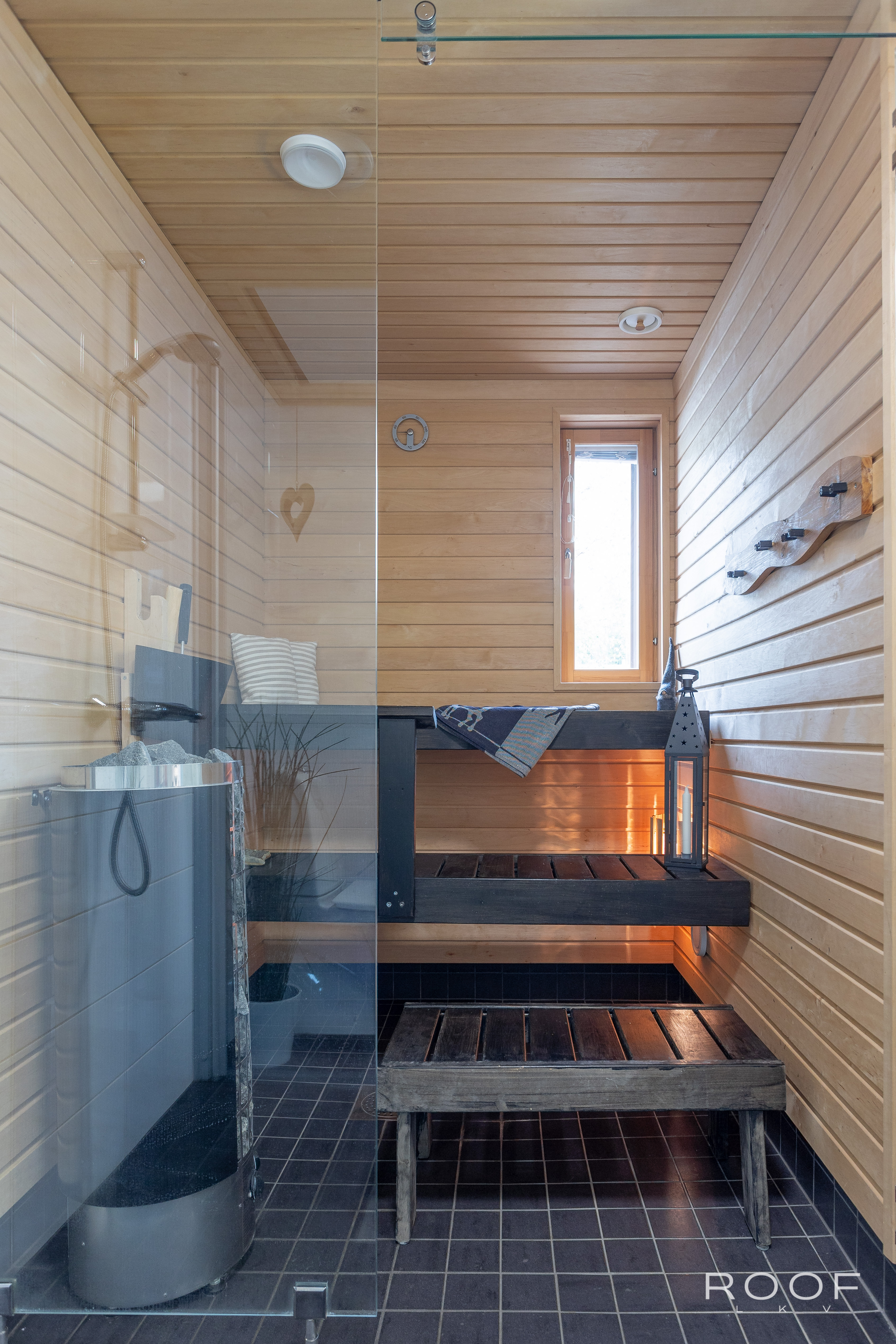 Yläkerrasta löytyvät molemmat makuuhuoneet, kylpyhuone sekä tilava parveke/terassi. Parvekkeella ja terassilla voit vilvoitella löylyjen jälkeen tai nauttia auringosta rauhassa.