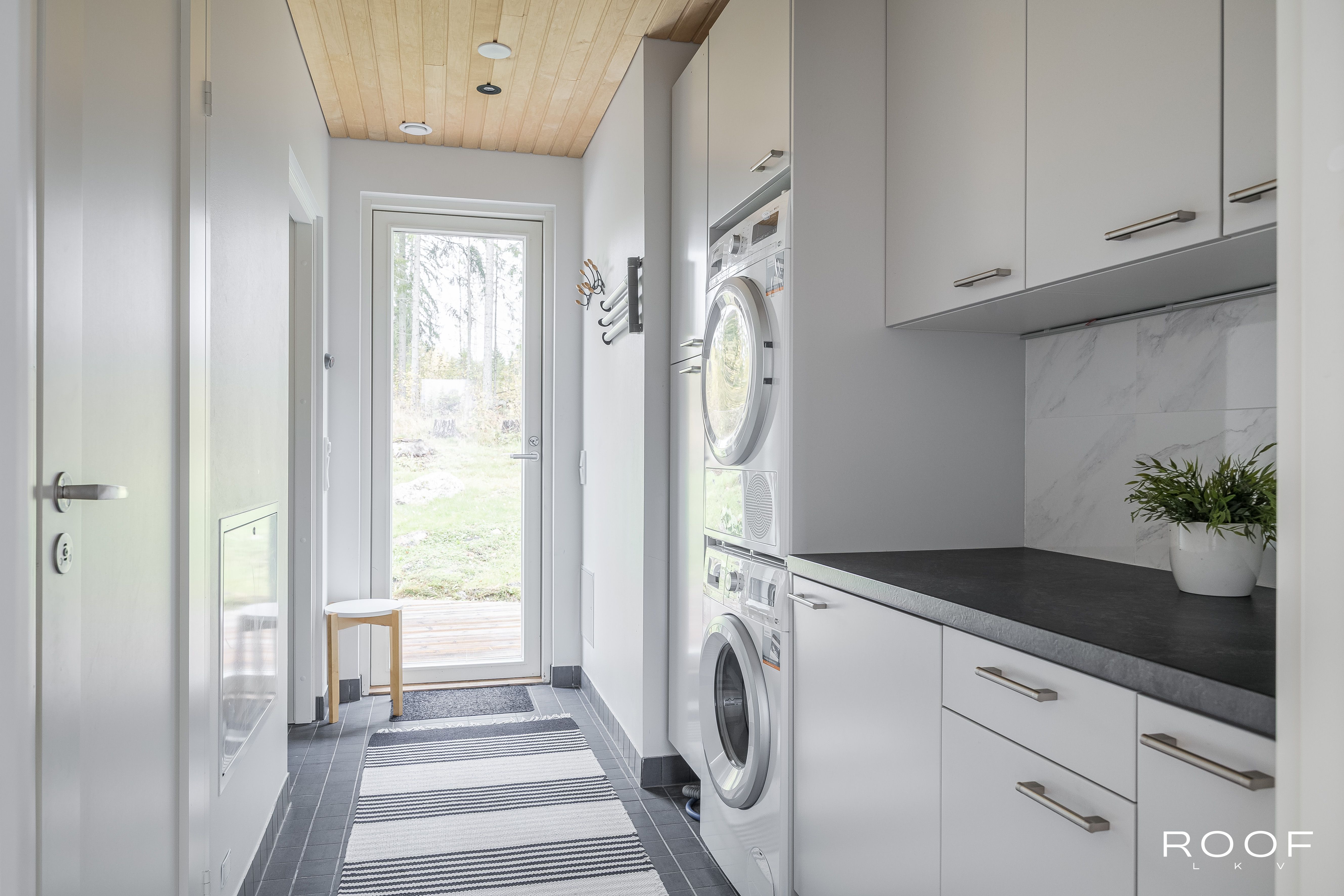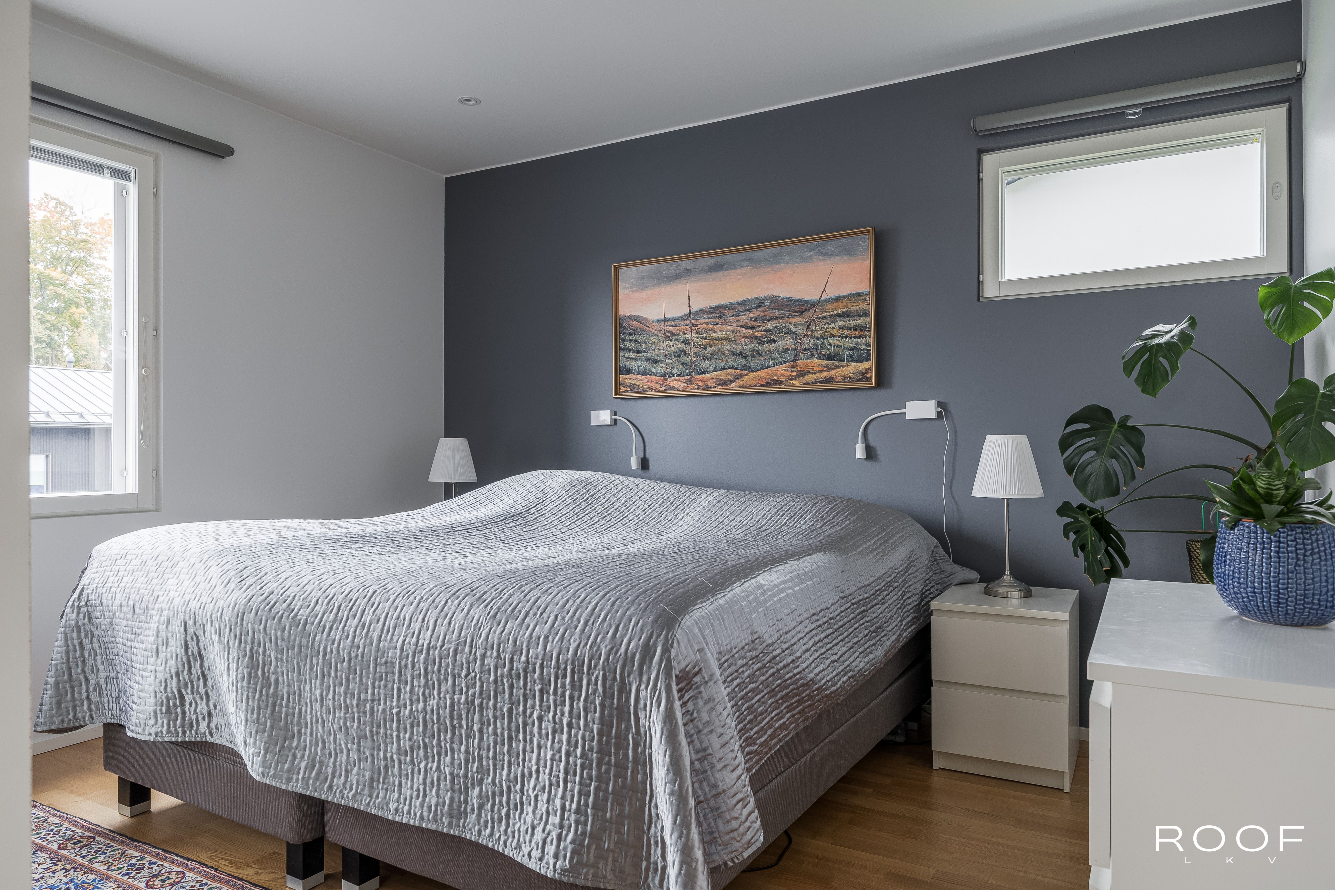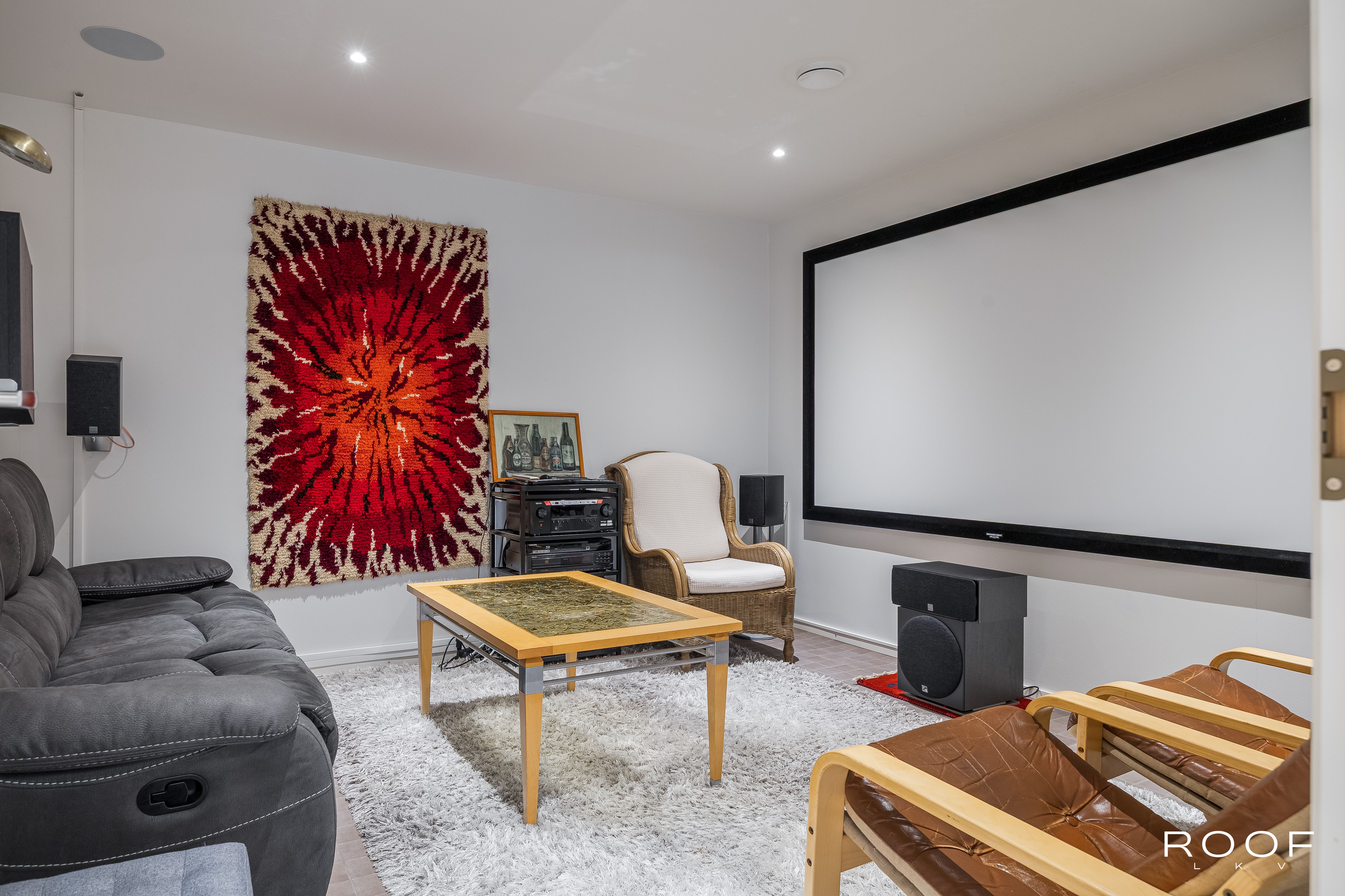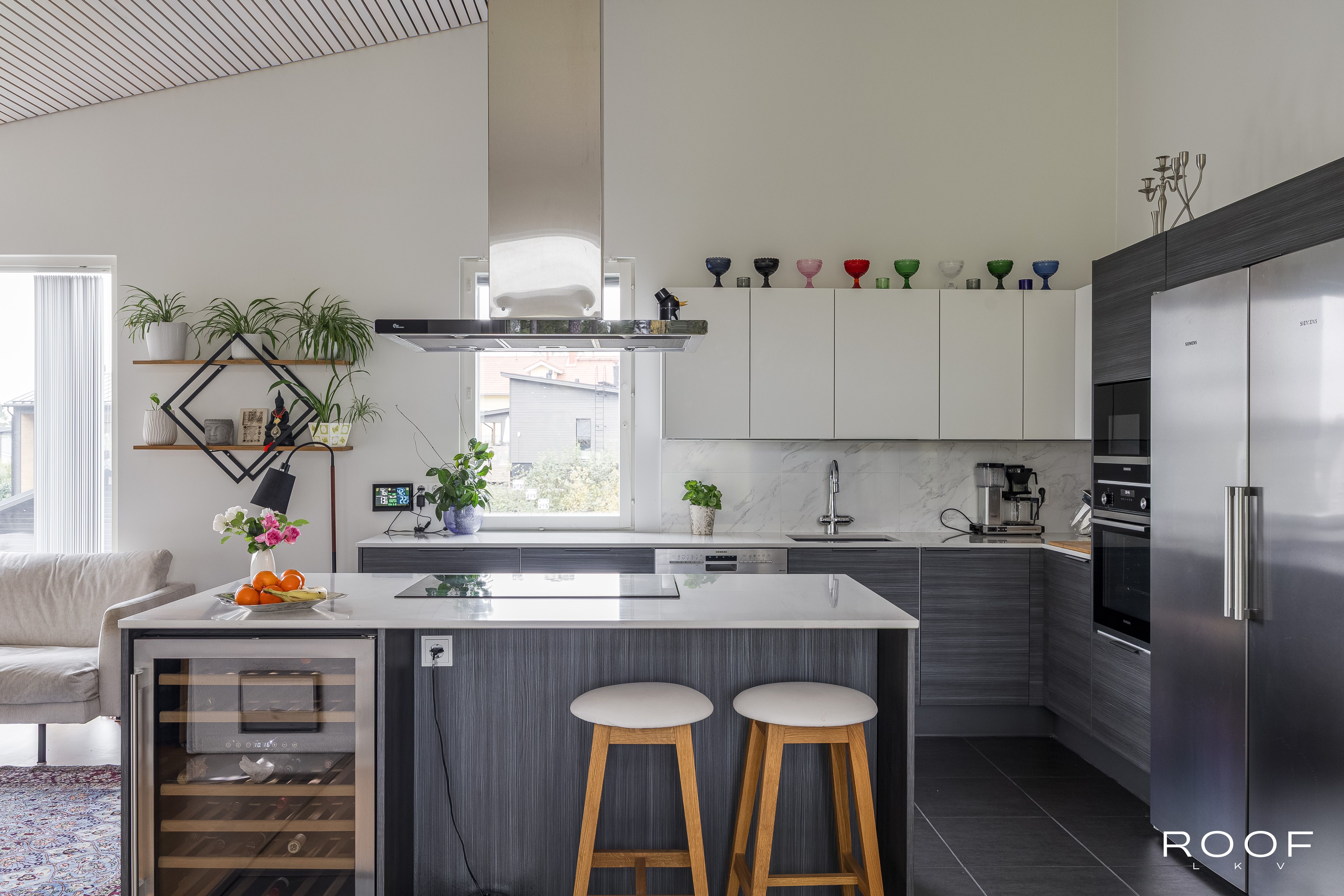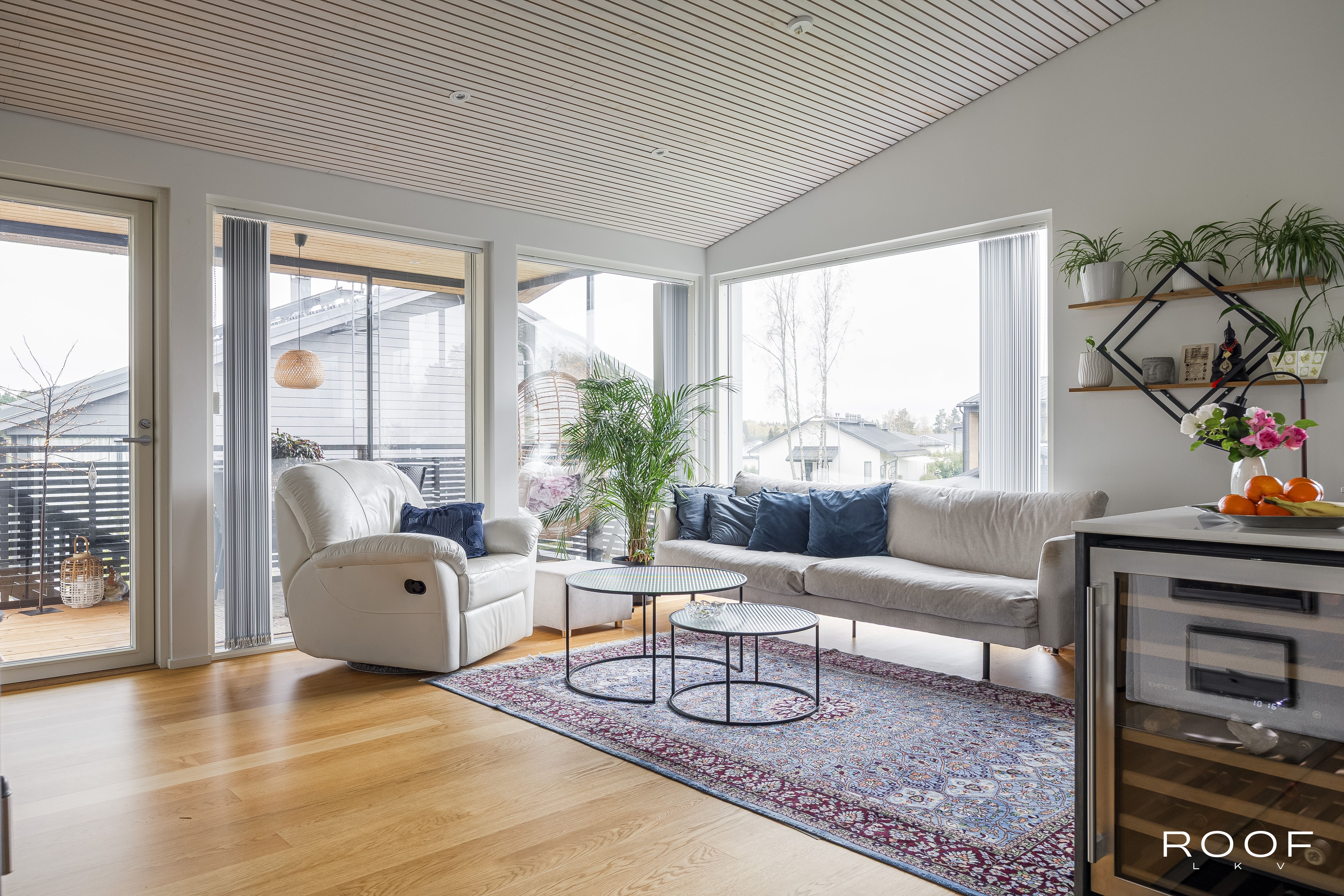 Yläkerrassa on makuuhuone, sauna, kodinhoitotilat ja tilava olohuone, jossa on lämpöä varaava takka, sekä Puustellin keittiö saarekkeella ja laadukkailla Siemensin kodinkoneilla ja viinikaapilla. Alakerrassa sijaitsevat kph ja kaksi makuuhuonetta, joissa on kaunis tammiparketti. Lisäksi talossa on kotiteatterihuone ja työtila, jotka tarjoavat monipuolisia mahdollisuuksia arjen tarpeisiin.