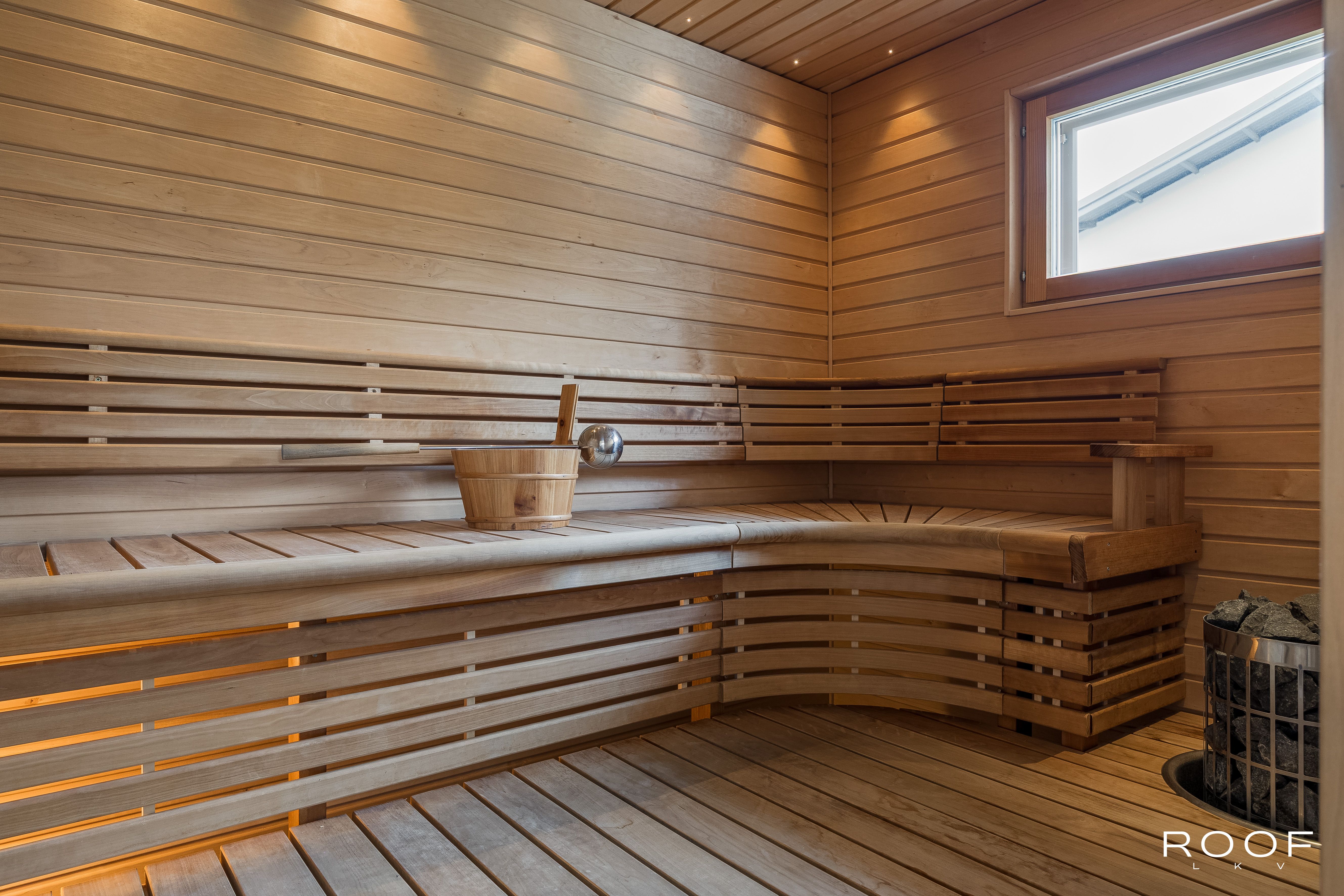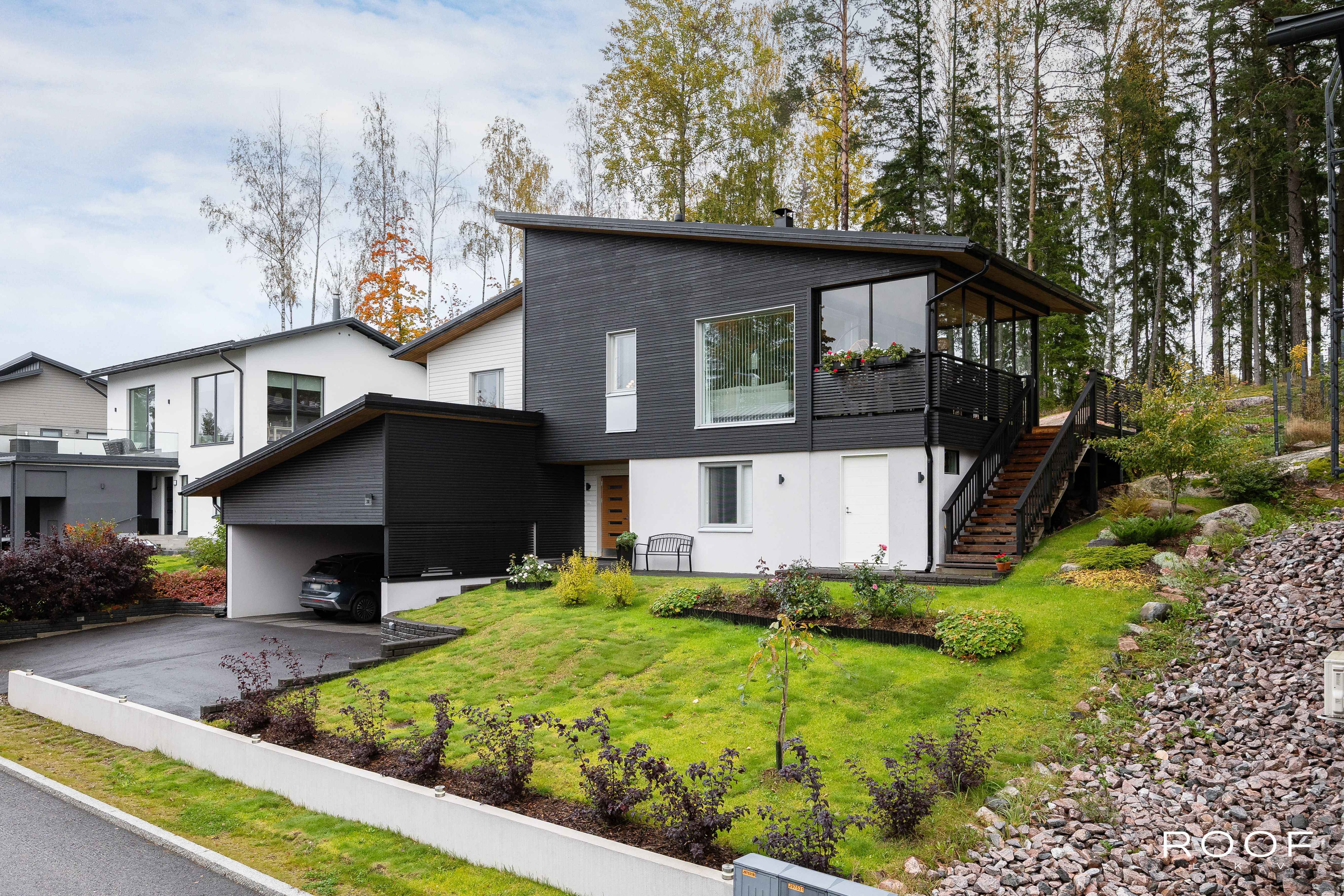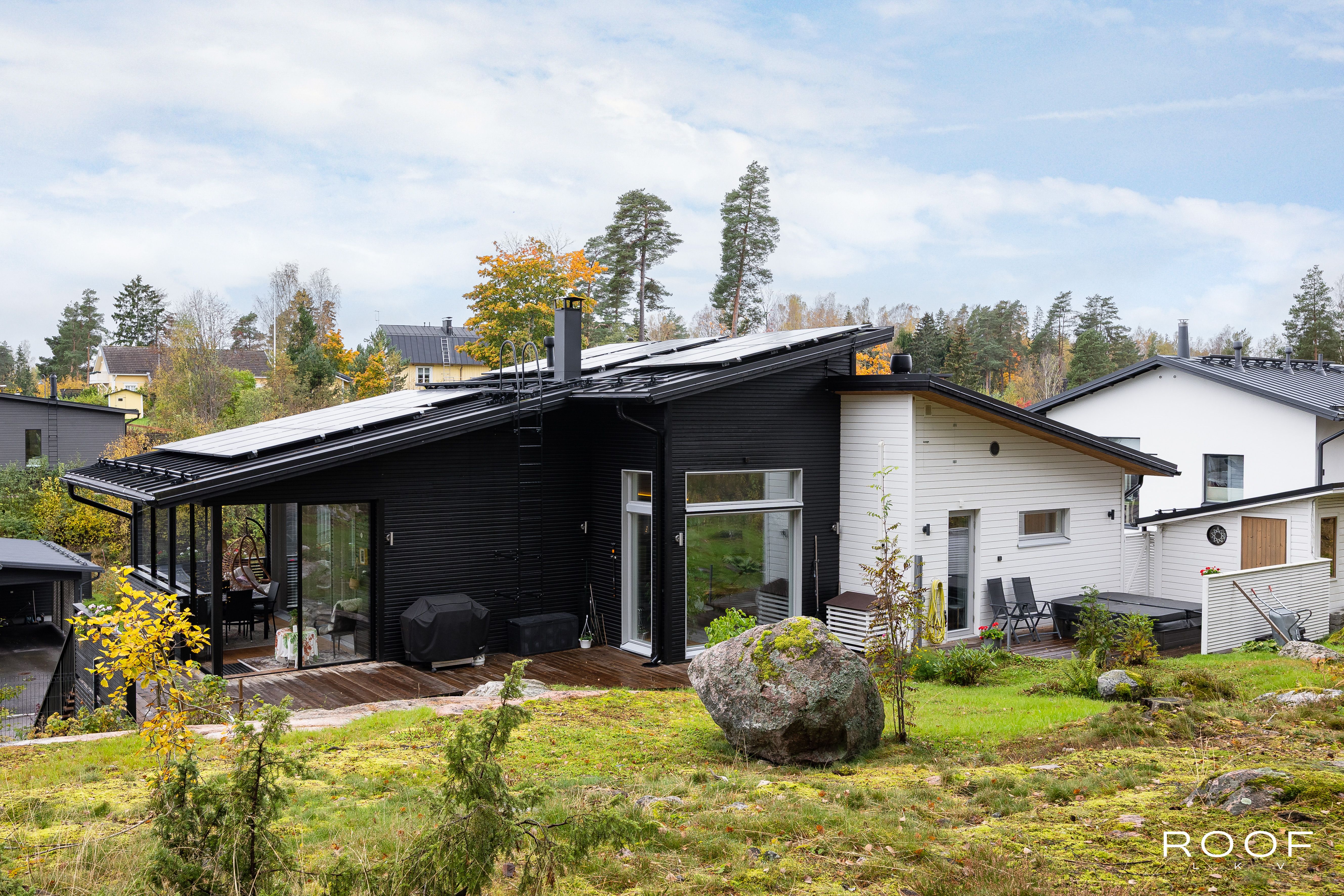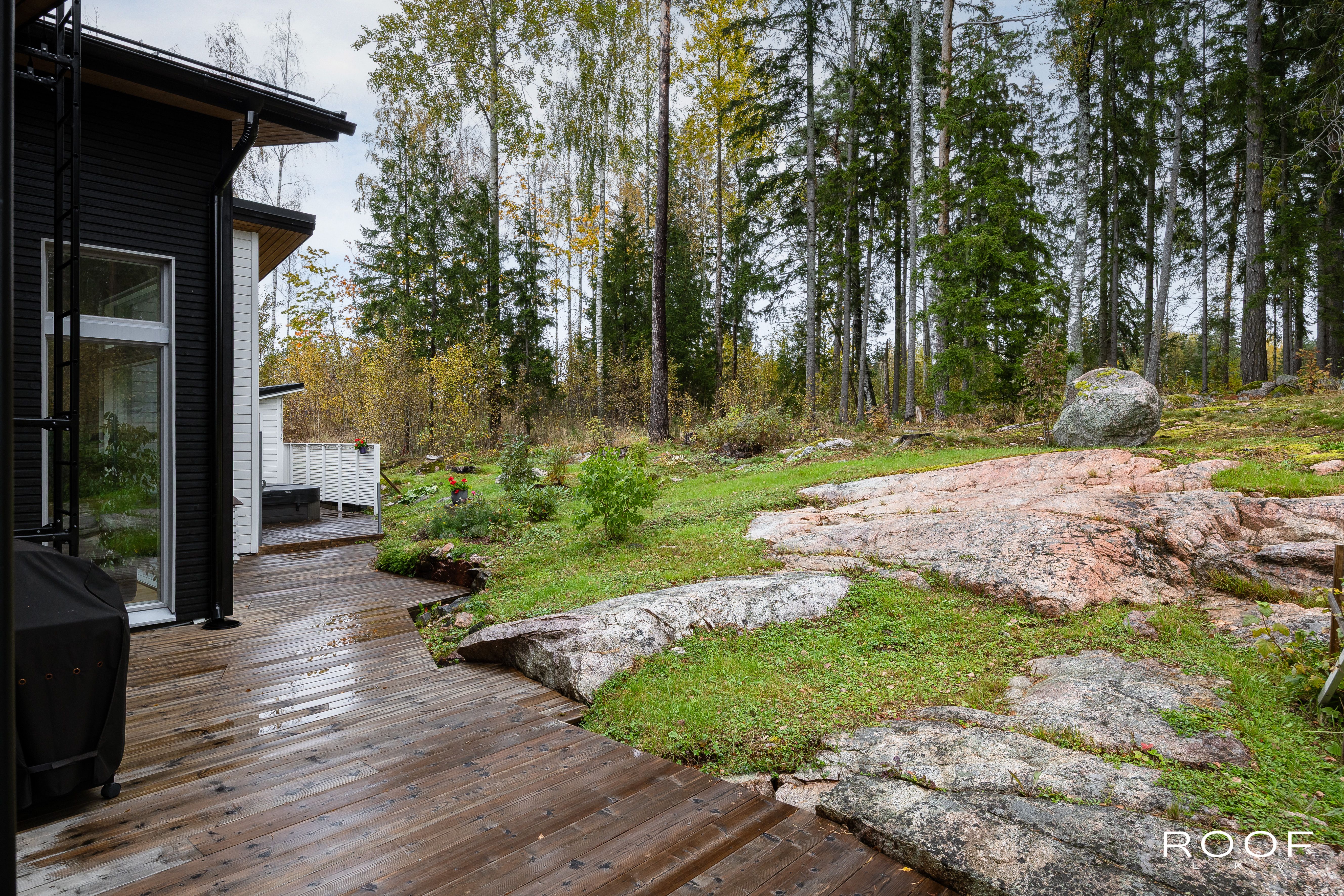 Rentoutumiseen löytyy oma sauna tervaleppälauteilla sekä lasitettu terassi, jolta avautuu näkymä hyvin hoidetulle pihalle. Pihalla on myös ulkoporeallas, joka kutsuu nauttimaan rentouttavista hetkistä. Autokatos kahdelle autolle ja lämmitetyt ulkoportaat lisäävät arjen sujuvuutta.