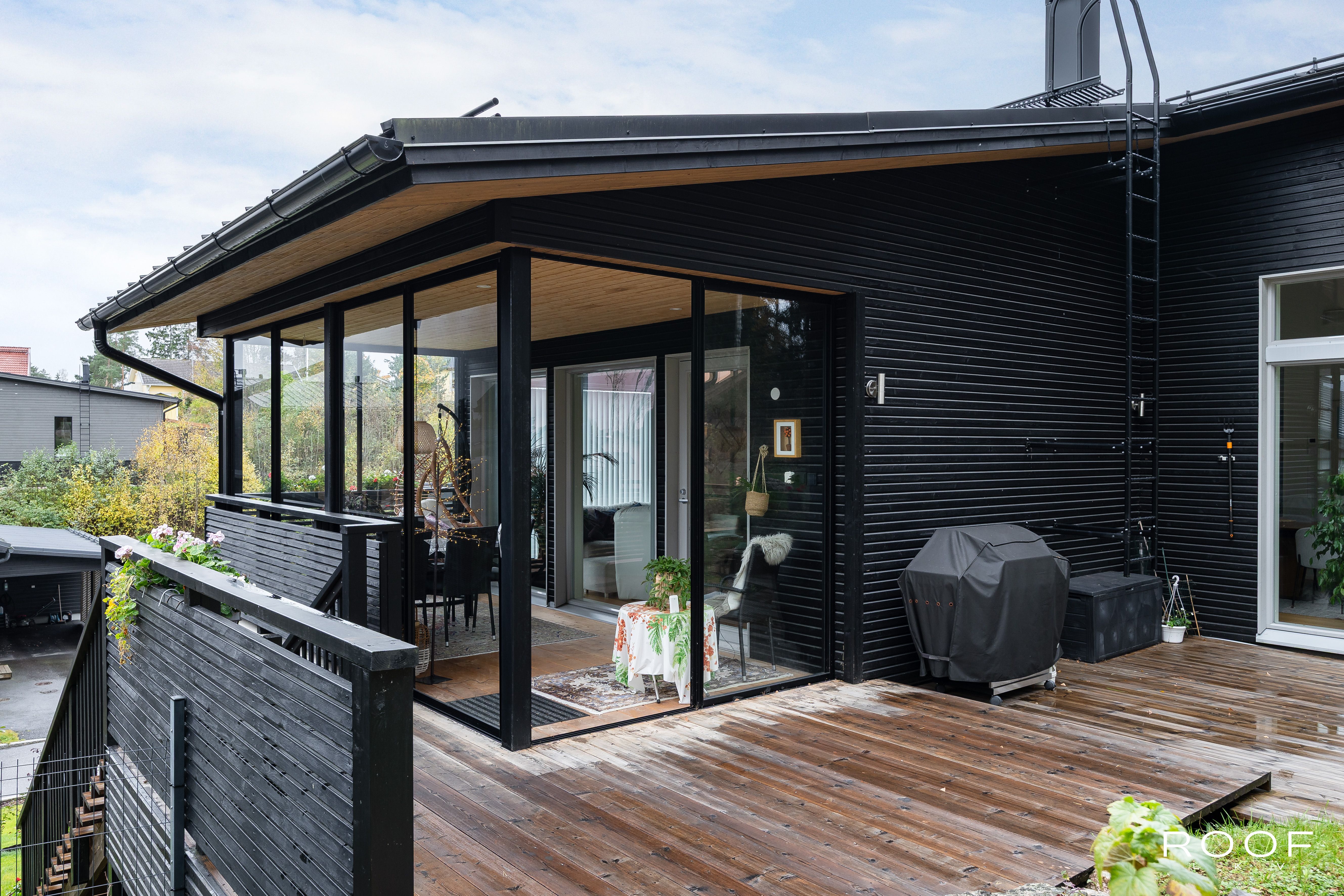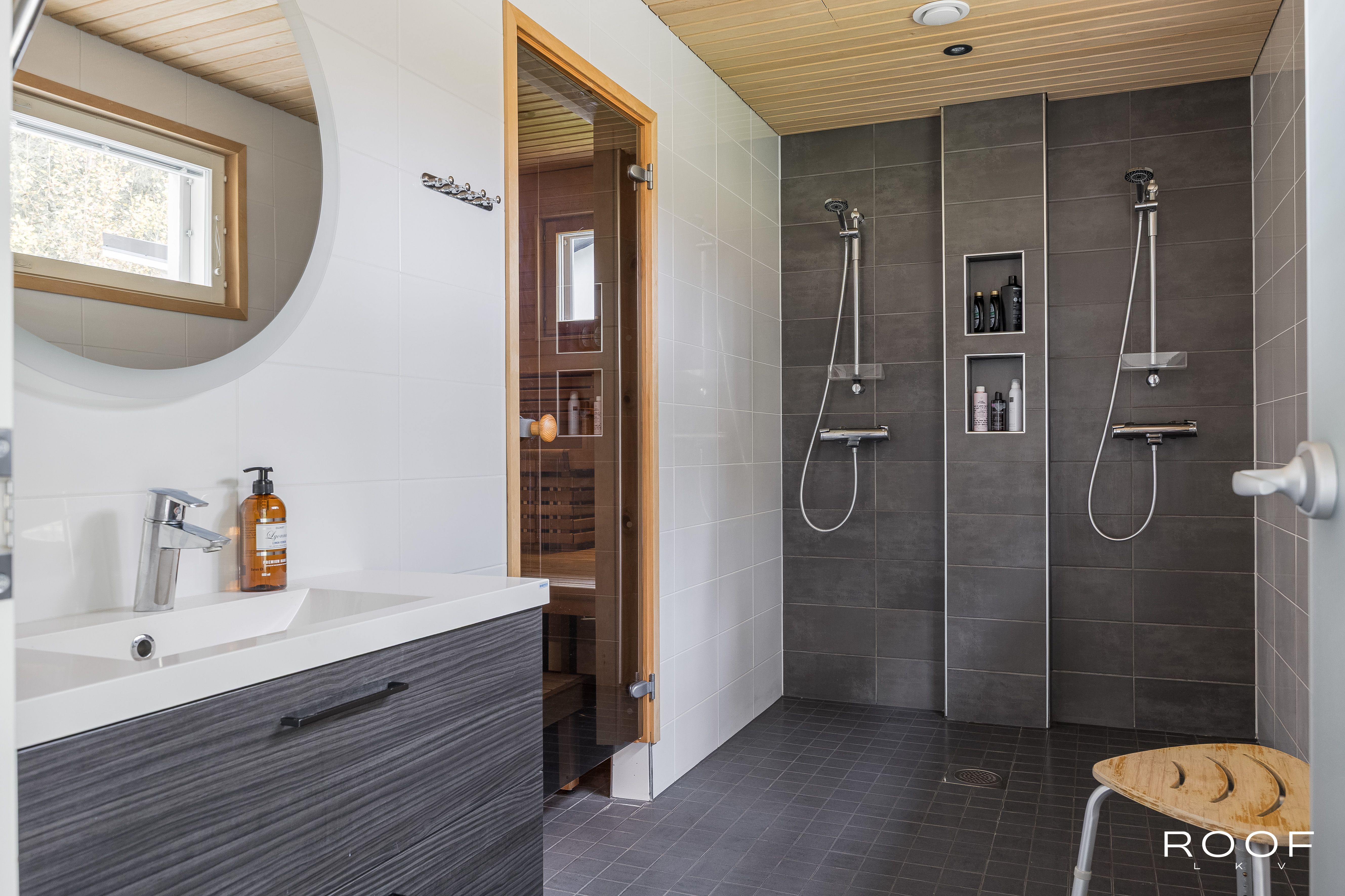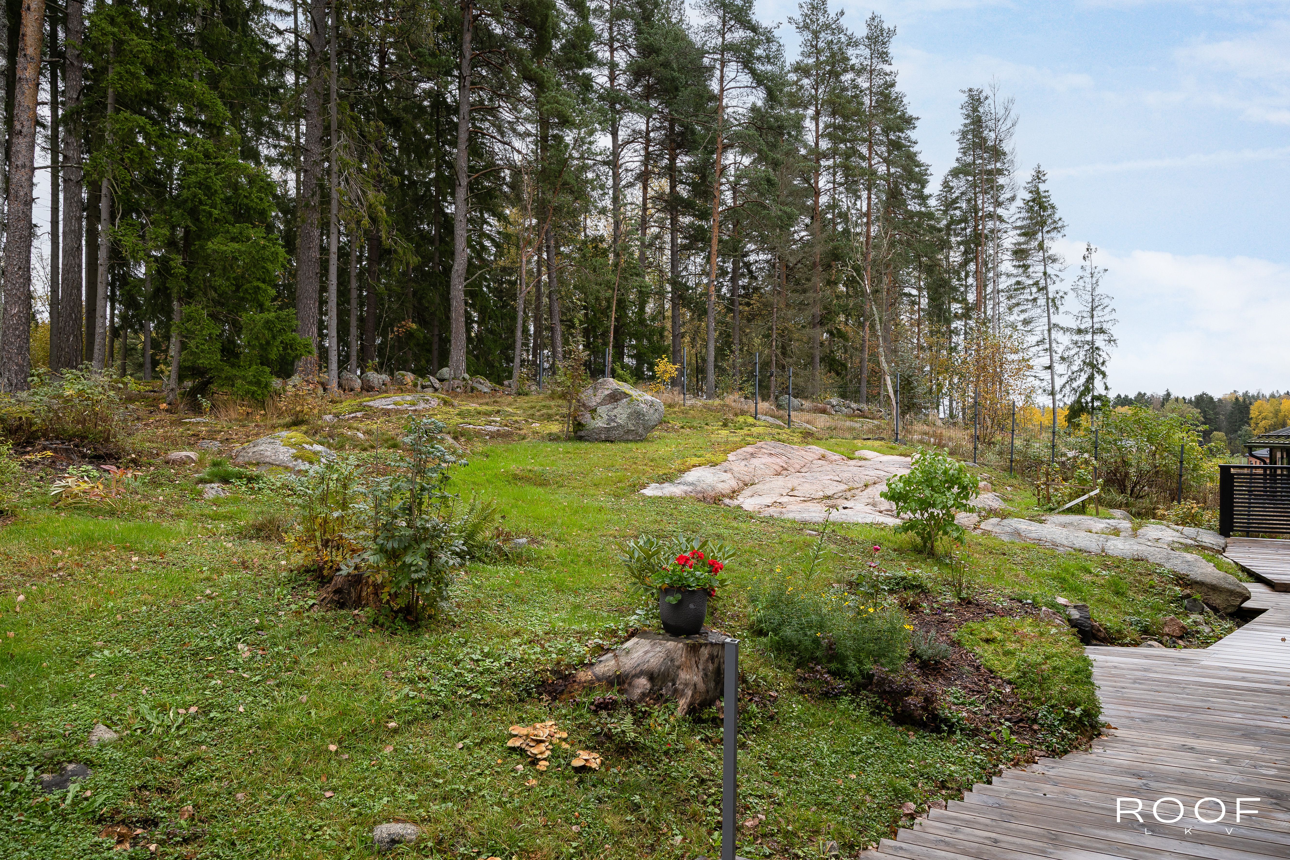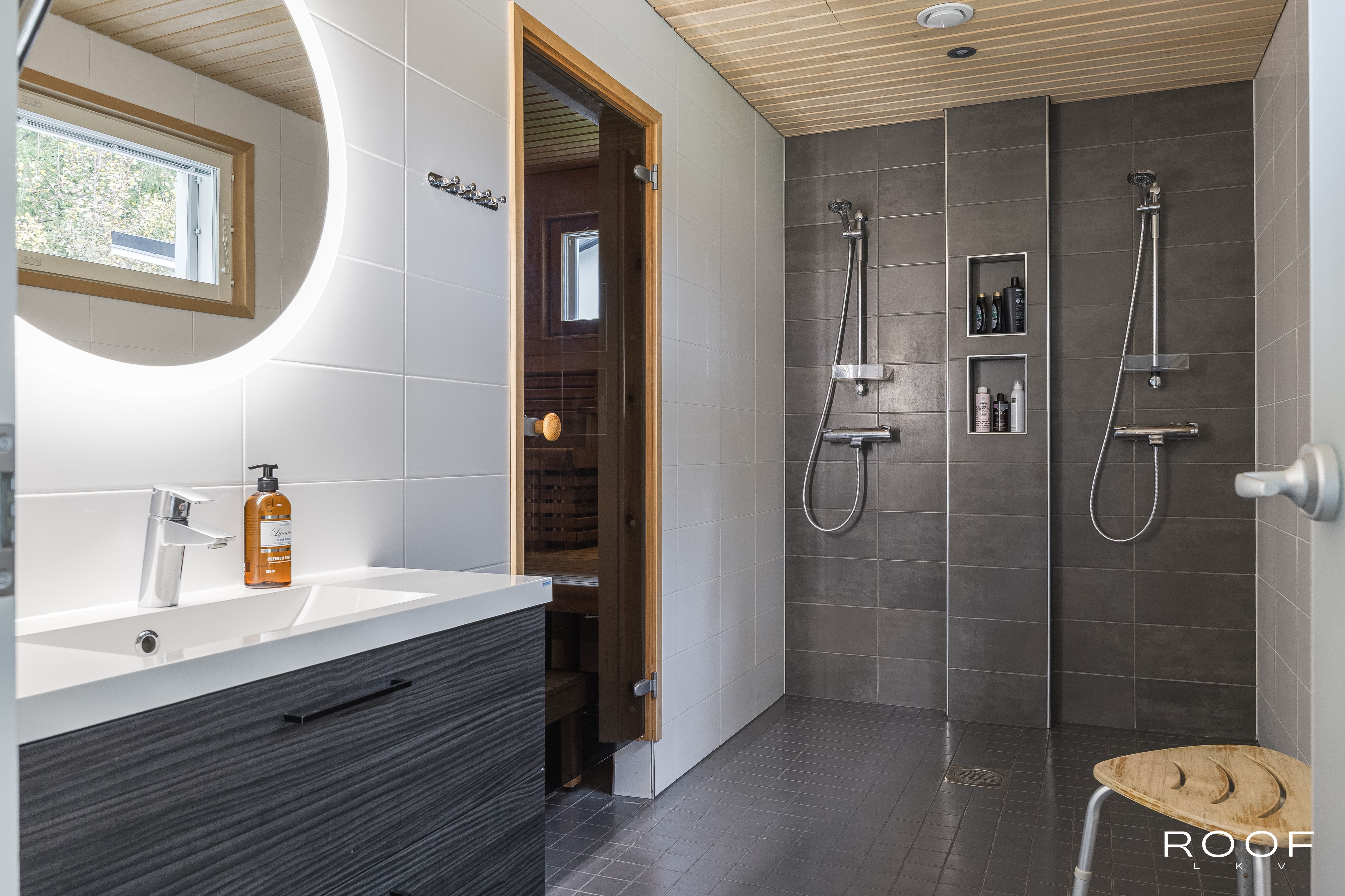 Rentoutumiseen löytyy oma sauna tervaleppälauteilla sekä lasitettu terassi, jolta avautuu näkymä hyvin hoidetulle pihalle. Pihalla on myös ulkoporeallas, joka kutsuu nauttimaan rentouttavista hetkistä. Autokatos kahdelle autolle ja lämmitetyt ulkoportaat lisäävät arjen sujuvuutta.