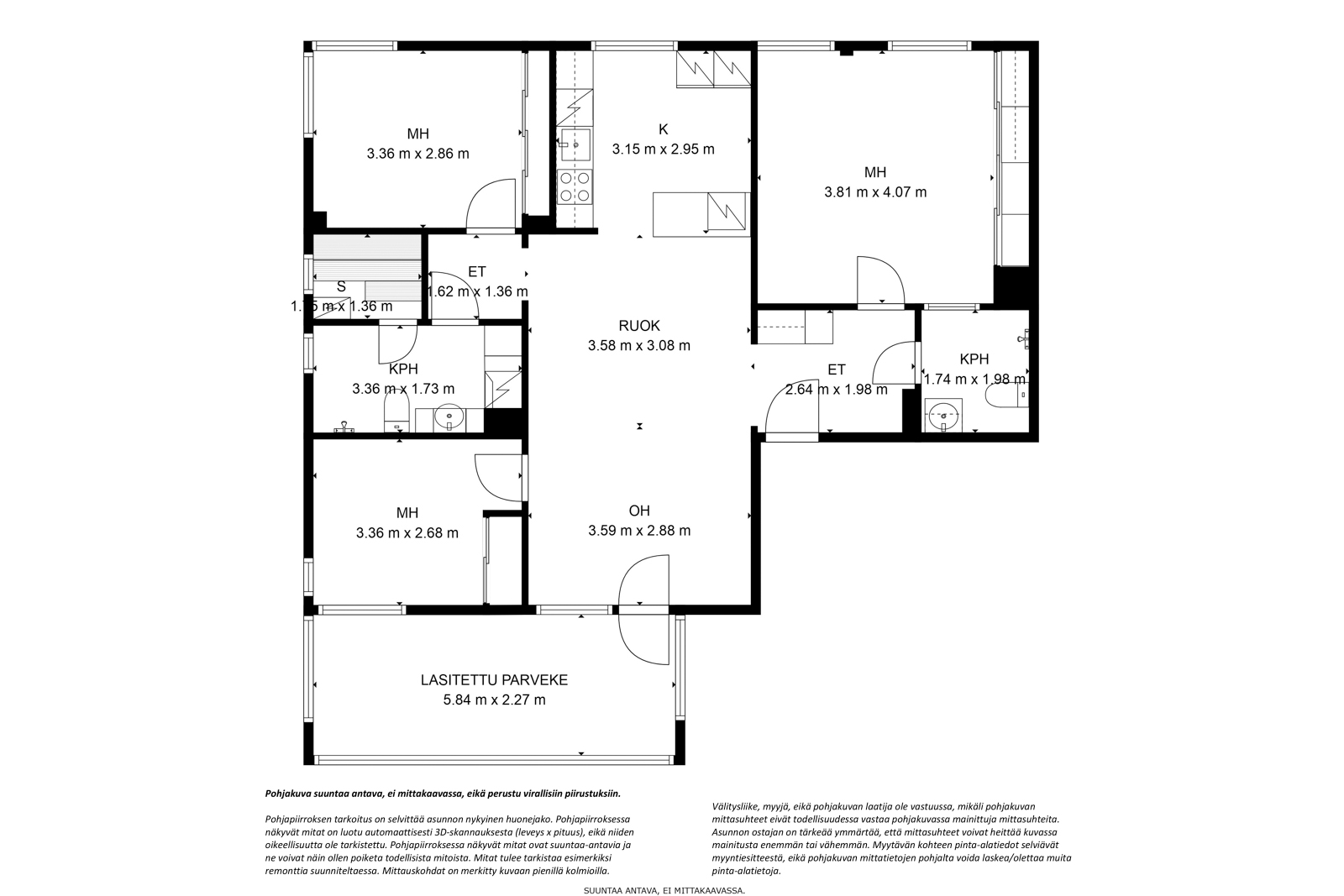 kerrostalo, 3 mh+oh+avokeittiö+kph/wc+s+kph/wc+lasit.parv
