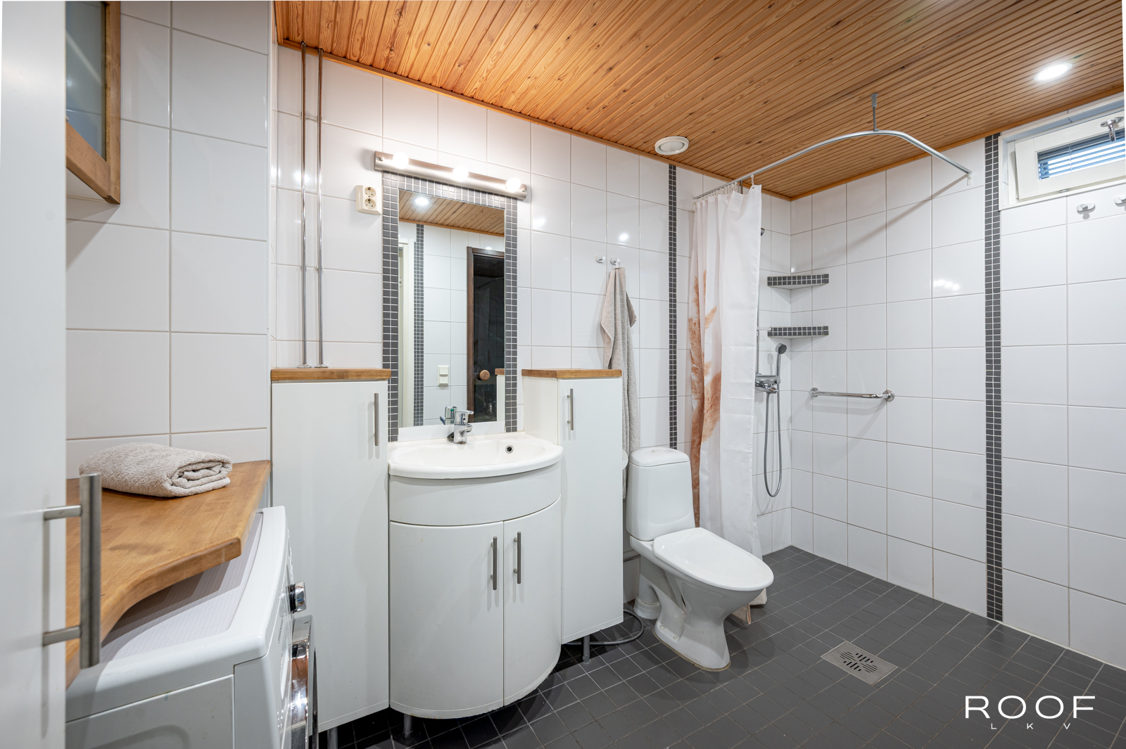 Asunnossa on kaksi kylpyhuonetta, jotka ovat alkuperäisessä, mutta siistissä kunnossa. Oma sauna tuo arkeen ripauksen luksusta. Asunnon lasitettu parveke avautuu etelään, tarjoten mukavan paikan rentoutumiseen.