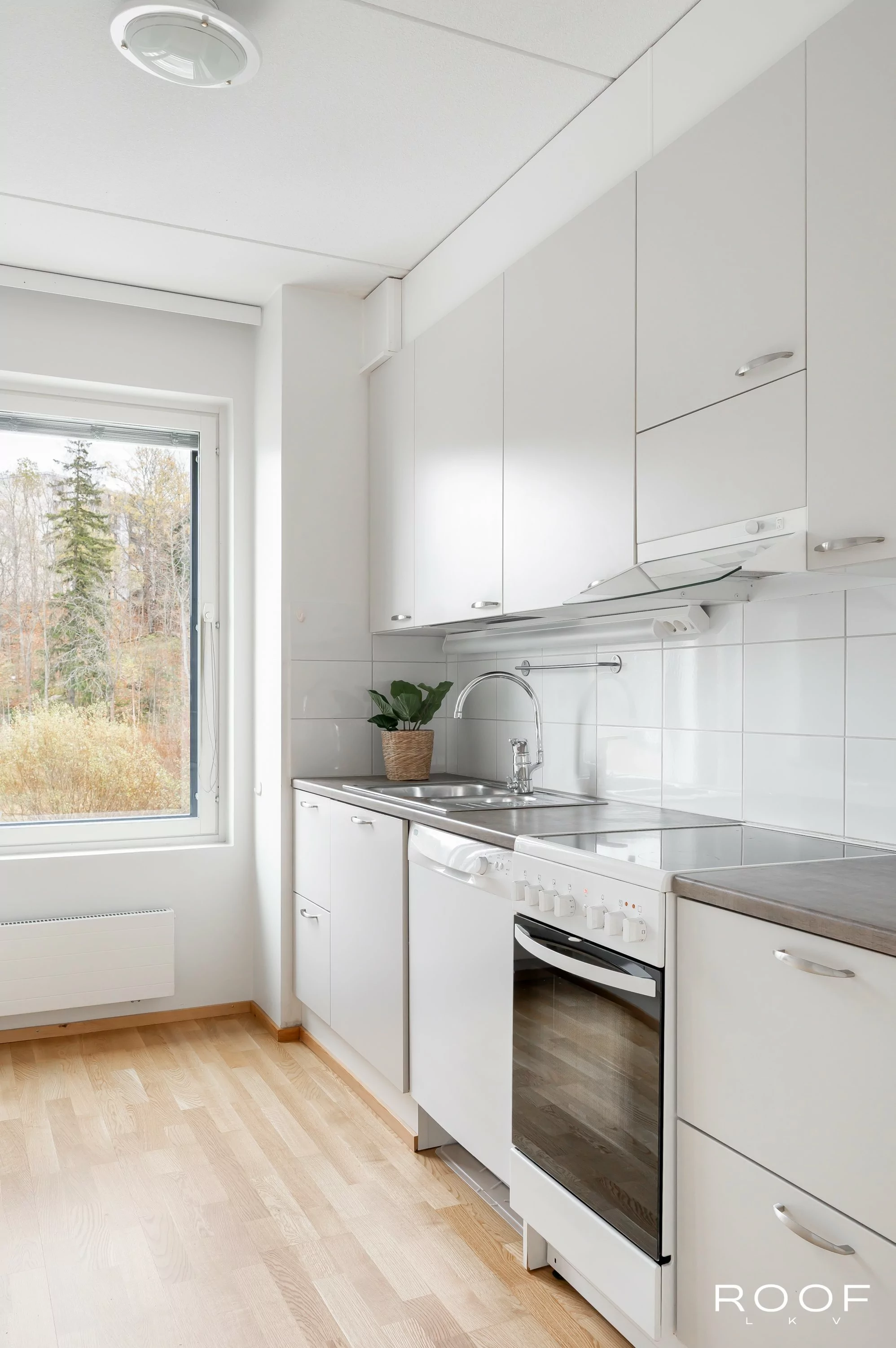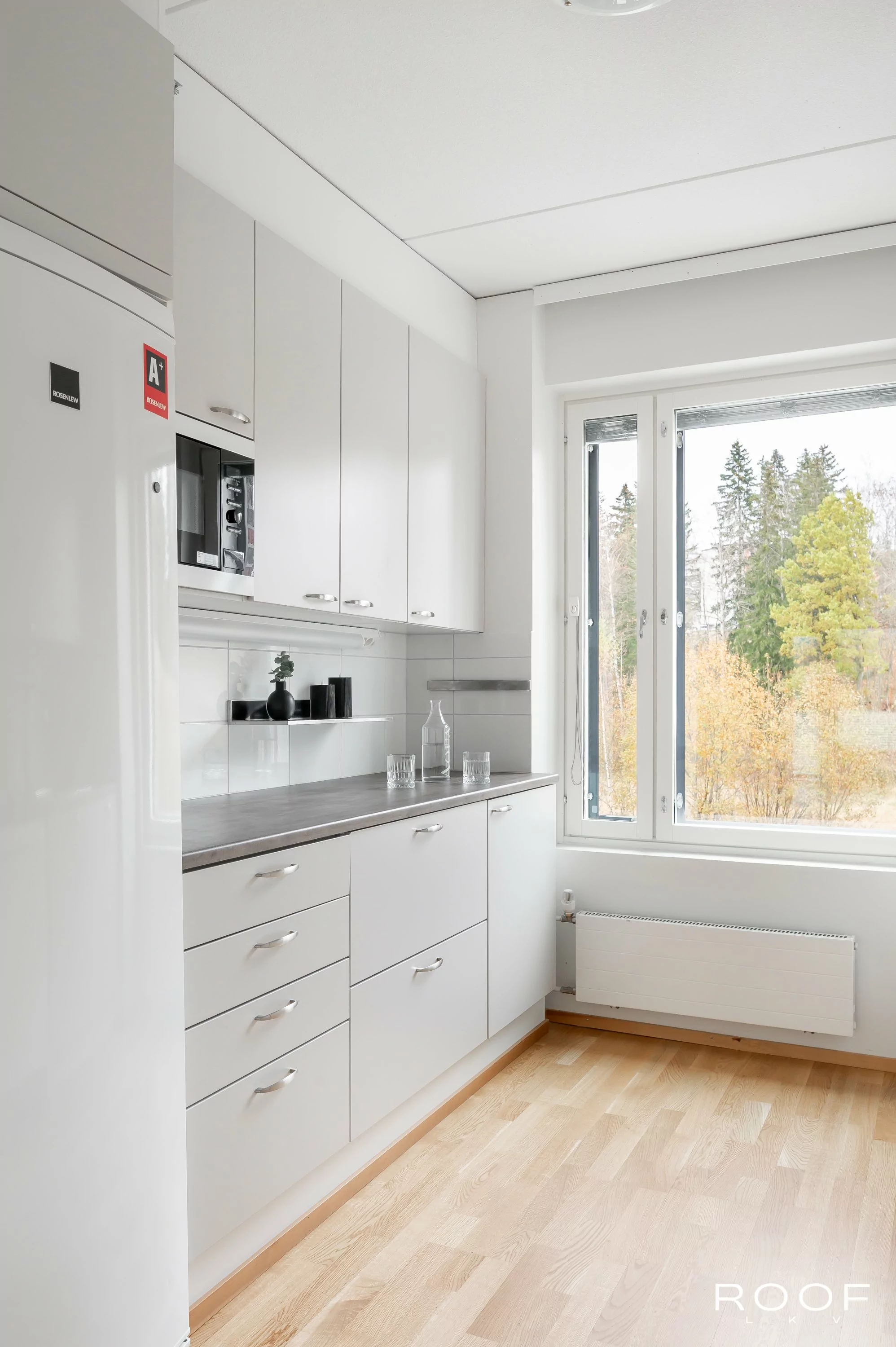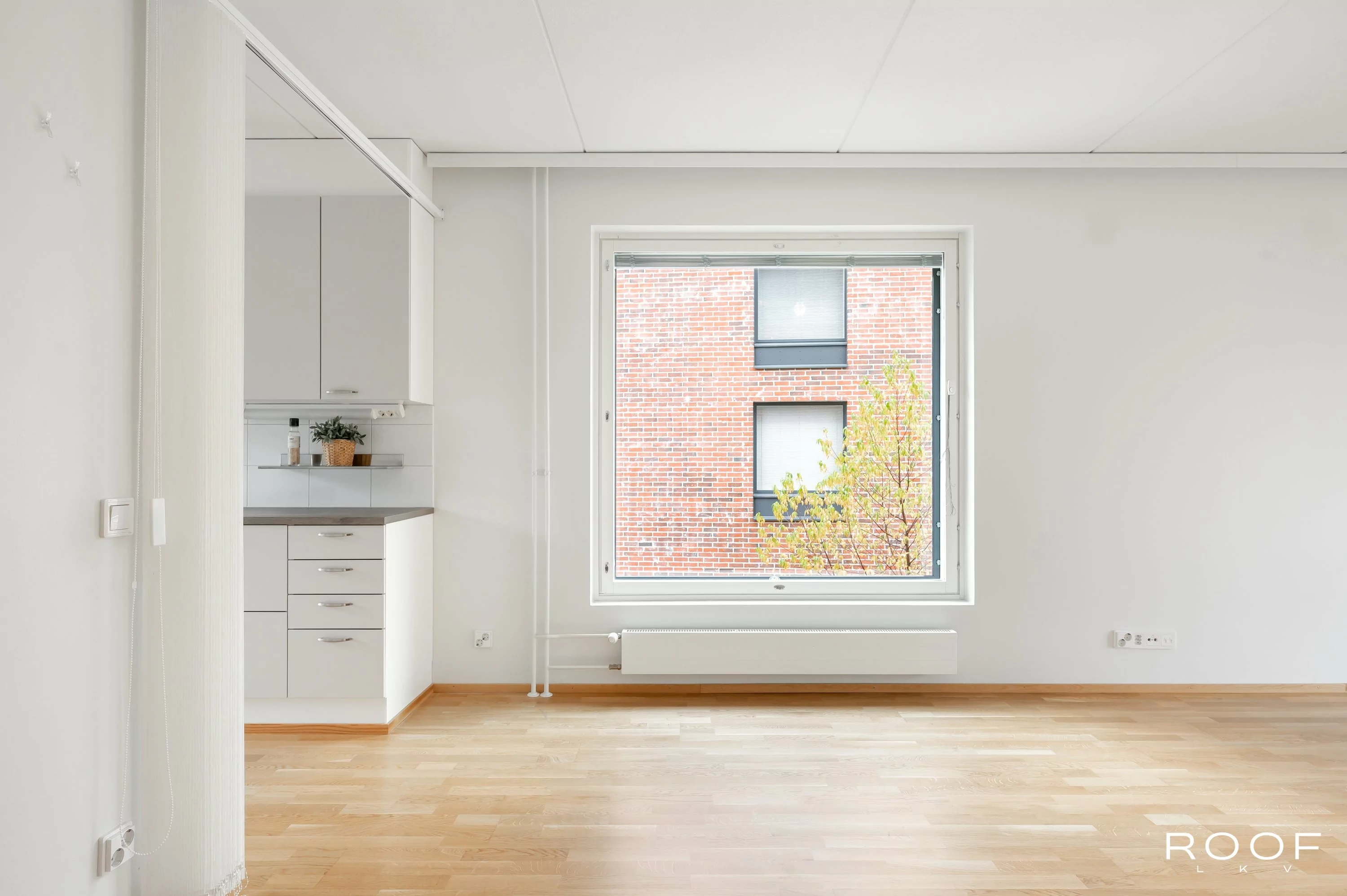 Tämä muuttovalmis kolmio kutsuu viihtymään. Kodin sydän on avara olohuone, keittiö ja ruokailutila, jotka yhdistyvät yhtenäiseksi, valoisaksi kokonaisuudeksi. Suuret ikkunat ja lasitettu parveke tuovat runsaasti luonnonvaloa ja lisäävät tilantuntua – parveke toimii kuin toinen olohuone pitkälle syksyyn.