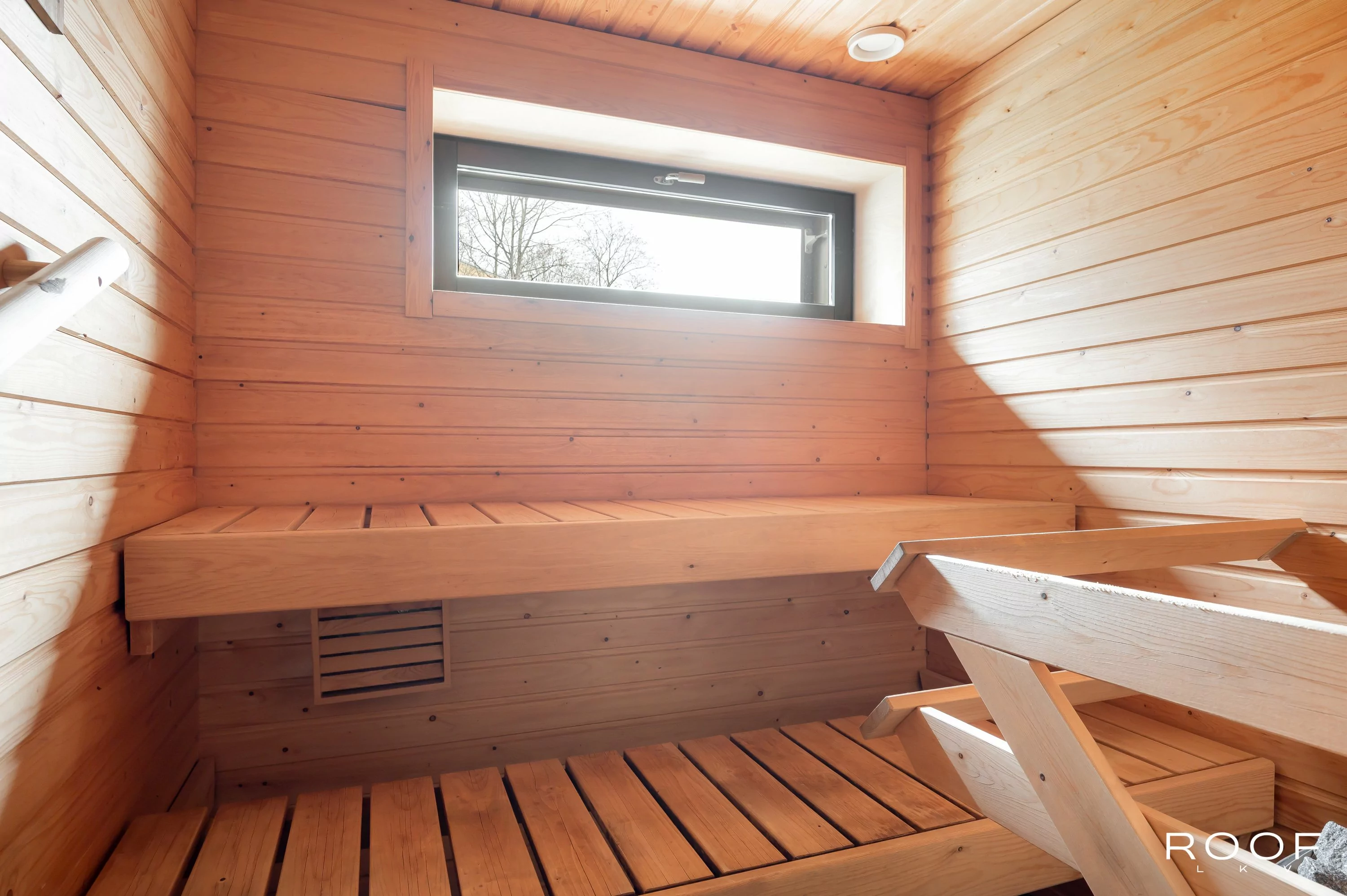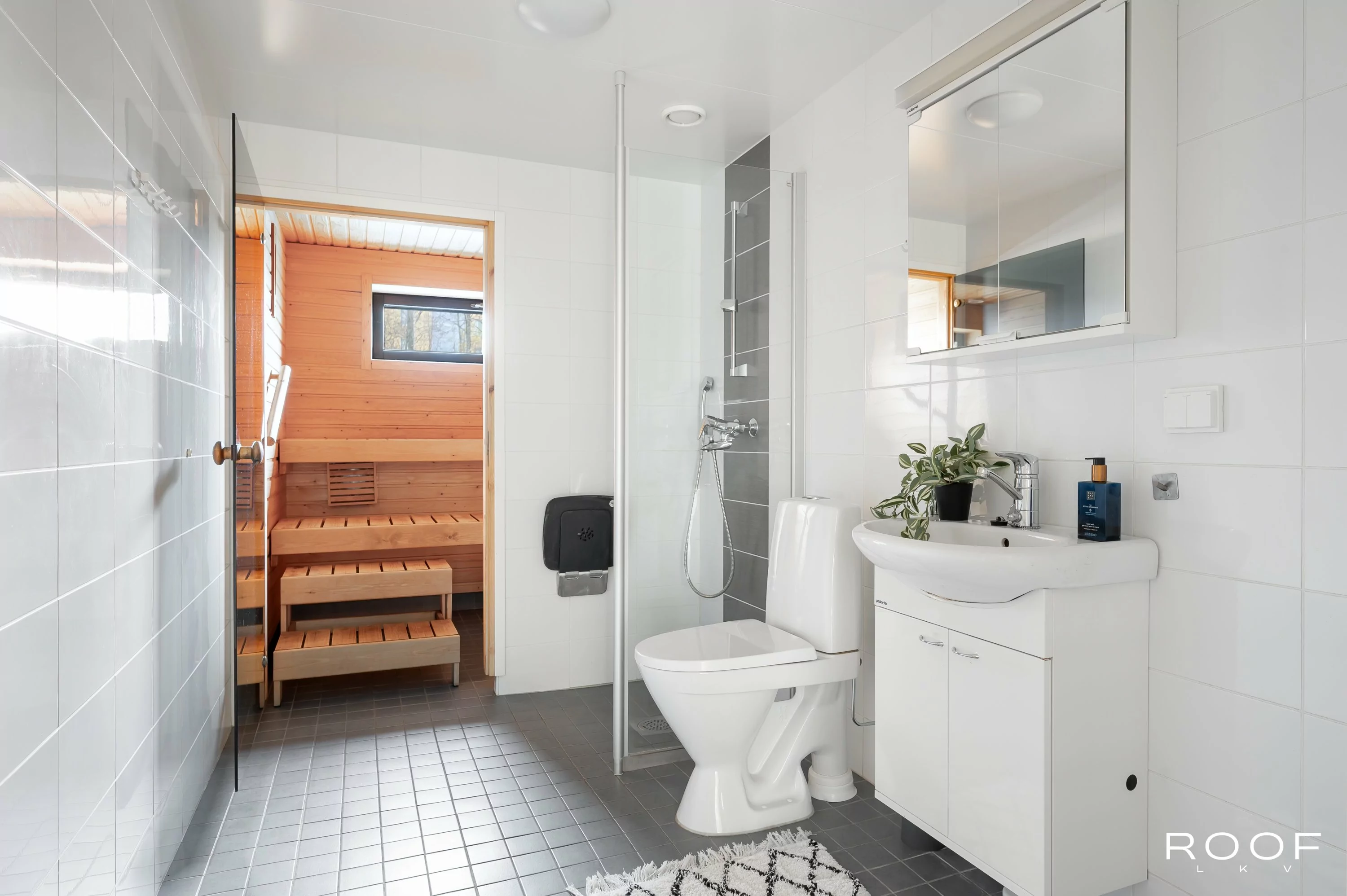 Kylpyhuone on tilava ja toimiva, sinne mahtuu pesutorni ja lisää kaappeja mitkä tarjoavat lisäsäilytystä. Oman saunan lämpö kruunaa päivän päätteeksi.