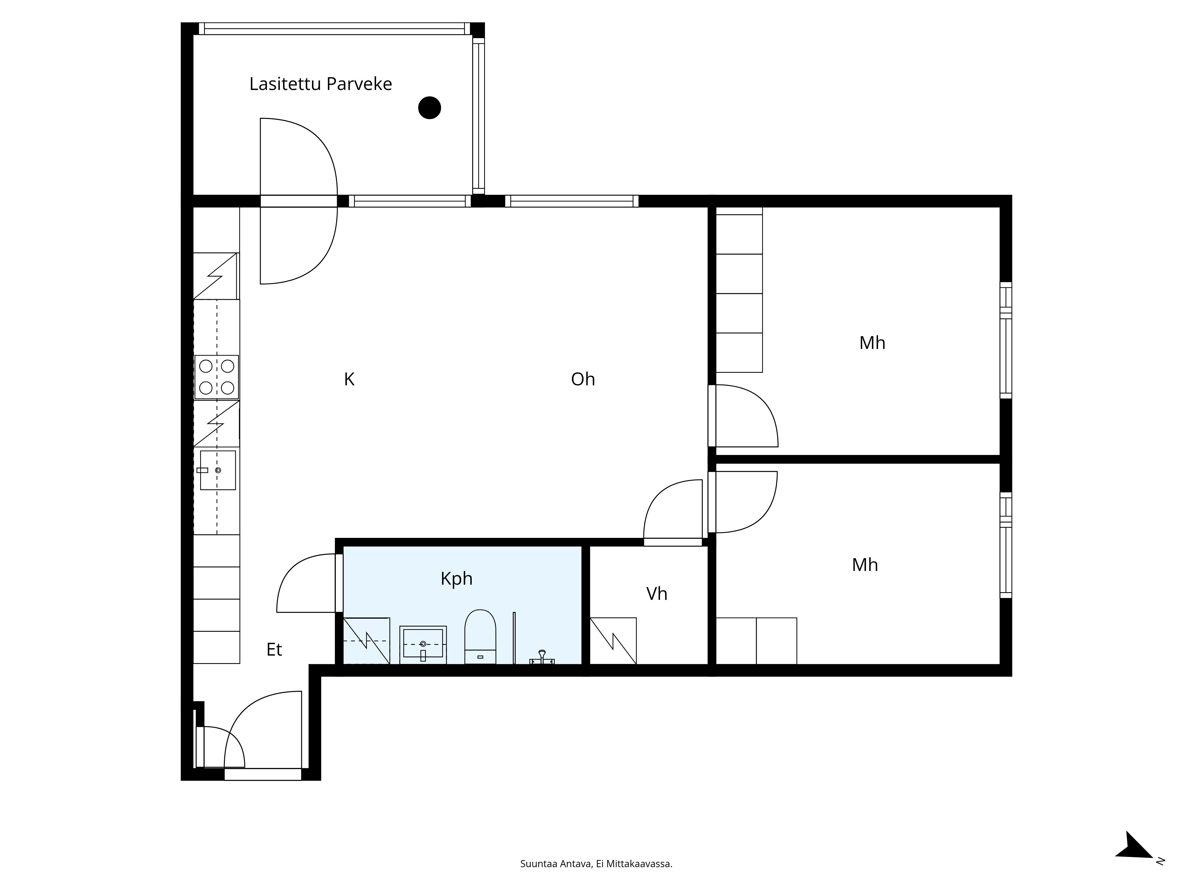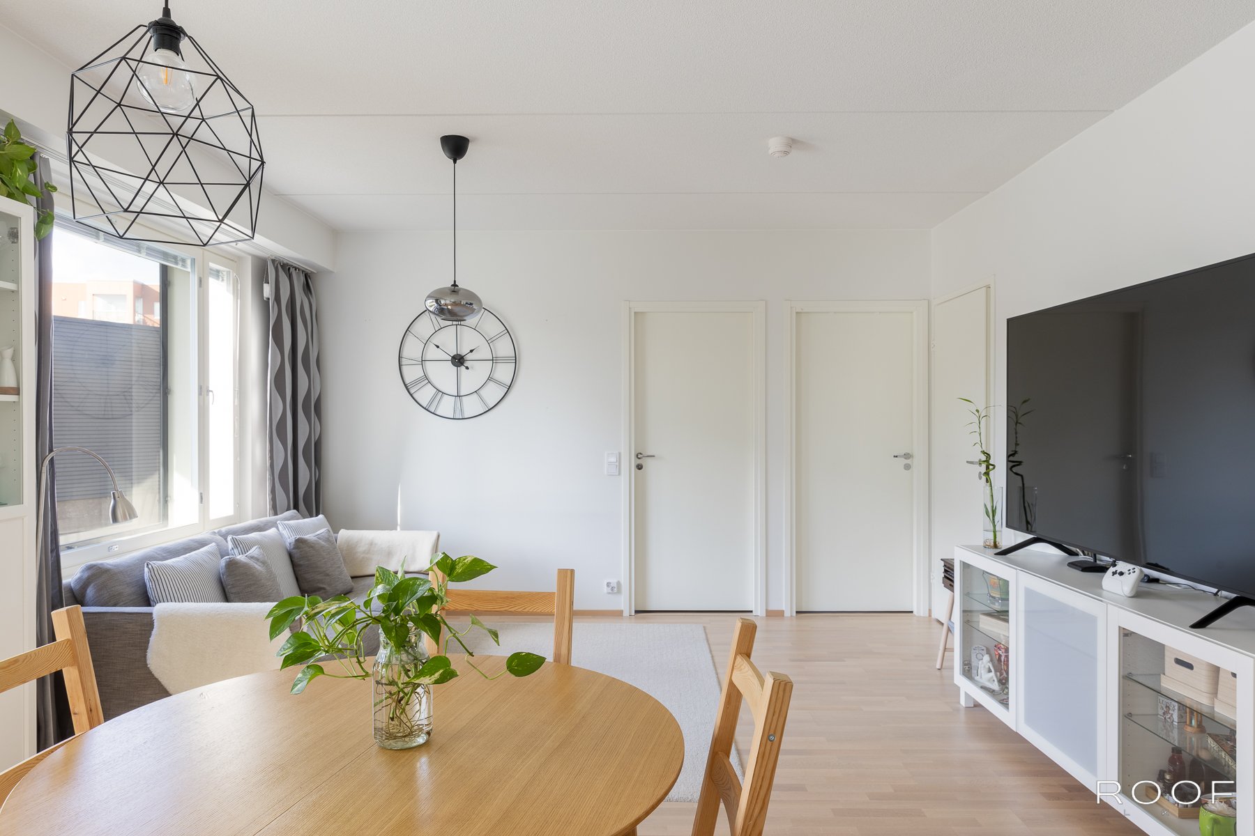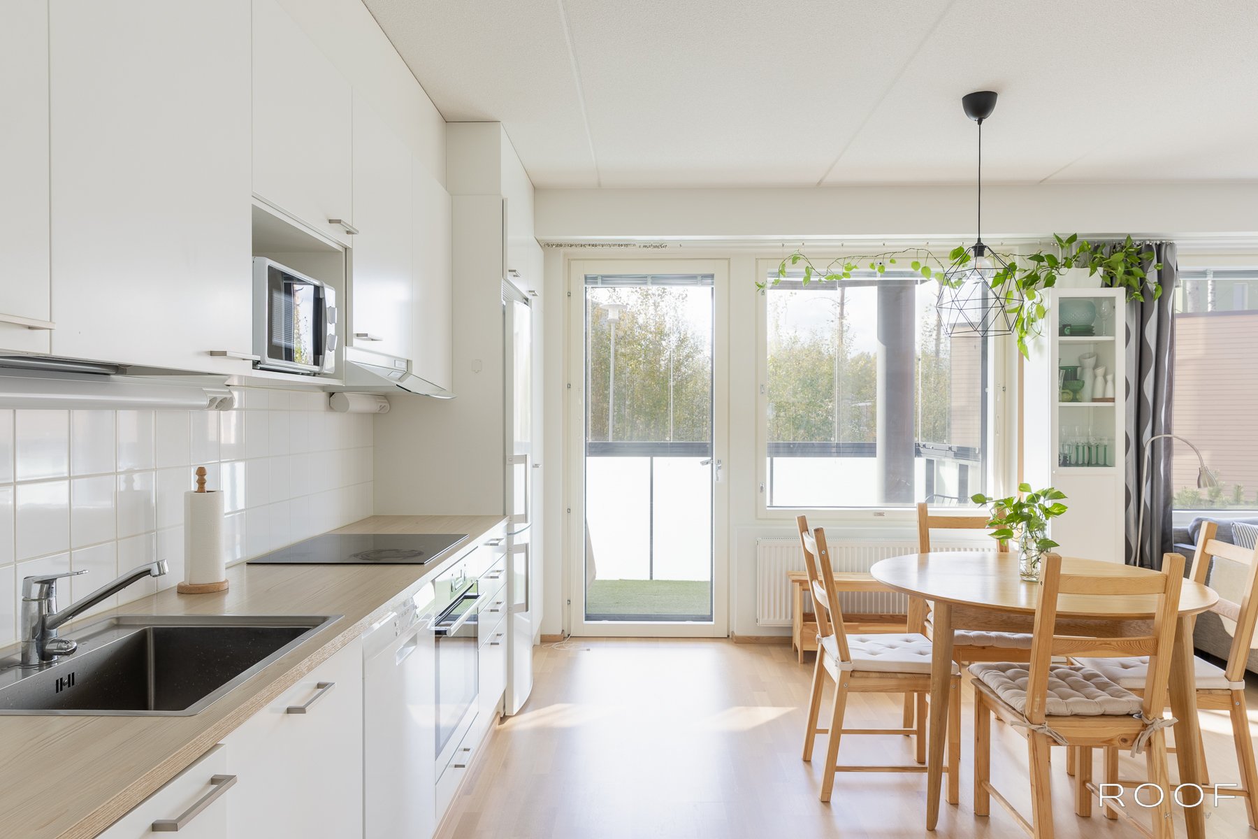 Asunnossa on avokeittiö, joka yhdistyy olohuoneeseen, luoden yhtenäisen tilan. Parketti lattiat ja tyylikkäät pintamateriaalit tuovat modernia ilmettä. Kaksi makuuhuonetta tarjoavat riittävästi tilaa tarpeisiin, ja molemmissa huoneissa on kaapistot säilytystilaa varten.