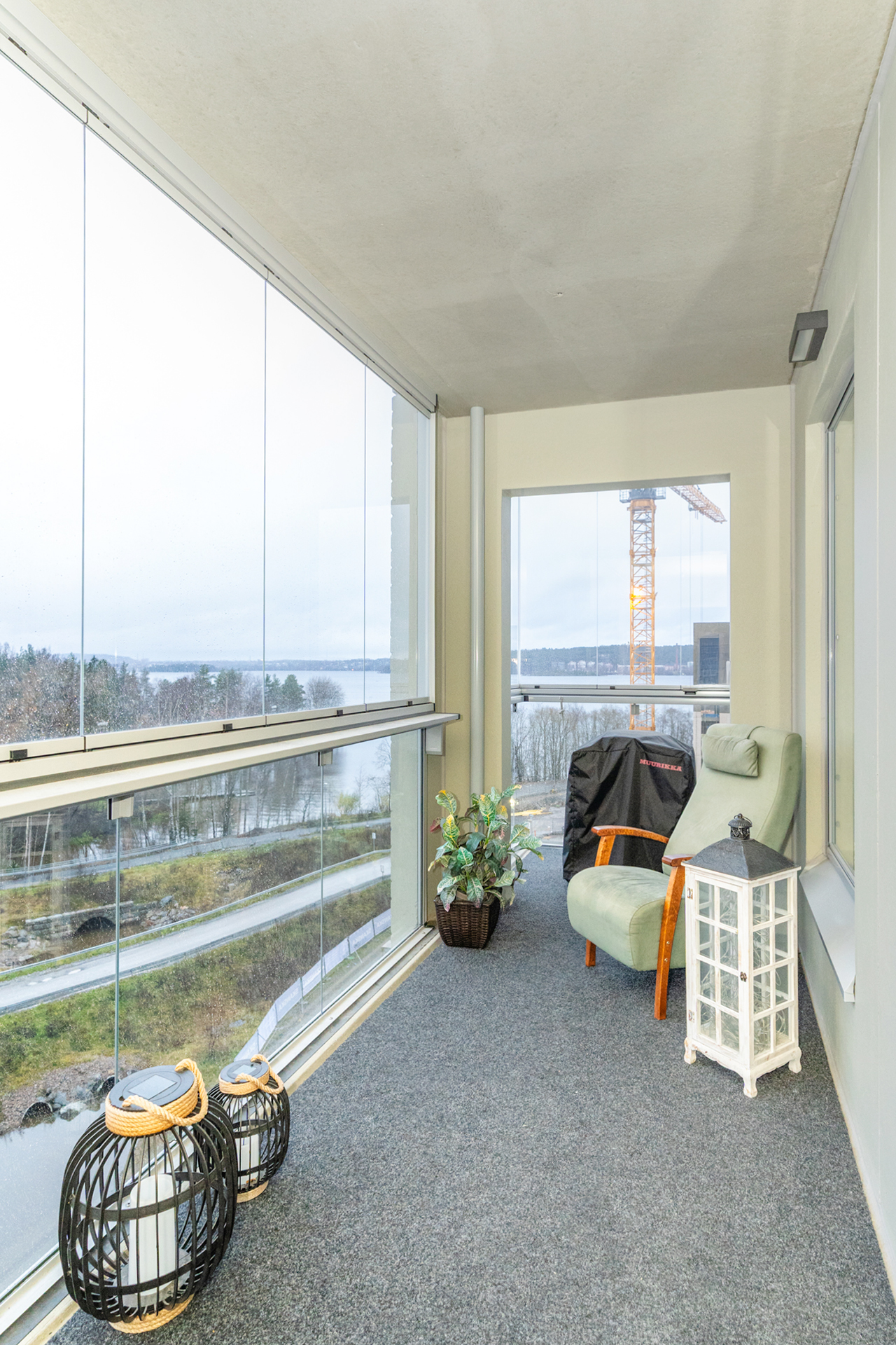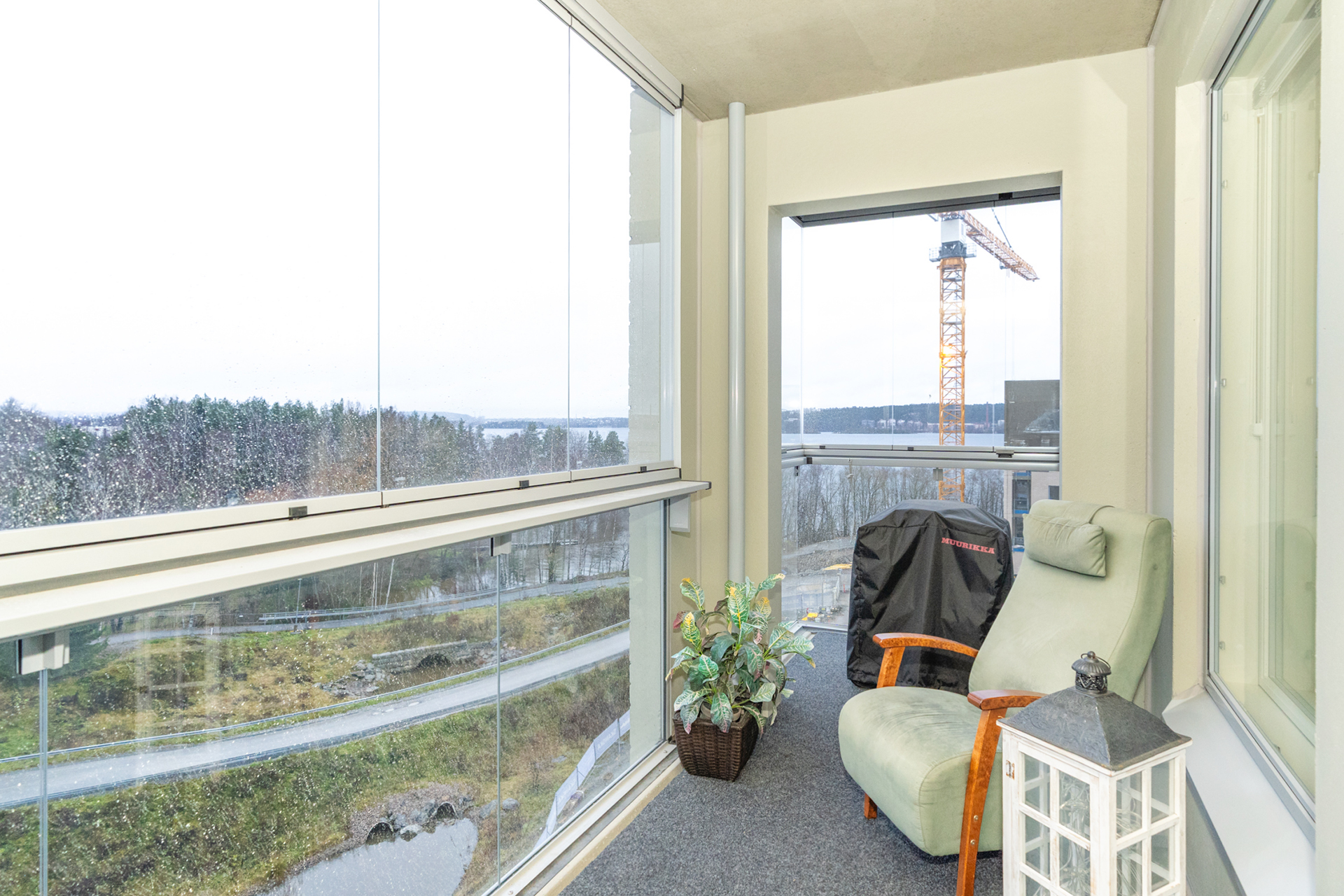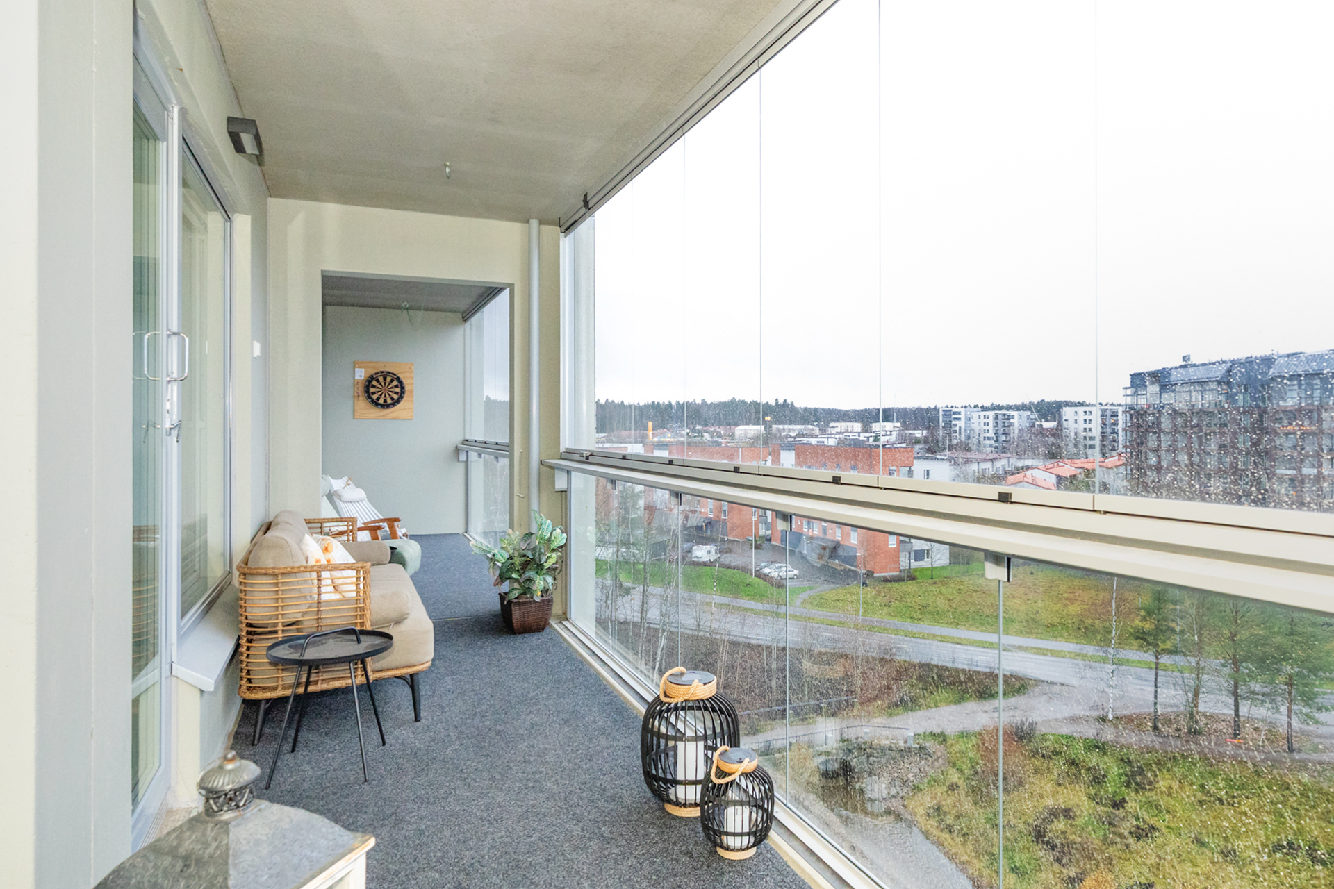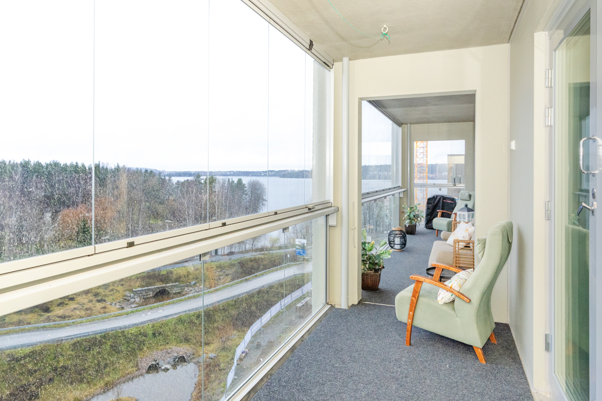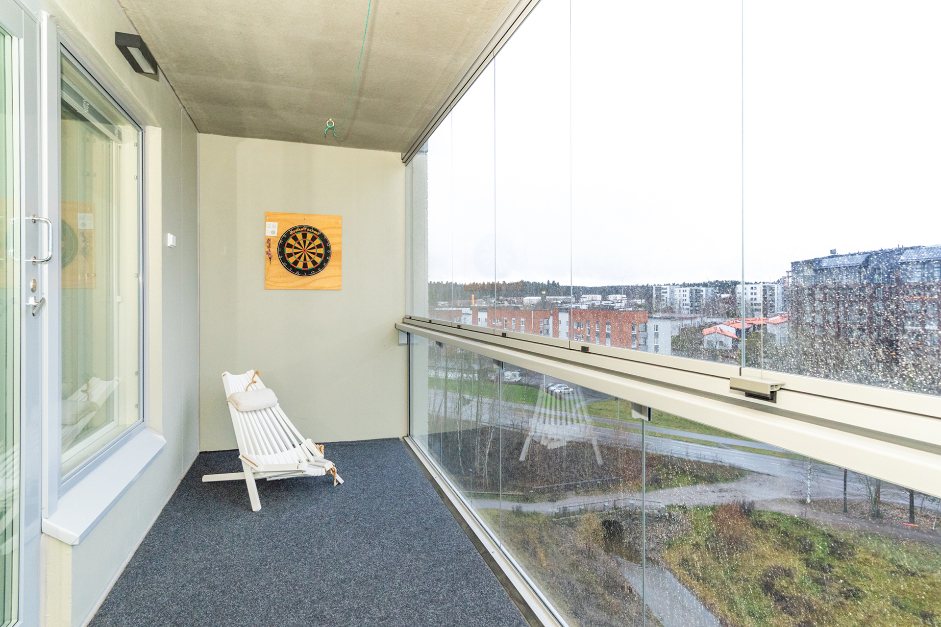 Asunnossa on kaksi makuuhuonetta, jossa toisessa on sisäänkäynti omalle parvekkeelle. Laadukas kylpyhuone omalla saunalla. Kokonaisuuden kruunaa iso lasitettu parveke olohuoneen yhteydessä.