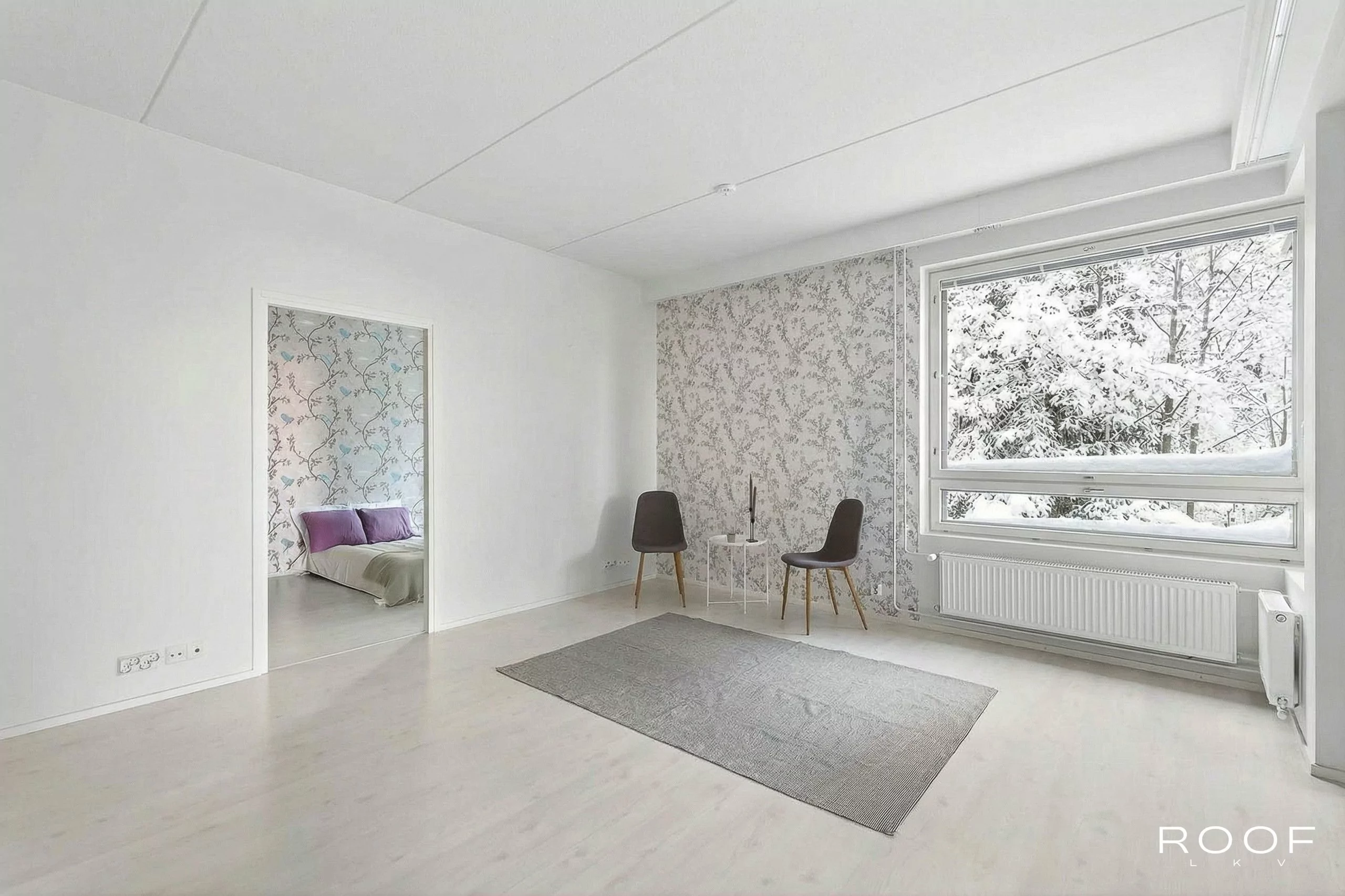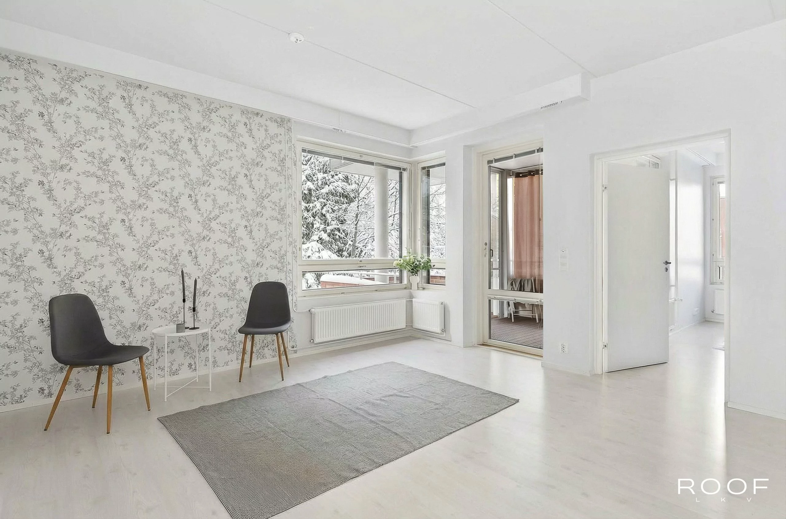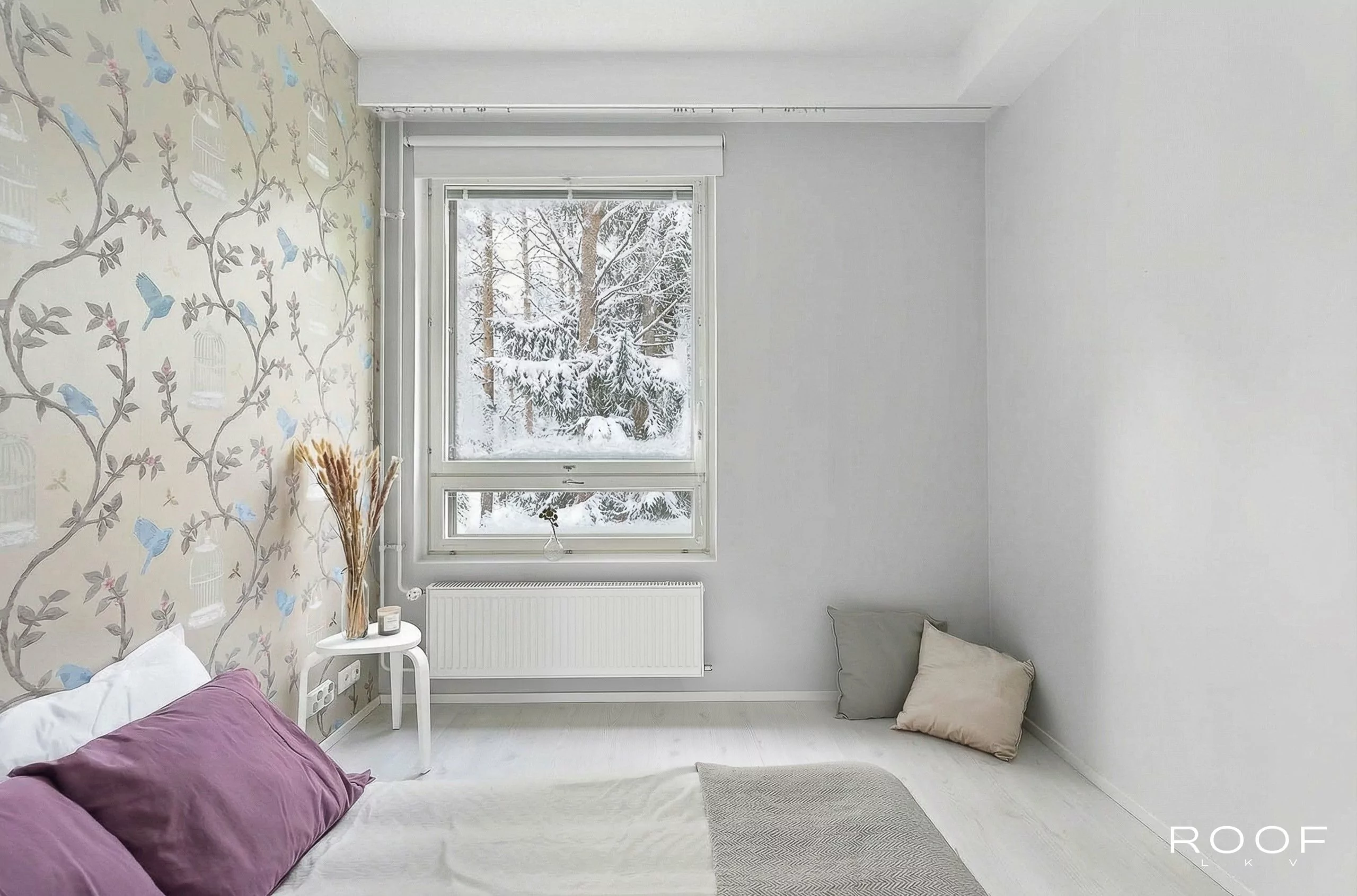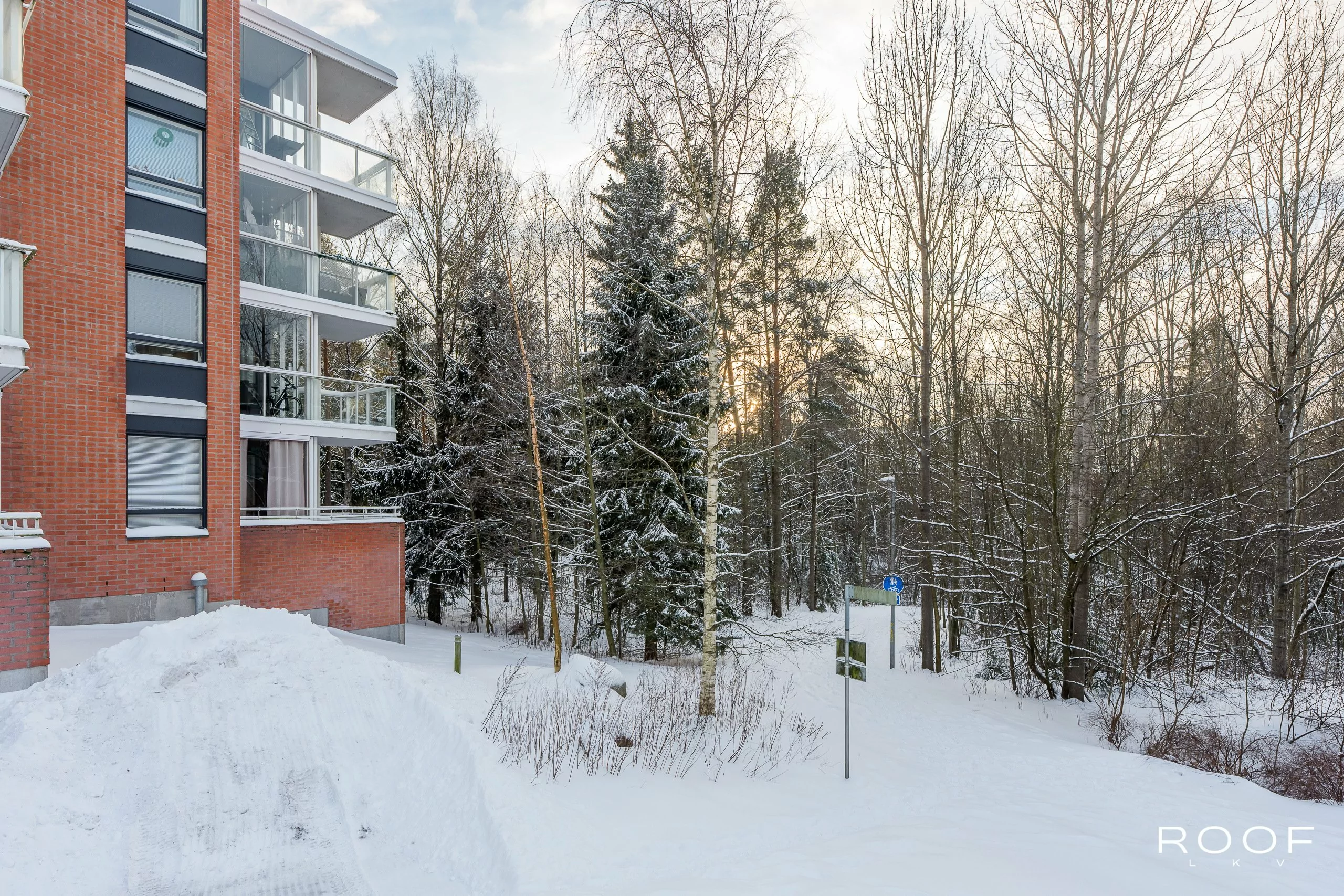 Asunnon olohuone on avara ja valoisa, ja sieltä on käynti tilavalle lasitetulle parvekkeelle, josta avautuvat rauhalliset metsänäkymät. Keittiö on moderni ja vaaleasävyinen ja se on varusteltu nykyaikaisilla kodinkoneilla. Kaksi makuuhuonetta sijaitsevat olohuoneen molemmin puolin, tarjoten rauhalliset omat tilat. Raikkaan vaaleassa kylpyhuoneessa on tilaa pesutornille ja se on varustettu lattialämmityksellä.