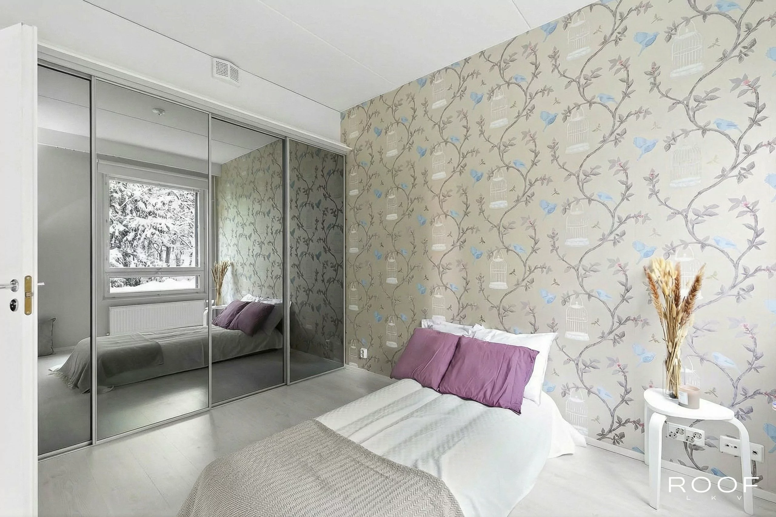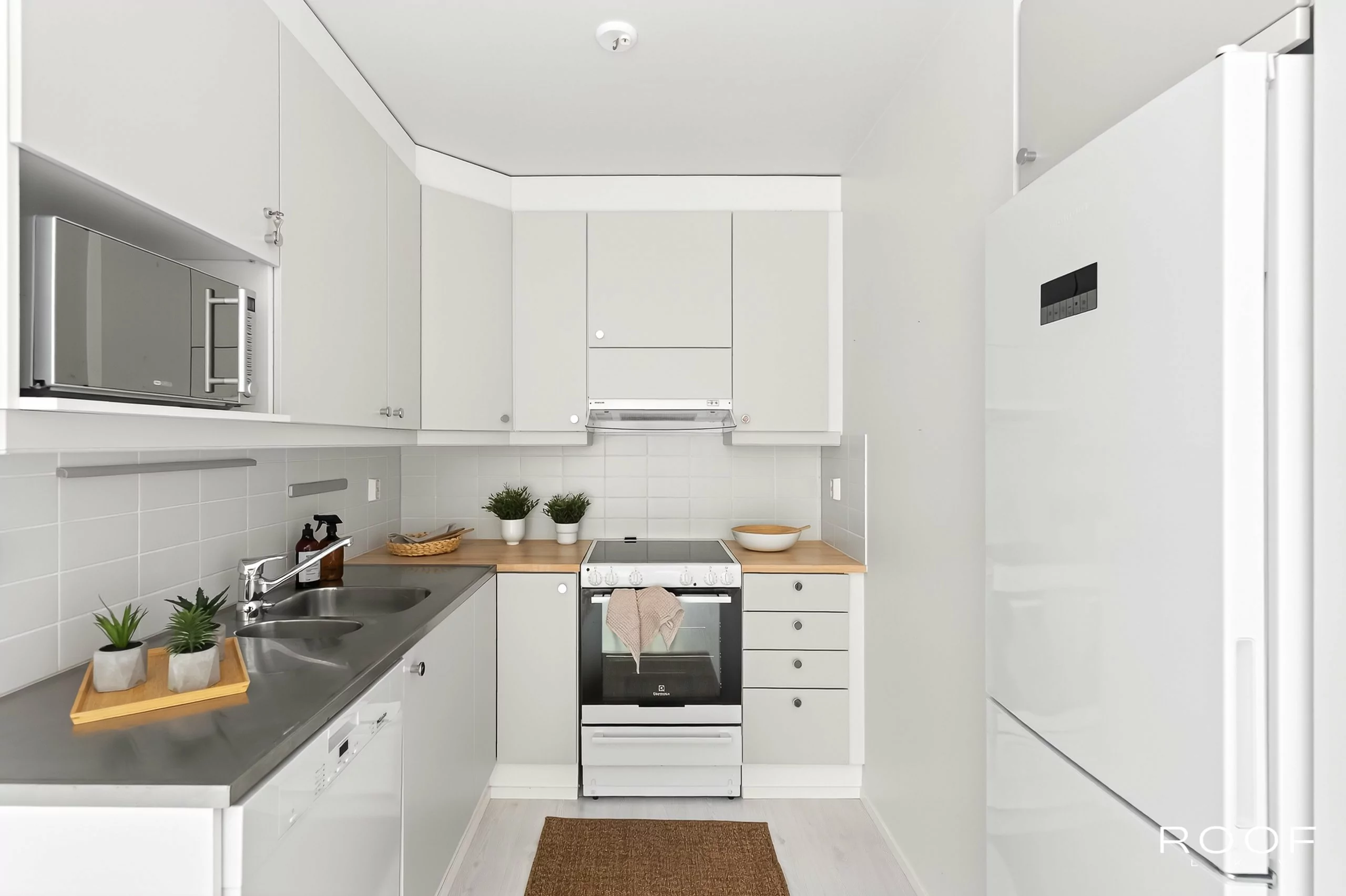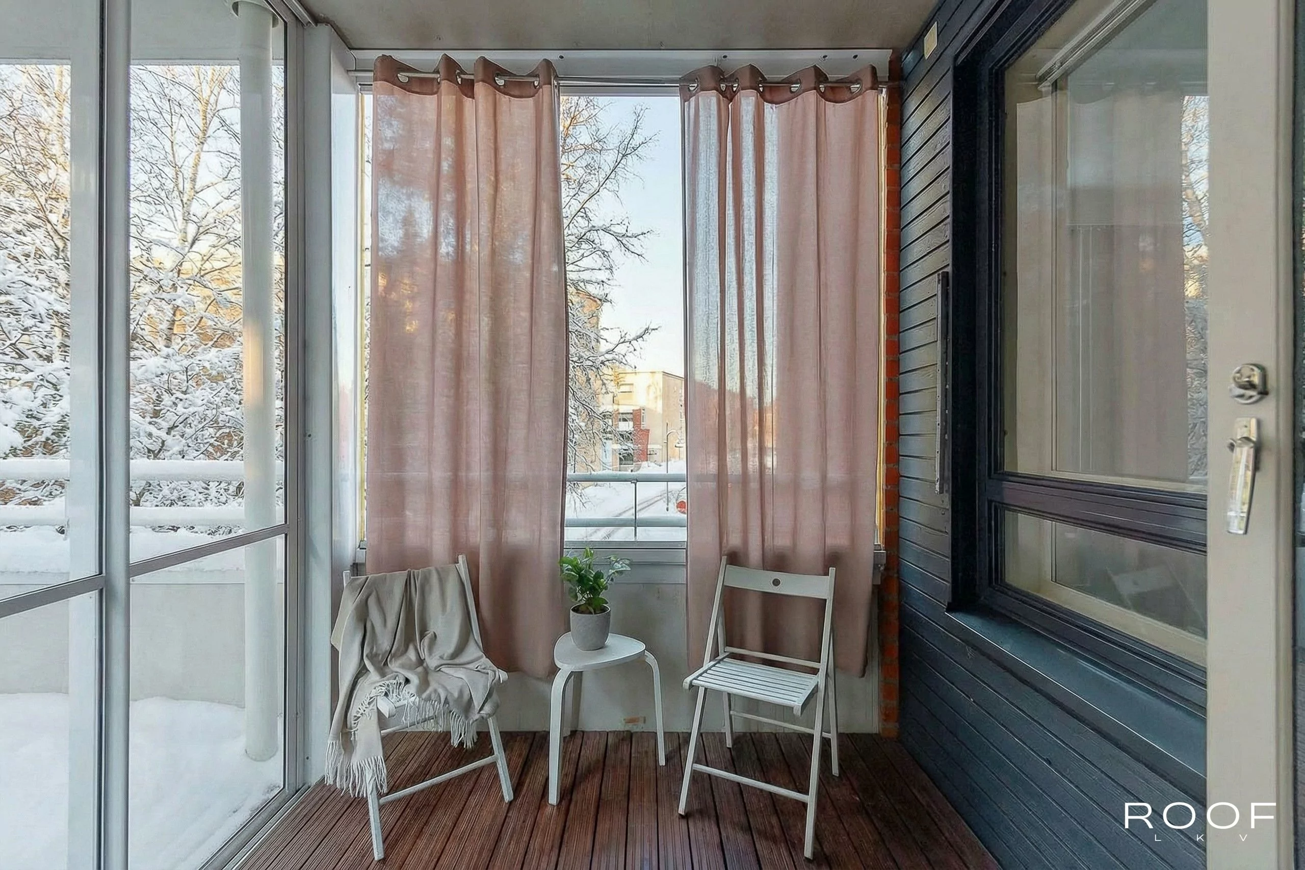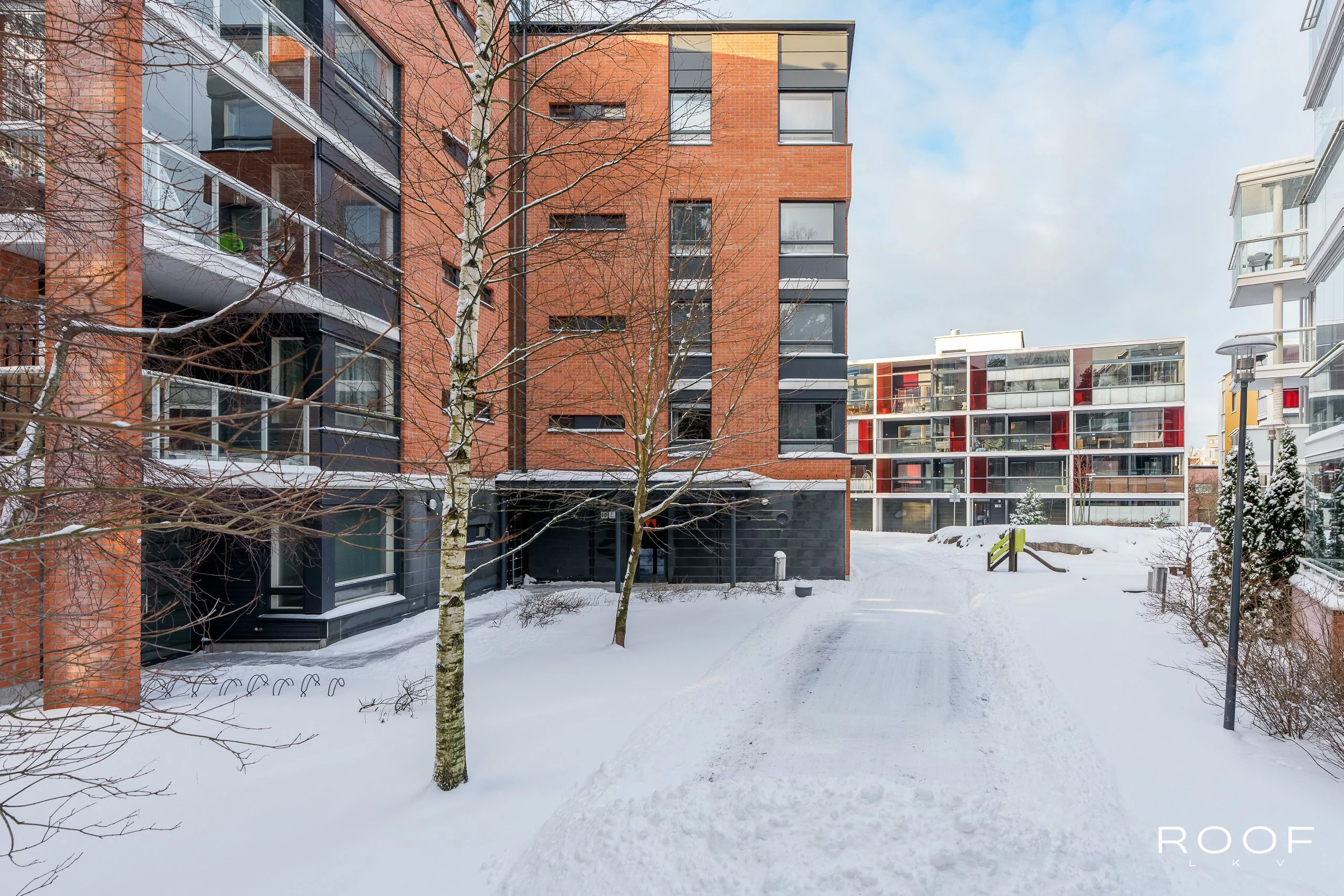 Asunnon olohuone on avara ja valoisa, ja sieltä on käynti tilavalle lasitetulle parvekkeelle, josta avautuvat rauhalliset metsänäkymät. Keittiö on moderni ja vaaleasävyinen ja se on varusteltu nykyaikaisilla kodinkoneilla. Kaksi makuuhuonetta sijaitsevat olohuoneen molemmin puolin, tarjoten rauhalliset omat tilat. Raikkaan vaaleassa kylpyhuoneessa on tilaa pesutornille ja se on varustettu lattialämmityksellä.