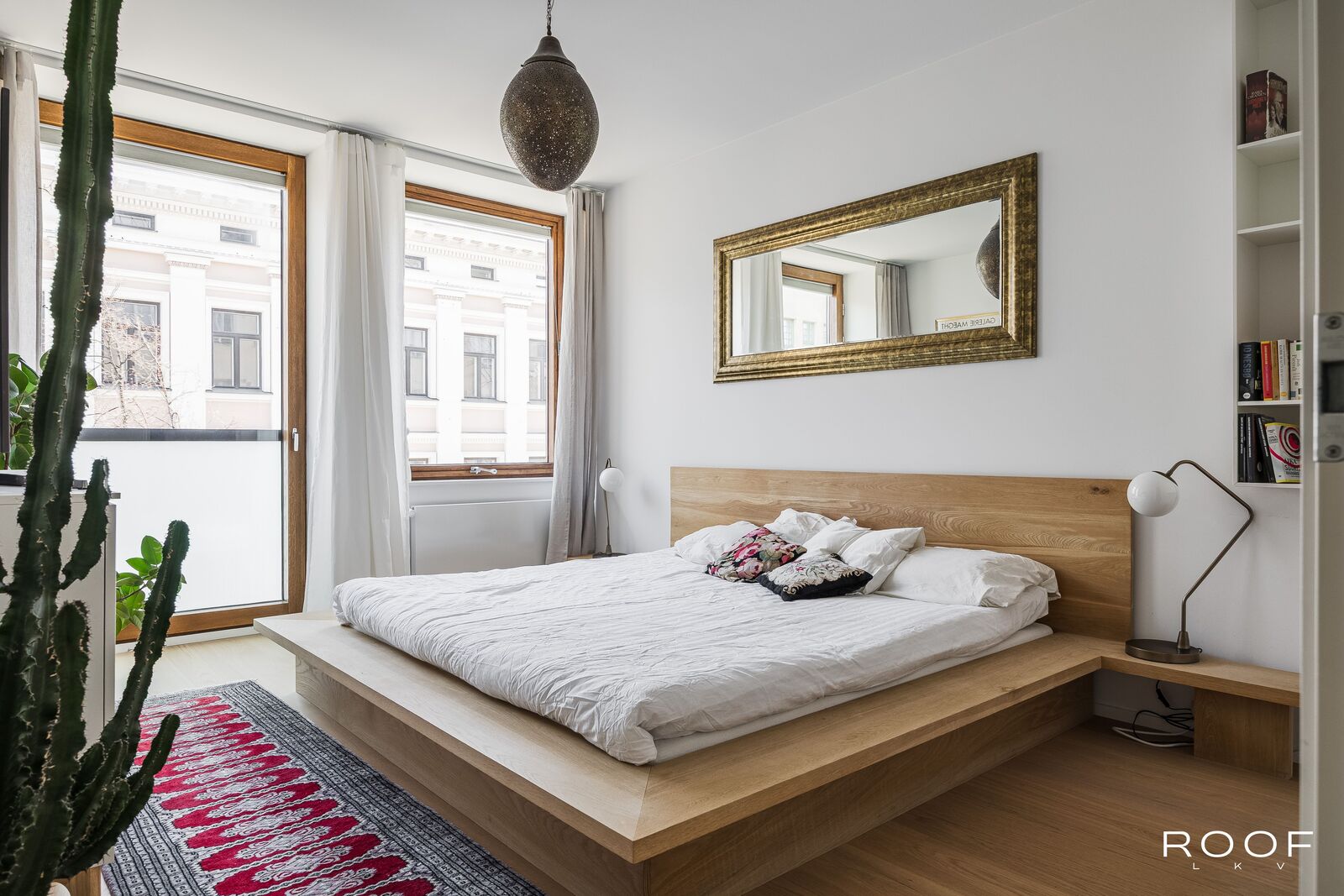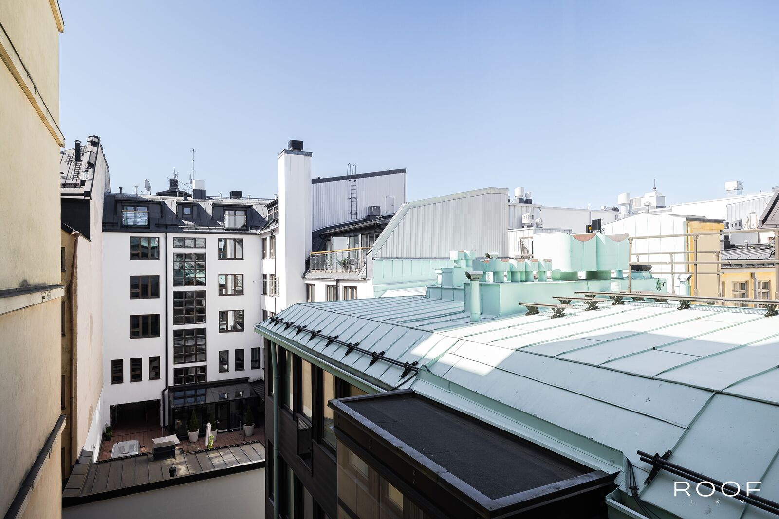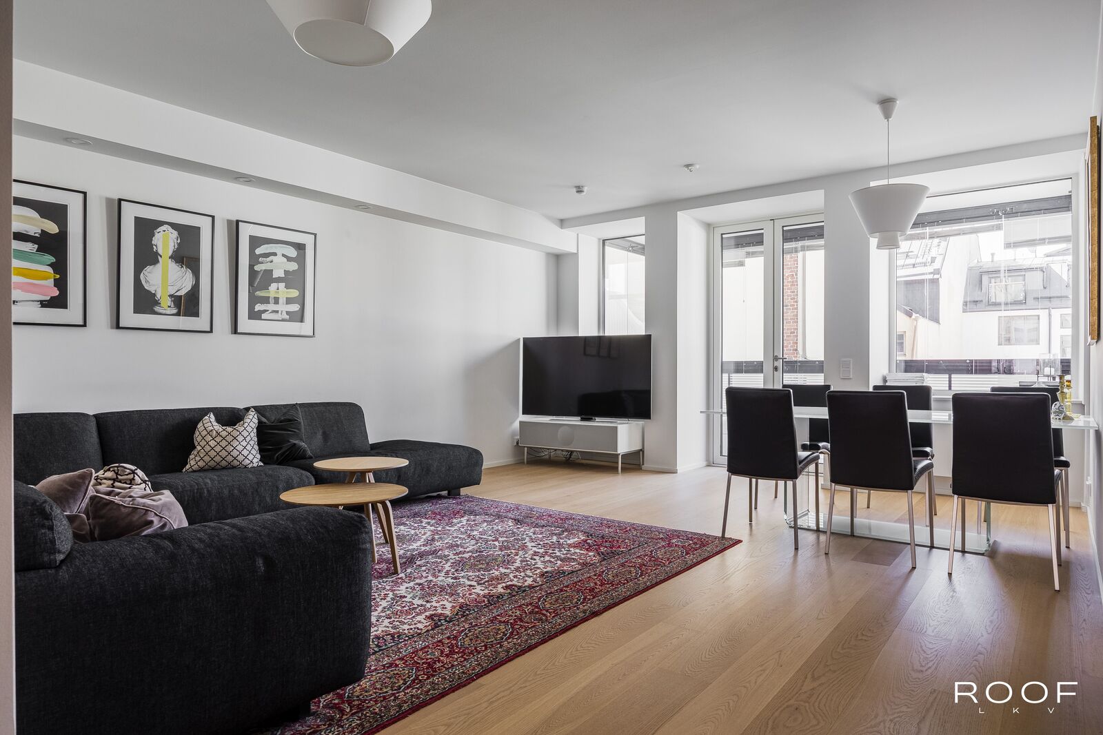 Olohuone, kuten keittiökin, sijoittuu lännen puoleiselle julkisivulle. Massiiviset kattorakenteet tuovat tilaan persoonallista industrial-henkeä muistona rakennuksen historiasta. Pariovet johdattavat lasitetulle parvekkeelle, jolta voi seurata auringonlaskuja yli Kaartinkaupungin kattojen. Itään suuntautuvat makuuhuoneet saavat aamuauringon valon ja tarjoavat rauhalliset puitteet lepoon tai työskentelyyn.