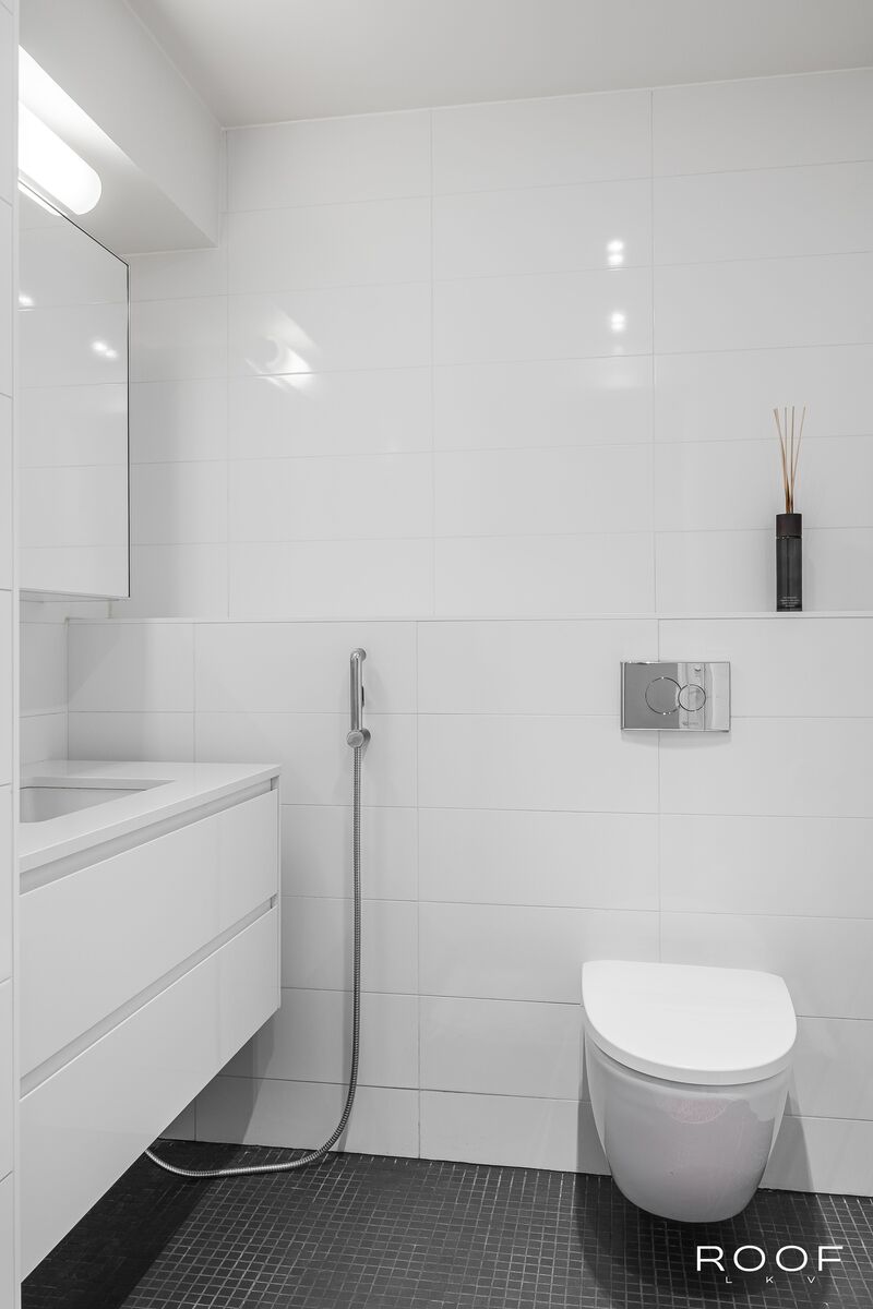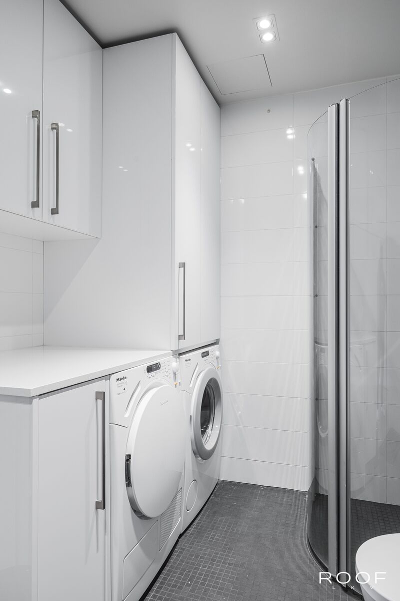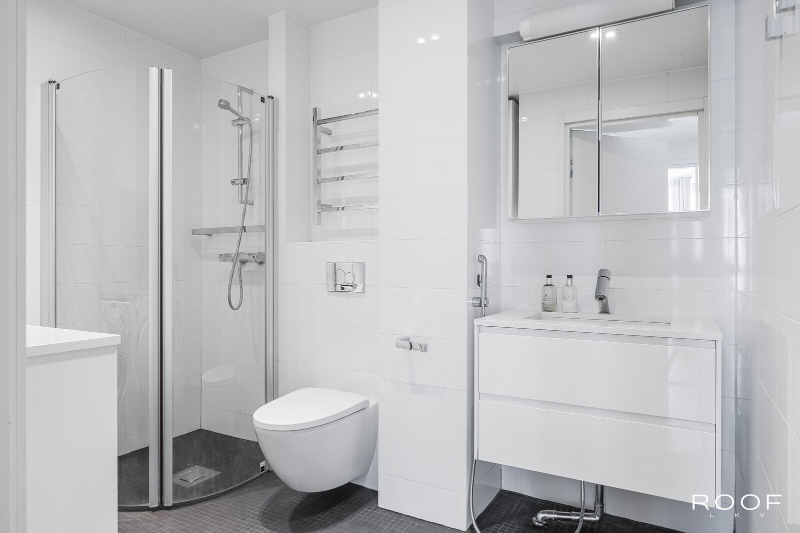 Tilavassa kylpyhuoneessa on tyylikkäät Blueform Memento -kalusteet, kvartsitasot, seinäkiinnitteinen wc-istuin, suihkunurkkaus sekä Mielen pesukone ja kuivausrumpu. Asunnossa on lisäksi erillinen wc.