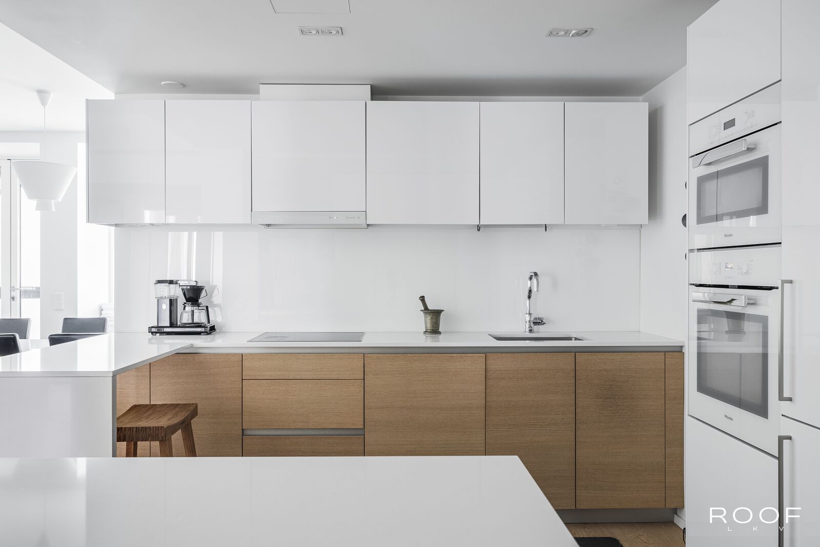 Keittiö on suunniteltu toimivaksi ja ajattomaksi. Vaaleat sävyt, puuelementit, kvartsitasot ja italialaiset Snaidero-kalusteet luovat rauhallisen pohjan sisustukselle. Mielen integroidut kodinkoneet ja saareke tuovat arkeen sujuvuutta. Ruokailutila sijoittuu luontevasti keittiön yhteyteen ikkunan ääreen.