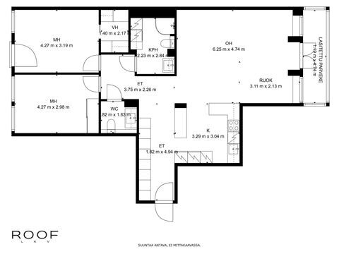 3h, k, kph, erill. wc, vh + parveke (yhtiöjärjestyksen mukaan 3 h+kt)