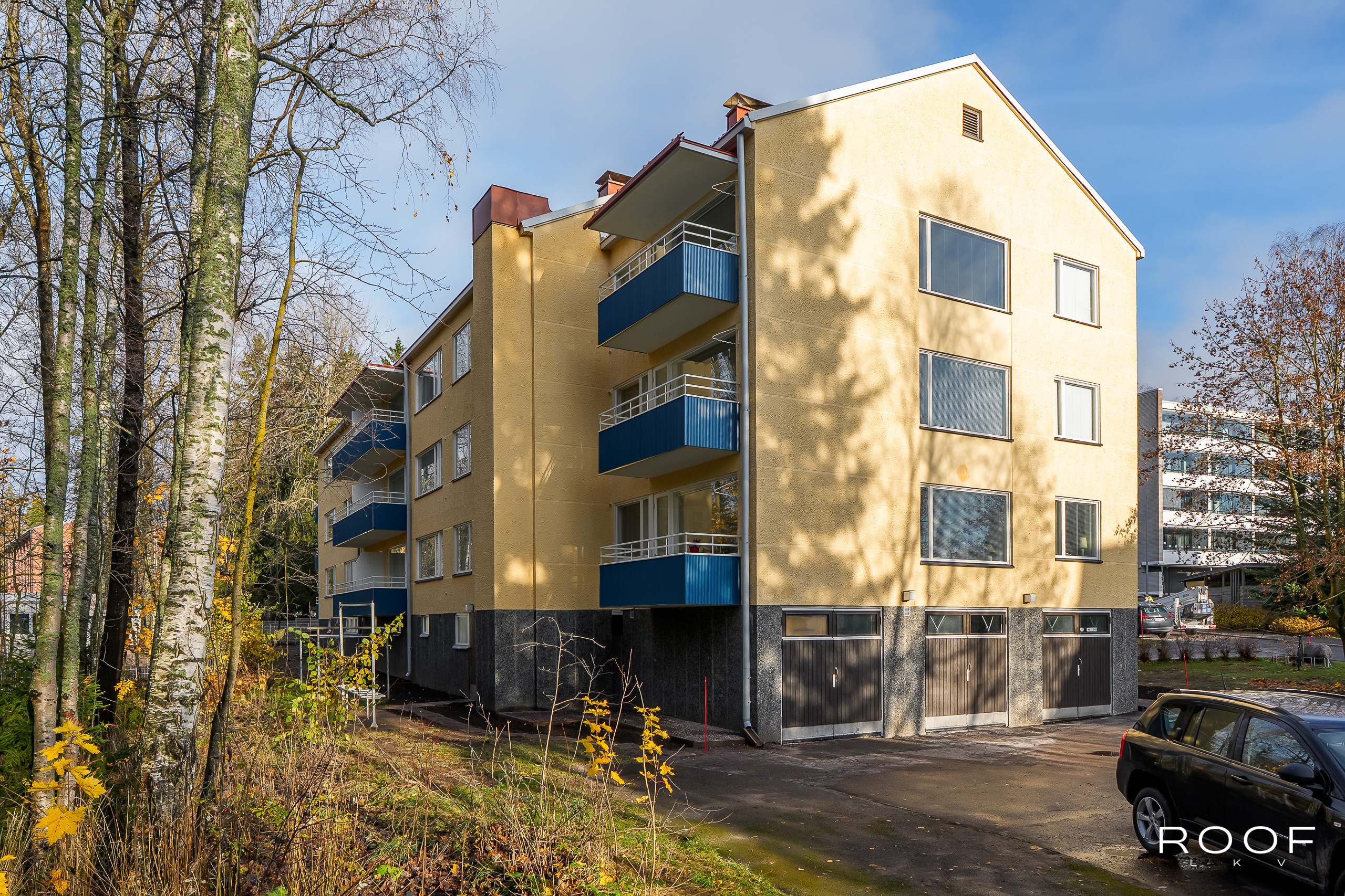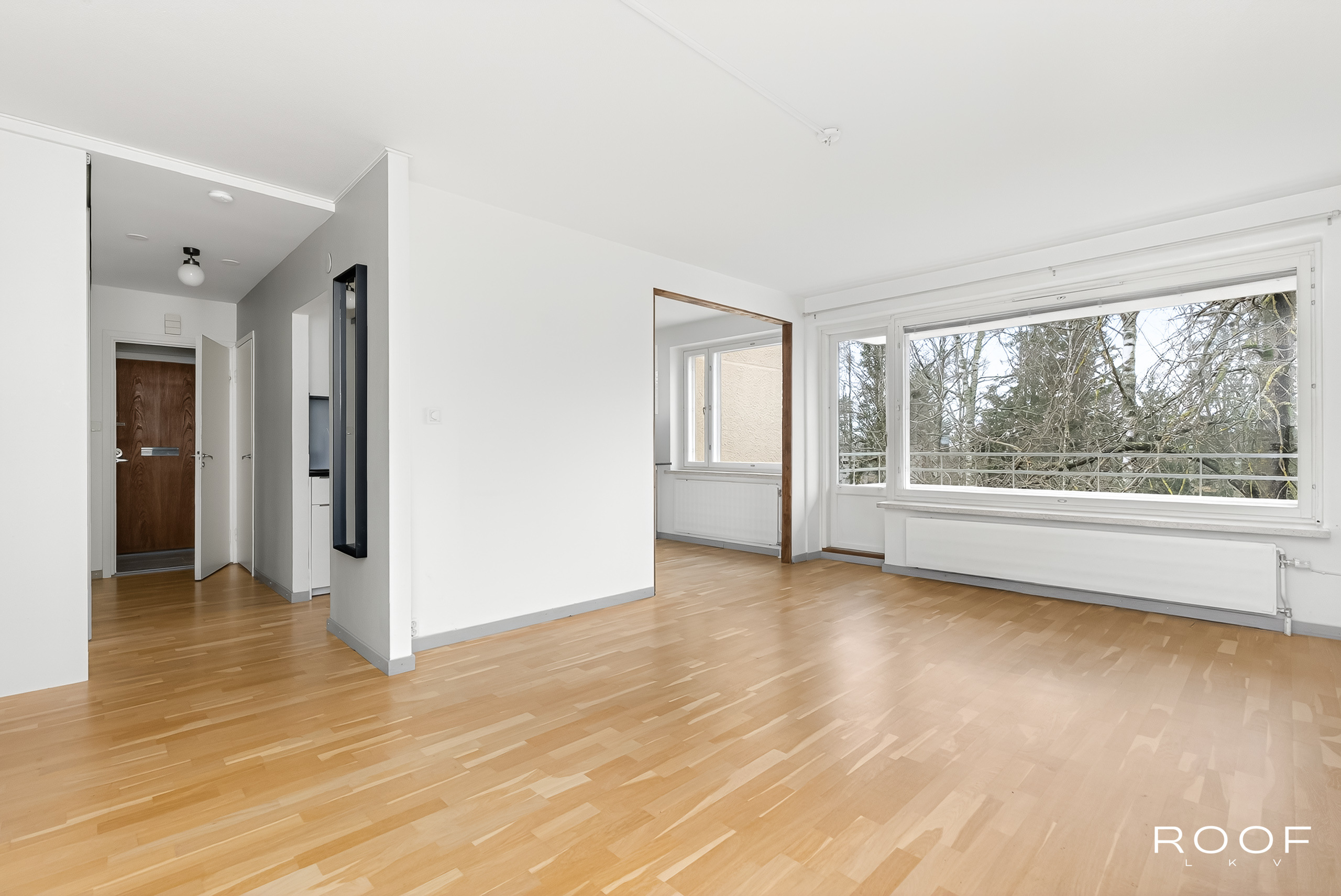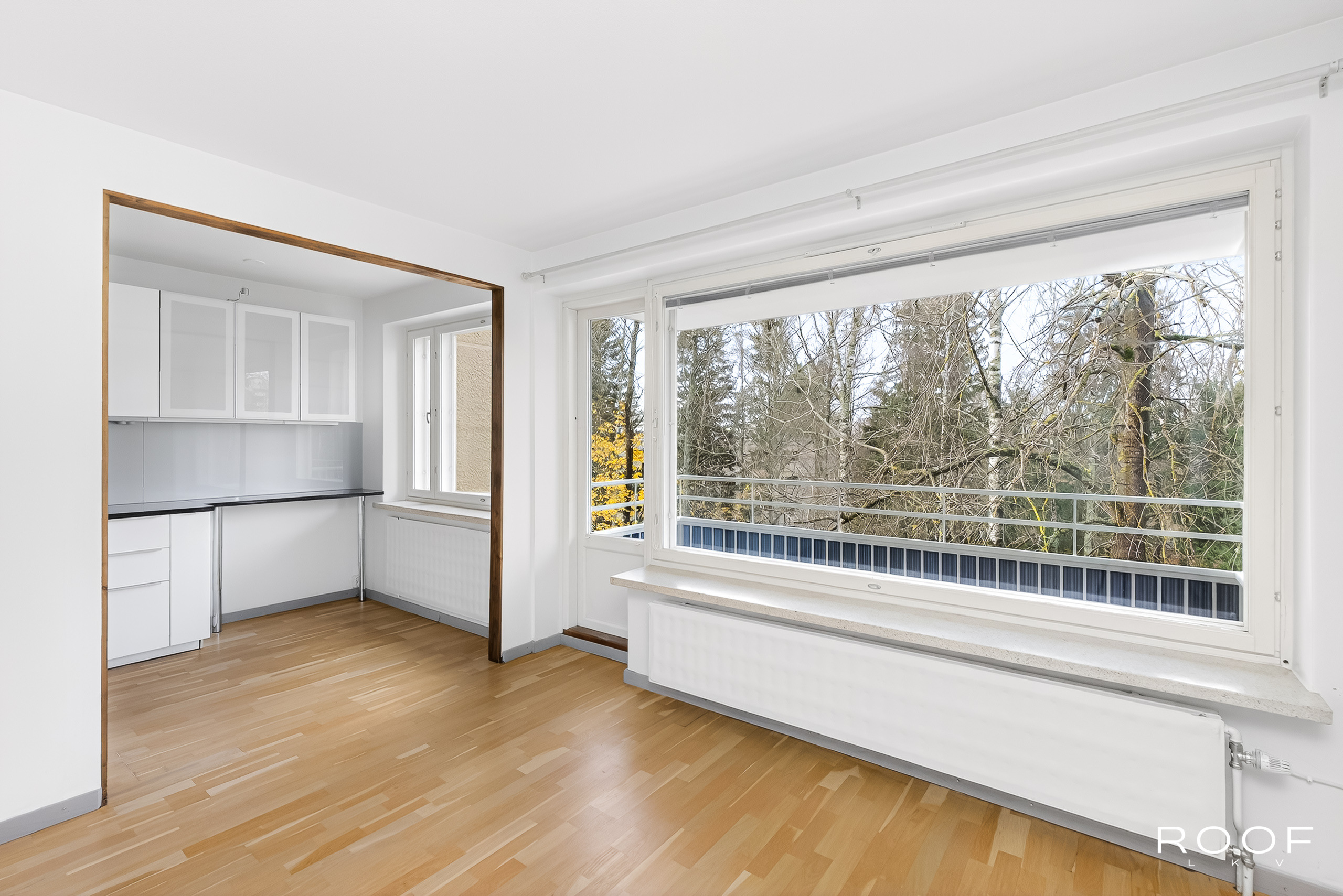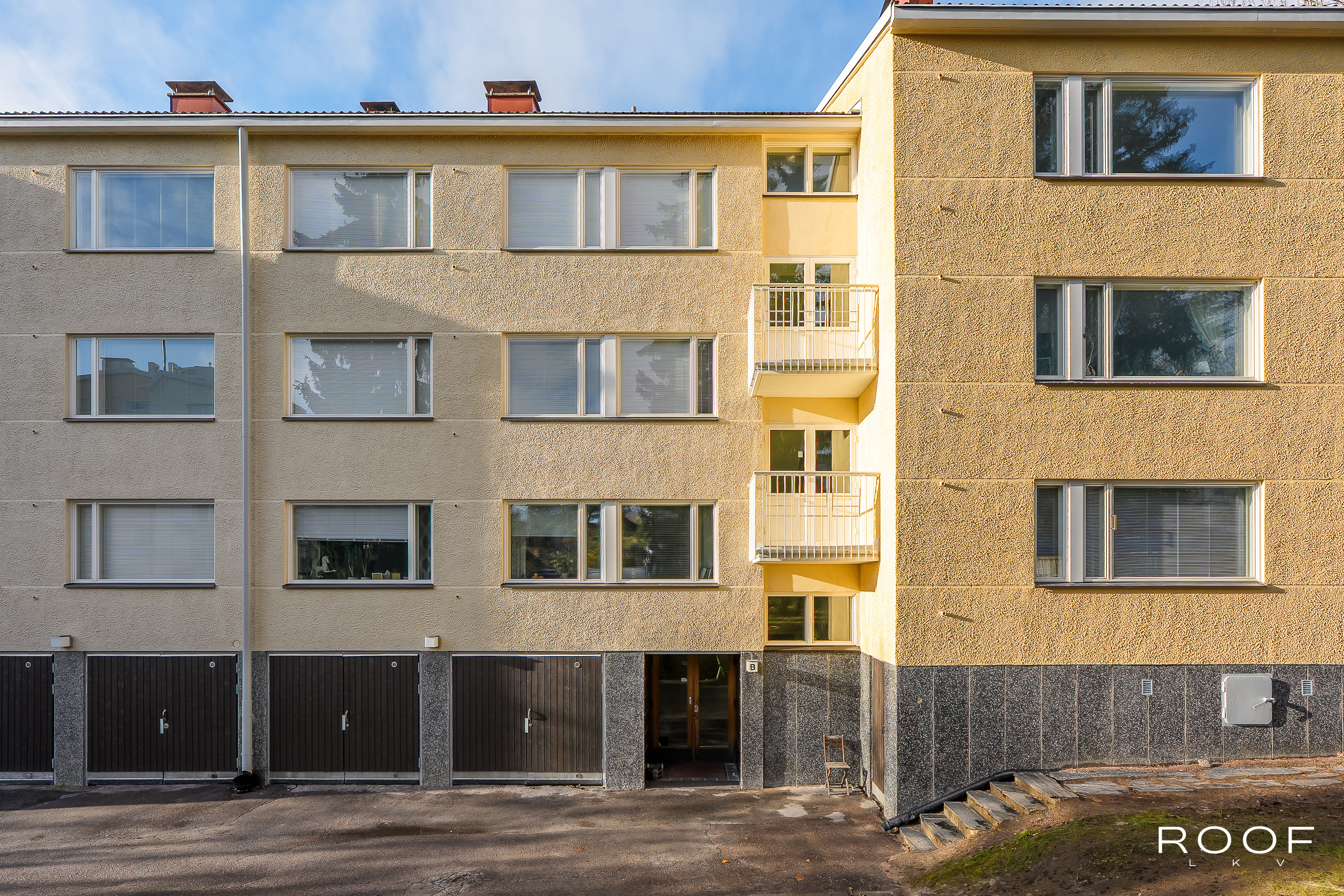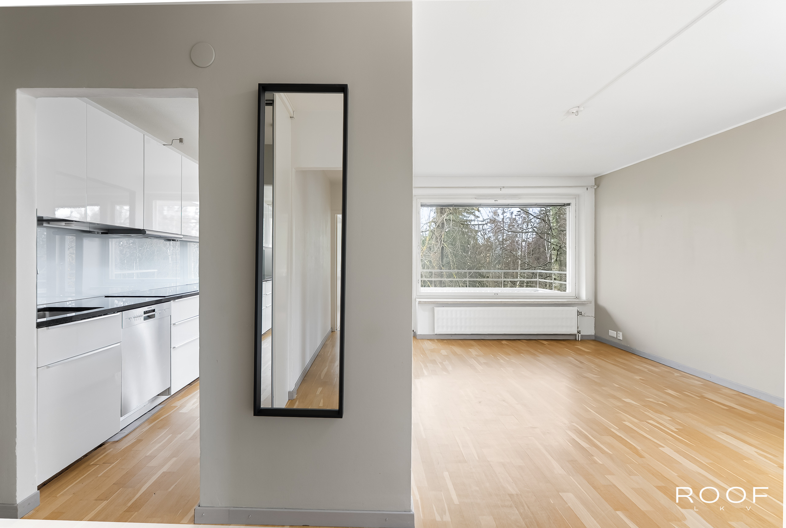 Asunto Oy Puistokaari 6, designed by Niilo Kokko and completed in 1959, is a beautiful example of 1950s modernist architecture, set on its own plot in Lauttasaari. This top-floor corner home features a spacious living room, a stylish kitchen, two bedrooms, a bathroom, and a balcony – all just 800 meters from the metro station. The building underwent a plumbing renovation in 2010, and the façade and balconies have just been renewed (a loan share of just under €30,000 will be allocated later).