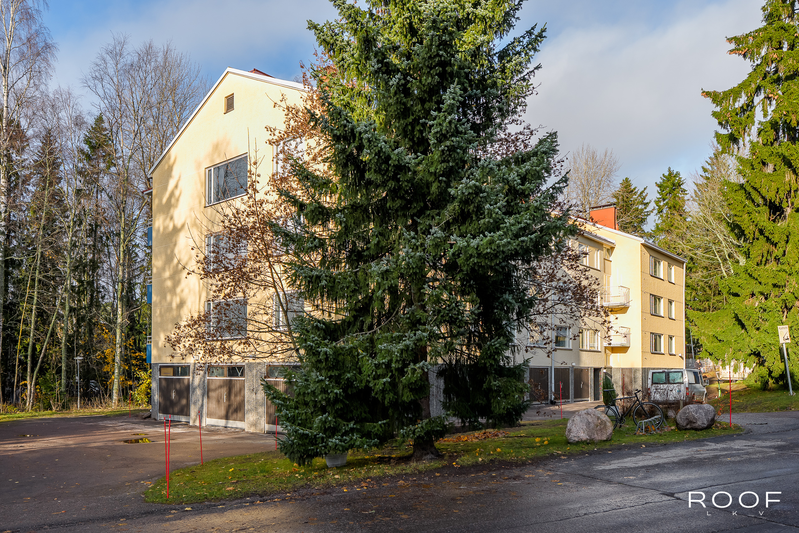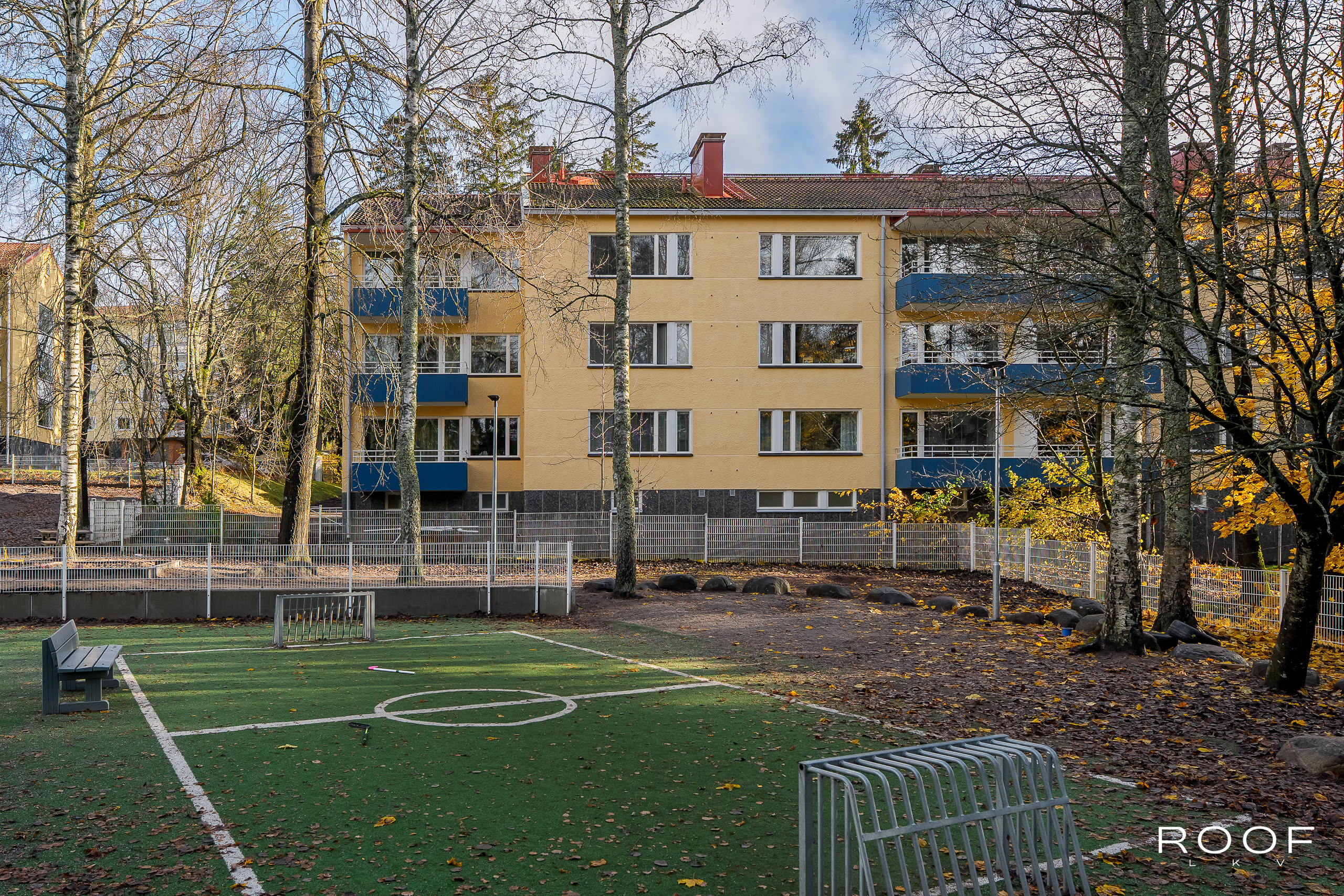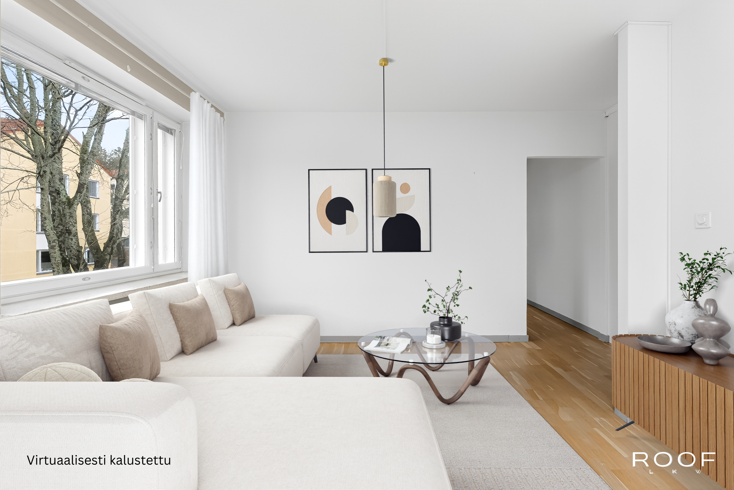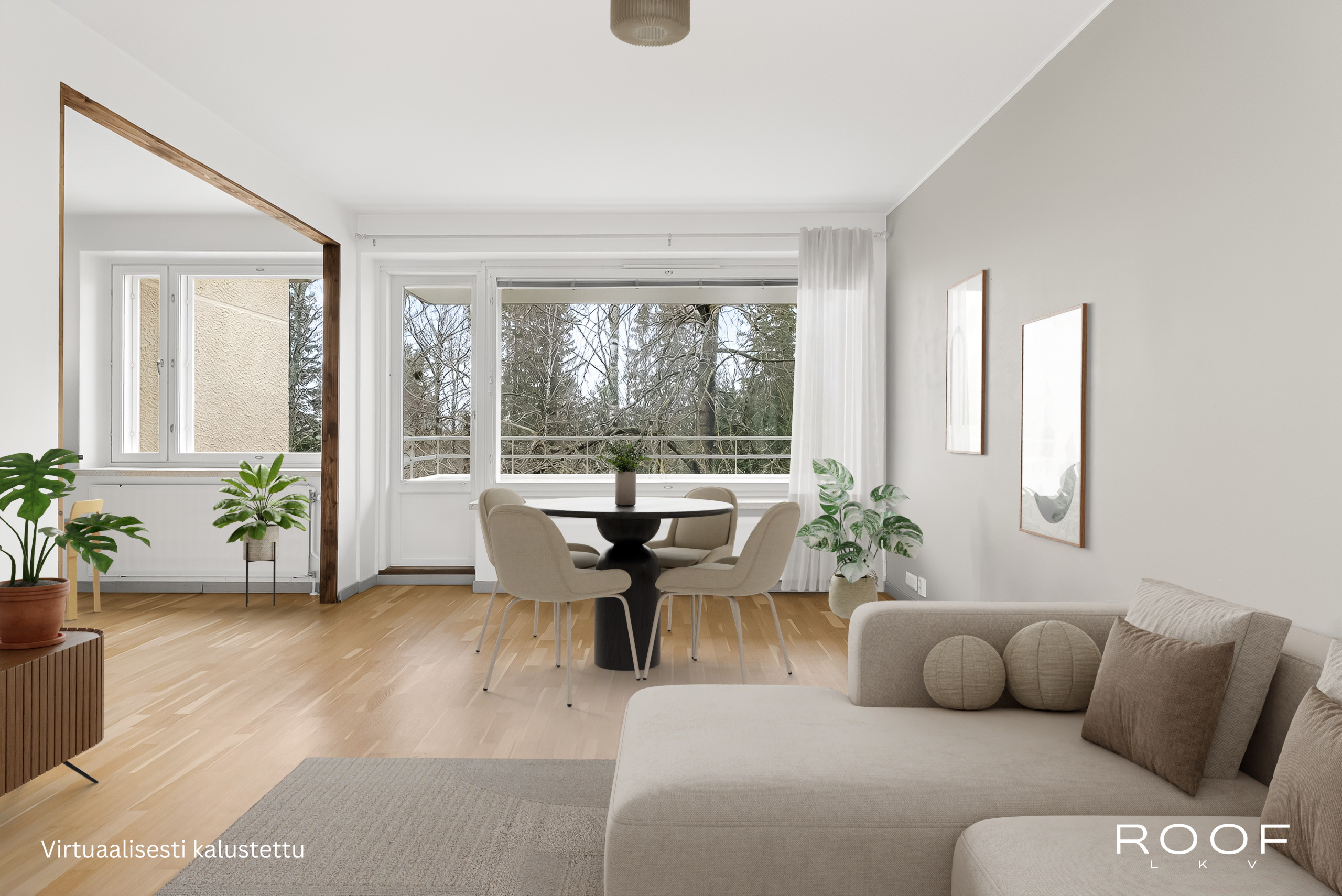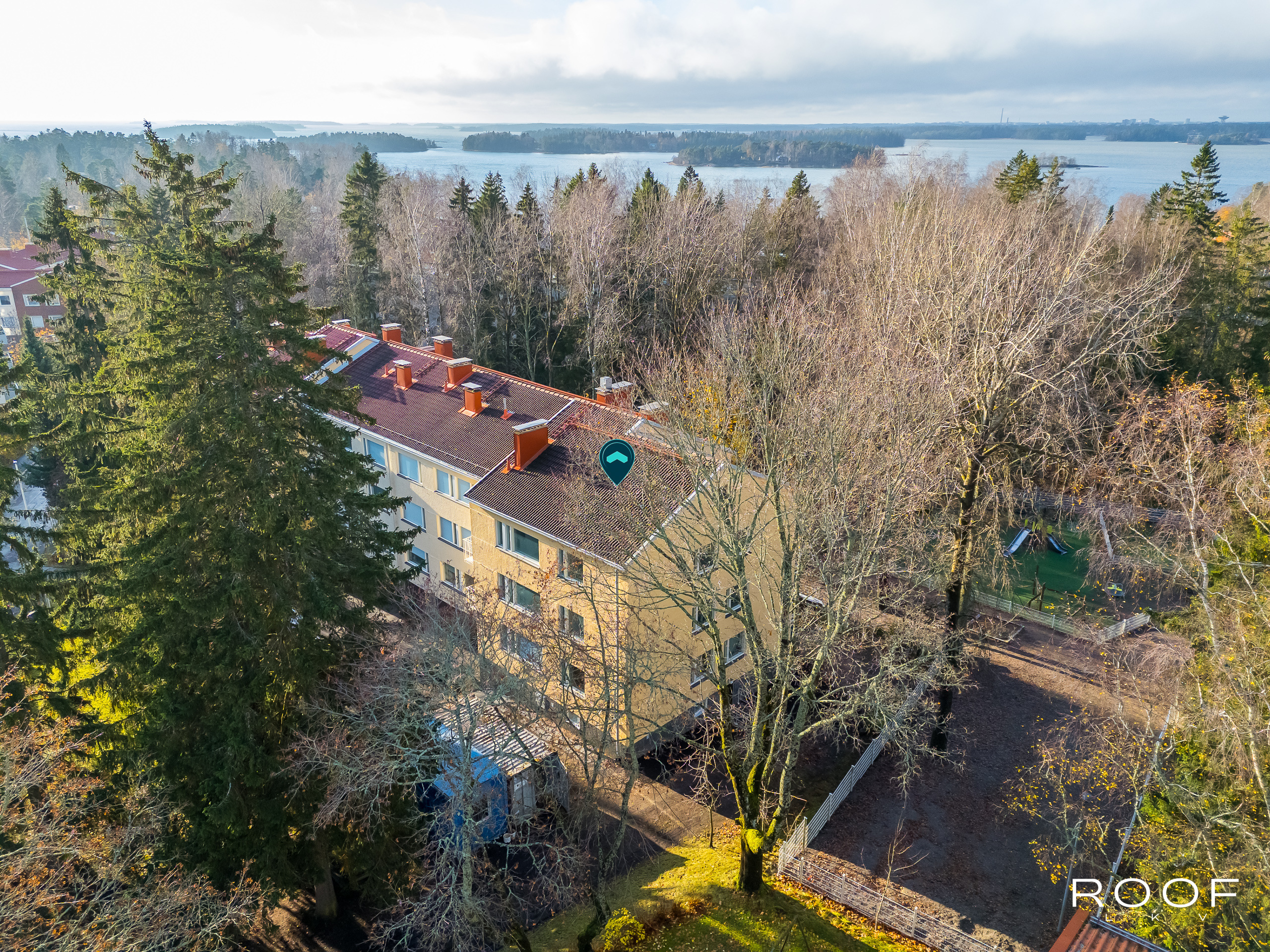 Asunto Oy Puistokaari 6, designed by Niilo Kokko and completed in 1959, is a beautiful example of 1950s modernist architecture, set on its own plot in Lauttasaari. This top-floor corner home features a spacious living room, a stylish kitchen, two bedrooms, a bathroom, and a balcony – all just 800 meters from the metro station. The building underwent a plumbing renovation in 2010, and the façade and balconies have just been renewed (a loan share of just under €30,000 will be allocated later).