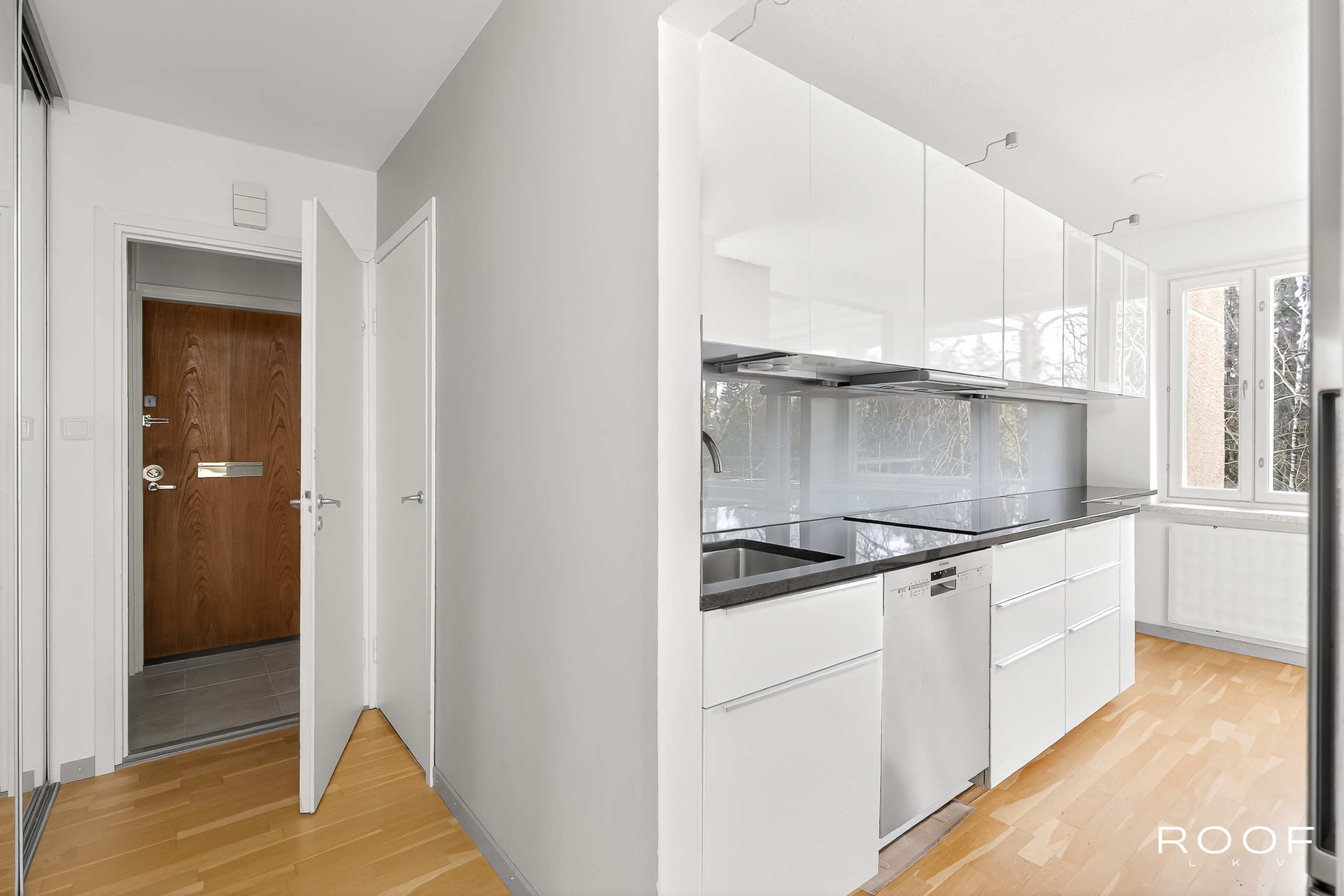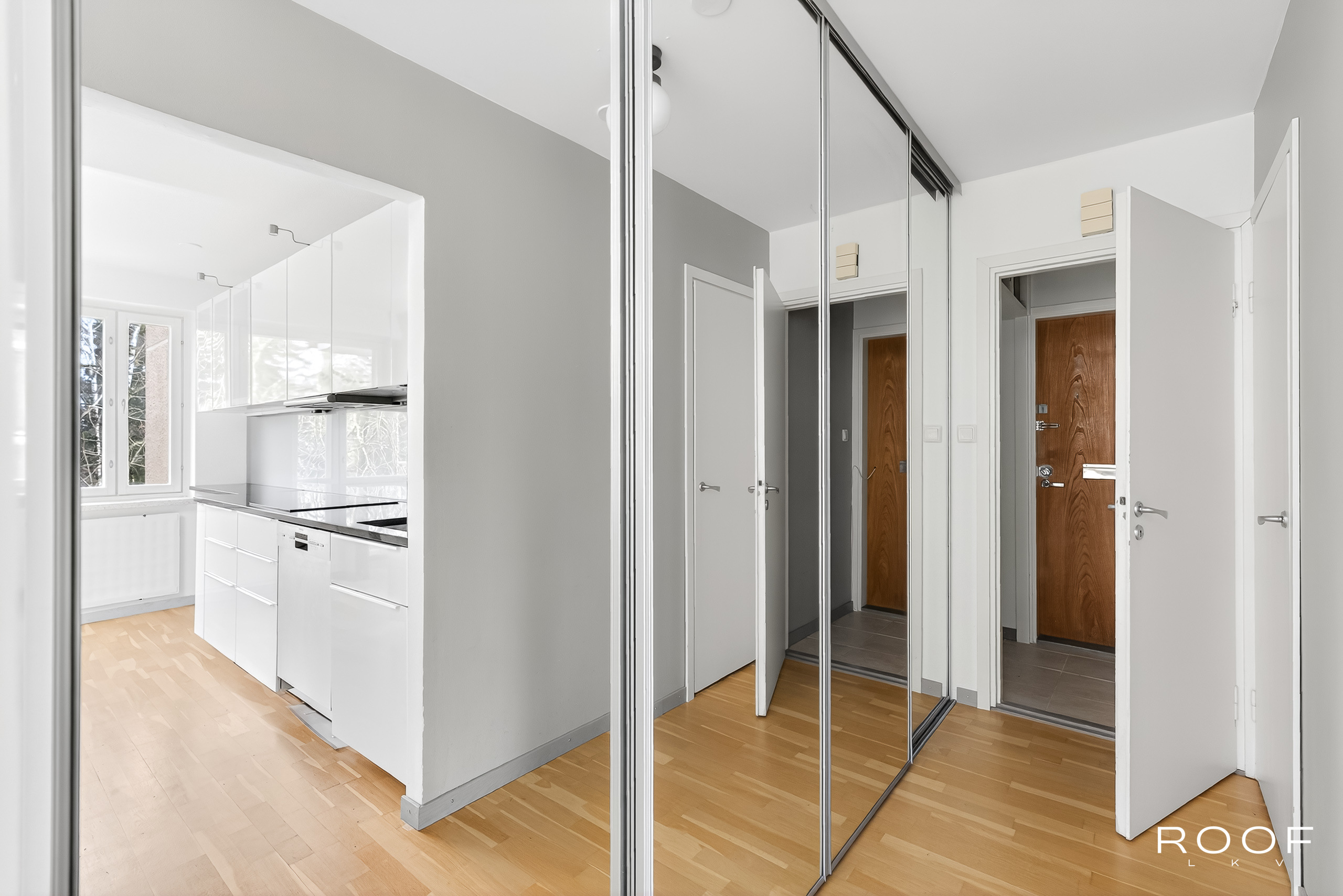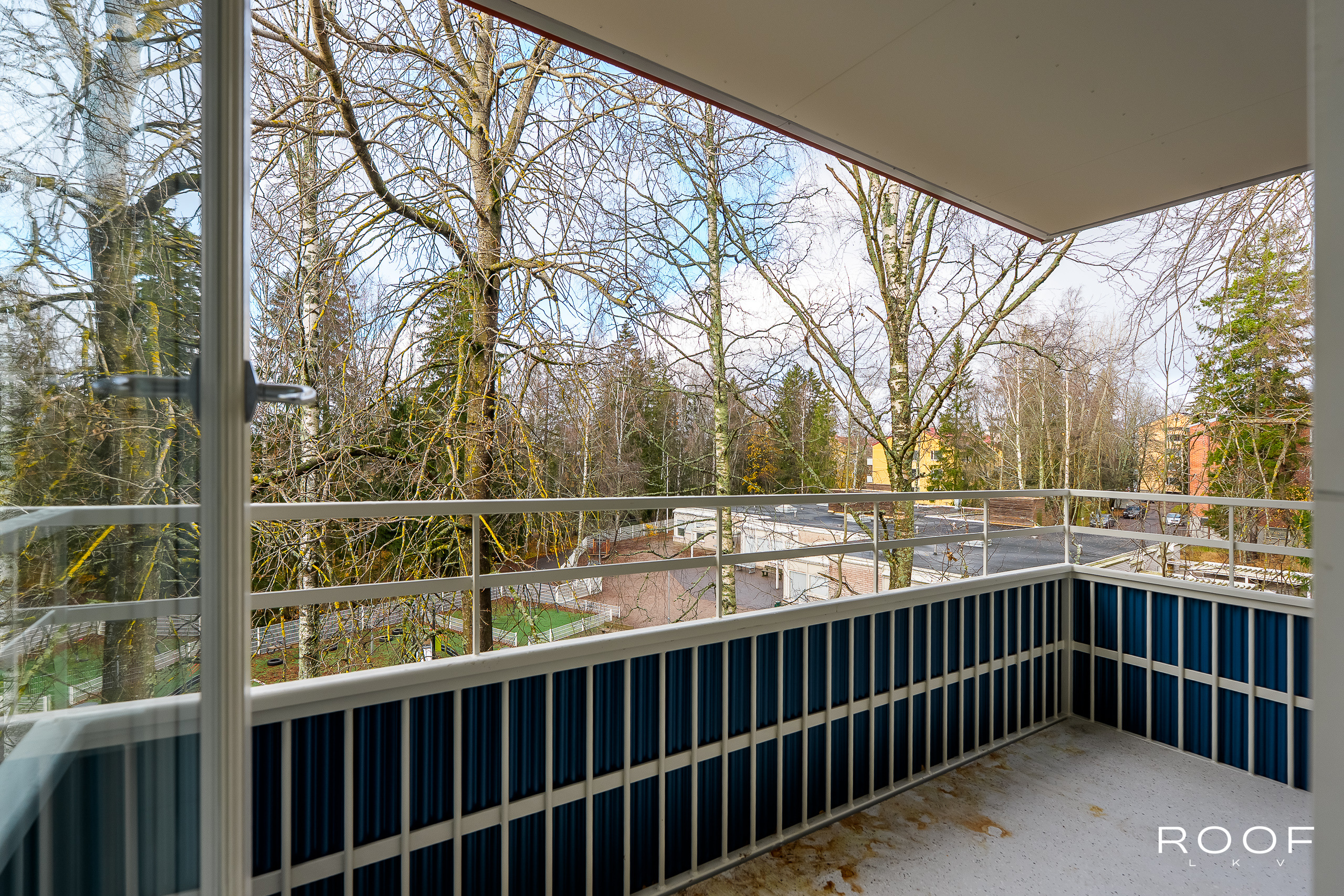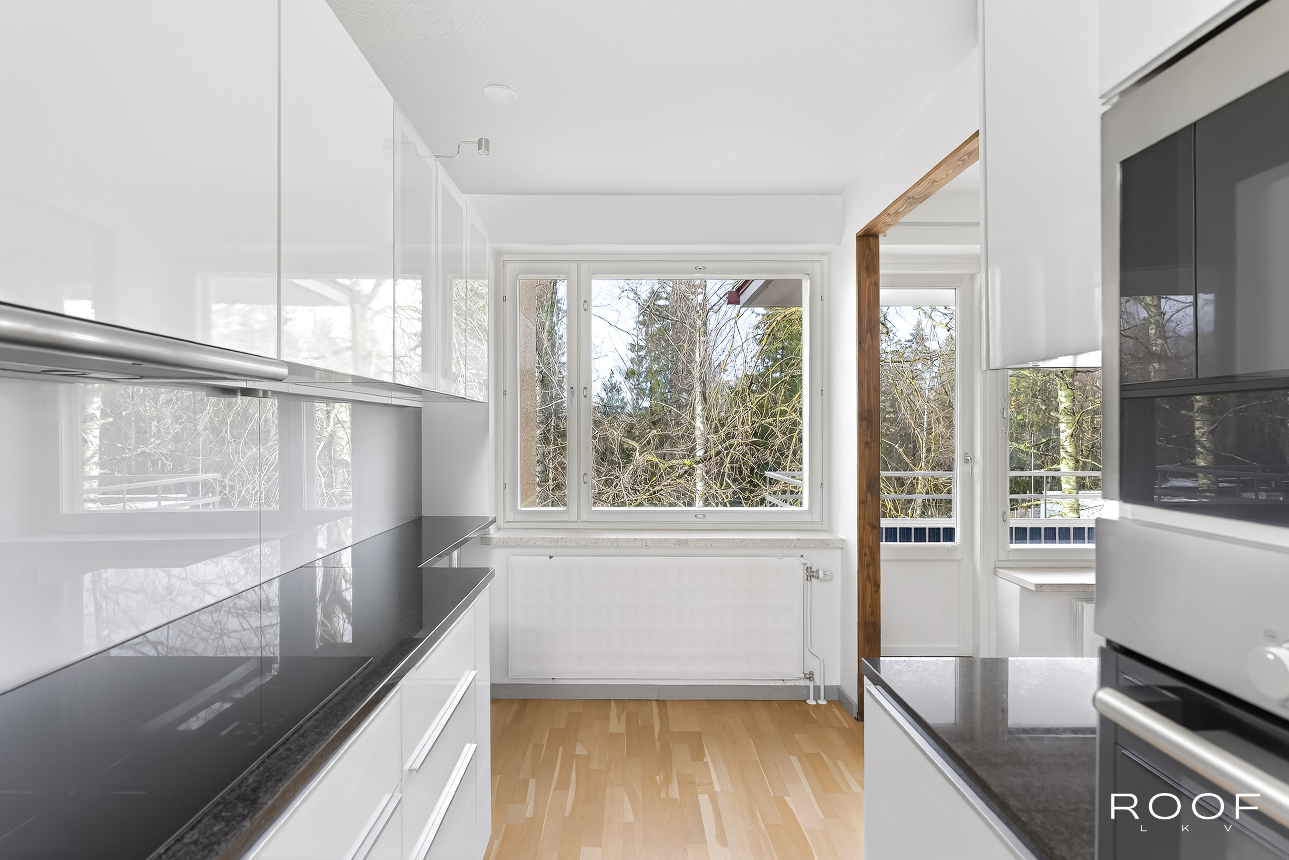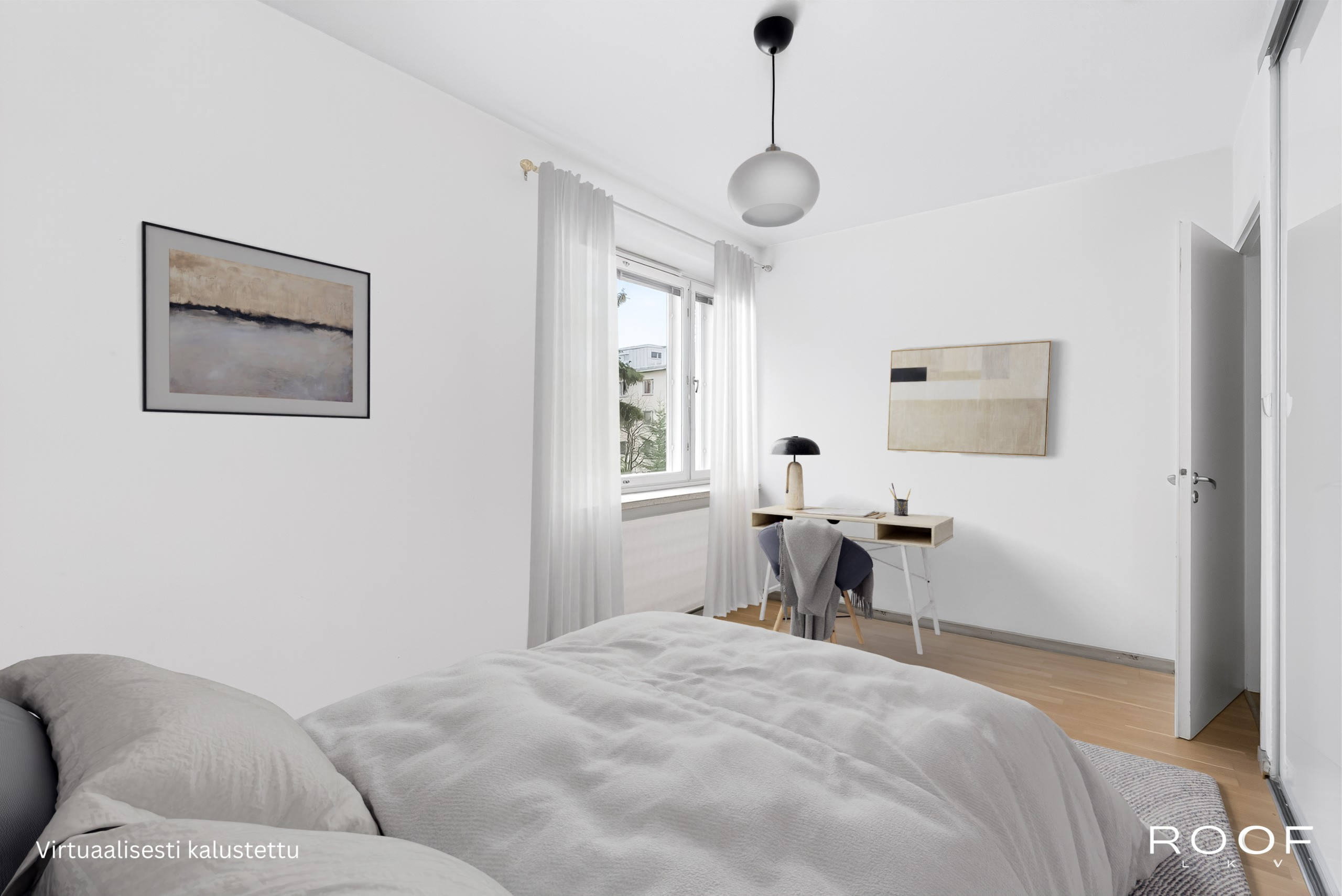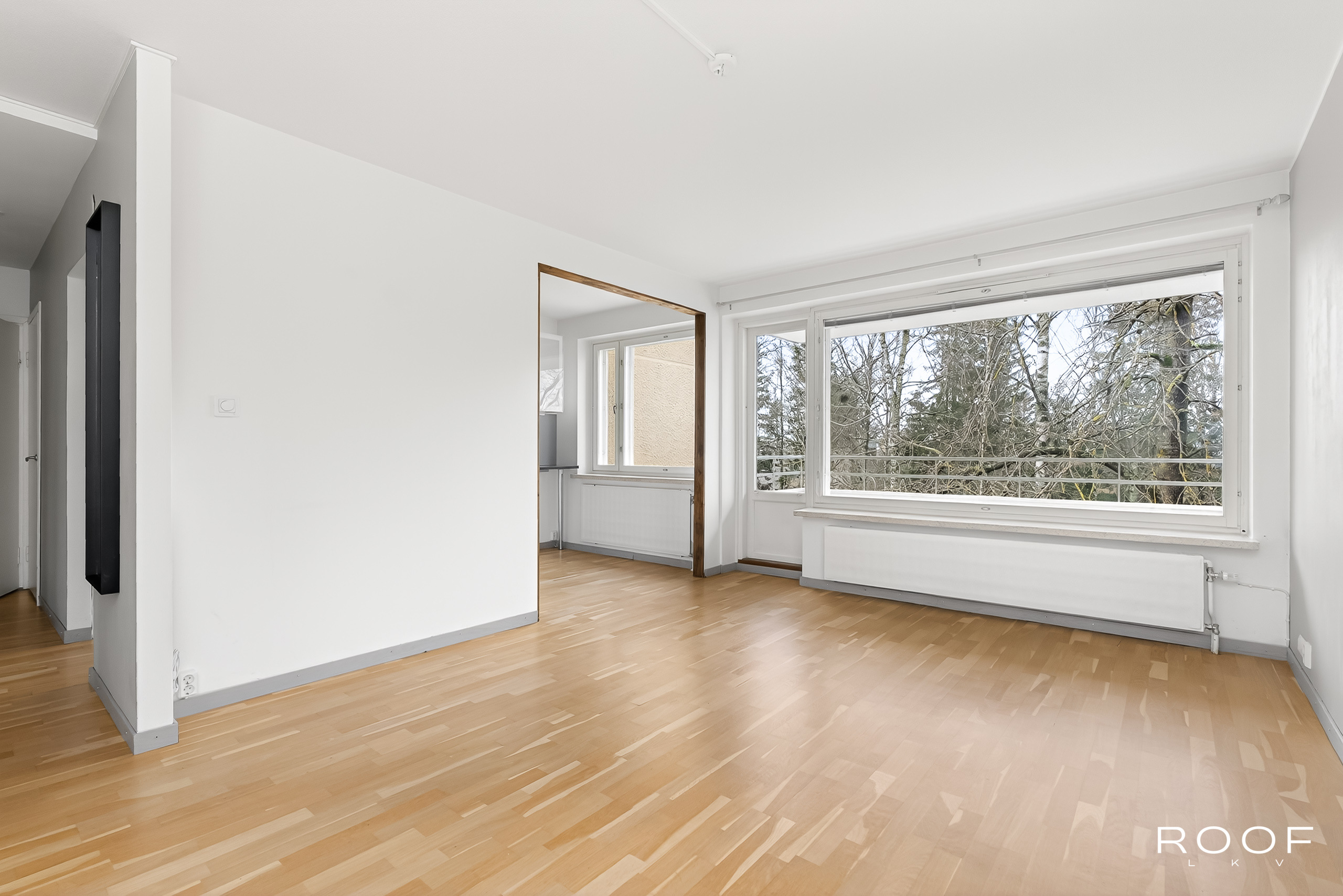 Asunto Oy Puistokaari 6, designed by Niilo Kokko and completed in 1959, is a beautiful example of 1950s modernist architecture, set on its own plot in Lauttasaari. This top-floor corner home features a spacious living room, a stylish kitchen, two bedrooms, a bathroom, and a balcony – all just 800 meters from the metro station. The building underwent a plumbing renovation in 2010, and the façade and balconies have just been renewed (a loan share of just under €30,000 will be allocated later).