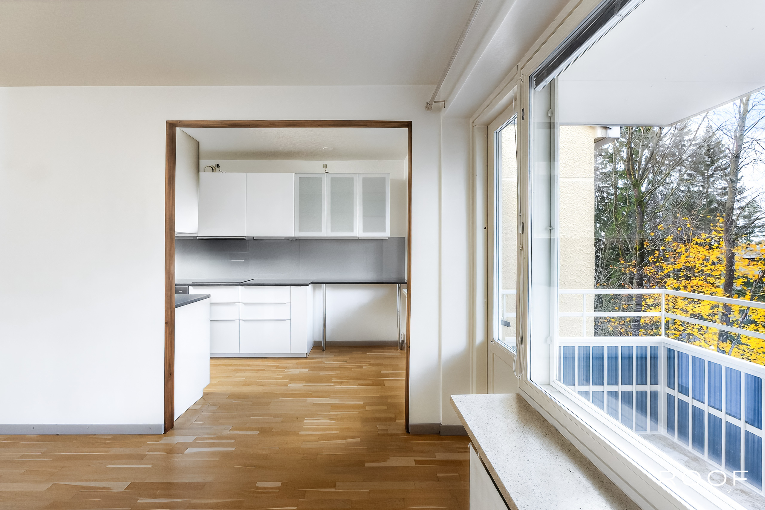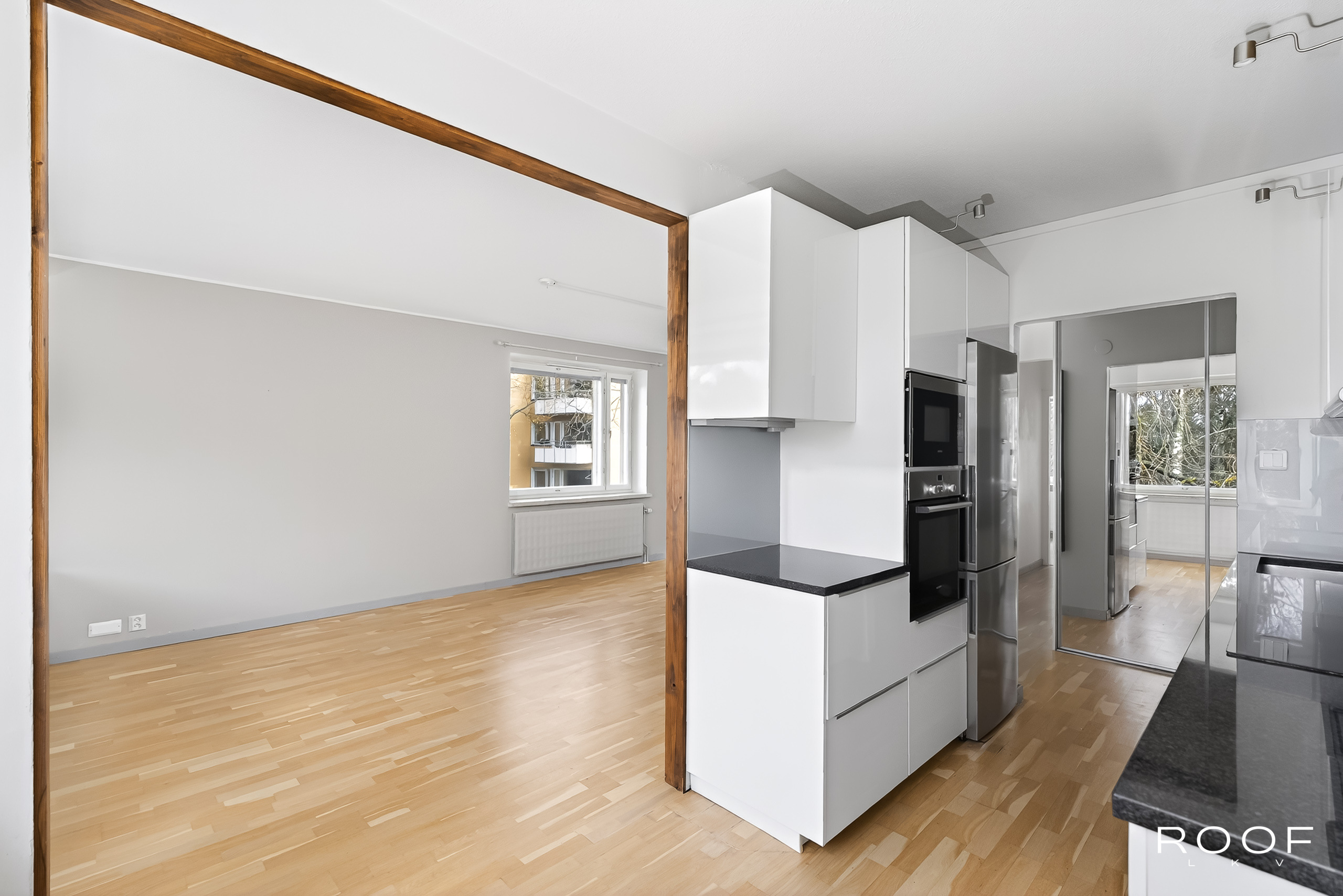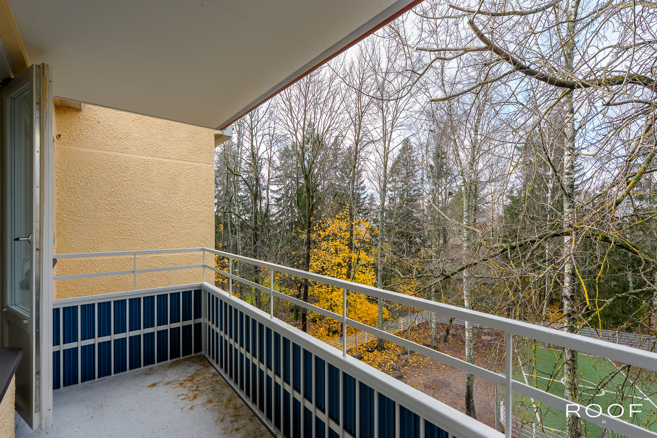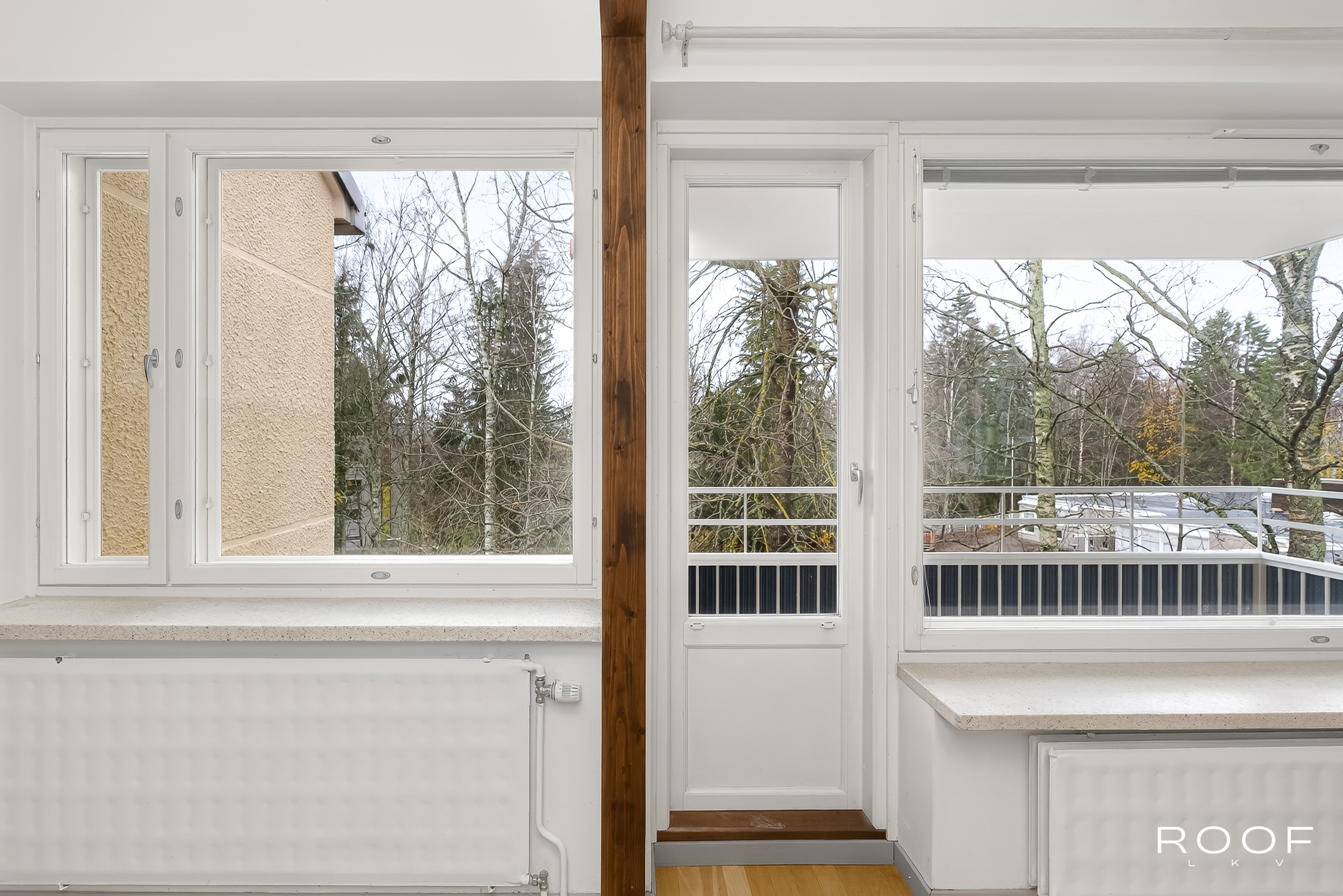 Itse asunto on toimiva ylimmän kerroksen kulmakolmio. Vaikka huoneiston pinnat on lähivuosina päivitetty nykyaikaa vastaaviksi, on 50-luvun lämminhenkisyys säilynyt: Suuret ikkunat kolmella sivulla saavat valon tulvimaan sisään, keittiö kivitasoineen on sekä käytännöllinen että tyylikäs kun taas asunnon tilavalla parvekkeella on mukavaa nauttia kesäisin lintujen laulusta sekä lehtien havinasta.