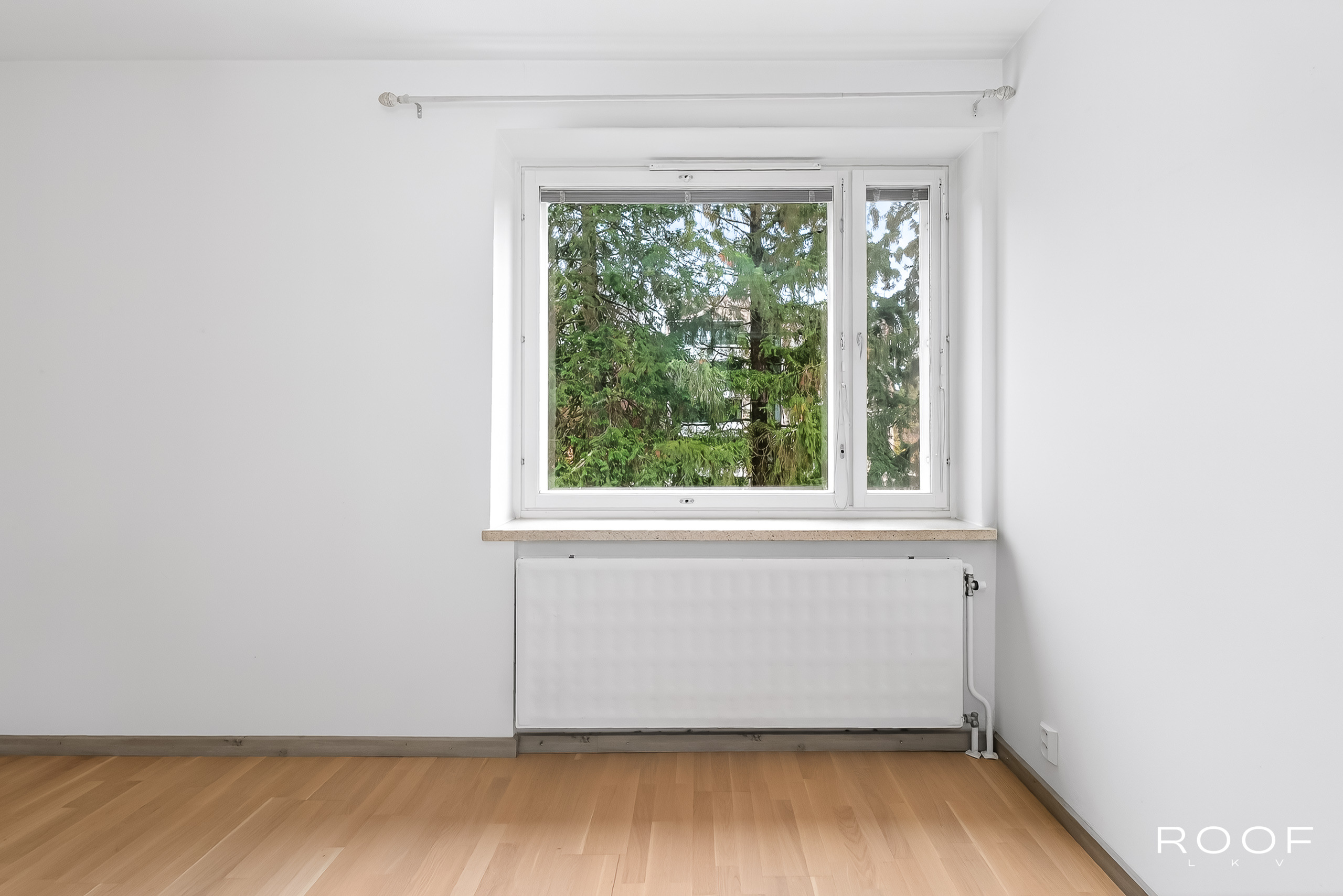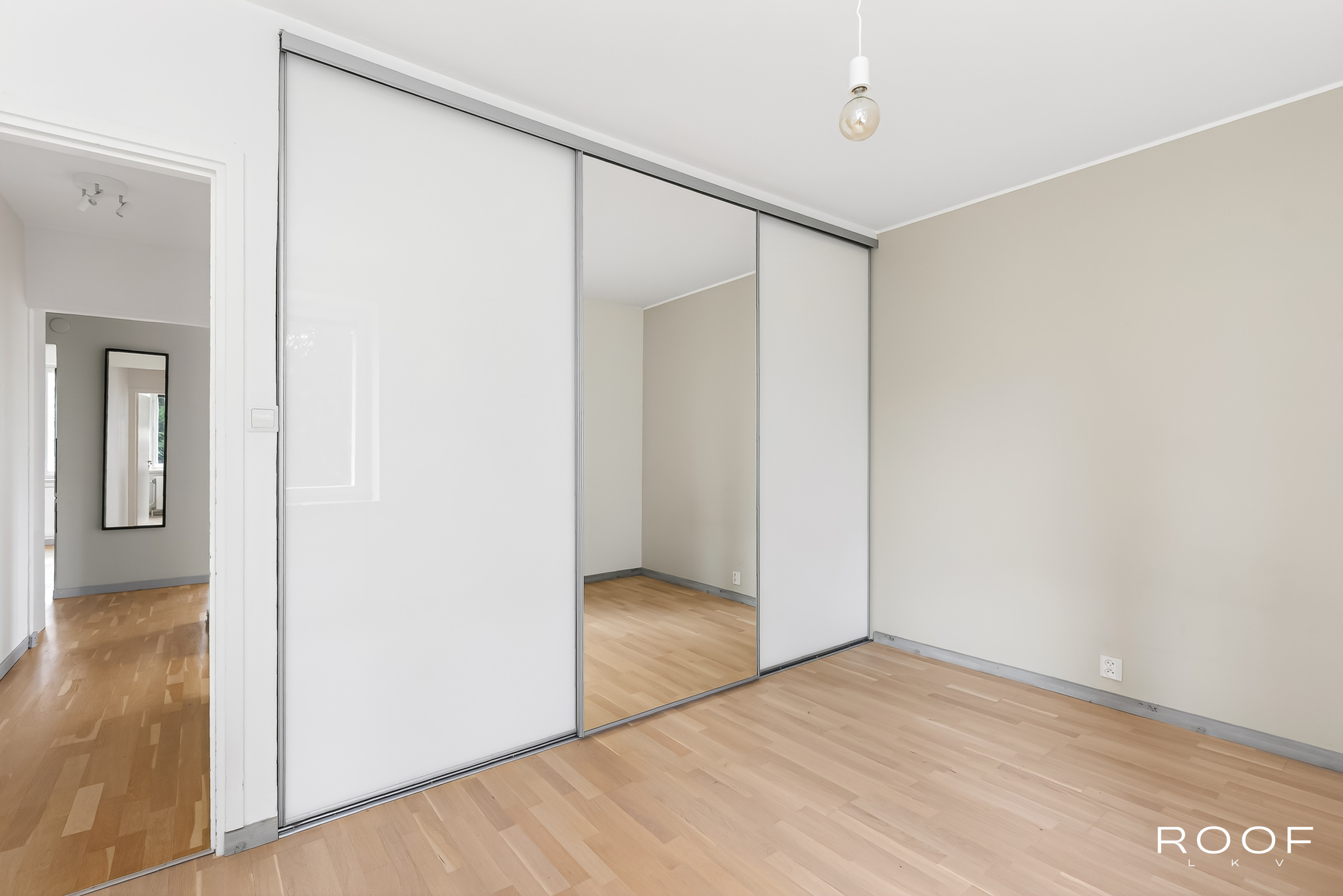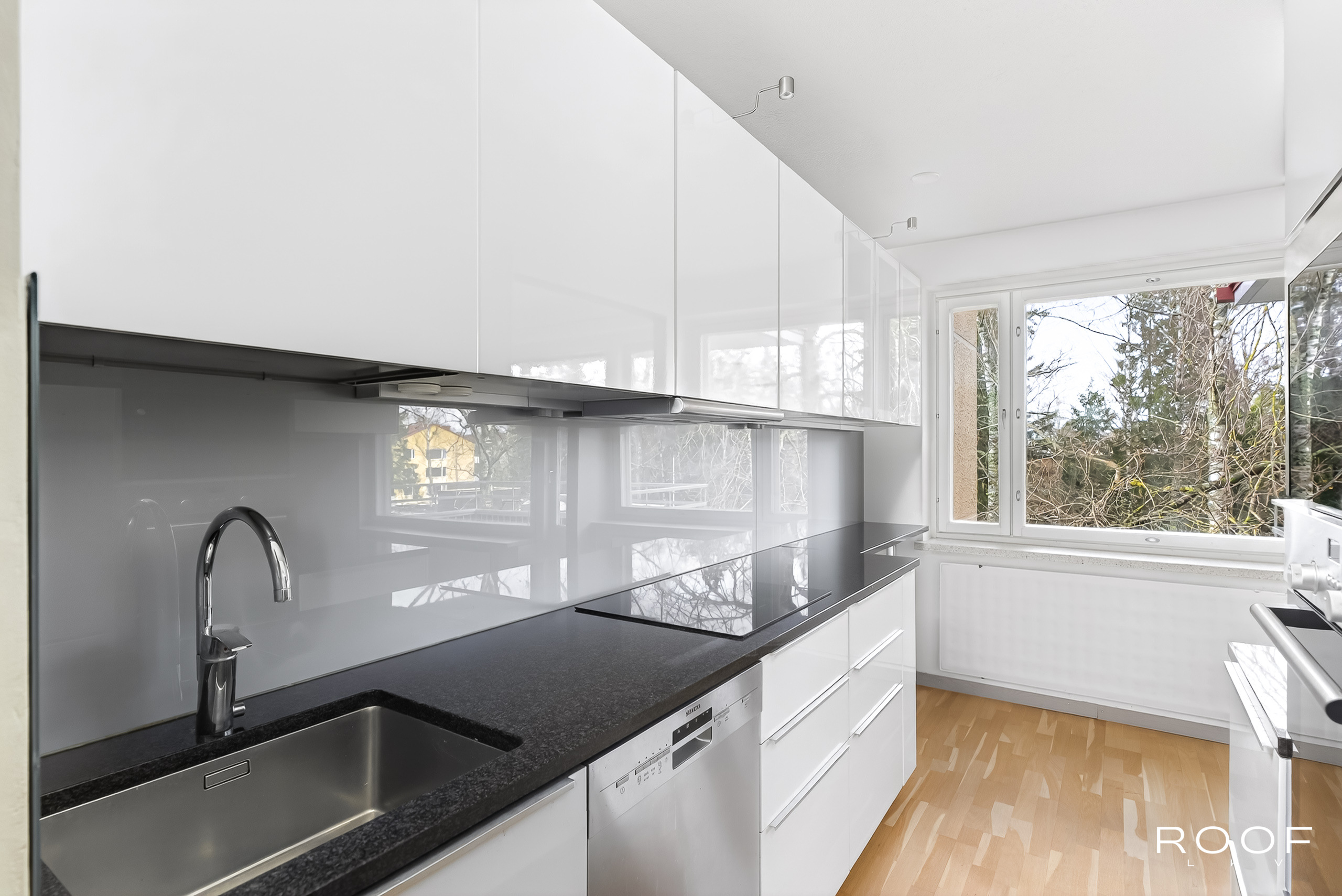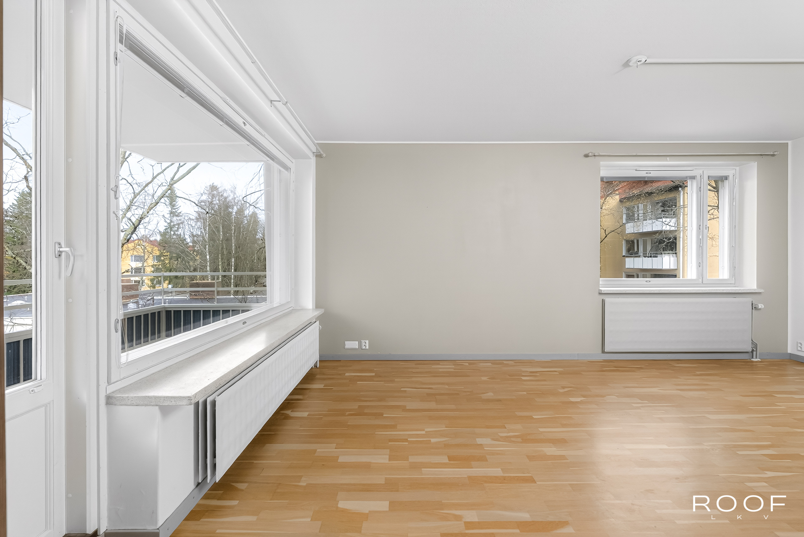 Itse asunto on toimiva ylimmän kerroksen kulmakolmio. Vaikka huoneiston pinnat on lähivuosina päivitetty nykyaikaa vastaaviksi, on 50-luvun lämminhenkisyys säilynyt: Suuret ikkunat kolmella sivulla saavat valon tulvimaan sisään, keittiö kivitasoineen on sekä käytännöllinen että tyylikäs kun taas asunnon tilavalla parvekkeella on mukavaa nauttia kesäisin lintujen laulusta sekä lehtien havinasta.
