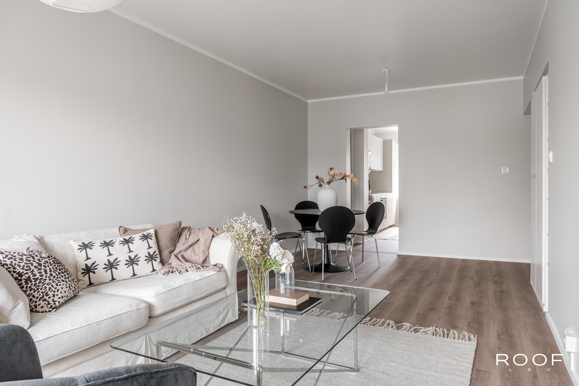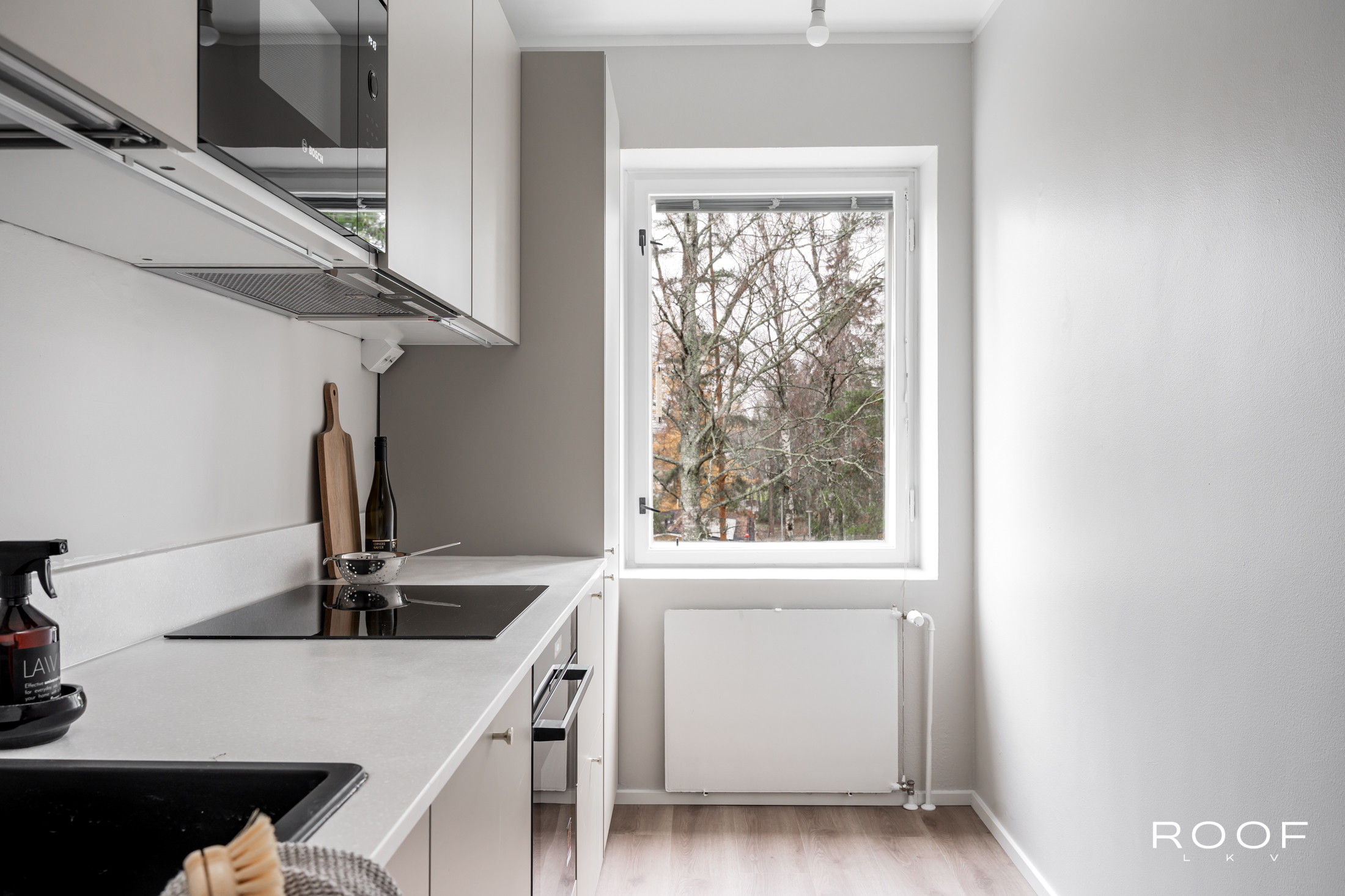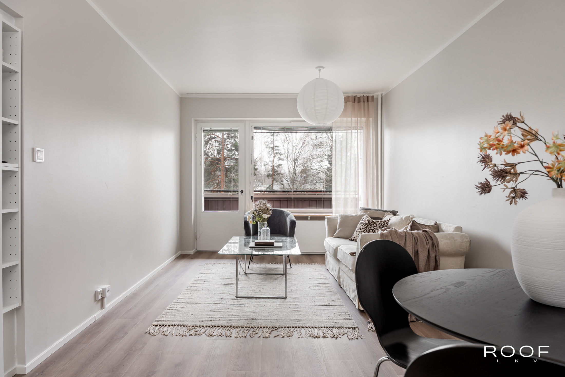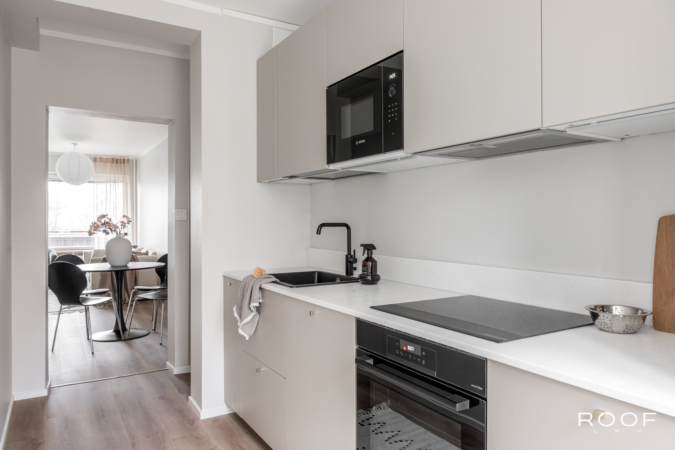 Tämä koti on saneerattu juuri hyödyntäen neutraaleja sekä luonnonmukaisia materiaaleja. Keittiössä on mukavasti lasku- sekä säilytystilaa, keittiö on osittain avonainen oleskelutiloihin. Kodinkoneet ovat integroidut Bosch-merkkiset ja työtaso on komposiittikivitaso. Oleskelutiloissa on hyvin tilaa ruokailu- sekä istuinryhmälle, olohuoneen puolella myös kaapistot. Kodin molemmissa makuuhuoneissa on myös kaapistot. Kylpyhuoneen laatoitus sekä vedeneriste on uusittu putkiremontin yhteydessä 2014, kalusteet on uusittu huoneiston muun remontin yhteydessä. Päivitetyt pinnat ja modernit ratkais...