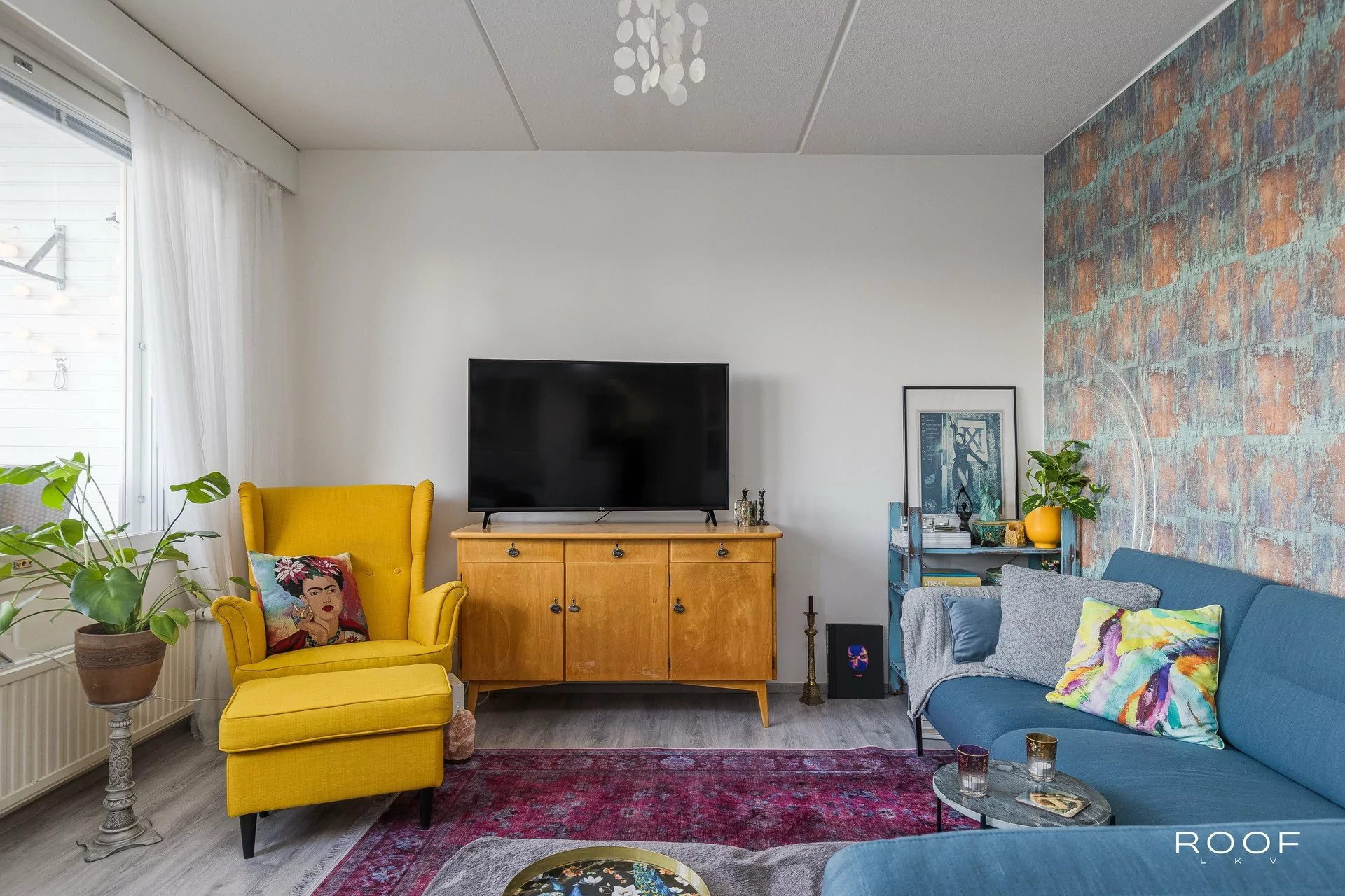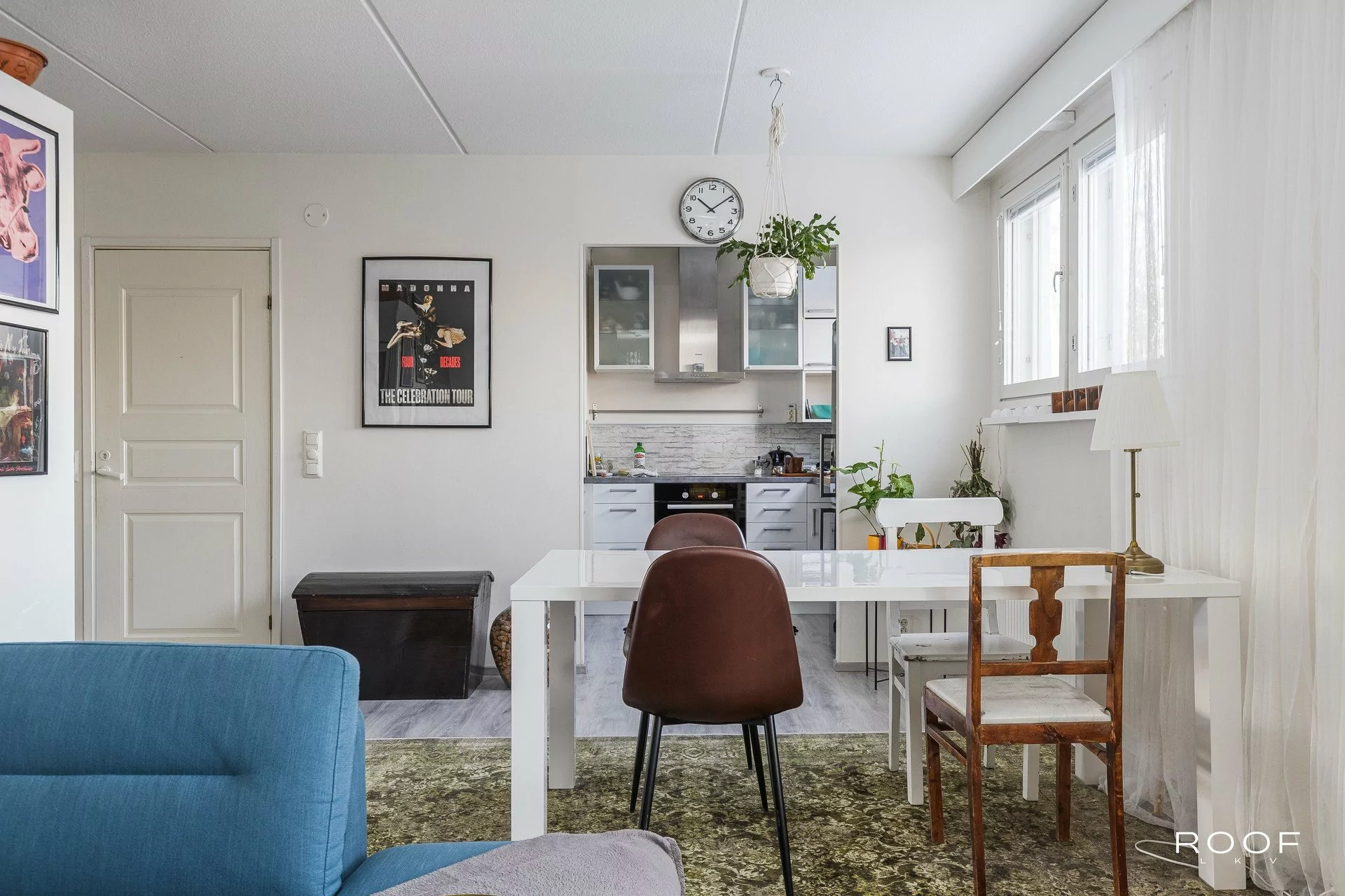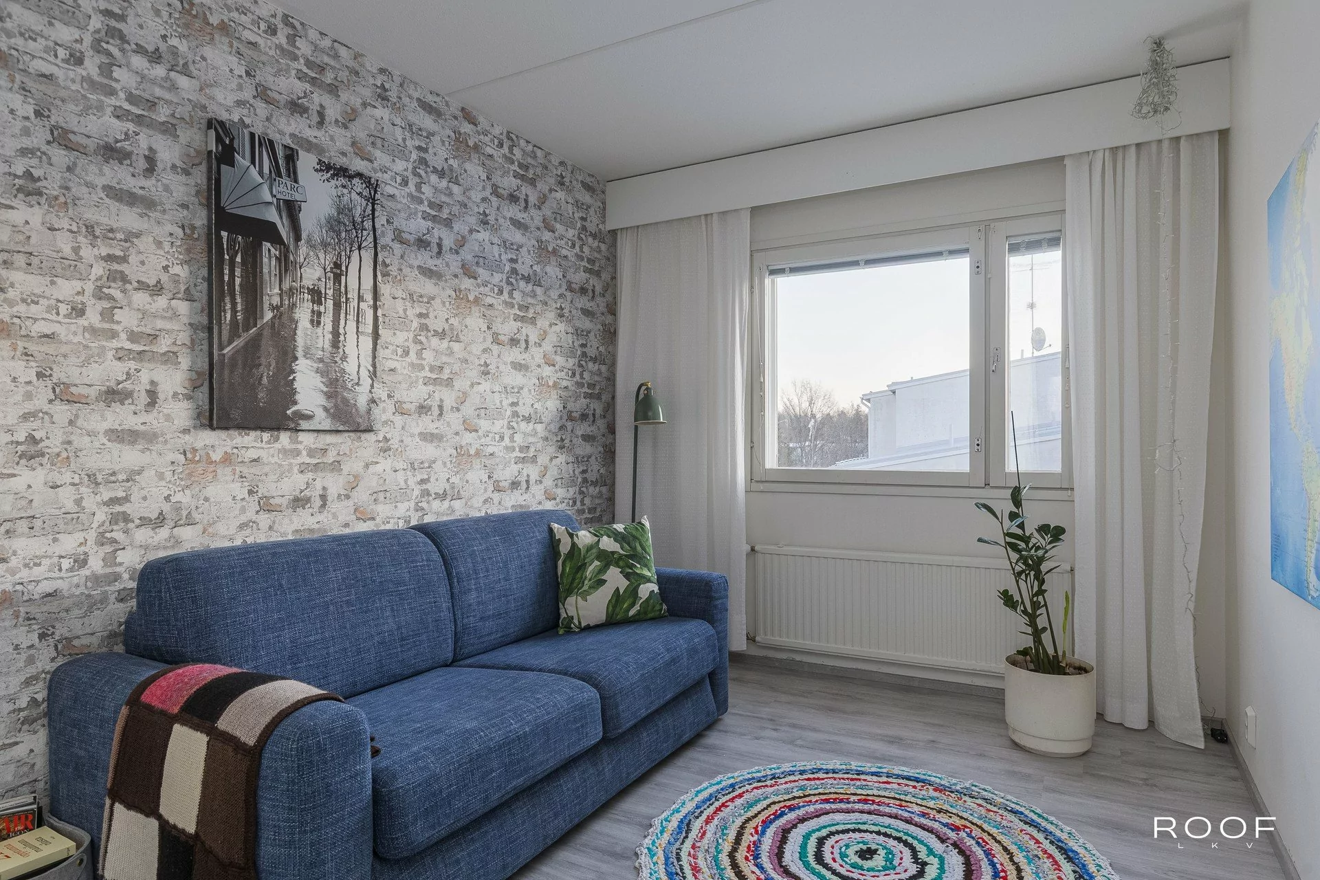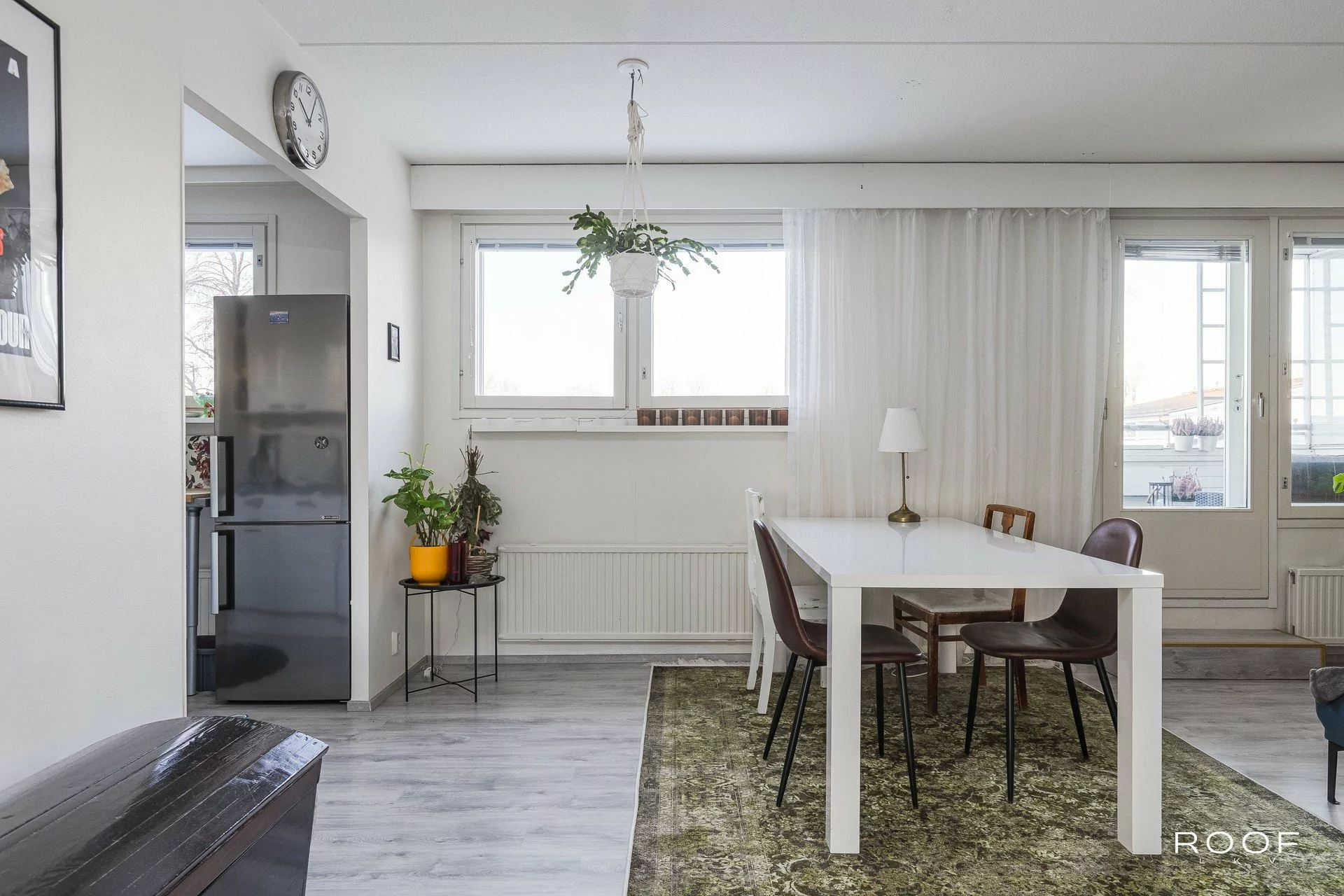 Olohuone tarjoaa runsaasti tilaa oleskeluun ja sieltä on käynti lasitetulle parvekkeelle, joka toimii mukavana lisätilana suurimman osan vuodesta.